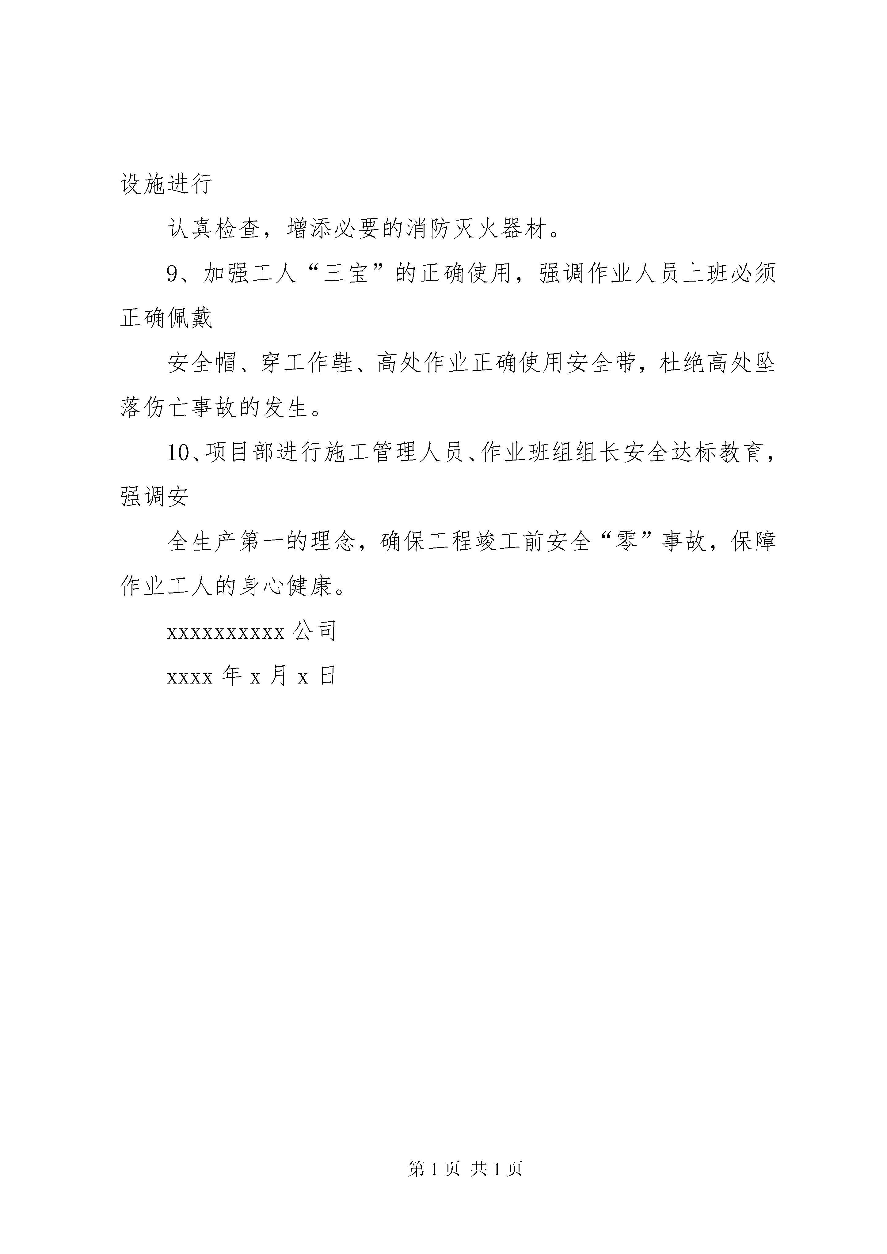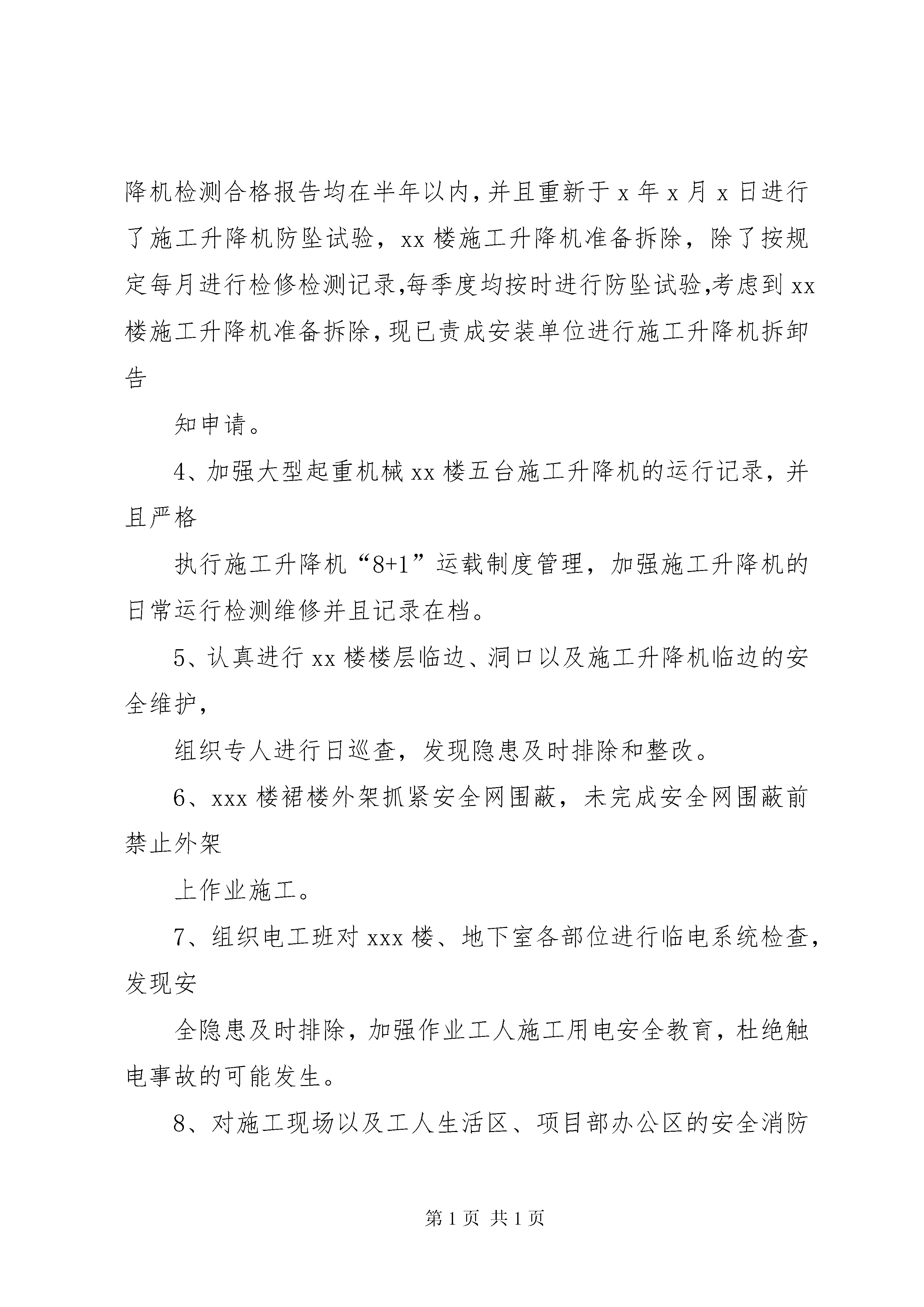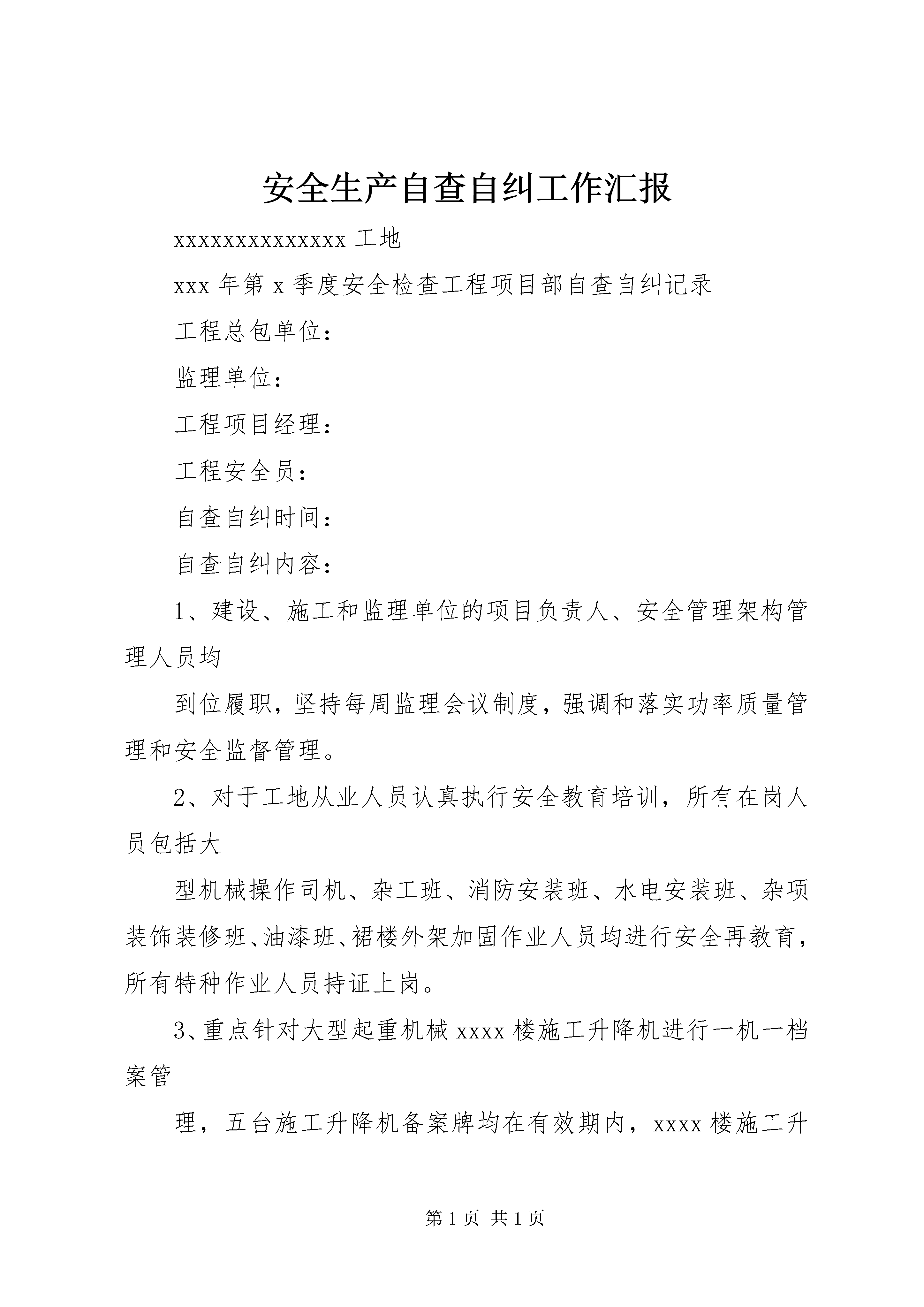 安全生产自查自纠工作汇报xxxxxxxxxxxxxx工地xxx年第x季度安全检查工程项目部自查自纠记录工程总包单位:监理单位:工程项目经理:工程安全员:自查自纠时间:自查自纠内容:1、建设、施工和监理单位的项目负责人、安全管理架构管理人员均到位履职,坚持每周监理会议制度,强调和落实功率质量管理和安全监督管理。2、对于工地从业人员认真执行安全教育培训,所有在岗人员包括大型机械操作司机、杂工班、消防安装班、水电安装班、杂项装饰装修班、油漆班、裙楼外架加固作业人员均进行安全再教育,所有特种作业人员持证上岗。3、重点针对大型起重机械xxxx楼施工升降机进行一机一档案管理,五台施工升降机备案牌均在有效期内,xxxx楼施工升降机检测合格报告均在半年以内,并且重新于x年x月x日进行了施工升降机防坠试验,xx楼施工升降机准备拆除,除了按规定每月进行检修检测记录,每季度均按时进行防坠试验,考虑到xx楼施工升降机准备拆除,现已责成安装单位进行施工升降机拆卸告知申请。4、加强大型起重机械xx楼五台施工升降机的运行记录,并且严格执行施工升降机“8+1”运载制度管理,加强施工升降机的日常运行检测维修并且记录在档。5、认真进行xx楼楼层临边、洞口以及施工升降机临边的安全维护,组织专人进行日巡查,发现隐患及时排除和整改。6、xxx楼裙楼外架抓紧安全网围蔽,未完成安全网围蔽前禁止外架上作业施工。7、组织电工班对xxx楼、地下室各部位进行临电系统检查,发现安全隐患及时排除,加强作业工人施工用电安全教育,杜绝触电事故的可能发生。8、对施工现场以及工人生活区、项目部办公区的安全消防设施进行认真检查,增添必要的消防灭火器材。9、加强工人“三宝”的正确使用,强调作业人员上班必须正确佩戴安全帽、穿工作鞋、高处作业正确使用安全带,杜绝高处坠落伤亡事故的发生。10、项目部进行施工管理人员、作业班组组长安全达标教育,强调安全生产第一的理念,确保工程竣工前安全“零”事故,保障作业工人的身心健康。xxxxxxxxxx公司xxxx年x月x日