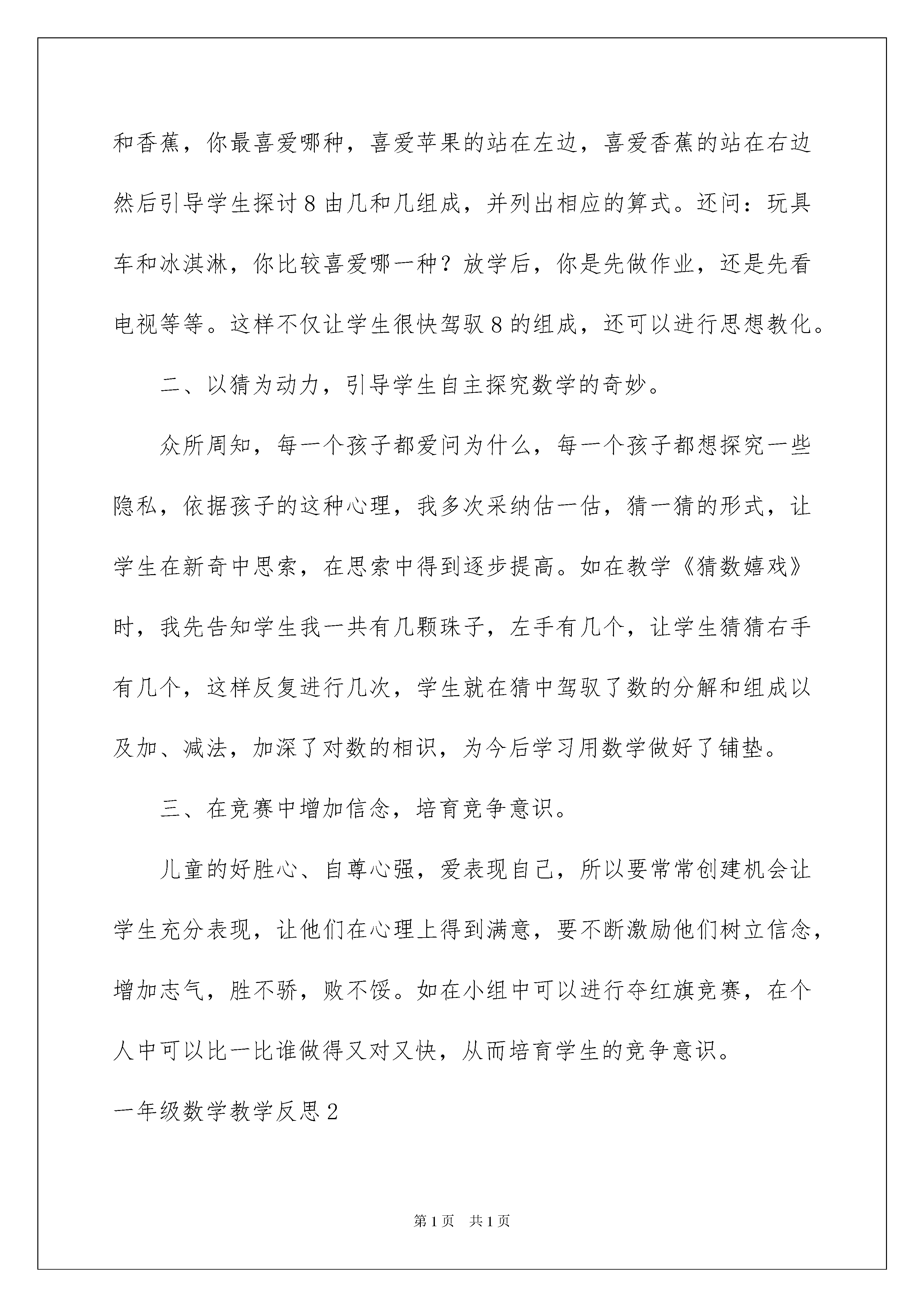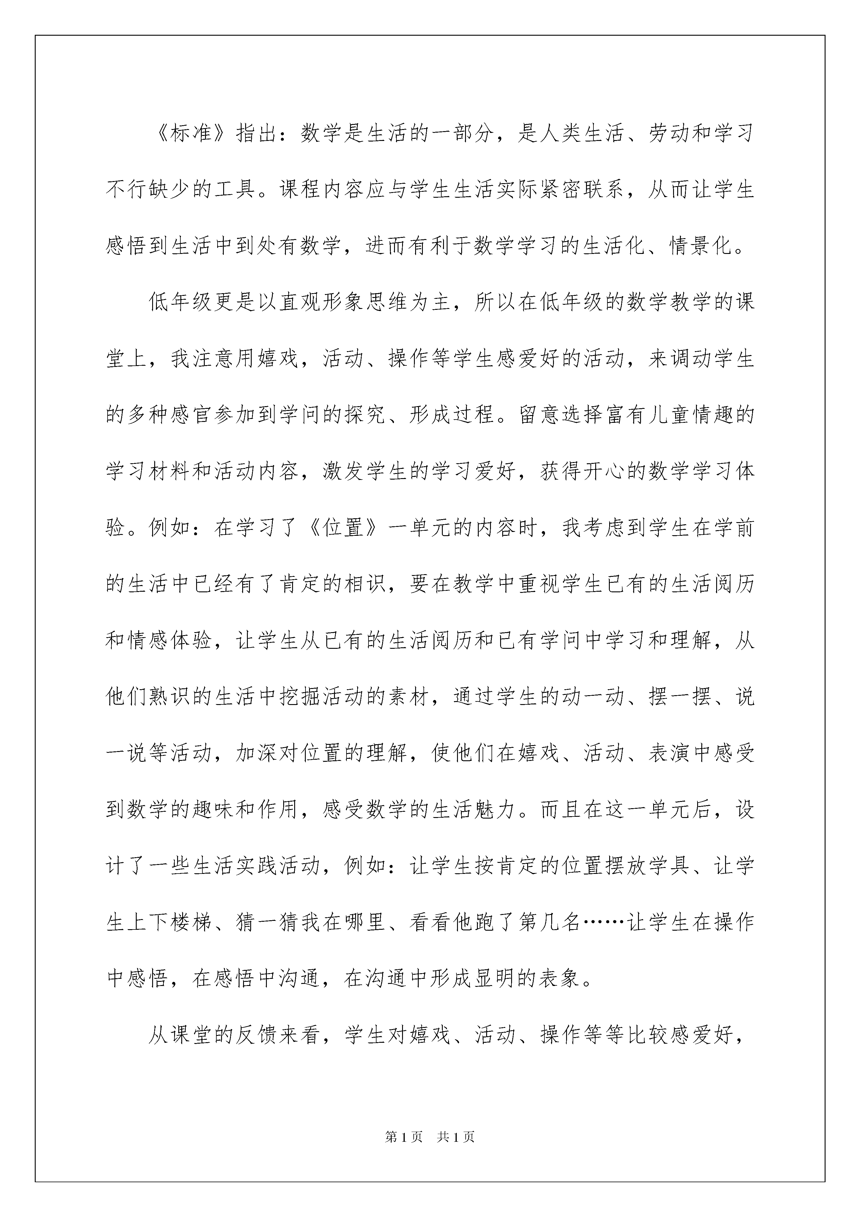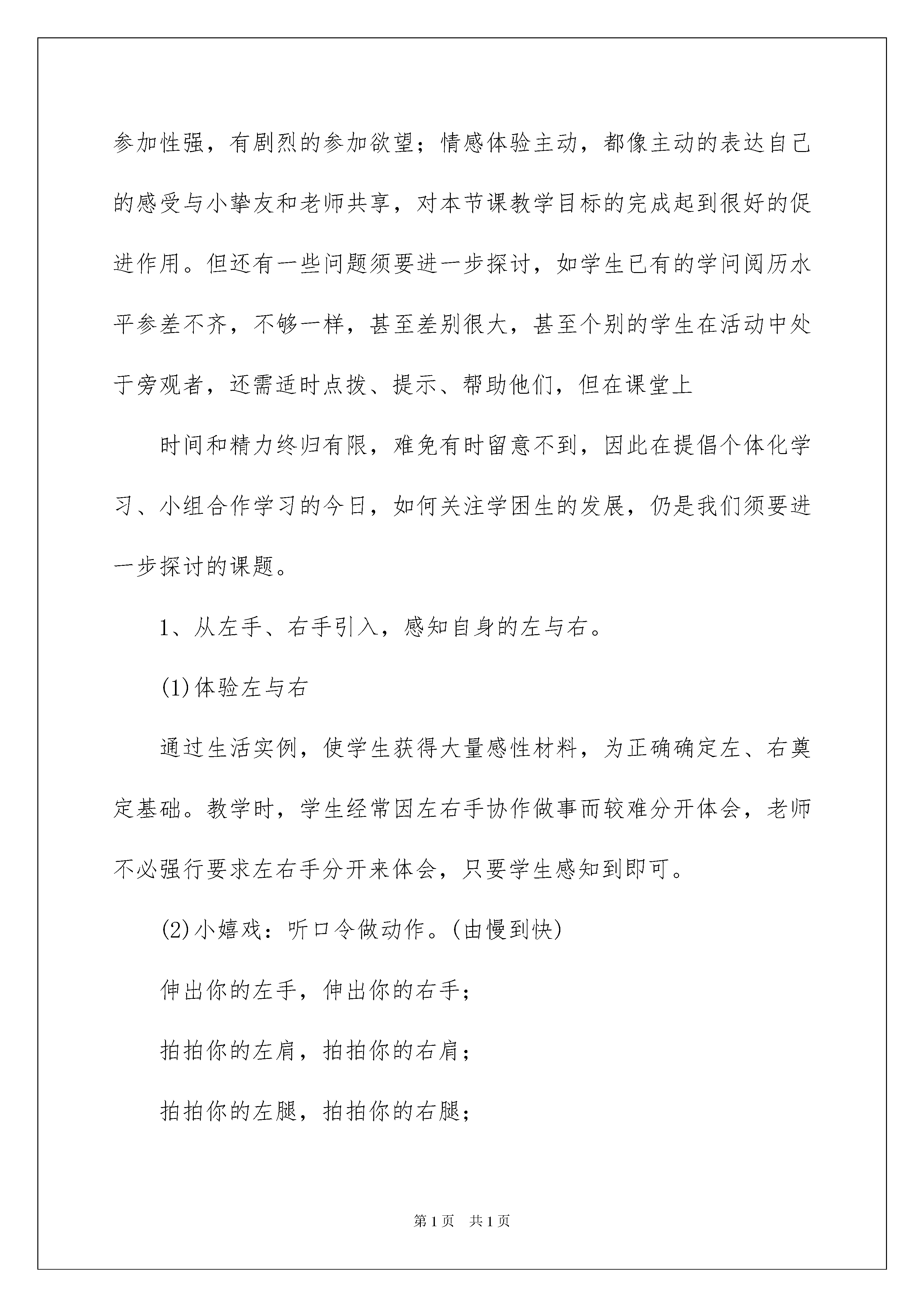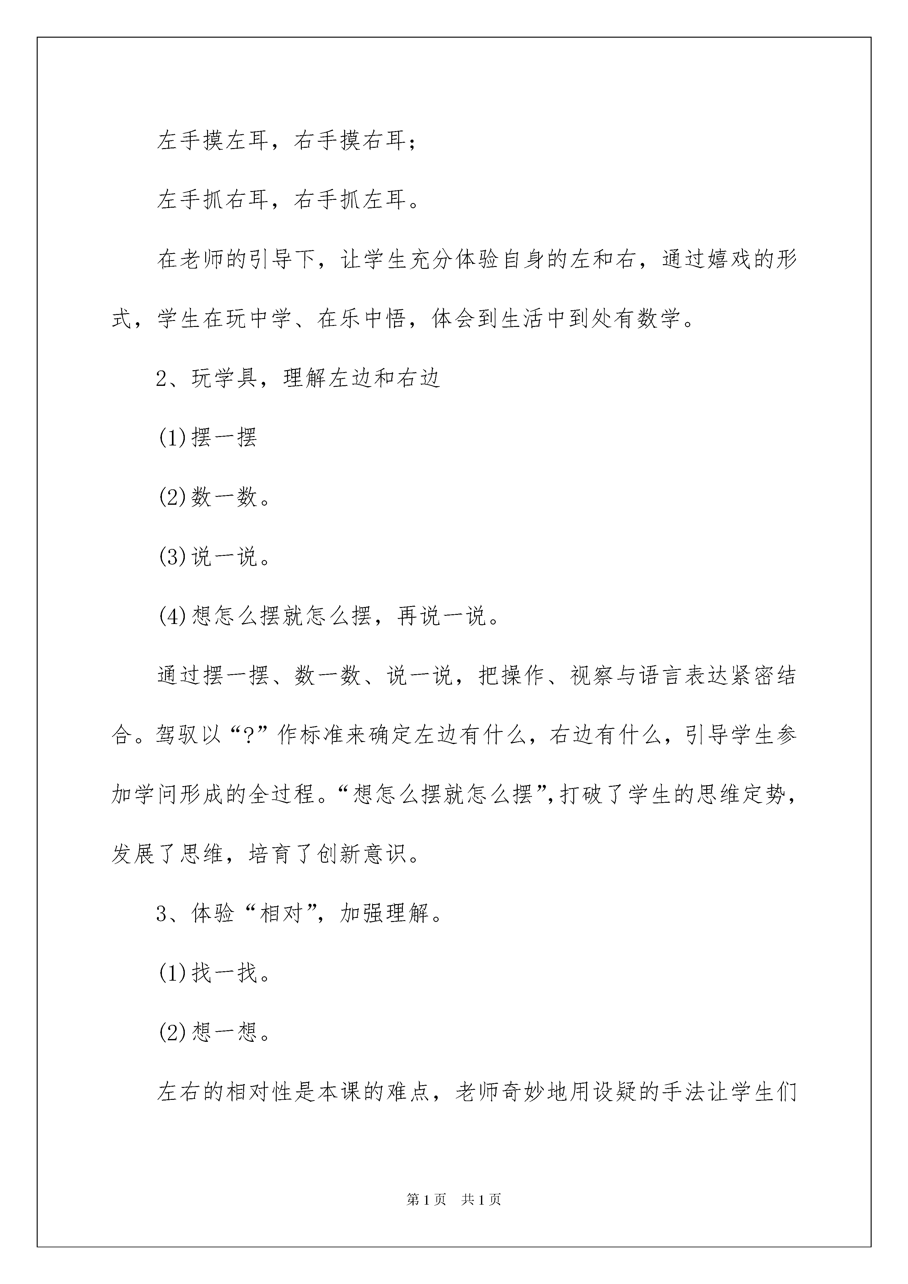 2022一年级数学教学反思一年级数学教学反思身为一名刚到岗的老师,我们的任务之一就是课堂教学,对学到的教学新方法,我们可以记录在教学反思中,优秀的教学反思都具备一些什么特点呢?以下是我为大家整理的一年级数学教学反思,欢迎阅读,希望大家能够喜爱。一年级数学教学反思1爱好是学生最好的老师,是开启学问大门的金钥匙。小学生假如对数学有深厚的爱好,就会产生剧烈的求知欲望,表现出对数学学习的一种特别情感,学习起来就有信念了.下面,我谈谈自己在激趣方面的一点体会。一、创设生活情境,解决数学问题。生动的生活情景,有助于学生了解现实生活中的数学,感受数学与日常生活的亲密联系,增加对数学的亲近感,体验用数学的乐趣。因此,在教学中,我常常设计一些情境,让学生在玩中轻松学习。例如:教《跳绳》时,在主题图讲完后,我请8个同学上台,问:苹果和香蕉,你最喜爱哪种,喜爱苹果的站在左边,喜爱香蕉的站在右边然后引导学生探讨8由几和几组成,并列出相应的算式。还问:玩具车和冰淇淋,你比较喜爱哪一种?放学后,你是先做作业,还是先看电视等等。这样不仅让学生很快驾驭8的组成,还可以进行思想教化。二、以猜为动力,引导学生自主探究数学的奇妙。众所周知,每一个孩子都爱问为什么,每一个孩子都想探究一些隐私,依据孩子的这种心理,我多次采纳估一估,猜一猜的形式,让学生在新奇中思索,在思索中得到逐步提高。如在教学《猜数嬉戏》时,我先告知学生我一共有几颗珠子,左手有几个,让学生猜猜右手有几个,这样反复进行几次,学生就在猜中驾驭了数的分解和组成以及加、减法,加深了对数的相识,为今后学习用数学做好了铺垫。三、在竞赛中增加信念,培育竞争意识。儿童的好胜心、自尊心强,爱表现自己,所以要常常创建机会让学生充分表现,让他们在心理上得到满意,要不断激励他们树立信念,增加志气,胜不骄,败不馁。如在小组中可以进行夺红旗竞赛,在个人中可以比一比谁做得又对又快,从而培育学生的竞争意识。一年级数学教学反思2《标准》指出:数学是生活的一部分,是人类生活、劳动和学习不行缺少的工具。课程内容应与学生生活实际紧密联系,从而让学生感悟到生活中到处有数学,进而有利于数学学习的生活化、情景化。低年级更是以直观形象思维为主,所以在低年级的数学教学的课堂上,我注意用嬉戏,活动、操作等学生感爱好的活动,来调动学生的多种感官参加到学问的探究、形成过程。留意选择富有儿童情趣的学习材料和活动内容,激发学生的学习爱好,获得开心的数学学习体验。例如:在学习了《位置》一单元的内容时,我考虑到学生在学前的生活中已经有了肯定的相识,要在教学中重视学生已有的生活阅历和情感体验,让学生从已有的生活阅历和已有学问中学习和理解,从他们熟识的生活中挖掘活动的素材,通过学生的动一动、摆一摆、说一说等活动,加深对位置的理解,使他们在嬉戏、活动、表演中感受到数学的趣味和作用,感受数学的生活魅力。而且在这一单元后,设计了一些生活实践活动,例如:让学生按肯定的位置摆放学具、让学生上下楼梯、猜一猜我在哪里、看看他跑了第几名……让学生在操作中感悟,在感悟中沟通,在沟通中形成显明的表象。从课堂的反馈来看,学生对嬉戏、活动、操作等等比较感爱好,参加性强,有剧烈的参加欲望;情感体验主动,都像主动的表达自己的感受与小挚友和老师共享,对本节课教学目标的完成起到很好的促进作用。但还有一些问题须要进一步探讨,如学生已有的学问阅历水平参差不齐,不够一样,甚至差别很大,甚至个别的学生在活动中处于旁观者,还需适时点拨、提示、帮助他们,但在课堂上时间和精力终归有限,难免有时留意不到,因此在提倡个体化学习、小组合作学习的今日,如何关注学困生的发展,仍是我们须要进一步探讨的课题。1、从左手、右手引入,感知自身的左与右。(1)体验左与右通过生活实例,使学生获得大量感性材料,为正确确定左、右奠定基础。教学时,学生经常因左右手协作做事而较难分开体会,老师不必强行要求左右手分开来体会,只要学生感知到即可。(2)小嬉戏:听口令做动作。(由慢到快)伸出你的左手,伸出你的右手;拍拍你的左肩,拍拍你的右肩;拍拍你的左腿,拍拍你的右腿;左手摸左耳,右手摸右耳;左手抓右耳,右手抓左耳。在老师的引导下,让学生充分体验自身的左和右,通过嬉戏的形式,学生在玩中学、在乐中悟,体会到生活中到处有数学。2、玩学具,理解左边和右边(1)摆一摆(2)数一数。(3)说一说。(4)想怎么摆就怎么摆,再说一说。通过摆一摆、数一数、说一说,把操作、视察与语言表达紧密结合。驾驭以“?”作标准来确定左边有什么,右边有什么,引导学生参加学问形成的全过程。“想怎么摆就怎么摆”,打破了学生的思