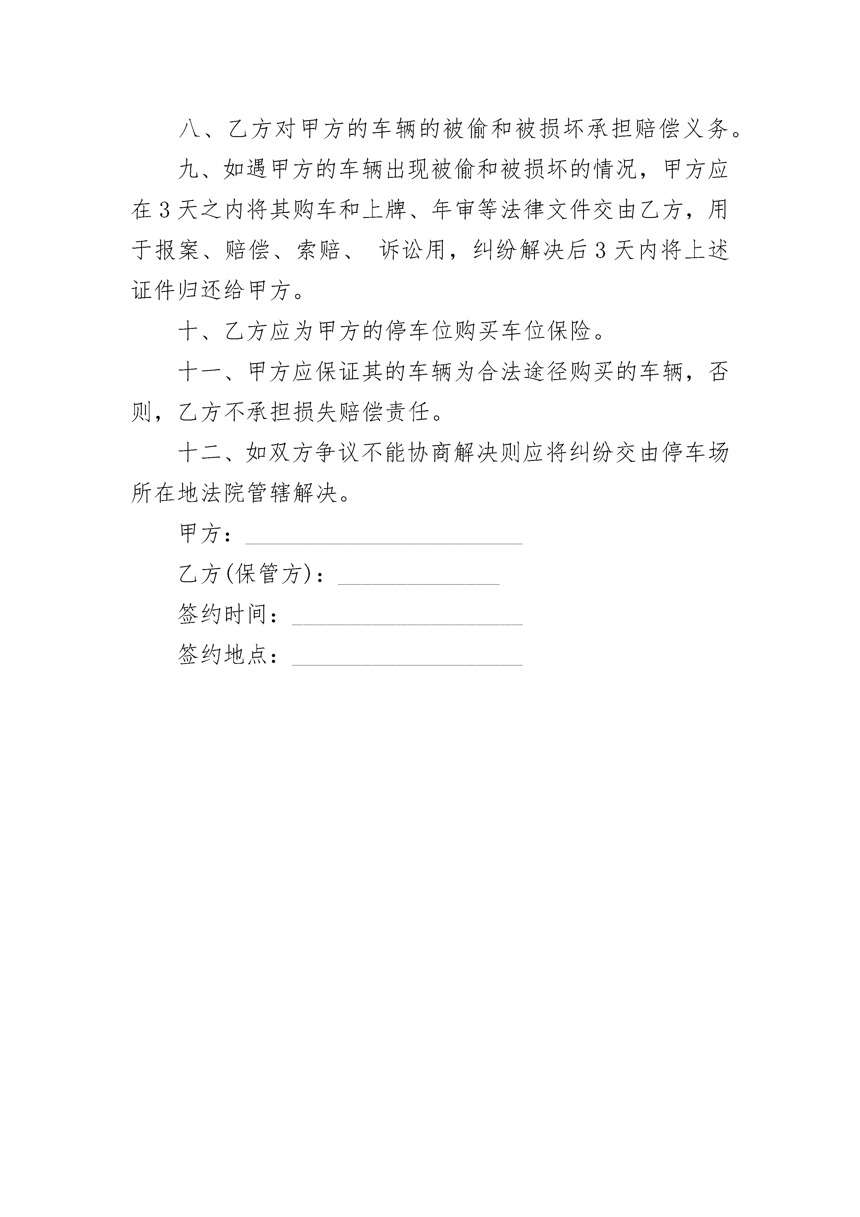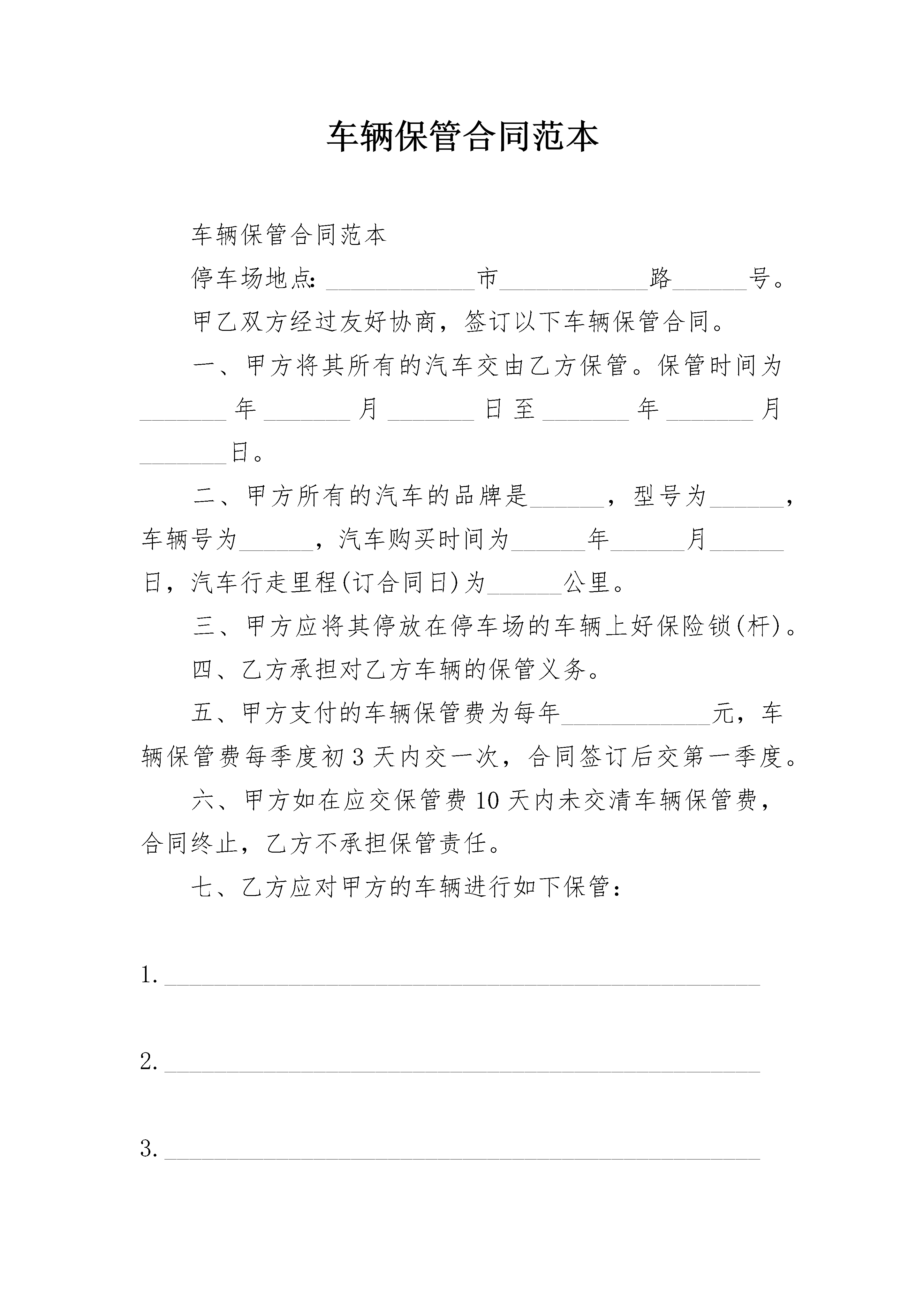 车辆保管合同范本车辆保管合同范本停车场地点:____________市____________路______号。甲乙双方经过友好协商,签订以下车辆保管合同。一、甲方将其所有的汽车交由乙方保管。保管时间为_______年_______月_______日至_______年_______月_______日。二、甲方所有的汽车的品牌是______,型号为______,车辆号为______,汽车购买时间为______年______月______日,汽车行走里程(订合同日)为______公里。三、甲方应将其停放在停车场的车辆上好保险锁(杆)。四、乙方承担对乙方车辆的保管义务。五、甲方支付的车辆保管费为每年____________元,车辆保管费每季度初3天内交一次,合同签订后交第一季度。六、甲方如在应交保管费10天内未交清车辆保管费,合同终止,乙方不承担保管责任。七、乙方应对甲方的车辆进行如下保管:1.________________________________________________2.________________________________________________3.________________________________________________八、乙方对甲方的车辆的被偷和被损坏承担赔偿义务。九、如遇甲方的车辆出现被偷和被损坏的情况,甲方应在3天之内将其购车和上牌、年审等法律文件交由乙方,用于报案、赔偿、索赔、诉讼用,纠纷解决后3天内将上述证件归还给甲方。十、乙方应为甲方的停车位购买车位保险。十一、甲方应保证其的车辆为合法途径购买的车辆,否则,乙方不承担损失赔偿责任。十二、如双方争议不能协商解决则应将纠纷交由停车场所在地法院管辖解决。甲方:________________________乙方(保管方):______________签约时间:____________________签约地点:____________________