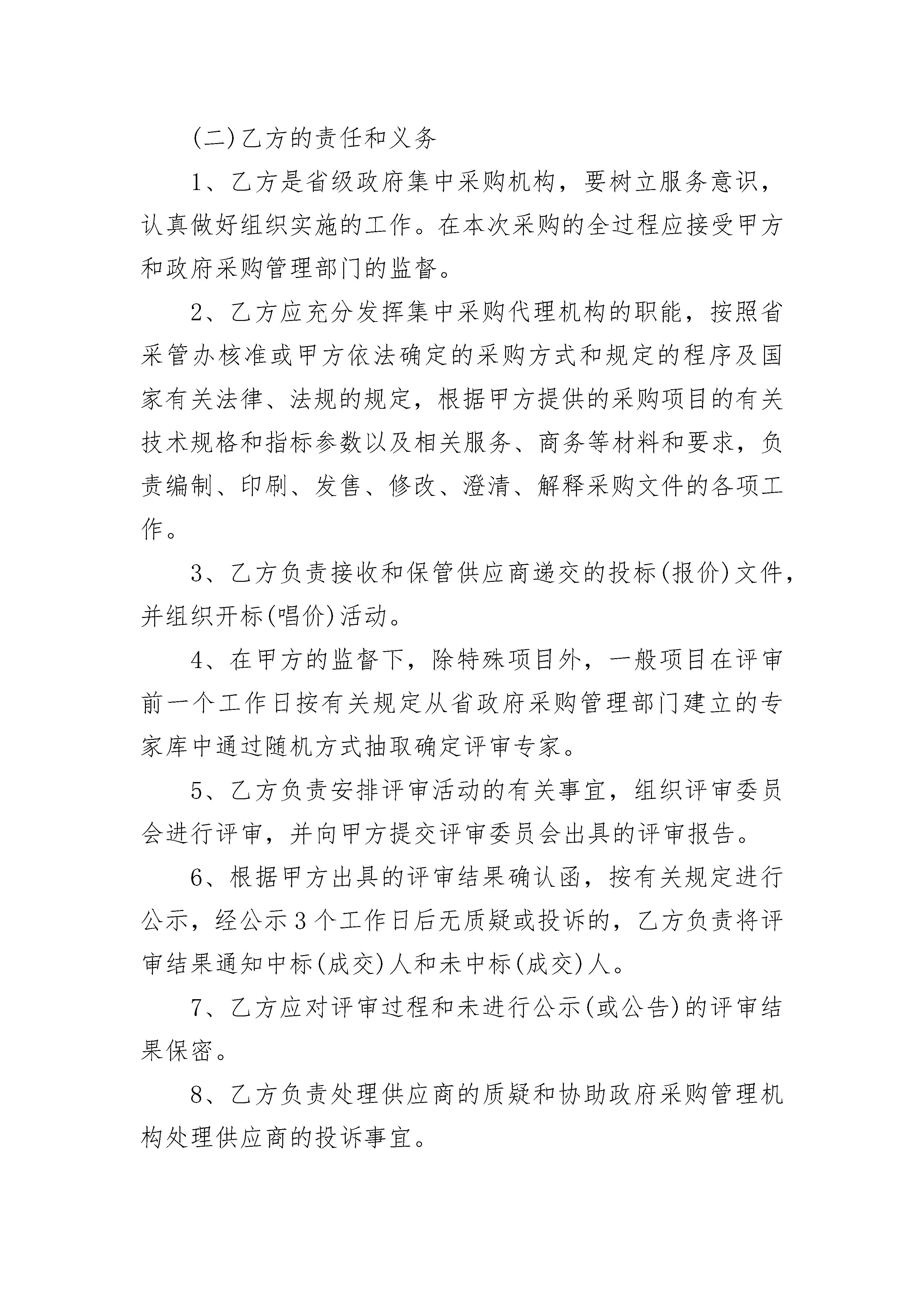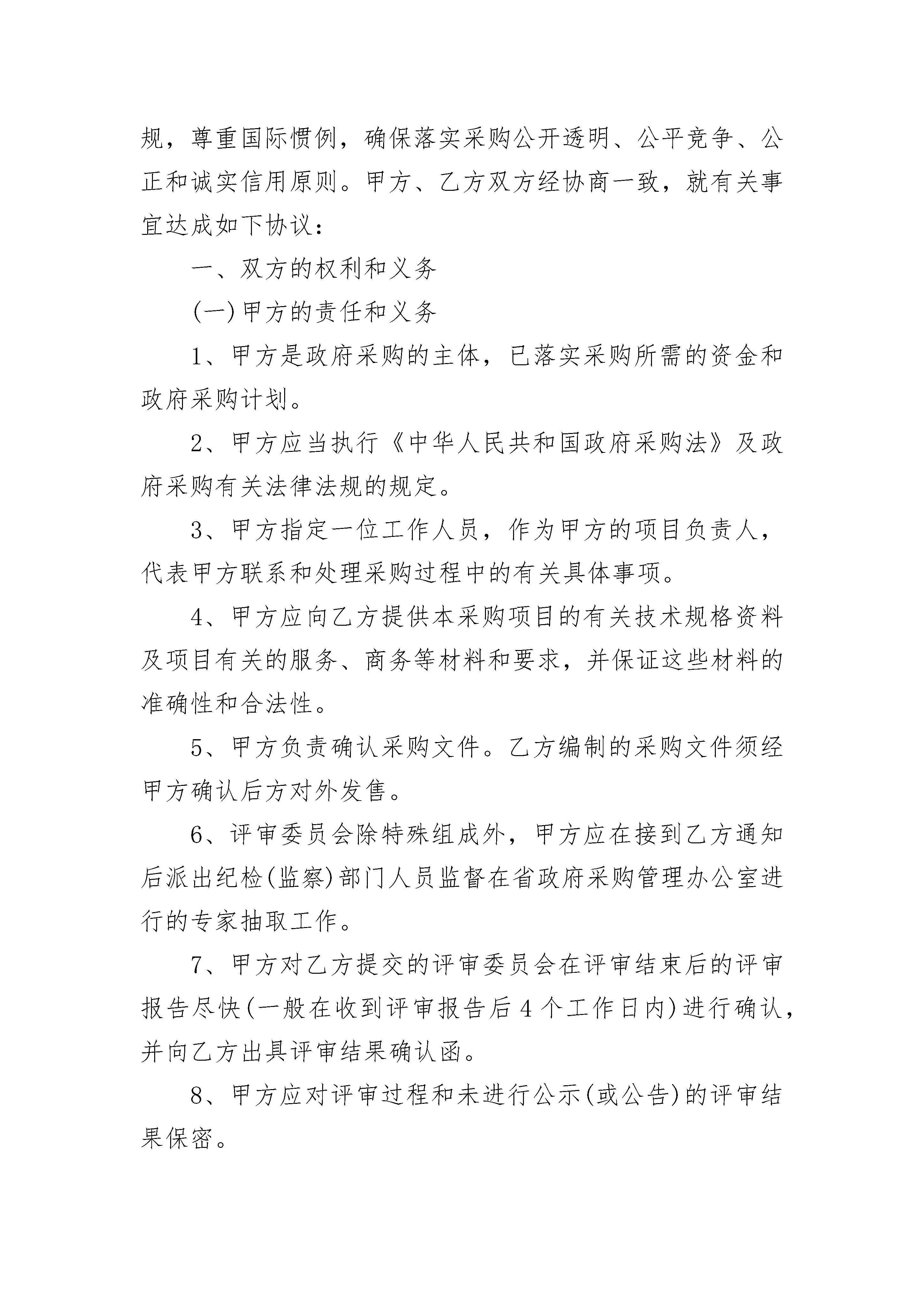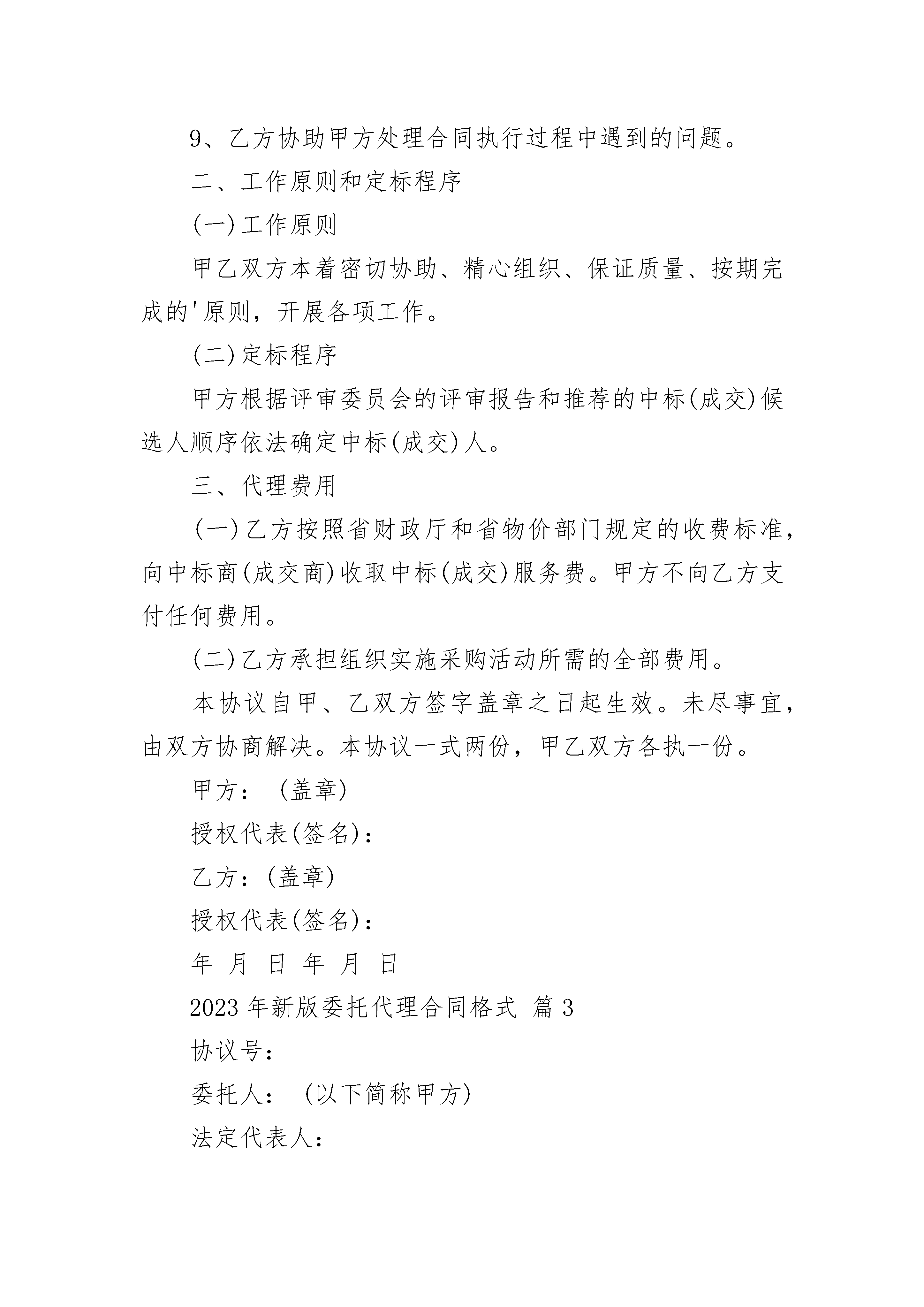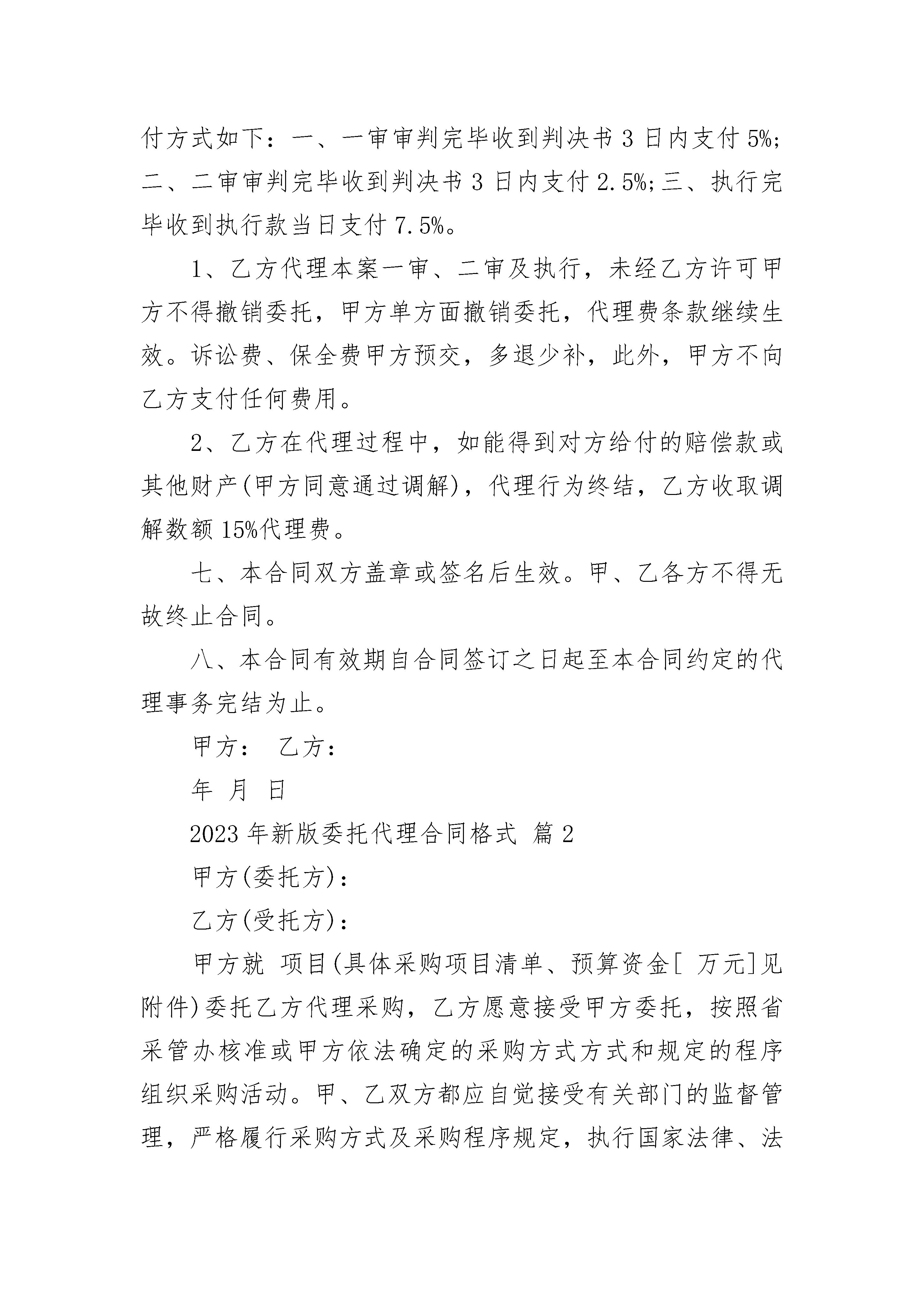2023年新版委托代理合同格式2023年新版委托代理合同格式(通用23篇)2023年新版委托代理合同格式篇1甲方:乙方:一、甲方委托乙方律师代理甲方,办理相关的法律事务。二、甲方委托乙方代理的权限以及办理的具体事项为:全权代理、特别代理:代为取证,代为与对方谈判、和解、代为起诉、应诉、撤诉,代为承认、放弃、变更诉讼请求,代为上诉,代为签署和解协议,代为签署法律文书,代为申请执行,代为接受对方给付的款物,代为接受法院的执行款物以及退回的诉讼费,执行费;以及代为办理其他与该代理事务相关的事宜。三、甲方应当真实的向乙方陈述案情,提供相关的材料和必要的协助。四、乙方律师必须认真全面的履行职责,勤勉诚信,依法维护甲方的合法权益。五、办理案件过程中所需要的诉讼费、鉴定费、保全费、执行费、工商查档费等实际发生过的与案件有关的费用由甲方承担。六、本案甲方按风险代理的方式向乙方支付代理费用:共计收取甲方诉争数额法院支持部分15%的代理费。具体支付方式如下:一、一审审判完毕收到判决书3日内支付5%;二、二审审判完毕收到判决书3日内支付2.5%;三、执行完毕收到执行款当日支付7.5%。1、乙方代理本案一审、二审及执行,未经乙方许可甲方不得撤销委托,甲方单方面撤销委托,代理费条款继续生效。诉讼费、保全费甲方预交,多退少补,此外,甲方不向乙方支付任何费用。2、乙方在代理过程中,如能得到对方给付的赔偿款或其他财产(甲方同意通过调解),代理行为终结,乙方收取调解数额15%代理费。七、本合同双方盖章或签名后生效。甲、乙各方不得无故终止合同。八、本合同有效期自合同签订之日起至本合同约定的代理事务完结为止。甲方:乙方:年月日2023年新版委托代理合同格式篇2甲方(委托方):乙方(受托方):甲方就项目(具体采购项目清单、预算资金[万元]见附件)委托乙方代理采购,乙方愿意接受甲方委托,按照省采管办核准或甲方依法确定的采购方式方式和规定的程序组织采购活动。甲、乙双方都应自觉接受有关部门的监督管理,严格履行采购方式及采购程序规定,执行国家法律、法规,尊重国际惯例,确保落实采购公开透明、公平竞争、公正和诚实信用原则。甲方、乙方双方经协商一致,就有关事宜达成如下协议:一、双方的权利和义务(一)甲方的责任和义务1、甲方是政府采购的主体,已落实采购所需的资金和政府采购计划。2、甲方应当执行《中华人民共和国政府采购法》及政府采购有关法律法规的规定。3、甲方指定一位工作人员,作为甲方的项目负责人,代表甲方联系和处理采购过程中的有关具体事项。4、甲方应向乙方提供本采购项目的有关技术规格资料及项目有关的服务、商务等材料和要求,并保证这些材料的准确性和合法性。5、甲方负责确认采购文件。乙方编制的采购文件须经甲方确认后方对外发售。6、评审委员会除特殊组成外,甲方应在接到乙方通知后派出纪检(监察)部门人员监督在省政府采购管理办公室进行的专家抽取工作。7、甲方对乙方提交的评审委员会在评审结束后的评审报告尽快(一般在收到评审报告后4个工作日内)进行确认,并向乙方出具评审结果确认函。8、甲方应对评审过程和未进行公示(或公告)的评审结果保密。(二)乙方的责任和义务1、乙方是省级政府集中采购机构,要树立服务意识,认真做好组织实施的工作。在本次采购的全过程应接受甲方和政府采购管理部门的监督。2、乙方应充分发挥集中采购代理机构的职能,按照省采管办核准或甲方依法确定的采购方式和规定的程序及国家有关法律、法规的规定,根据甲方提供的采购项目的有关技术规格和指标参数以及相关服务、商务等材料和要求,负责编制、印刷、发售、修改、澄清、解释采购文件的各项工作。3、乙方负责接收和保管供应商递交的投标(报价)文件,并组织开标(唱价)活动。4、在甲方的监督下,除特殊项目外,一般项目在评审前一个工作日按有关规定从省政府采购管理部门建立的专家库中通过随机方式抽取确定评审专家。5、乙方负责安排评审活动的有关事宜,组织评审委员会进行评审,并向甲方提交评审委员会出具的评审报告。6、根据甲方出具的评审结果确认函,按有关规定进行公示,经公示3个工作日后无质疑或投诉的,乙方负责将评审结果通知中标(成交)人和未中标(成交)人。7、乙方应对评审过程和未进行公示(或公告)的评审结果保密。8、乙方负责处理供应商的质疑和协助政府采购管理机构处理供应商的投诉事宜。9、乙方协助甲方处理合同执行过程中遇到的问题。二、工作原则和定标程序(一)工作原则甲乙双方本着密切协助、精心组织、保证质量、按期完成的'原则,开展各项工作。(二)定标程序甲方根据评审委员会的评审报告和推荐的中标(成交)候选人顺序依法确定中标(成交)人。三、代理费用(一)乙方按照省财政厅和省物价部门规定的收费标准,向中标商(成交商)收取中标(成交)服务费。甲方不向乙方支付任何费用。(二)乙方