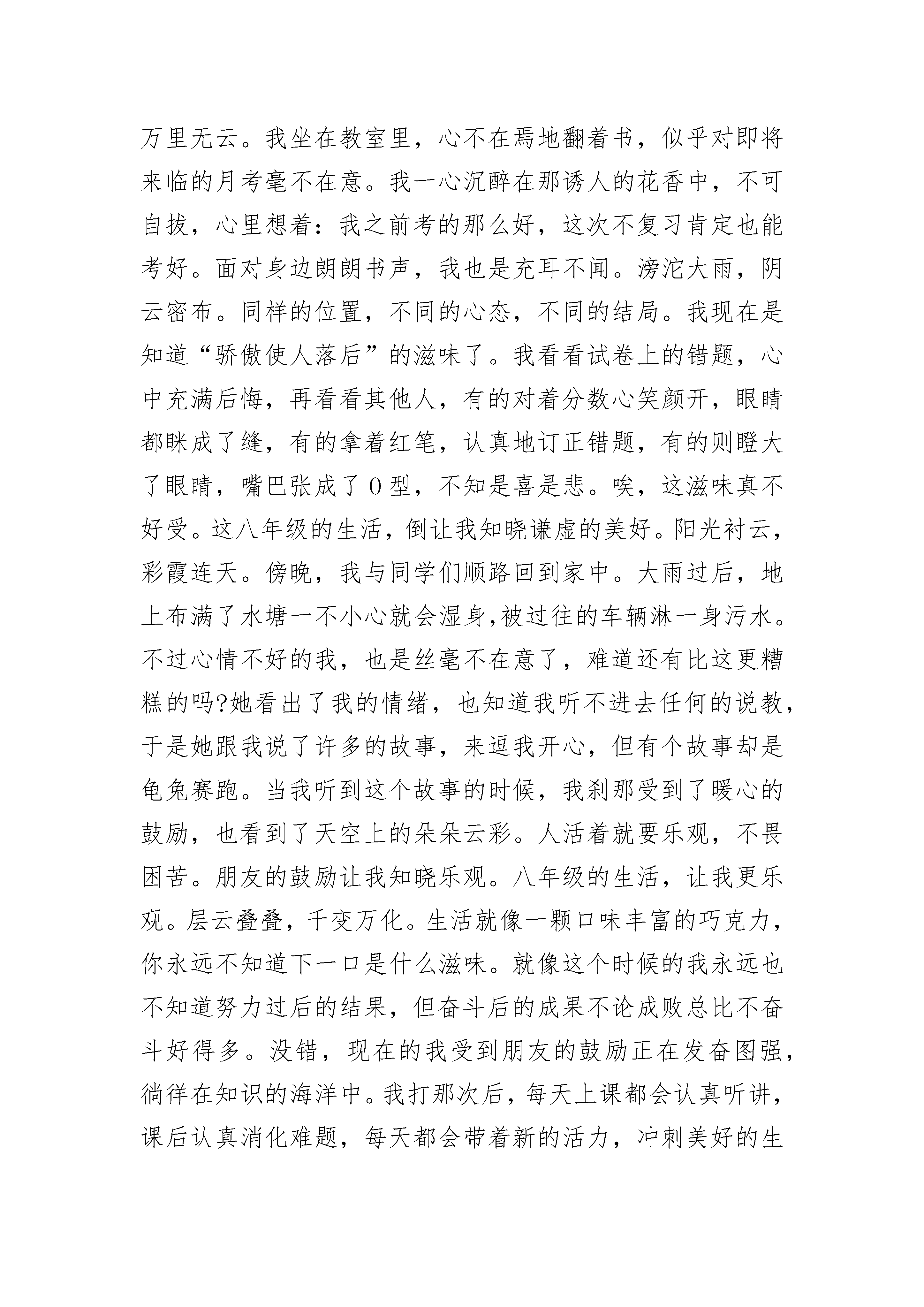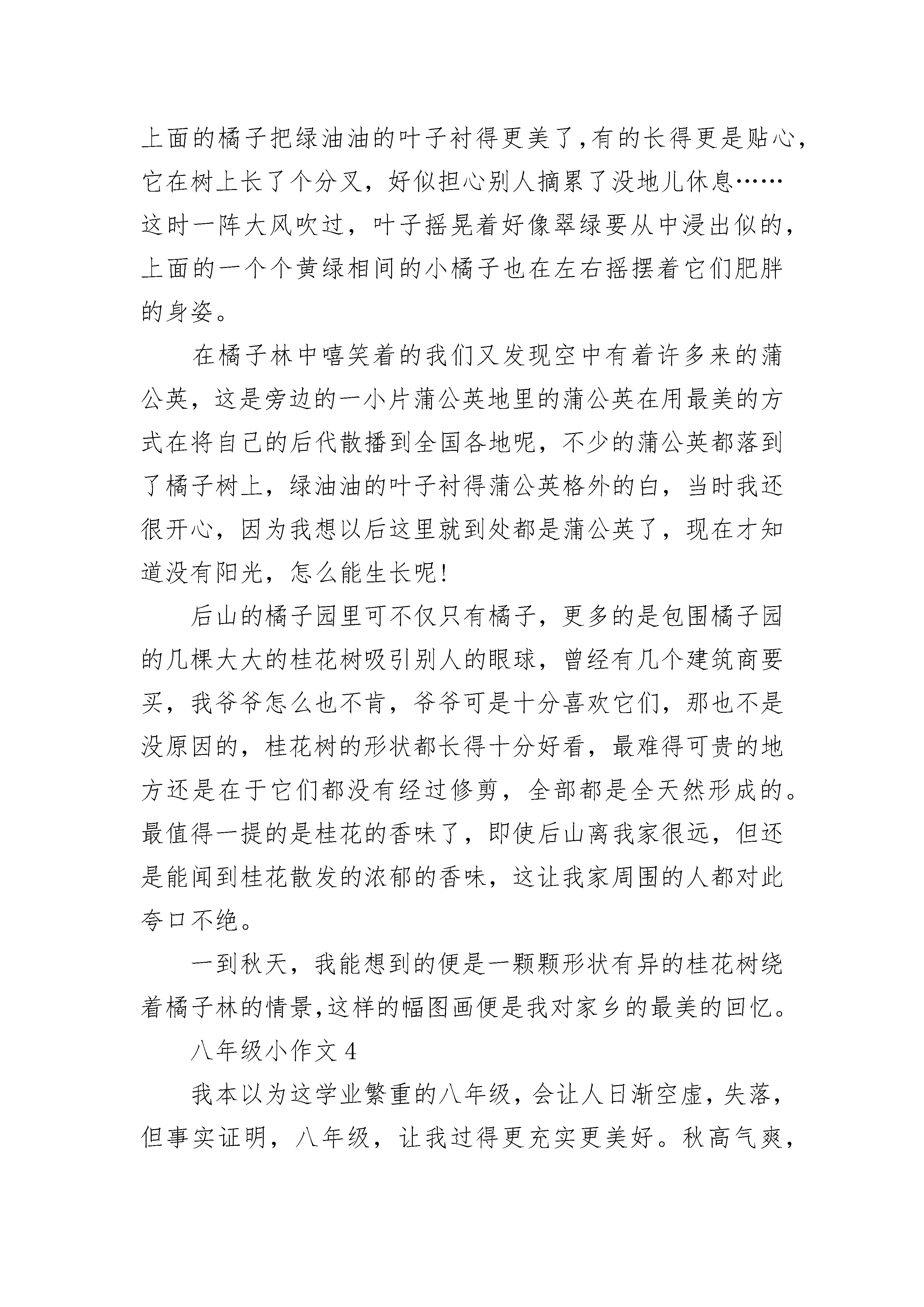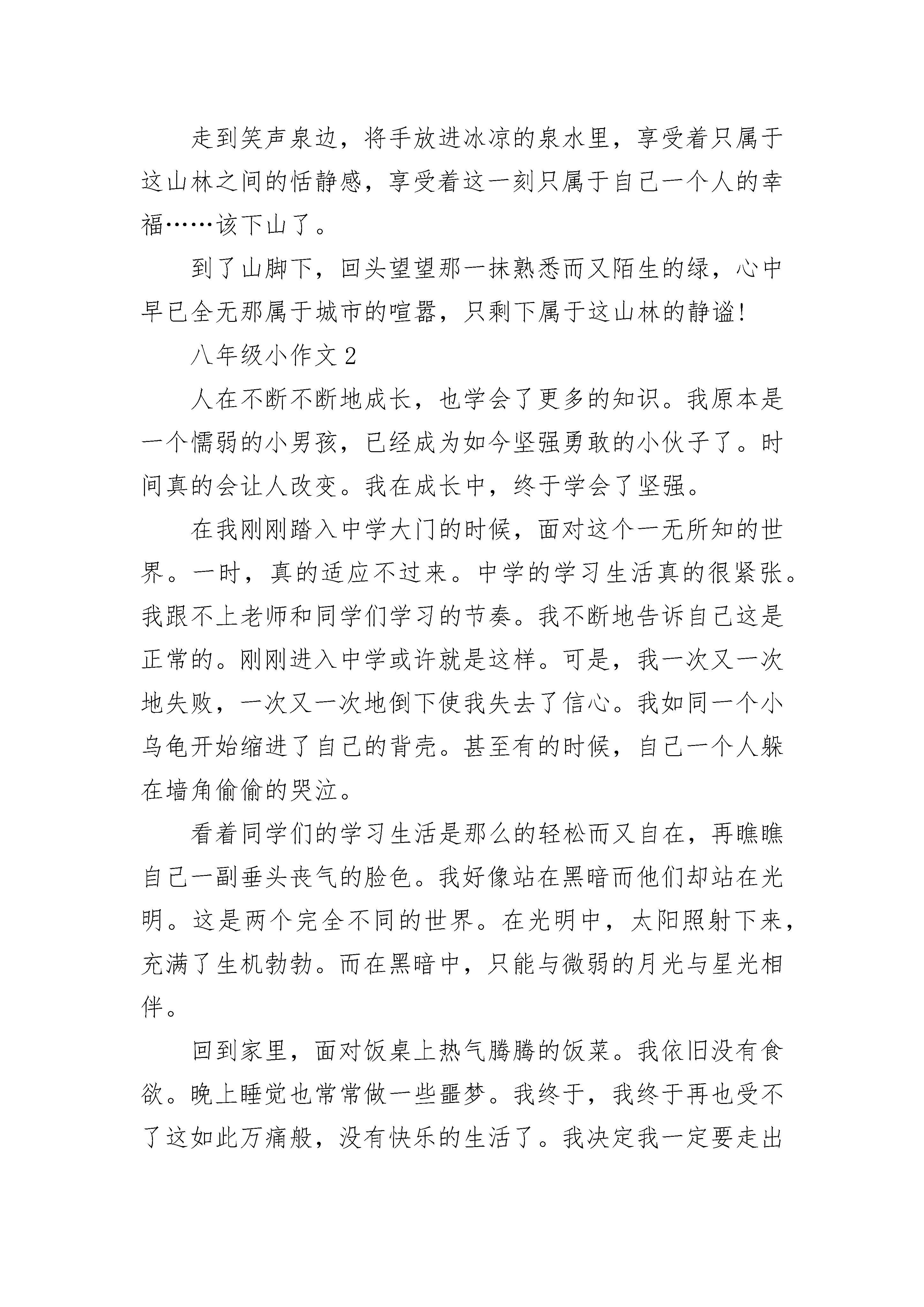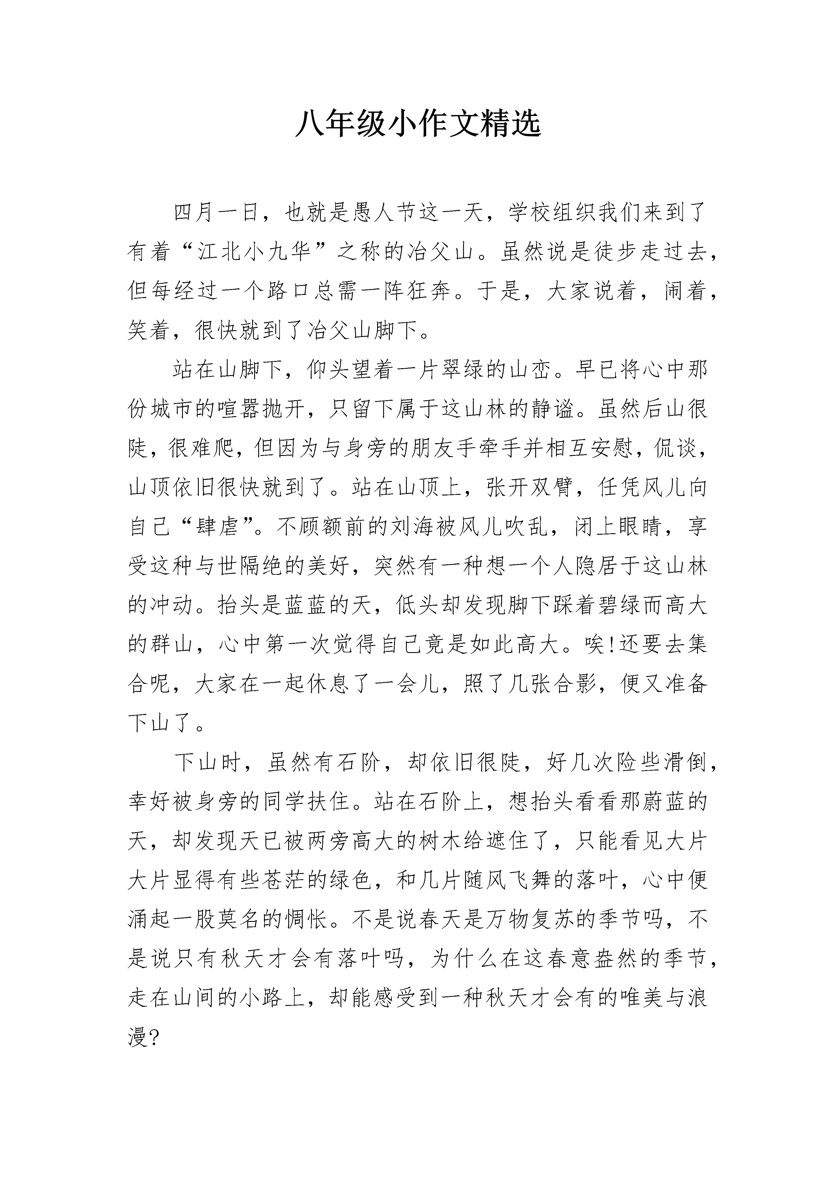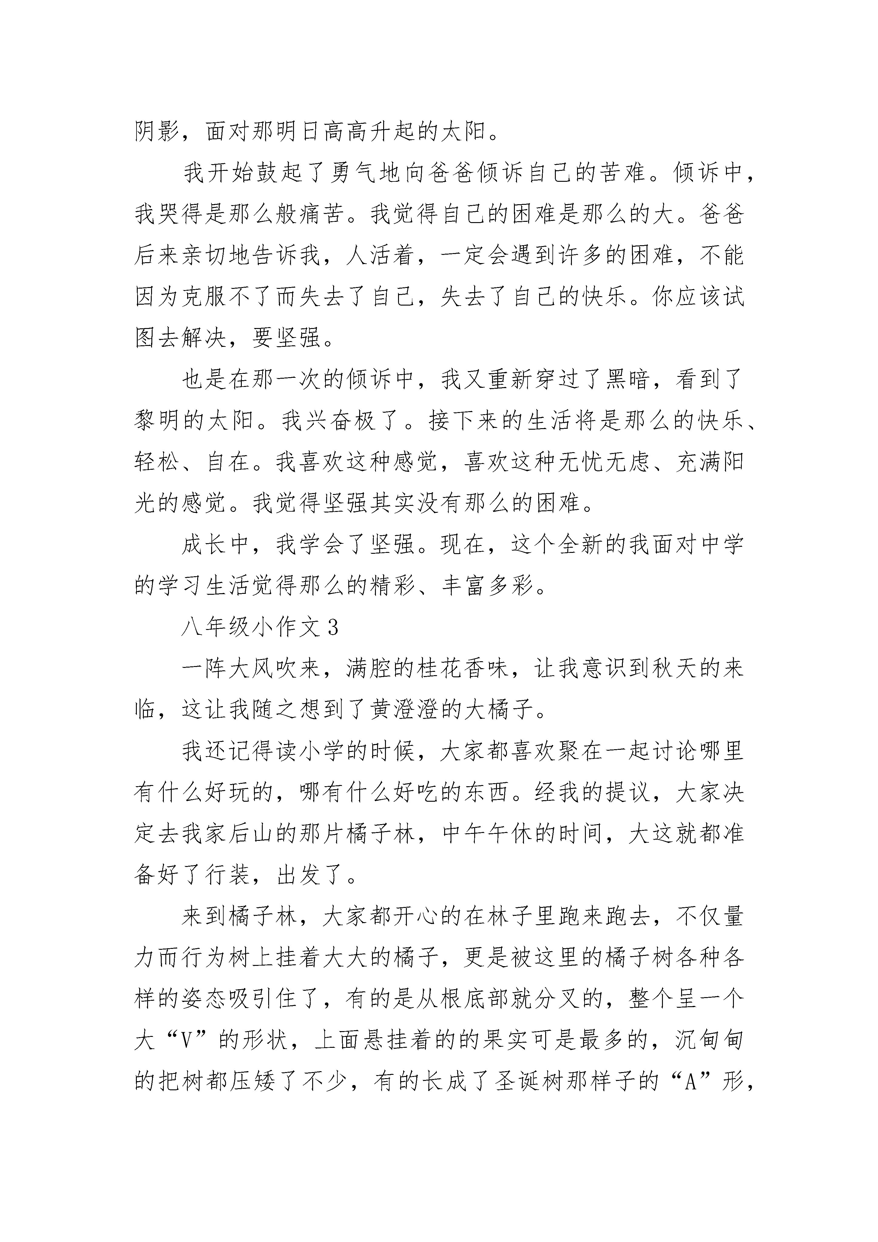 八年级小作文精选四月一日,也就是愚人节这一天,学校组织我们来到了有着“江北小九华”之称的冶父山。虽然说是徒步走过去,但每经过一个路口总需一阵狂奔。于是,大家说着,闹着,笑着,很快就到了冶父山脚下。站在山脚下,仰头望着一片翠绿的山峦。早已将心中那份城市的喧嚣抛开,只留下属于这山林的静谧。虽然后山很陡,很难爬,但因为与身旁的朋友手牵手并相互安慰,侃谈,山顶依旧很快就到了。站在山顶上,张开双臂,任凭风儿向自己“肆虐”。不顾额前的刘海被风儿吹乱,闭上眼睛,享受这种与世隔绝的美好,突然有一种想一个人隐居于这山林的冲动。抬头是蓝蓝的天,低头却发现脚下踩着碧绿而高大的群山,心中第一次觉得自己竟是如此高大。唉!还要去集合呢,大家在一起休息了一会儿,照了几张合影,便又准备下山了。下山时,虽然有石阶,却依旧很陡,好几次险些滑倒,幸好被身旁的同学扶住。站在石阶上,想抬头看看那蔚蓝的天,却发现天已被两旁高大的树木给遮住了,只能看见大片大片显得有些苍茫的绿色,和几片随风飞舞的落叶,心中便涌起一股莫名的惆怅。不是说春天是万物复苏的季节吗,不是说只有秋天才会有落叶吗,为什么在这春意盎然的季节,走在山间的小路上,却能感受到一种秋天才会有的唯美与浪漫?走到笑声泉边,将手放进冰凉的泉水里,享受着只属于这山林之间的恬静感,享受着这一刻只属于自己一个人的幸福……该下山了。到了山脚下,回头望望那一抹熟悉而又陌生的绿,心中早已全无那属于城市的喧嚣,只剩下属于这山林的静谧!八年级小作文2人在不断不断地成长,也学会了更多的知识。我原本是一个懦弱的小男孩,已经成为如今坚强勇敢的小伙子了。时间真的会让人改变。我在成长中,终于学会了坚强。在我刚刚踏入中学大门的时候,面对这个一无所知的世界。一时,真的适应不过来。中学的学习生活真的很紧张。我跟不上老师和同学们学习的节奏。我不断地告诉自己这是正常的。刚刚进入中学或许就是这样。可是,我一次又一次地失败,一次又一次地倒下使我失去了信心。我如同一个小乌龟开始缩进了自己的背壳。甚至有的时候,自己一个人躲在墙角偷偷的哭泣。看着同学们的学习生活是那么的轻松而又自在,再瞧瞧自己一副垂头丧气的脸色。我好像站在黑暗而他们却站在光明。这是两个完全不同的世界。在光明中,太阳照射下来,充满了生机勃勃。而在黑暗中,只能与微弱的月光与星光相伴。回到家里,面对饭桌上热气腾腾的饭菜。我依旧没有食欲。晚上睡觉也常常做一些噩梦。我终于,我终于再也受不了这如此万痛般,没有快乐的生活了。我决定我一定要走出阴影,面对那明日高高升起的太阳。我开始鼓起了勇气地向爸爸倾诉自己的苦难。倾诉中,我哭得是那么般痛苦。我觉得自己的困难是那么的大。爸爸后来亲切地告诉我,人活着,一定会遇到许多的困难,不能因为克服不了而失去了自己,失去了自己的快乐。你应该试图去解决,要坚强。也是在那一次的倾诉中,我又重新穿过了黑暗,看到了黎明的太阳。我兴奋极了。接下来的生活将是那么的快乐、轻松、自在。我喜欢这种感觉,喜欢这种无忧无虑、充满阳光的感觉。我觉得坚强其实没有那么的困难。成长中,我学会了坚强。现在,这个全新的我面对中学的学习生活觉得那么的精彩、丰富多彩。八年级小作文3一阵大风吹来,满腔的桂花香味,让我意识到秋天的来临,这让我随之想到了黄澄澄的大橘子。我还记得读小学的时候,大家都喜欢聚在一起讨论哪里有什么好玩的,哪有什么好吃的东西。经我的提议,大家决定去我家后山的那片橘子林,中午午休的时间,大这就都准备好了行装,出发了。来到橘子林,大家都开心的在林子里跑来跑去,不仅量力而行为树上挂着大大的橘子,更是被这里的橘子树各种各样的姿态吸引住了,有的是从根底部就分叉的,整个呈一个大“V”的形状,上面悬挂着的的果实可是最多的,沉甸甸的把树都压矮了不少,有的长成了圣诞树那样子的“A”形,上面的橘子把绿油油的叶子衬得更美了,有的长得更是贴心,它在树上长了个分叉,好似担心别人摘累了没地儿休息……这时一阵大风吹过,叶子摇晃着好像翠绿要从中浸出似的,上面的一个个黄绿相间的小橘子也在左右摇摆着它们肥胖的身姿。在橘子林中嘻笑着的我们又发现空中有着许多来的蒲公英,这是旁边的一小片蒲公英地里的蒲公英在用最美的方式在将自己的后代散播到全国各地呢,不少的蒲公英都落到了橘子树上,绿油油的叶子衬得蒲公英格外的白,当时我还很开心,因为我想以后这里就到处都是蒲公英了,现在才知道没有阳光,怎么能生长呢!后山的橘子园里可不仅只有橘子,更多的是包围橘子园的几棵大大的桂花树吸引别人的眼球,曾经有几个建筑商要买,我爷爷怎么也不肯,爷爷可是十分喜欢它们,那也不是没原因的,桂花树的形状都长得十分好看,最难得可贵的地方还是在于它们都没有经过修剪,全部都是全天然形成的。最值得一提的是桂花的香味了,即使后山离我家很远,但还是能闻到桂花散发的浓郁的香味,这让我家周