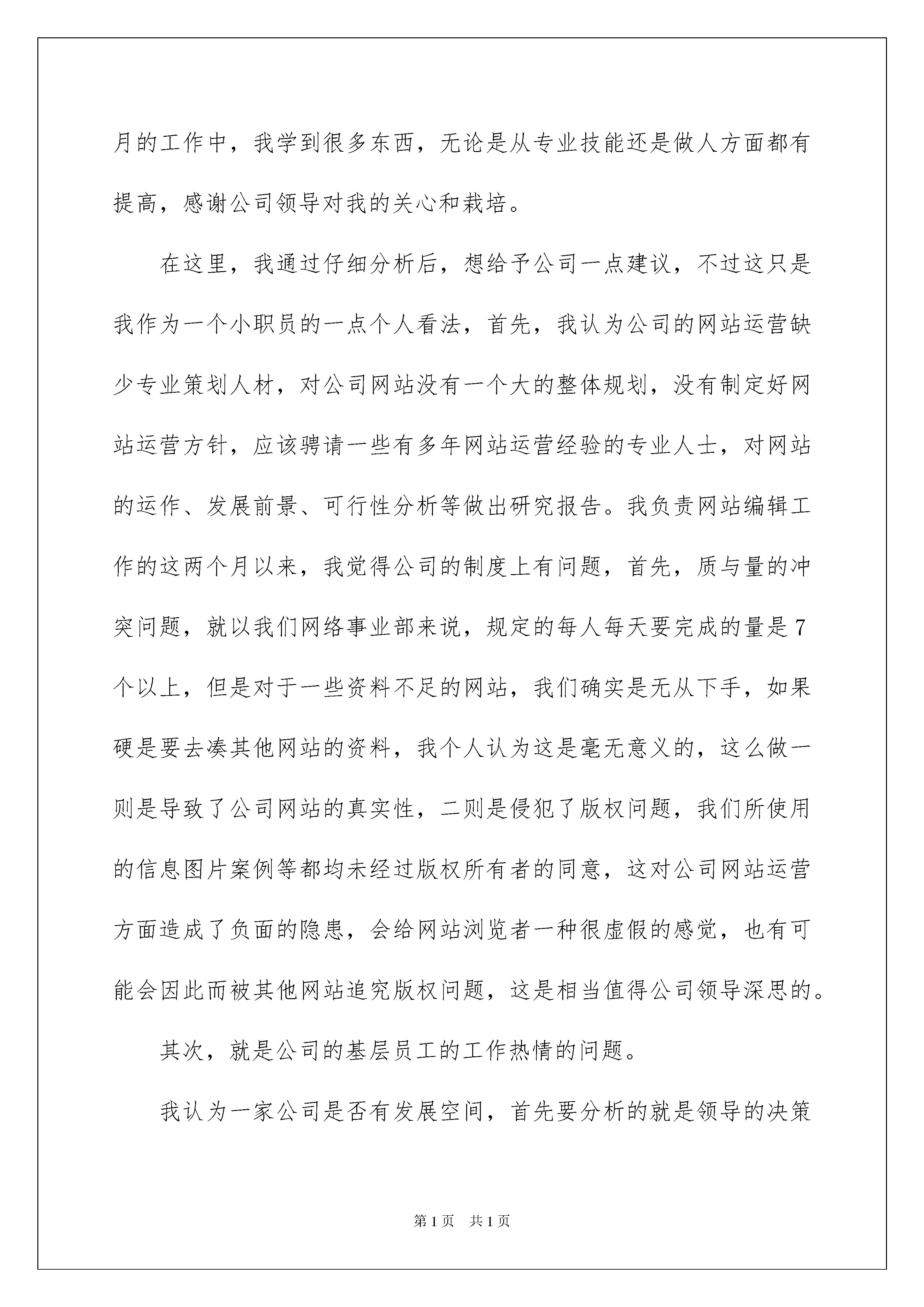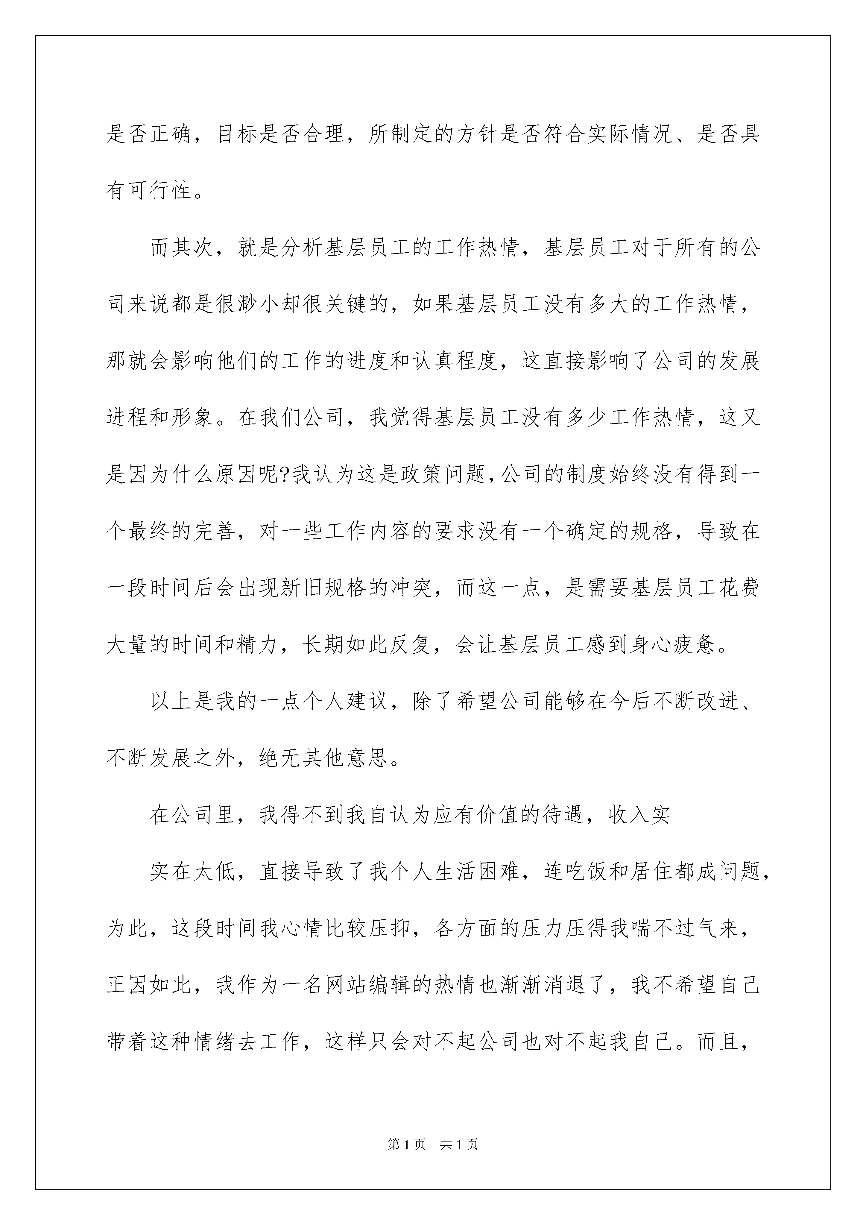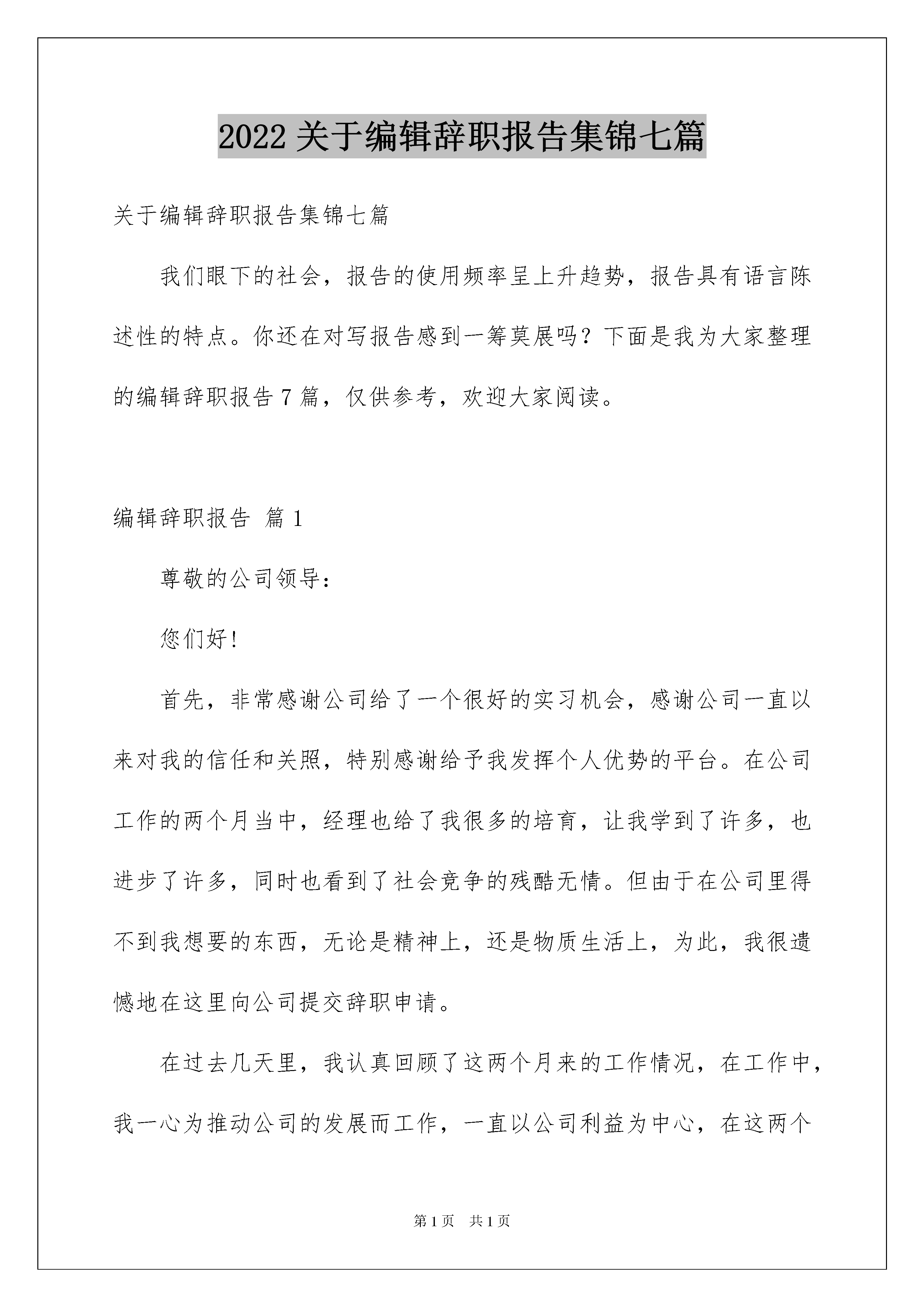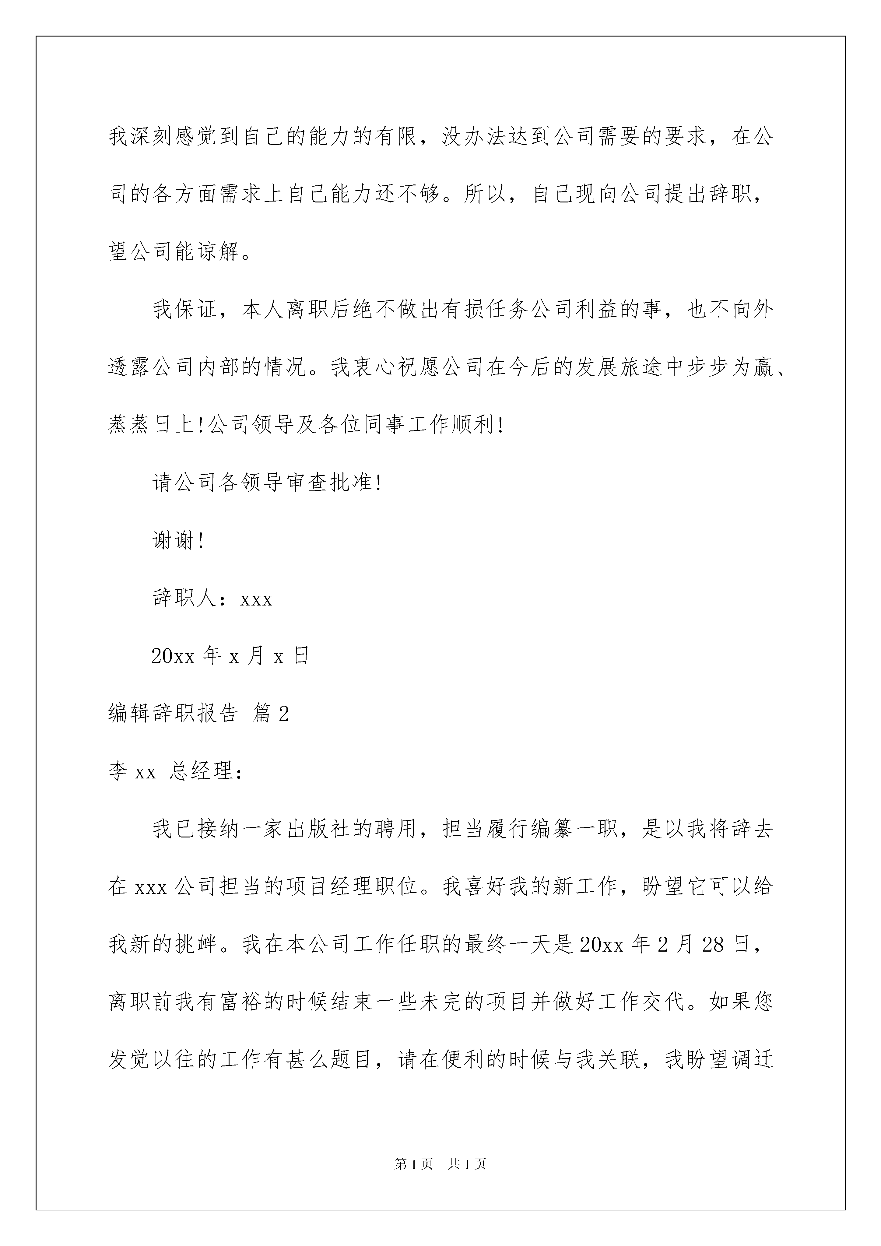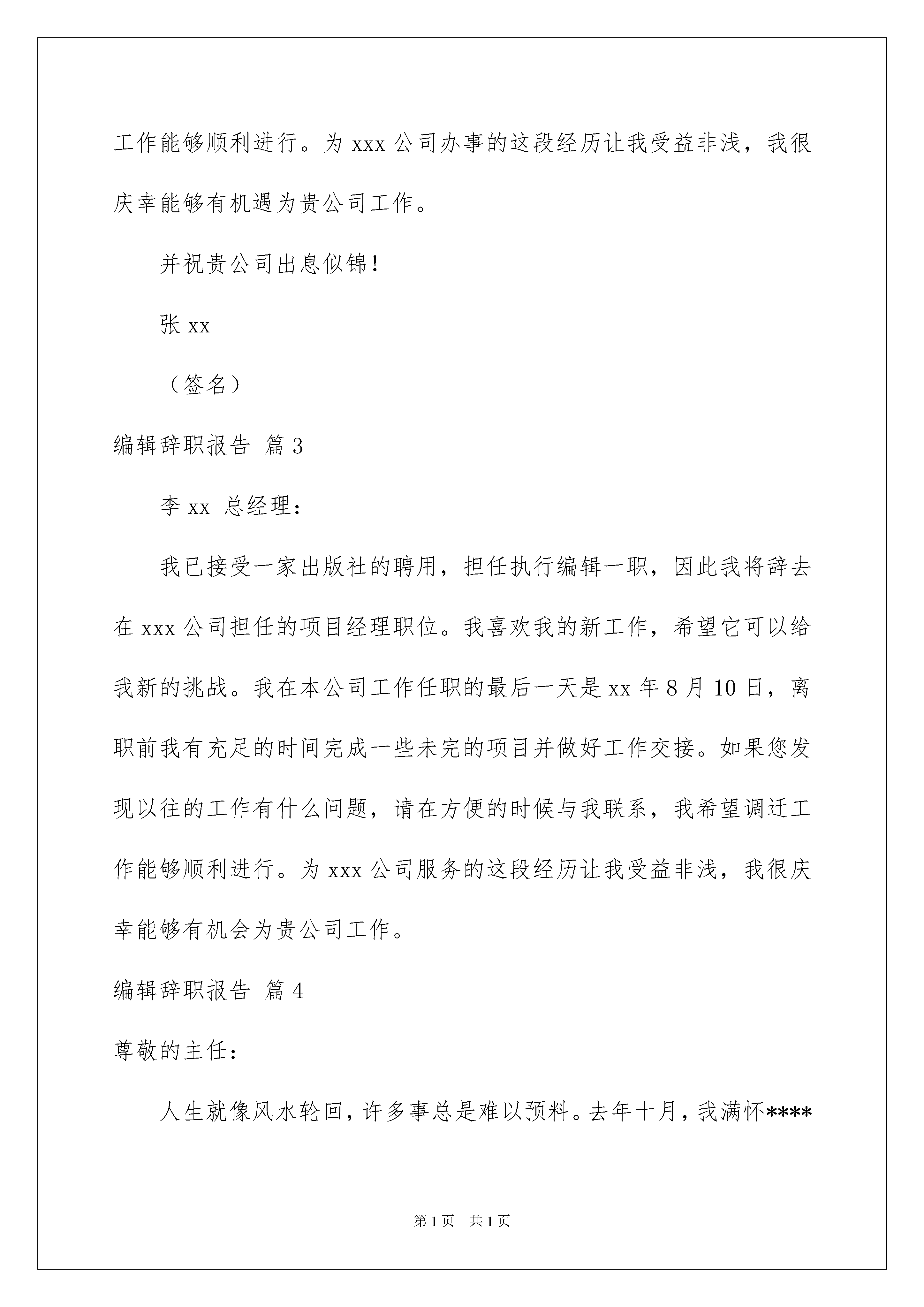 2022关于编辑辞职报告集锦七篇关于编辑辞职报告集锦七篇我们眼下的社会,报告的使用频率呈上升趋势,报告具有语言陈述性的特点。你还在对写报告感到一筹莫展吗?下面是我为大家整理的编辑辞职报告7篇,仅供参考,欢迎大家阅读。编辑辞职报告篇1尊敬的公司领导:您们好!首先,非常感谢公司给了一个很好的实习机会,感谢公司一直以来对我的信任和关照,特别感谢给予我发挥个人优势的平台。在公司工作的两个月当中,经理也给了我很多的培育,让我学到了许多,也进步了许多,同时也看到了社会竞争的残酷无情。但由于在公司里得不到我想要的东西,无论是精神上,还是物质生活上,为此,我很遗憾地在这里向公司提交辞职申请。在过去几天里,我认真回顾了这两个月来的工作情况,在工作中,我一心为推动公司的发展而工作,一直以公司利益为中心,在这两个月的工作中,我学到很多东西,无论是从专业技能还是做人方面都有提高,感谢公司领导对我的关心和栽培。在这里,我通过仔细分析后,想给予公司一点建议,不过这只是我作为一个小职员的一点个人看法,首先,我认为公司的网站运营缺少专业策划人材,对公司网站没有一个大的整体规划,没有制定好网站运营方针,应该骋请一些有多年网站运营经验的专业人士,对网站的运作、发展前景、可行性分析等做出研究报告。我负责网站编辑工作的这两个月以来,我觉得公司的制度上有问题,首先,质与量的冲突问题,就以我们网络事业部来说,规定的每人每天要完成的量是7个以上,但是对于一些资料不足的网站,我们确实是无从下手,如果硬是要去凑其他网站的资料,我个人认为这是毫无意义的,这么做一则是导致了公司网站的真实性,二则是侵犯了版权问题,我们所使用的信息图片案例等都均未经过版权所有者的同意,这对公司网站运营方面造成了负面的隐患,会给网站浏览者一种很虚假的感觉,也有可能会因此而被其他网站追究版权问题,这是相当值得公司领导深思的。其次,就是公司的基层员工的工作热情的问题。我认为一家公司是否有发展空间,首先要分析的就是领导的决策是否正确,目标是否合理,所制定的方针是否符合实际情况、是否具有可行性。而其次,就是分析基层员工的工作热情,基层员工对于所有的公司来说都是很渺小却很关键的,如果基层员工没有多大的工作热情,那就会影响他们的工作的进度和认真程度,这直接影响了公司的发展进程和形象。在我们公司,我觉得基层员工没有多少工作热情,这又是因为什么原因呢?我认为这是政策问题,公司的制度始终没有得到一个最终的完善,对一些工作内容的要求没有一个确定的规格,导致在一段时间后会出现新旧规格的冲突,而这一点,是需要基层员工花费大量的时间和精力,长期如此反复,会让基层员工感到身心疲惫。以上是我的一点个人建议,除了希望公司能够在今后不断改进、不断发展之外,绝无其他意思。在公司里,我得不到我自认为应有价值的待遇,收入实实在太低,直接导致了我个人生活困难,连吃饭和居住都成问题,为此,这段时间我心情比较压抑,各方面的压力压得我喘不过气来,正因如此,我作为一名网站编辑的热情也渐渐消退了,我不希望自己带着这种情绪去工作,这样只会对不起公司也对不起我自己。而且,我深刻感觉到自己的能力的有限,没办法达到公司需要的要求,在公司的各方面需求上自己能力还不够。所以,自己现向公司提出辞职,望公司能谅解。我保证,本人离职后绝不做出有损任务公司利益的事,也不向外透露公司内部的情况。我衷心祝愿公司在今后的发展旅途中步步为赢、蒸蒸日上!公司领导及各位同事工作顺利!请公司各领导审查批准!谢谢!辞职人:xxx20xx年x月x日编辑辞职报告篇2李xx总经理:我已接纳一家出版社的聘用,担当履行编纂一职,是以我将辞去在xxx公司担当的项目经理职位。我喜好我的新工作,盼望它可以给我新的挑衅。我在本公司工作任职的最终一天是20xx年2月28日,离职前我有富裕的时候结束一些未完的项目并做好工作交代。如果您发觉以往的工作有甚么题目,请在便利的时候与我关联,我盼望调迁工作能够顺利进行。为xxx公司办事的这段经历让我受益非浅,我很庆幸能够有机遇为贵公司工作。并祝贵公司出息似锦!张xx(签名)编辑辞职报告篇3李xx总经理:我已接受一家出版社的聘用,担任执行编辑一职,因此我将辞去在xxx公司担任的项目经理职位。我喜欢我的新工作,希望它可以给我新的挑战。我在本公司工作任职的最后一天是xx年8月10日,离职前我有充足的时间完成一些未完的项目并做好工作交接。如果您发现以往的工作有什么问题,请在方便的时候与我联系,我希望调迁工作能够顺利进行。为xxx公司服务的这段经历让我受益非浅,我很庆幸能够有机会为贵公司工作。编辑辞职报告篇4尊敬的主任:人