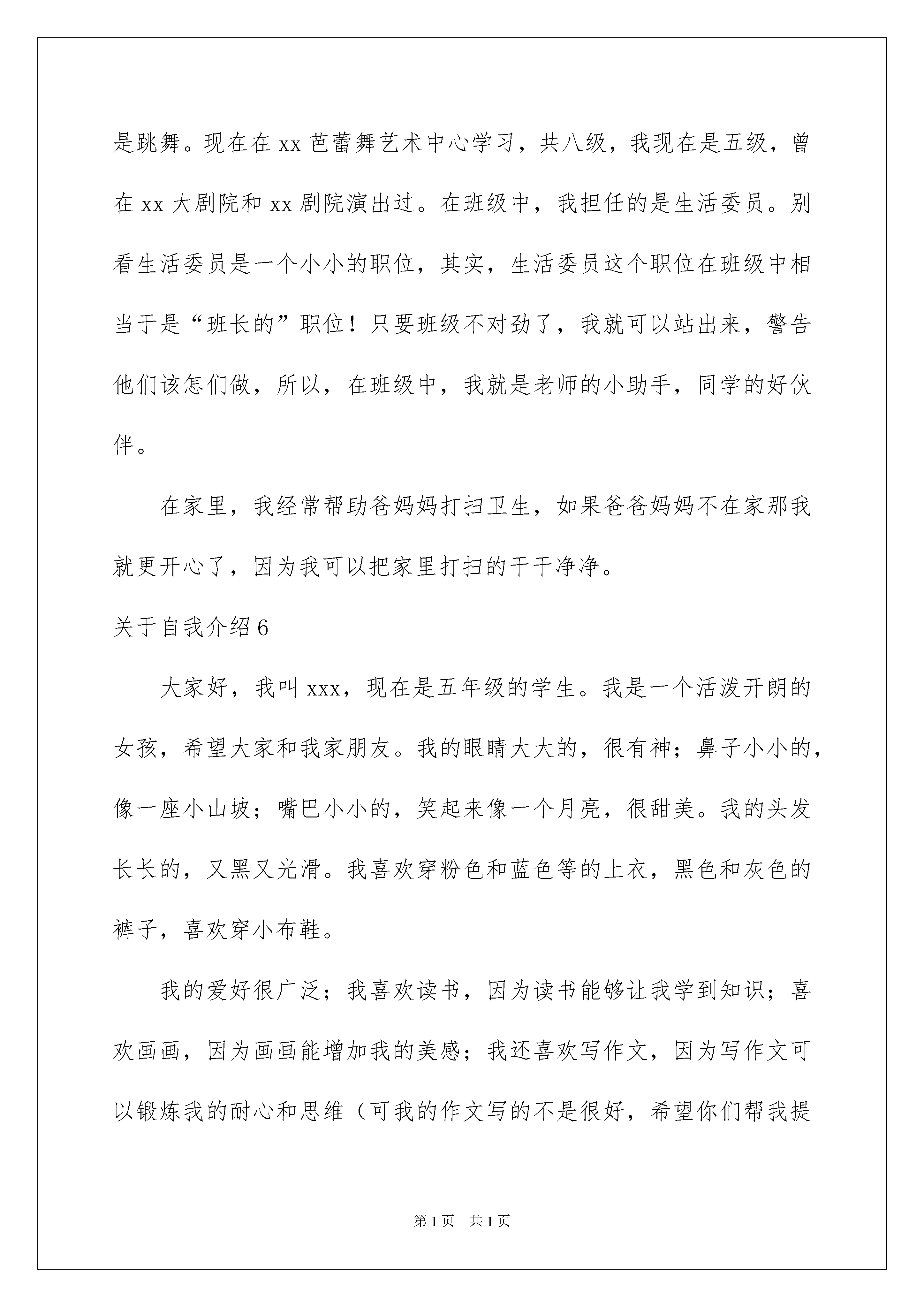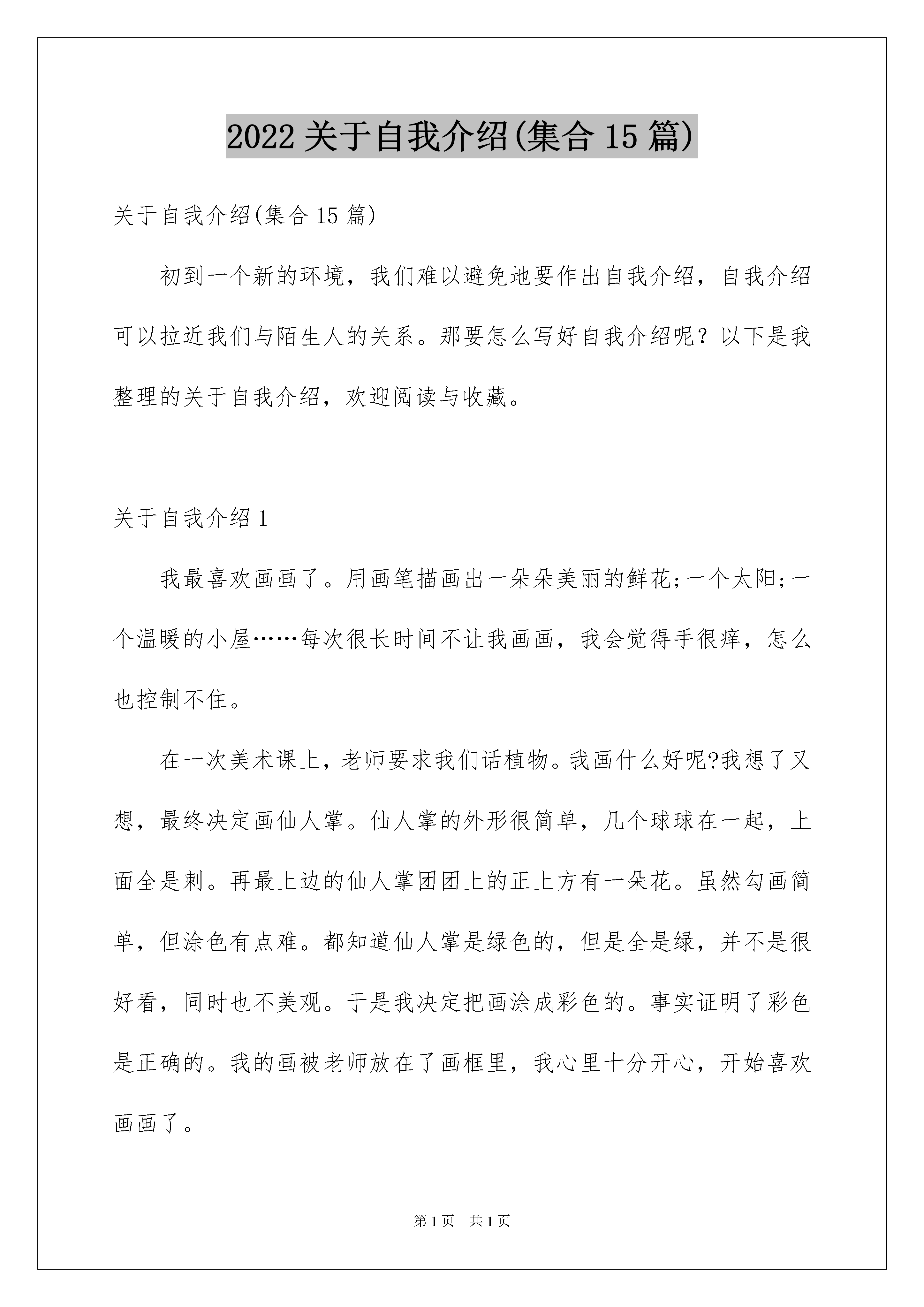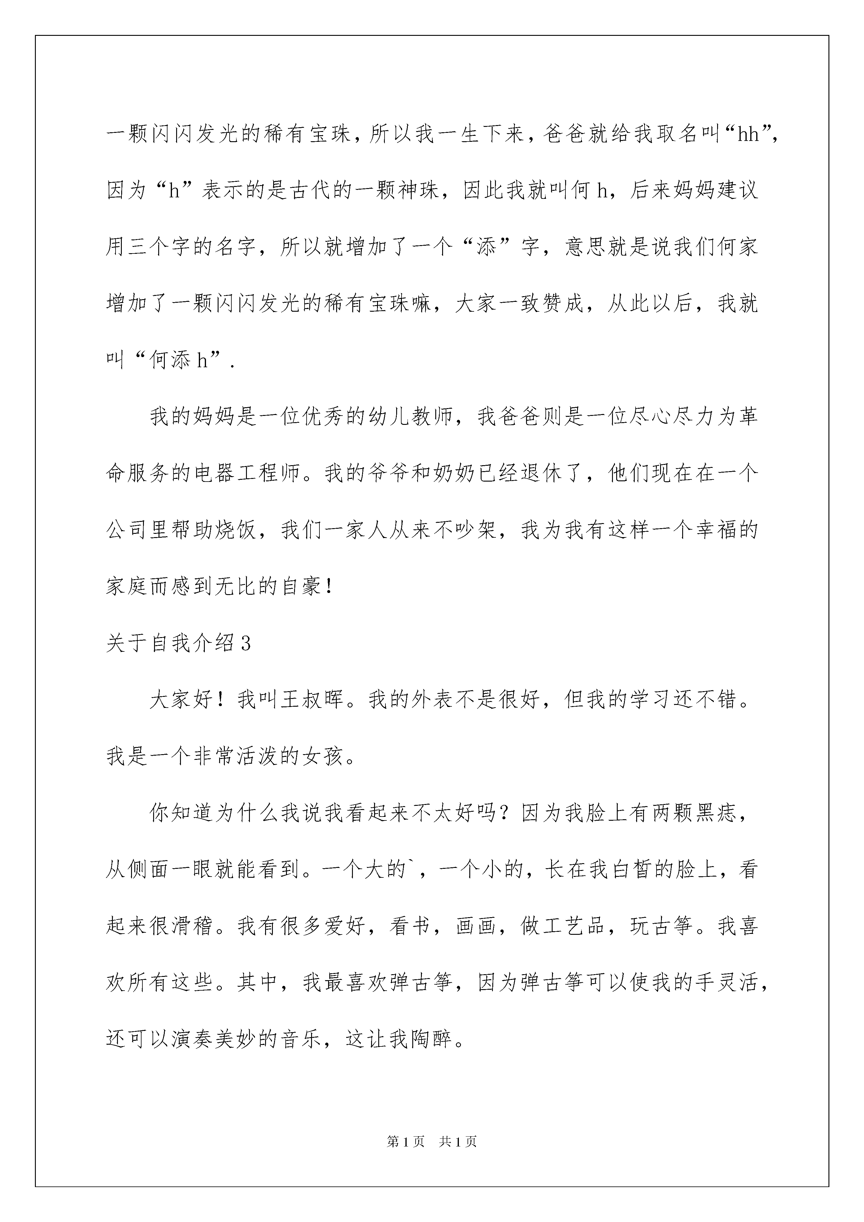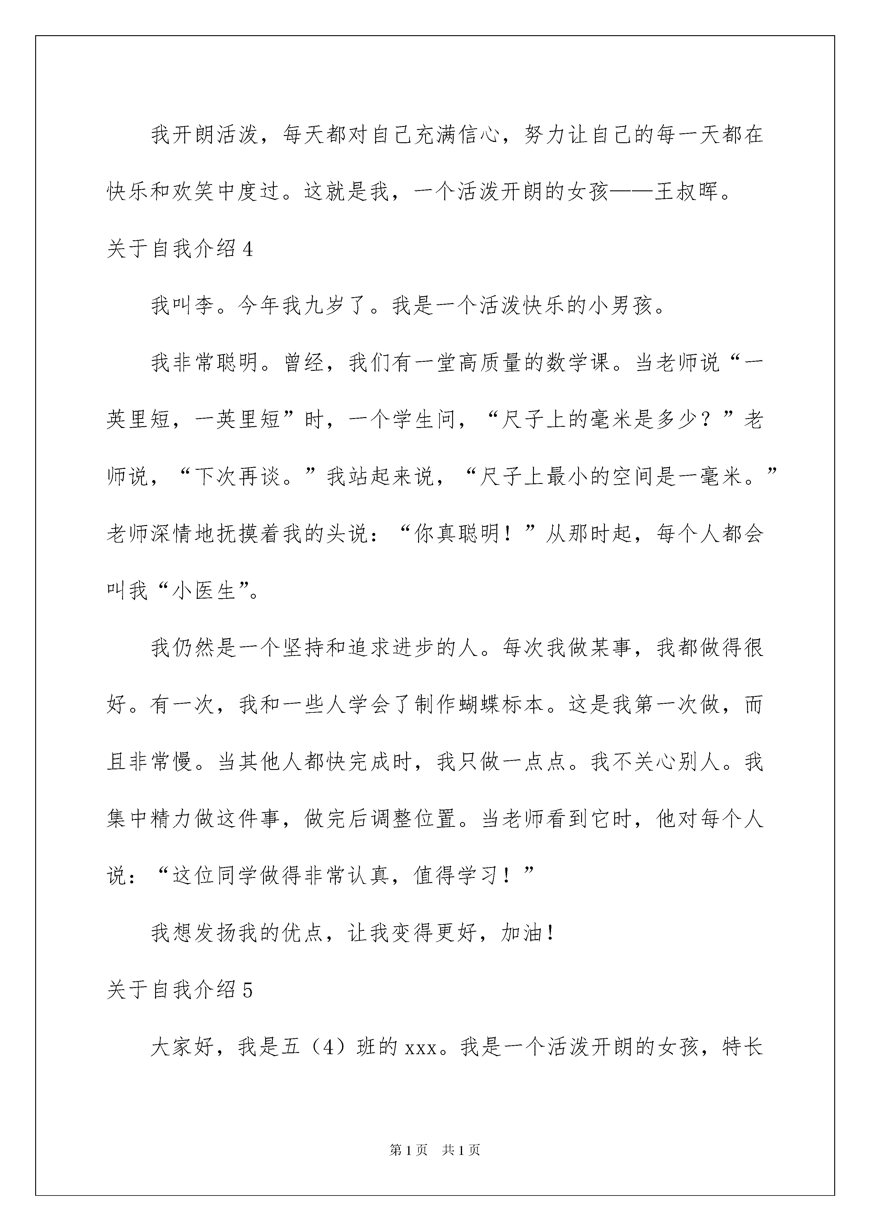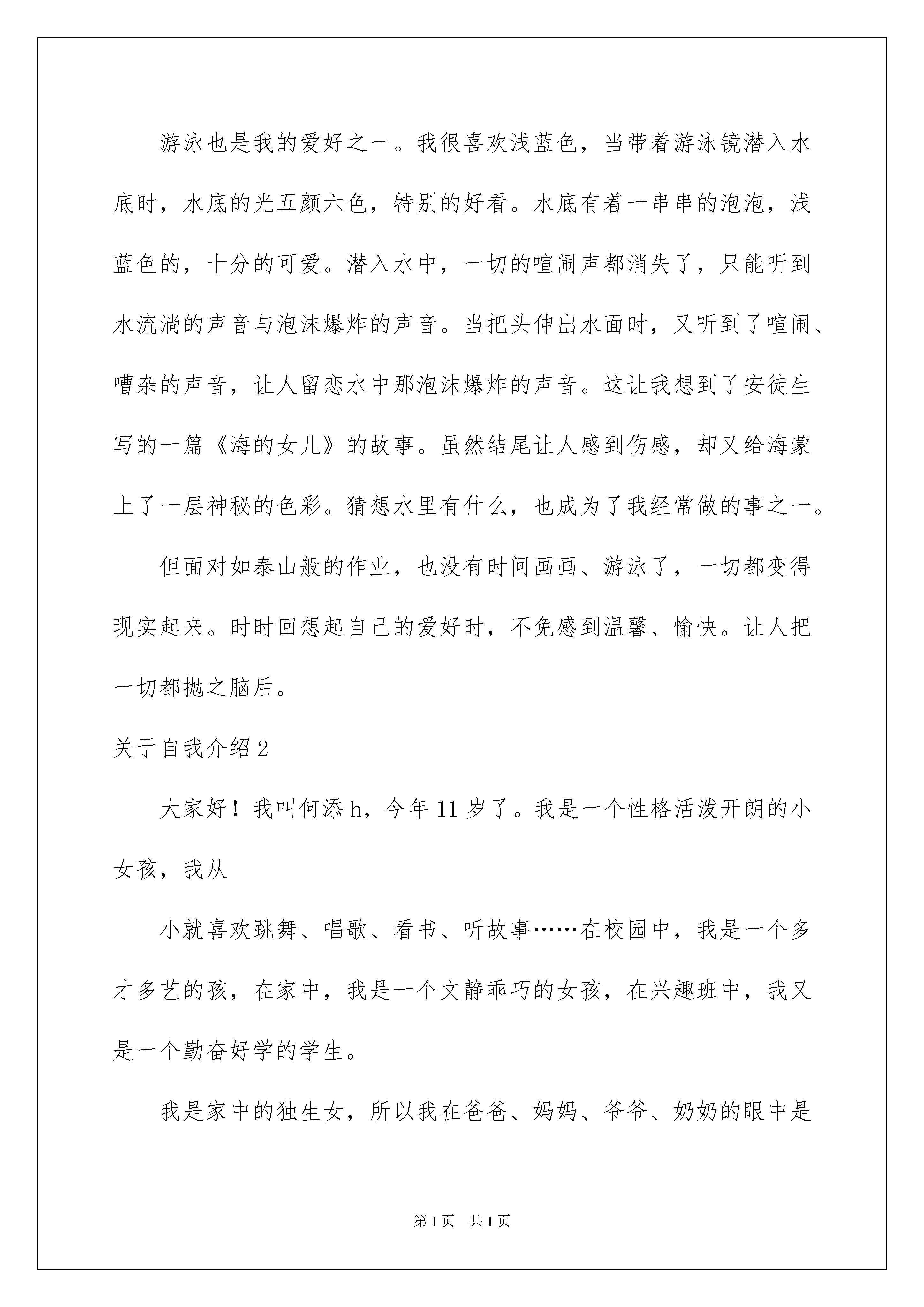 2022关于自我介绍(集合15篇)关于自我介绍(集合15篇)初到一个新的环境,我们难以避免地要作出自我介绍,自我介绍可以拉近我们与陌生人的关系。那要怎么写好自我介绍呢?以下是我整理的关于自我介绍,欢迎阅读与收藏。关于自我介绍1我最喜欢画画了。用画笔描画出一朵朵美丽的鲜花;一个太阳;一个温暖的小屋……每次很长时间不让我画画,我会觉得手很痒,怎么也控制不住。在一次美术课上,老师要求我们话植物。我画什么好呢?我想了又想,最终决定画仙人掌。仙人掌的外形很简单,几个球球在一起,上面全是刺。再最上边的仙人掌团团上的正上方有一朵花。虽然勾画简单,但涂色有点难。都知道仙人掌是绿色的,但是全是绿,并不是很好看,同时也不美观。于是我决定把画涂成彩色的。事实证明了彩色是正确的。我的画被老师放在了画框里,我心里十分开心,开始喜欢画画了。游泳也是我的爱好之一。我很喜欢浅蓝色,当带着游泳镜潜入水底时,水底的光五颜六色,特别的好看。水底有着一串串的泡泡,浅蓝色的,十分的可爱。潜入水中,一切的喧闹声都消失了,只能听到水流淌的声音与泡沫爆炸的声音。当把头伸出水面时,又听到了喧闹、嘈杂的声音,让人留恋水中那泡沫爆炸的声音。这让我想到了安徒生写的一篇《海的女儿》的故事。虽然结尾让人感到伤感,却又给海蒙上了一层神秘的色彩。猜想水里有什么,也成为了我经常做的事之一。但面对如泰山般的作业,也没有时间画画、游泳了,一切都变得现实起来。时时回想起自己的爱好时,不免感到温馨、愉快。让人把一切都抛之脑后。关于自我介绍2大家好!我叫何添h,今年11岁了。我是一个性格活泼开朗的小女孩,我从小就喜欢跳舞、唱歌、看书、听故事……在校园中,我是一个多才多艺的孩,在家中,我是一个文静乖巧的女孩,在兴趣班中,我又是一个勤奋好学的学生。我是家中的独生女,所以我在爸爸、妈妈、爷爷、奶奶的眼中是一颗闪闪发光的稀有宝珠,所以我一生下来,爸爸就给我取名叫“hh”,因为“h”表示的是古代的一颗神珠,因此我就叫何h,后来妈妈建议用三个字的名字,所以就增加了一个“添”字,意思就是说我们何家增加了一颗闪闪发光的稀有宝珠嘛,大家一致赞成,从此以后,我就叫“何添h”.我的妈妈是一位优秀的幼儿教师,我爸爸则是一位尽心尽力为革命服务的电器工程师。我的爷爷和奶奶已经退休了,他们现在在一个公司里帮助烧饭,我们一家人从来不吵架,我为我有这样一个幸福的家庭而感到无比的自豪!关于自我介绍3大家好!我叫王叔晖。我的外表不是很好,但我的学习还不错。我是一个非常活泼的女孩。你知道为什么我说我看起来不太好吗?因为我脸上有两颗黑痣,从侧面一眼就能看到。一个大的`,一个小的,长在我白皙的脸上,看起来很滑稽。我有很多爱好,看书,画画,做工艺品,玩古筝。我喜欢所有这些。其中,我最喜欢弹古筝,因为弹古筝可以使我的手灵活,还可以演奏美妙的音乐,这让我陶醉。我开朗活泼,每天都对自己充满信心,努力让自己的每一天都在快乐和欢笑中度过。这就是我,一个活泼开朗的女孩——王叔晖。关于自我介绍4我叫李。今年我九岁了。我是一个活泼快乐的小男孩。我非常聪明。曾经,我们有一堂高质量的数学课。当老师说“一英里短,一英里短”时,一个学生问,“尺子上的毫米是多少?”老师说,“下次再谈。”我站起来说,“尺子上最小的空间是一毫米。”老师深情地抚摸着我的头说:“你真聪明!”从那时起,每个人都会叫我“小医生”。我仍然是一个坚持和追求进步的人。每次我做某事,我都做得很好。有一次,我和一些人学会了制作蝴蝶标本。这是我第一次做,而且非常慢。当其他人都快完成时,我只做一点点。我不关心别人。我集中精力做这件事,做完后调整位置。当老师看到它时,他对每个人说:“这位同学做得非常认真,值得学习!”我想发扬我的优点,让我变得更好,加油!关于自我介绍5大家好,我是五(4)班的xxx。我是一个活泼开朗的女孩,特长是跳舞。现在在xx芭蕾舞艺术中心学习,共八级,我现在是五级,曾在xx大剧院和xx剧院演出过。在班级中,我担任的是生活委员。别看生活委员是一个小小的职位,其实,生活委员这个职位在班级中相当于是“班长的”职位!只要班级不对劲了,我就可以站出来,警告他们该怎们做,所以,在班级中,我就是老师的小助手,同学的好伙伴。在家里,我经常帮助爸妈妈打扫卫生,如果爸爸妈妈不在家那我就更开心了,因为我可以把家里打扫的干干净净。关于自我介绍6大家好,我叫xxx,现在是五年级的学生。我是一个活泼开朗的女孩,希望大家和我家朋友。我的眼睛大大的,很有神;鼻子小小的,像一座小山坡;嘴巴小小的,笑起来像一个月亮,很甜美。我的头发长长的,又黑又光滑。我喜欢穿粉色和蓝色等的上