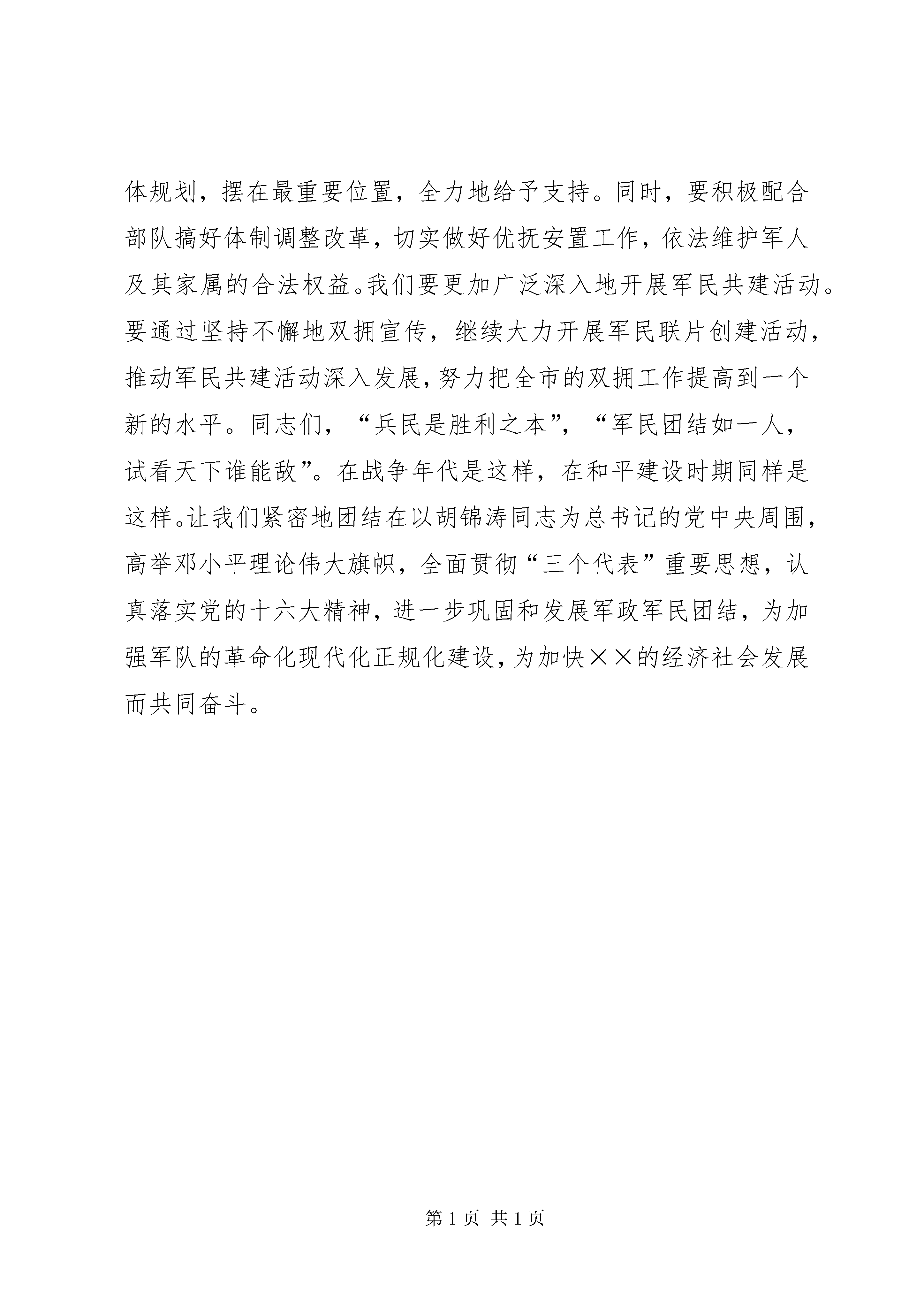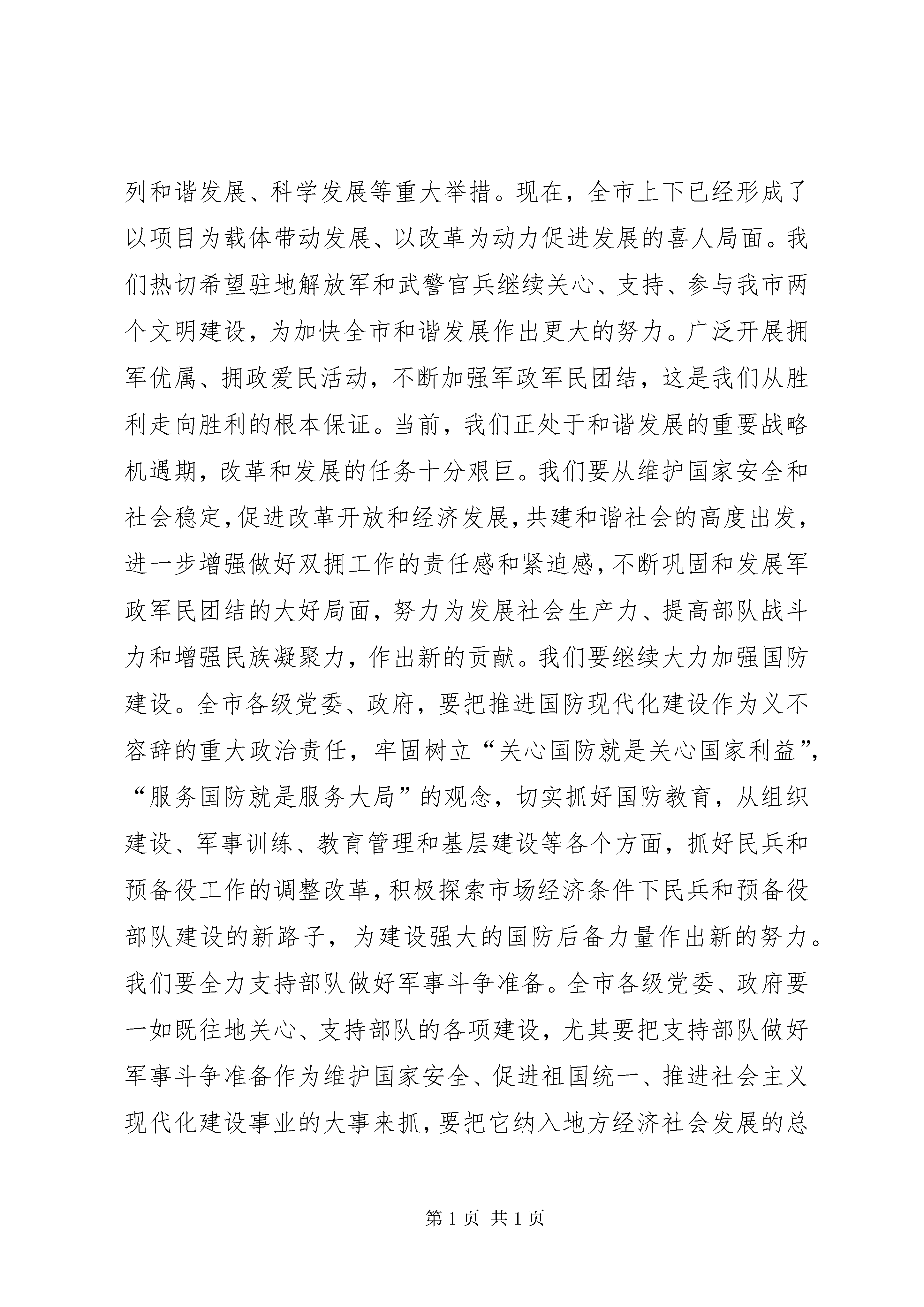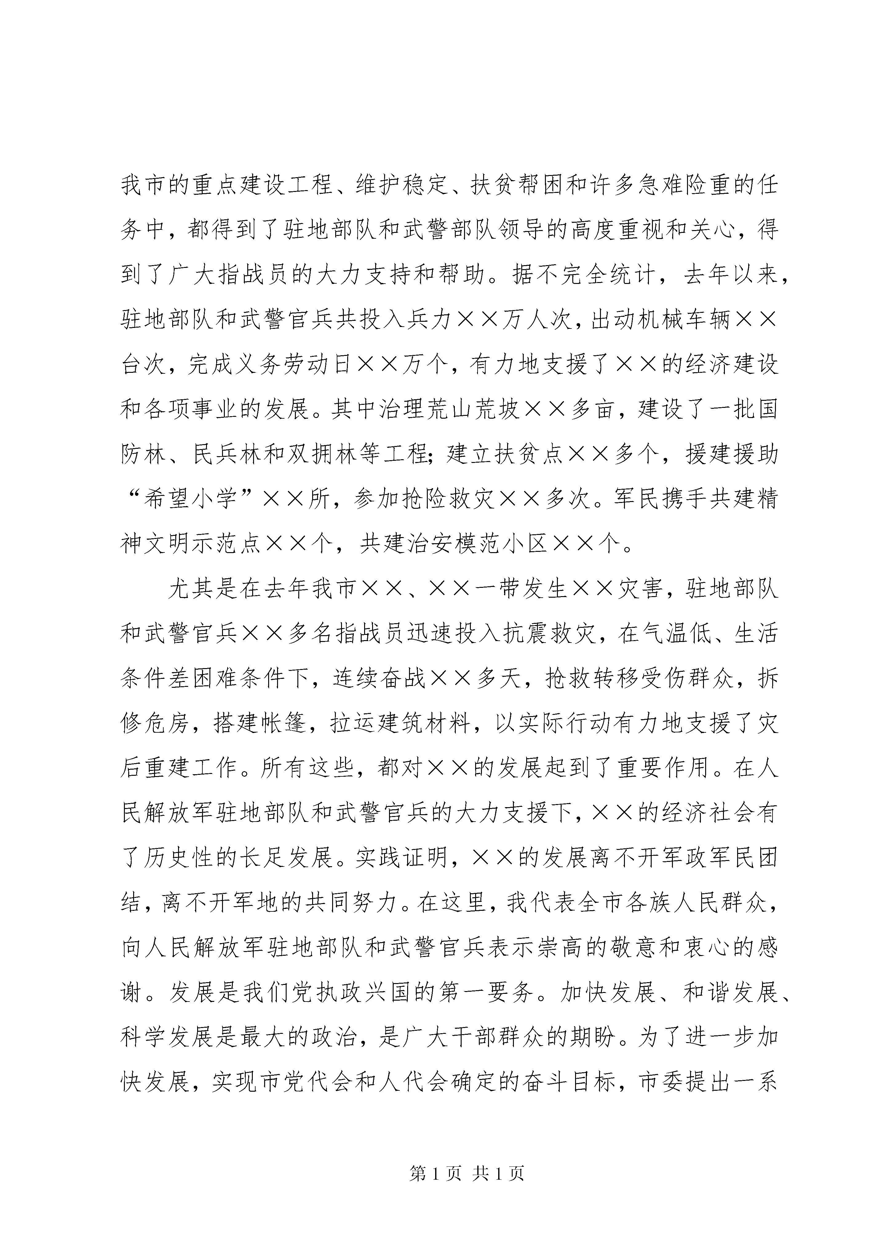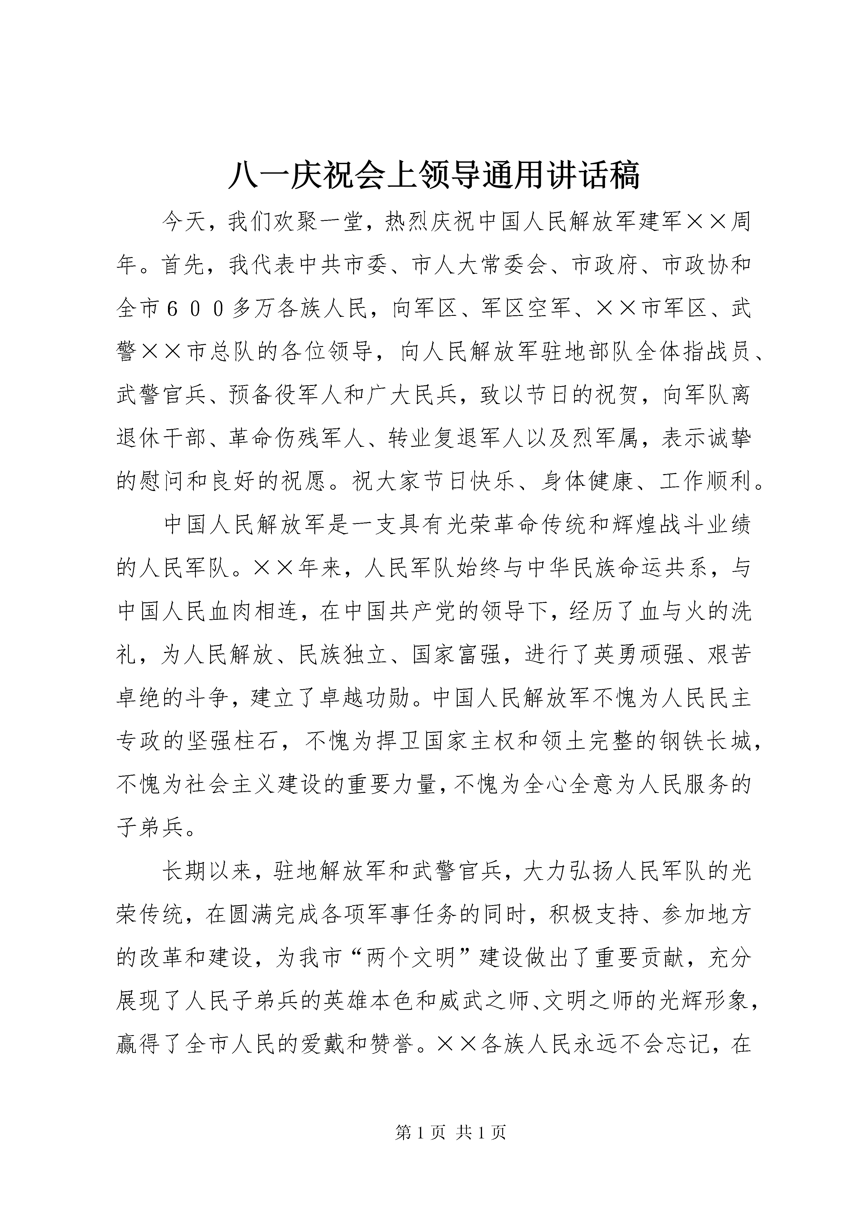 八一庆祝会上领导通用讲话稿今天,我们欢聚一堂,热烈庆祝中国人民解放军建军××周年。首先,我代表中共市委、市人大常委会、市政府、市政协和全市600多万各族人民,向军区、军区空军、××市军区、武警××市总队的各位领导,向人民解放军驻地部队全体指战员、武警官兵、预备役军人和广大民兵,致以节日的祝贺,向军队离退休干部、革命伤残军人、转业复退军人以及烈军属,表示诚挚的慰问和良好的祝愿。祝大家节日快乐、身体健康、工作顺利。中国人民解放军是一支具有光荣革命传统和辉煌战斗业绩的人民军队。××年来,人民军队始终与中华民族命运共系,与中国人民血肉相连,在中国共产党的领导下,经历了血与火的洗礼,为人民解放、民族独立、国家富强,进行了英勇顽强、艰苦卓绝的斗争,建立了卓越功勋。中国人民解放军不愧为人民民主专政的坚强柱石,不愧为捍卫国家主权和领土完整的钢铁长城,不愧为社会主义建设的重要力量,不愧为全心全意为人民服务的子弟兵。长期以来,驻地解放军和武警官兵,大力弘扬人民军队的光荣传统,在圆满完成各项军事任务的同时,积极支持、参加地方的改革和建设,为我市“两个文明”建设做出了重要贡献,充分展现了人民子弟兵的英雄本色和威武之师、文明之师的光辉形象,赢得了全市人民的爱戴和赞誉。××各族人民永远不会忘记,在我市的重点建设工程、维护稳定、扶贫帮困和许多急难险重的任务中,都得到了驻地部队和武警部队领导的高度重视和关心,得到了广大指战员的大力支持和帮助。据不完全统计,去年以来,驻地部队和武警官兵共投入兵力××万人次,出动机械车辆××台次,完成义务劳动日××万个,有力地支援了××的经济建设和各项事业的发展。其中治理荒山荒坡××多亩,建设了一批国防林、民兵林和双拥林等工程;建立扶贫点××多个,援建援助“希望小学”××所,参加抢险救灾××多次。军民携手共建精神文明示范点××个,共建治安模范小区××个。尤其是在去年我市××、××一带发生××灾害,驻地部队和武警官兵××多名指战员迅速投入抗震救灾,在气温低、生活条件差困难条件下,连续奋战××多天,抢救转移受伤群众,拆修危房,搭建帐篷,拉运建筑材料,以实际行动有力地支援了灾后重建工作。所有这些,都对××的发展起到了重要作用。在人民解放军驻地部队和武警官兵的大力支援下,××的经济社会有了历史性的长足发展。实践证明,××的发展离不开军政军民团结,离不开军地的共同努力。在这里,我代表全市各族人民群众,向人民解放军驻地部队和武警官兵表示崇高的敬意和衷心的感谢。发展是我们党执政兴国的第一要务。加快发展、和谐发展、科学发展是最大的政治,是广大干部群众的期盼。为了进一步加快发展,实现市党代会和人代会确定的奋斗目标,市委提出一系列和谐发展、科学发展等重大举措。现在,全市上下已经形成了以项目为载体带动发展、以改革为动力促进发展的喜人局面。我们热切希望驻地解放军和武警官兵继续关心、支持、参与我市两个文明建设,为加快全市和谐发展作出更大的努力。广泛开展拥军优属、拥政爱民活动,不断加强军政军民团结,这是我们从胜利走向胜利的根本保证。当前,我们正处于和谐发展的重要战略机遇期,改革和发展的任务十分艰巨。我们要从维护国家安全和社会稳定,促进改革开放和经济发展,共建和谐社会的高度出发,进一步增强做好双拥工作的责任感和紧迫感,不断巩固和发展军政军民团结的大好局面,努力为发展社会生产力、提高部队战斗力和增强民族凝聚力,作出新的贡献。我们要继续大力加强国防建设。全市各级党委、政府,要把推进国防现代化建设作为义不容辞的重大政治责任,牢固树立“关心国防就是关心国家利益”,“服务国防就是服务大局”的观念,切实抓好国防教育,从组织建设、军事训练、教育管理和基层建设等各个方面,抓好民兵和预备役工作的调整改革,积极探索市场经济条件下民兵和预备役部队建设的新路子,为建设强大的国防后备力量作出新的努力。我们要全力支持部队做好军事斗争准备。全市各级党委、政府要一如既往地关心、支持部队的各项建设,尤其要把支持部队做好军事斗争准备作为维护国家安全、促进祖国统一、推进社会主义现代化建设事业的大事来抓,要把它纳入地方经济社会发展的总体规划,摆在最重要位置,全力地给予支持。同时,要积极配合部队搞好体制调整改革,切实做好优抚安置工作,依法维护军人及其家属的合法权益。我们要更加广泛深入地开展军民共建活动。要通过坚持不懈地双拥宣传,继续大力开展军民联片创建活动,推动军民共建活动深入发展,努力把全市的双拥工作提高到一个新的水平。同志们,“兵民是胜利之本”,“军民团结如一人,试看天下谁能敌”。在战争年代是这样,在和平建设时期同样是这样。让我们紧密地团结在以胡锦涛同志为总书记的党中央周围,高举邓小平理论伟大旗帜,全面贯彻“三个代表”重要思想,认真落实党的十六大精神,进一步巩固和发展军