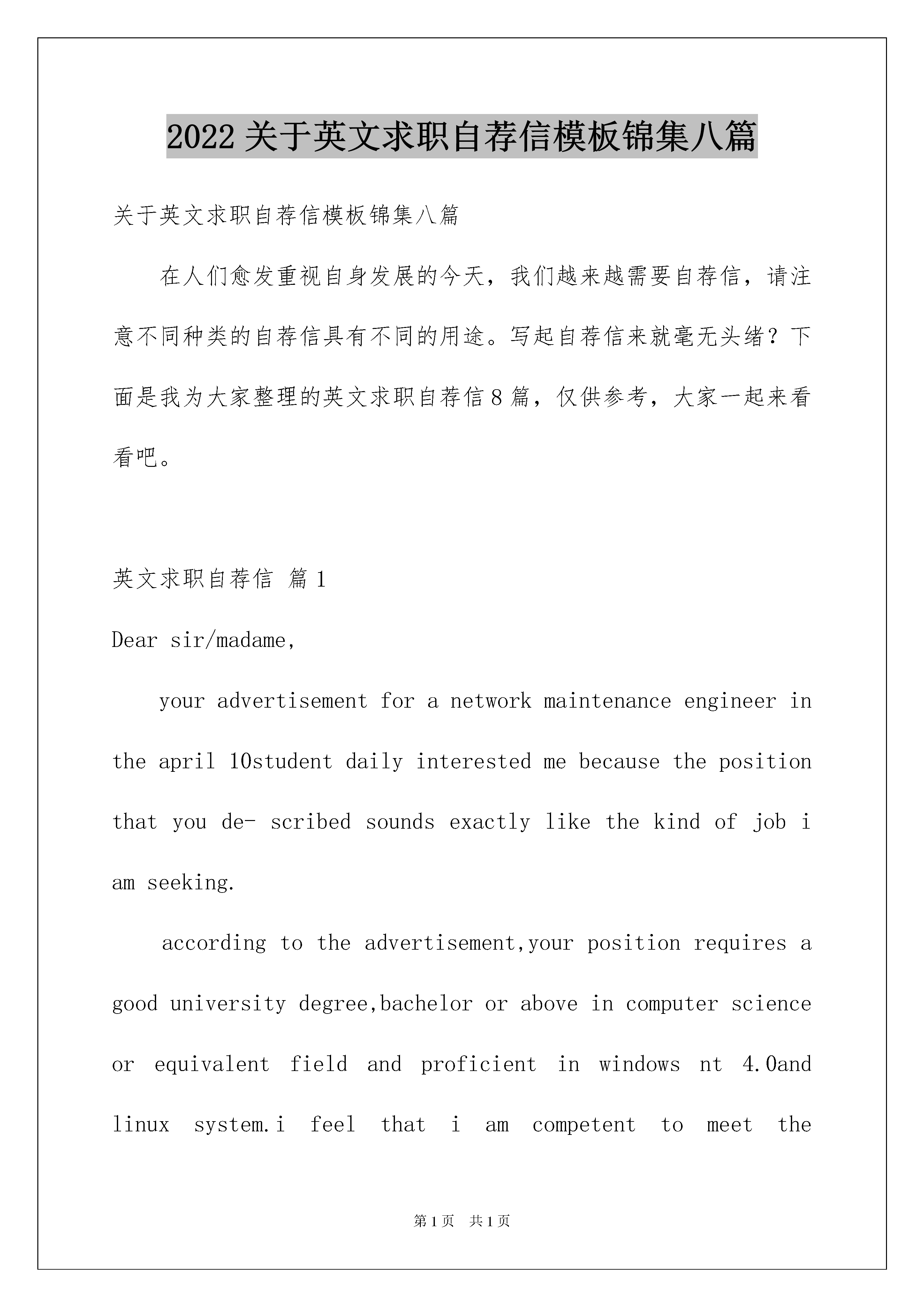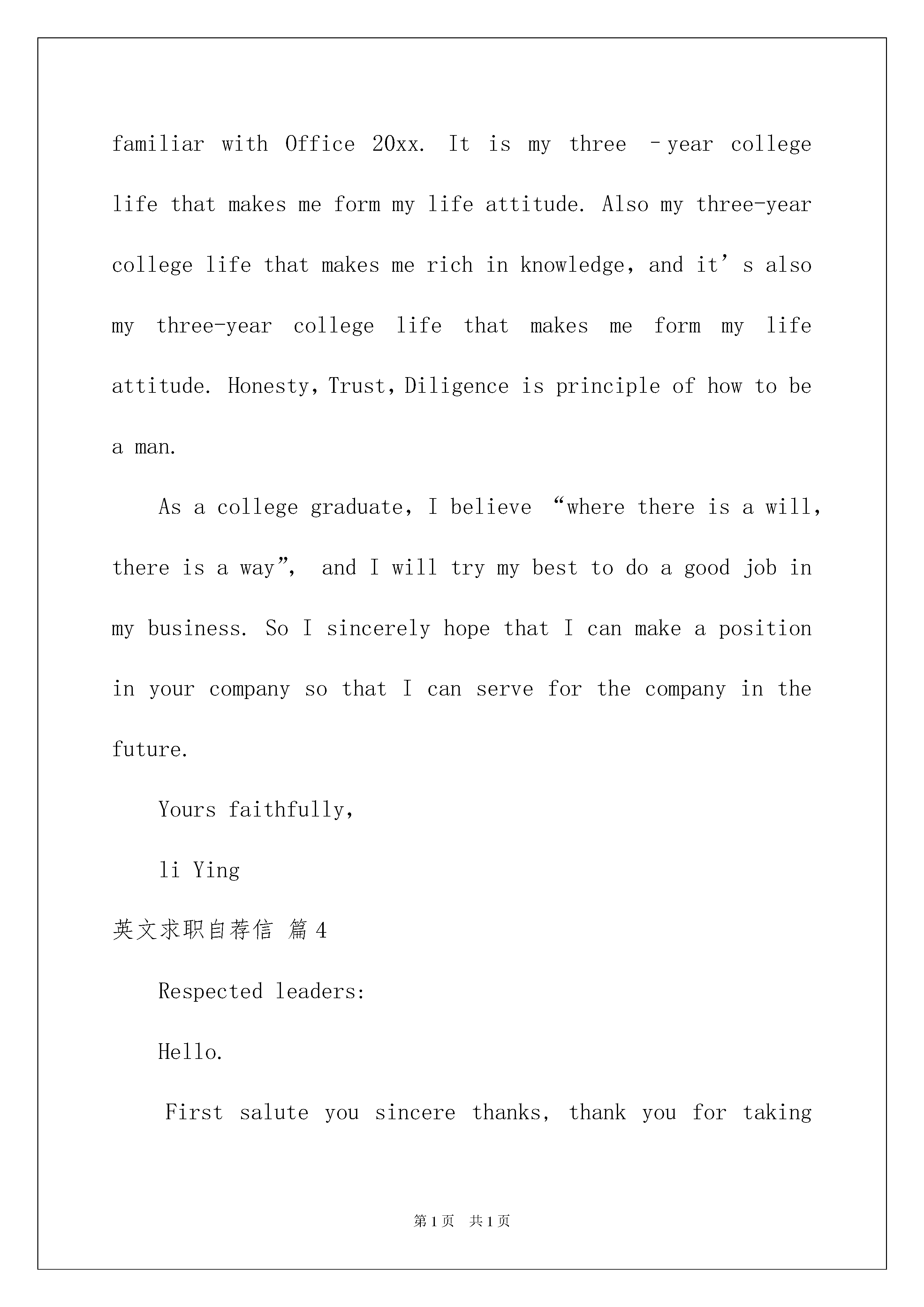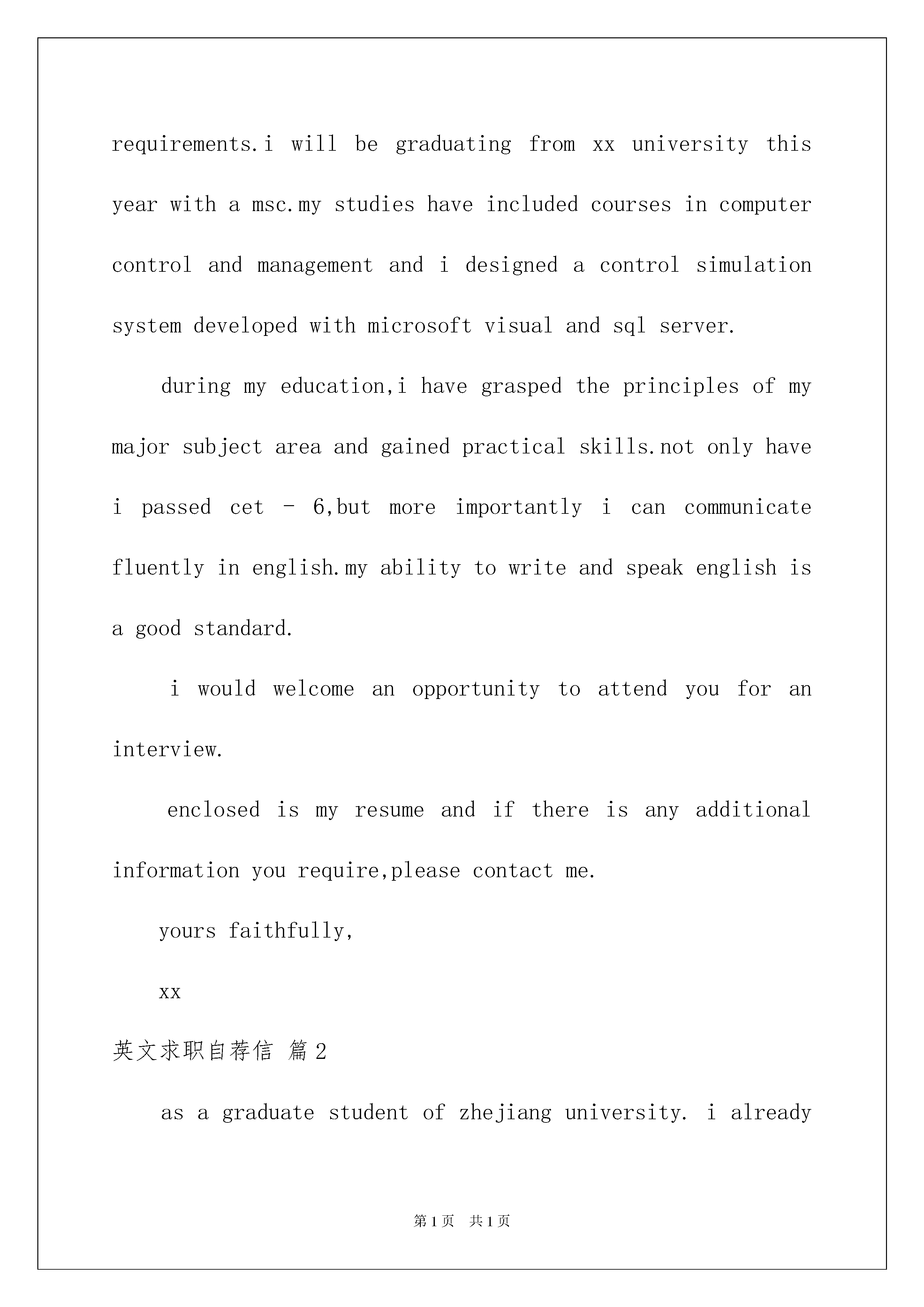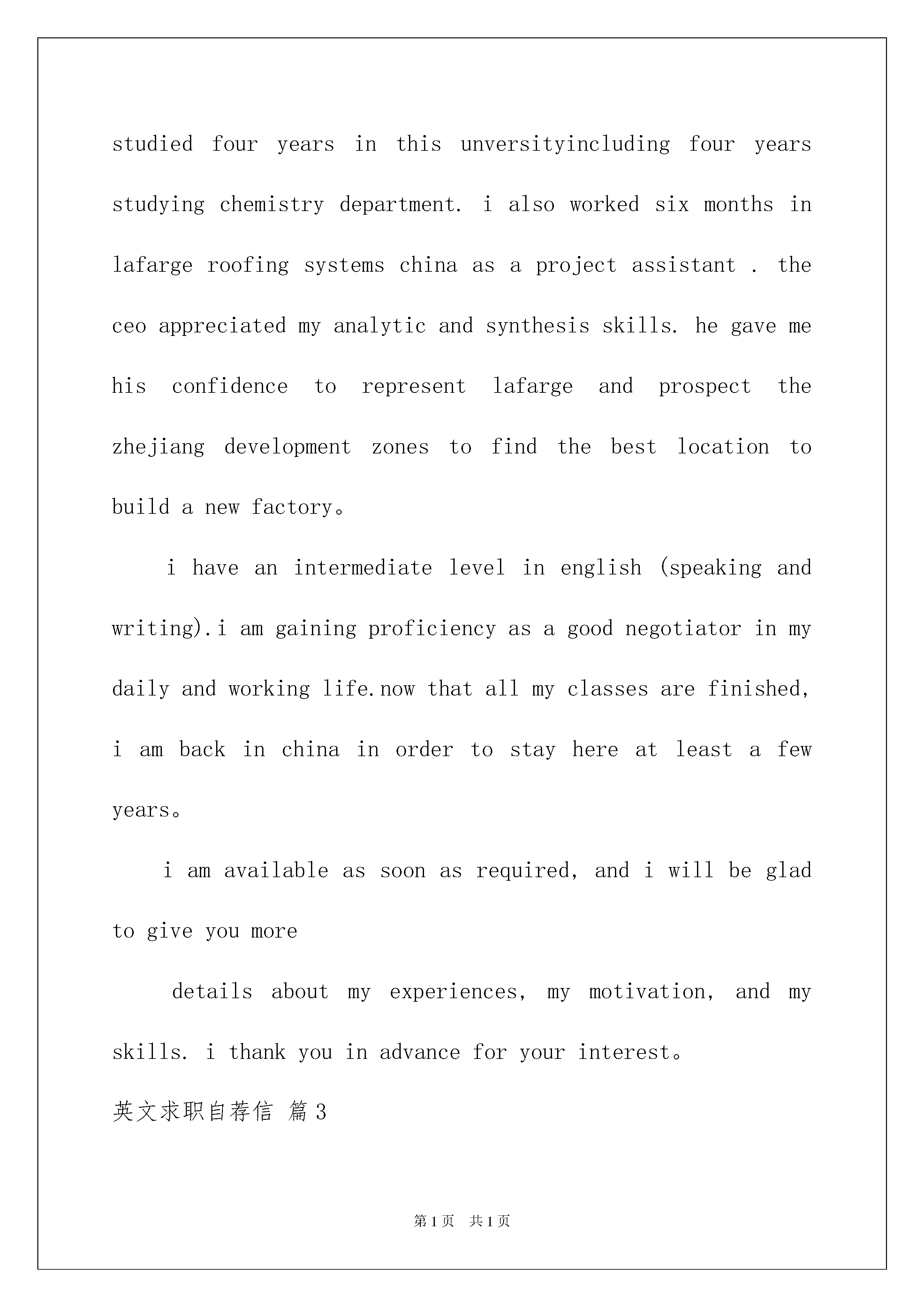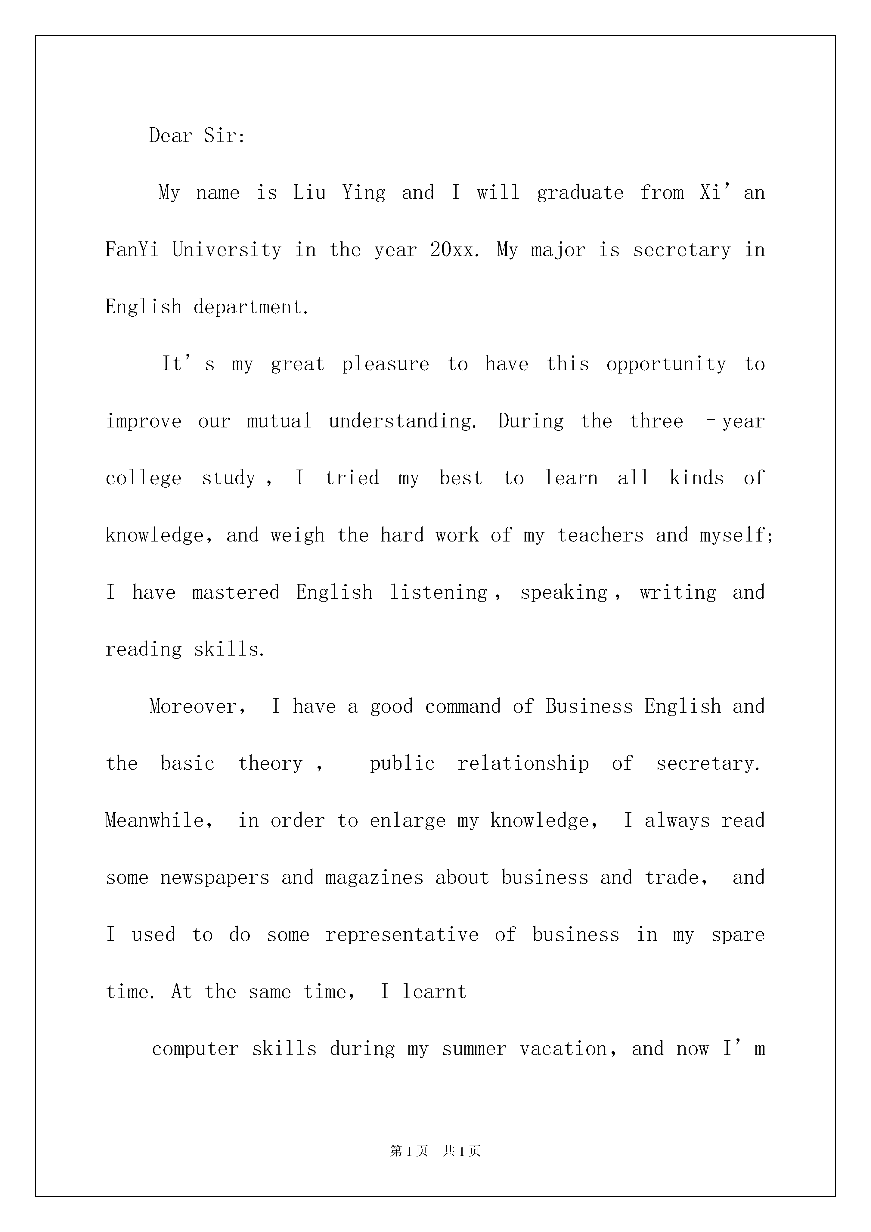 2022关于英文求职自荐信模板锦集八篇关于英文求职自荐信模板锦集八篇在人们愈发重视自身发展的今天,我们越来越需要自荐信,请注意不同种类的自荐信具有不同的用途。写起自荐信来就毫无头绪?下面是我为大家整理的英文求职自荐信8篇,仅供参考,大家一起来看看吧。英文求职自荐信篇1Dearsir/madame,youradvertisementforanetworkmaintenanceengineerintheapril10studentdailyinterestedmebecausethepositionthatyoude-scribedsoundsexactlylikethekindofjobiamseeking.accordingtotheadvertisement,yourpositionrequiresagooduniversitydegree,bachelororaboveincomputerscienceorequivalentfieldandproficientinwindowsnt4.0andlinuxsystem.ifeelthatiamcompetenttomeettherequirements.iwillbegraduatingfromxxuniversitythisyearwithamsc.mystudieshaveincludedcoursesincomputercontrolandmanagementandidesignedacontrolsimulationsystemdevelopedwithmicrosoftvisualandsqlserver.duringmyeducation,ihavegraspedtheprinciplesofmymajorsubjectareaandgainedpracticalskills.notonlyhaveipassedcet-6,butmoreimportantlyicancommunicatefluentlyinenglish.myabilitytowriteandspeakenglishisagoodstandard.iwouldwelcomeanopportunitytoattendyouforaninterview.enclosedismyresumeandifthereisanyadditionalinformationyourequire,pleasecontactme.yoursfaithfully,xx英文求职自荐信篇2asagraduatestudentofzhejianguniversity.ialreadystudiedfouryearsinthisunversityincludingfouryearsstudyingchemistrydepartment.ialsoworkedsixmonthsinlafargeroofingsystemschinaasaprojectassistant.theceoappreciatedmyanalyticandsynthesisskills.hegavemehisconfidencetorepresentlafargeandprospectthezhejiangdevelopmentzonestofindthebestlocationtobuildanewfactory。ihaveanintermediatelevelinenglish(speakingandwriting).iamgainingproficiencyasagoodnegotiatorinmydailyandworkinglife.nowthatallmyclassesarefinished,iambackinchinainordertostayhereatleastafewyears。iamavailableassoonasrequired,andiwillbegladtogiveyoumoredetailsaboutmyexperiences,mymotivation,andmyskills.ithankyouinadvanceforyourinterest。英文求职自荐信篇3DearSir:MynameisLiuYingandIwillgraduatefromXi’anFanYiUniversityintheyear20xx.MymajorissecretaryinEnglishdepartment.It’smygreatpleasuretohavethisopportunity
