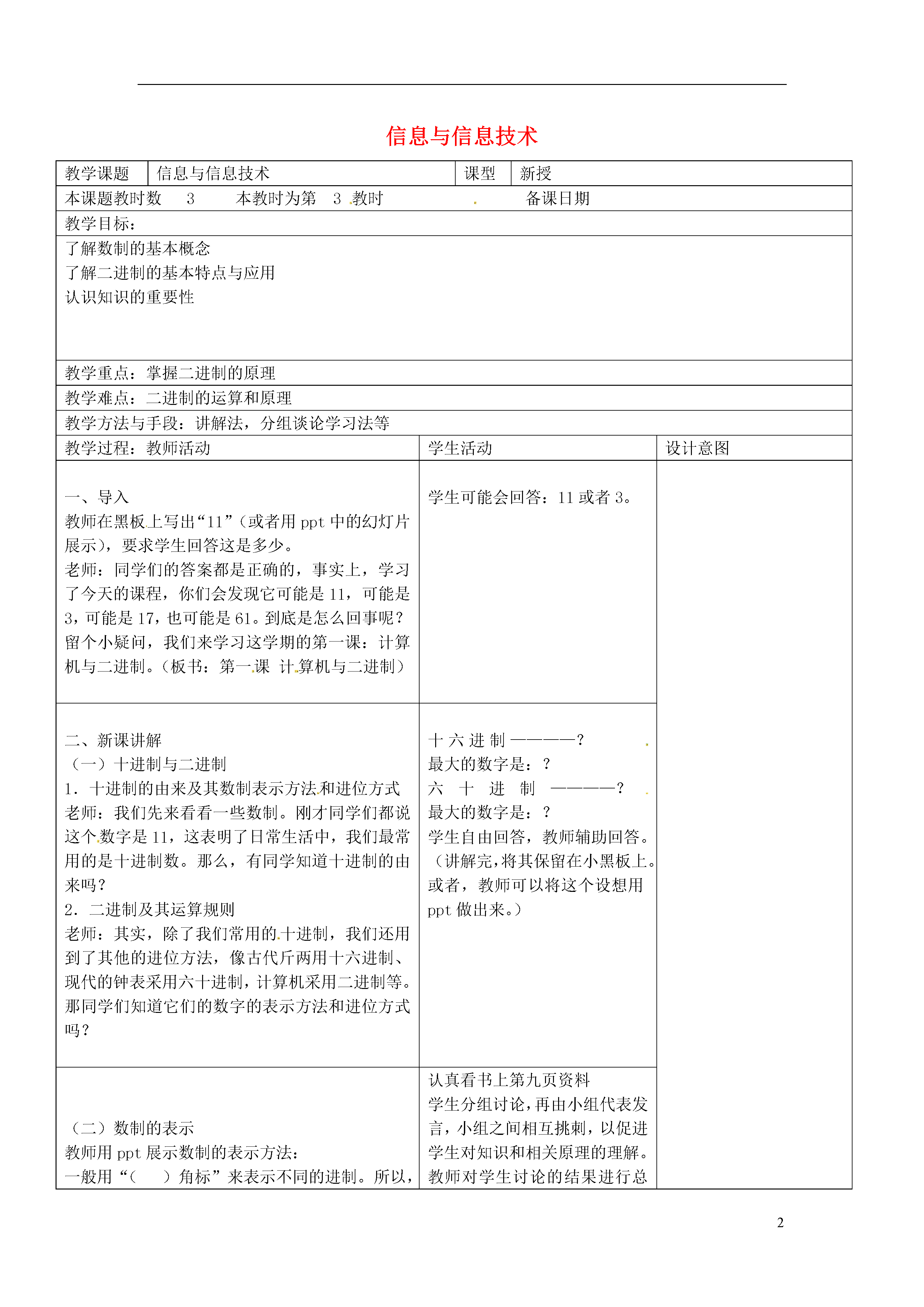 2信息与信息技术教学课题信息与信息技术课型新授本课题教时数3本教时为第3教时备课日期教学目标:了解数制的基本概念了解二进制的基本特点与应用认识知识的重要性教学重点:掌握二进制的原理教学难点:二进制的运算和原理教学方法与手段:讲解法,分组谈论学习法等教学过程:教师活动学生活动设计意图一、导入教师在黑板上写出“11”(或者用ppt中的幻灯片展示),要求学生回答这是多少。老师:同学们的答案都是正确的,事实上,学习了今天的课程,你们会发现它可能是11,可能是3,可能是17,也可能是61。到底是怎么回事呢?留个小疑问,我们来学习这学期的第一课:计算机与二进制。(板书:第一课计算机与二进制)学生可能会回答:11或者3。二、新课讲解(一)十进制与二进制1.十进制的由来及其数制表示方法和进位方式老师:我们先来看看一些数制。刚才同学们都说这个数字是11,这表明了日常生活中,我们最常用的是十进制数。那么,有同学知道十进制的由来吗?2.二进制及其运算规则老师:其实,除了我们常用的十进制,我们还用到了其他的进位方法,像古代斤两用十六进制、现代的钟表采用六十进制,计算机采用二进制等。那同学们知道它们的数字的表示方法和进位方式吗?十六进制————?最大的数字是:?六十进制————?最大的数字是:?学生自由回答,教师辅助回答。(讲解完,将其保留在小黑板上。或者,教师可以将这个设想用ppt做出来。)(二)数制的表示教师用ppt展示数制的表示方法:一般用“()角标”来表示不同的进制。所以,(11)2和(11)10就区别开来了。在计算机中,一般在数字后用特定的字母来表示该数的进制。(三)计算机与二进制教师用ppt展示莱布尼茨和冯•诺依曼的图片,引出有关计算机与二进制的讲解。认真看书上第九页资料学生分组讨论,再由小组代表发言,小组之间相互挑刺,以促进学生对知识和相关原理的理解。教师对学生讨论的结果进行总结,使学生获得总结性知识:授后小记:现代计算机技术和网络通信技术的不断发展,使得信息的获取和处理变得更加快捷,人们可以方便地获取来自全球的各种信息,也可以将信息快速地传递到世界各地。我们的处理信息的能力直接影响我们的生活和学习,因此学好信息学这门学科般的更加的重要授课日期