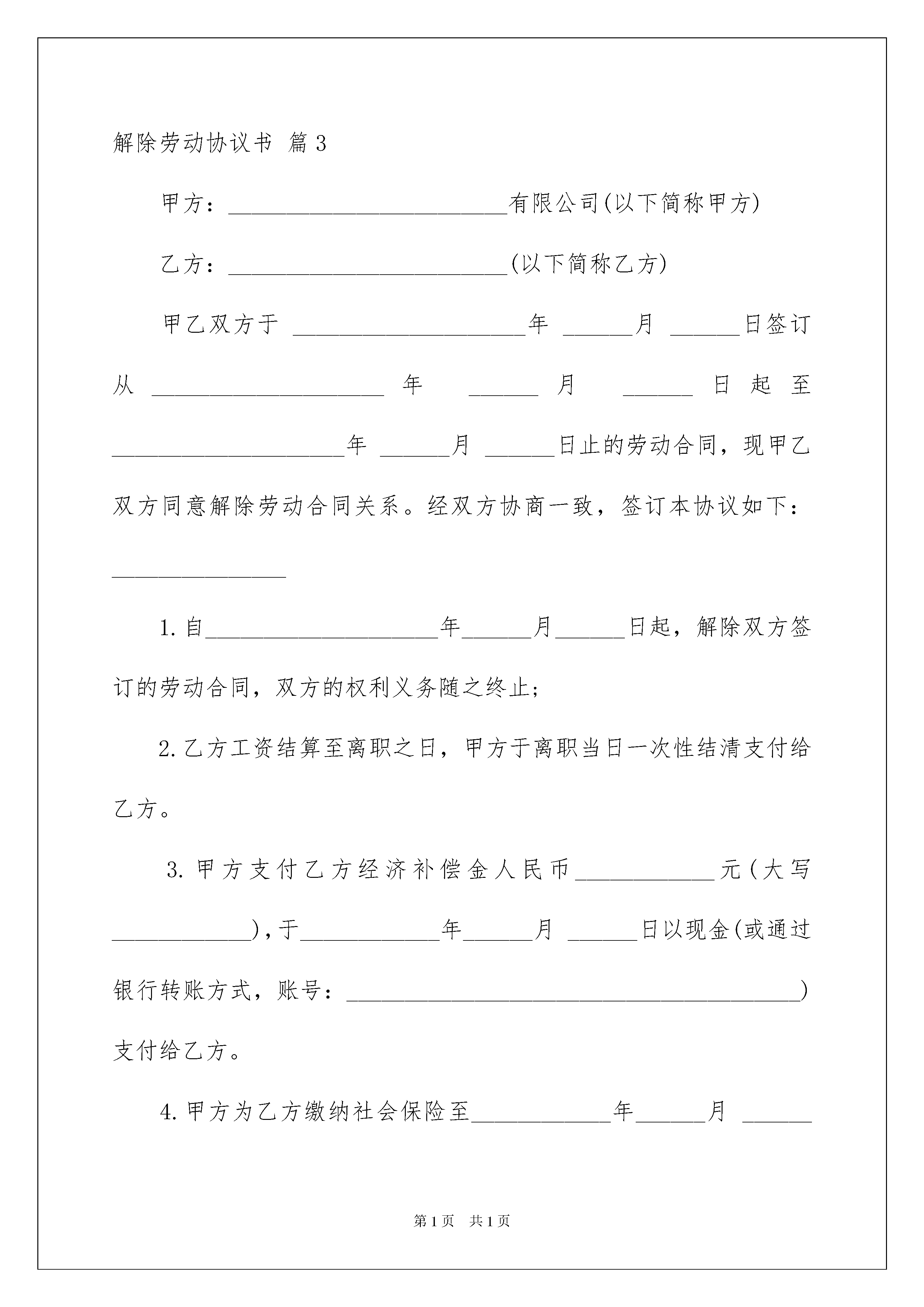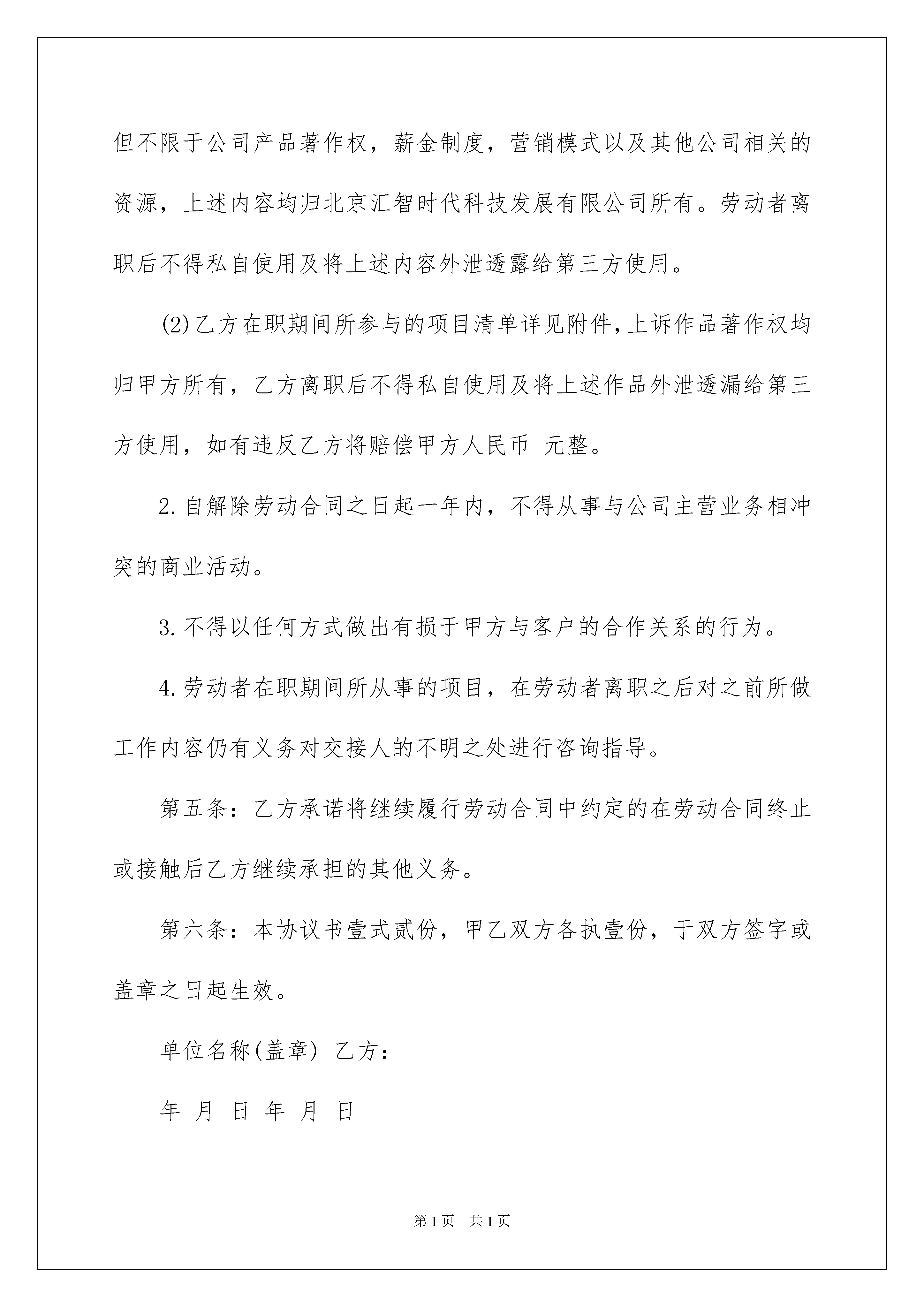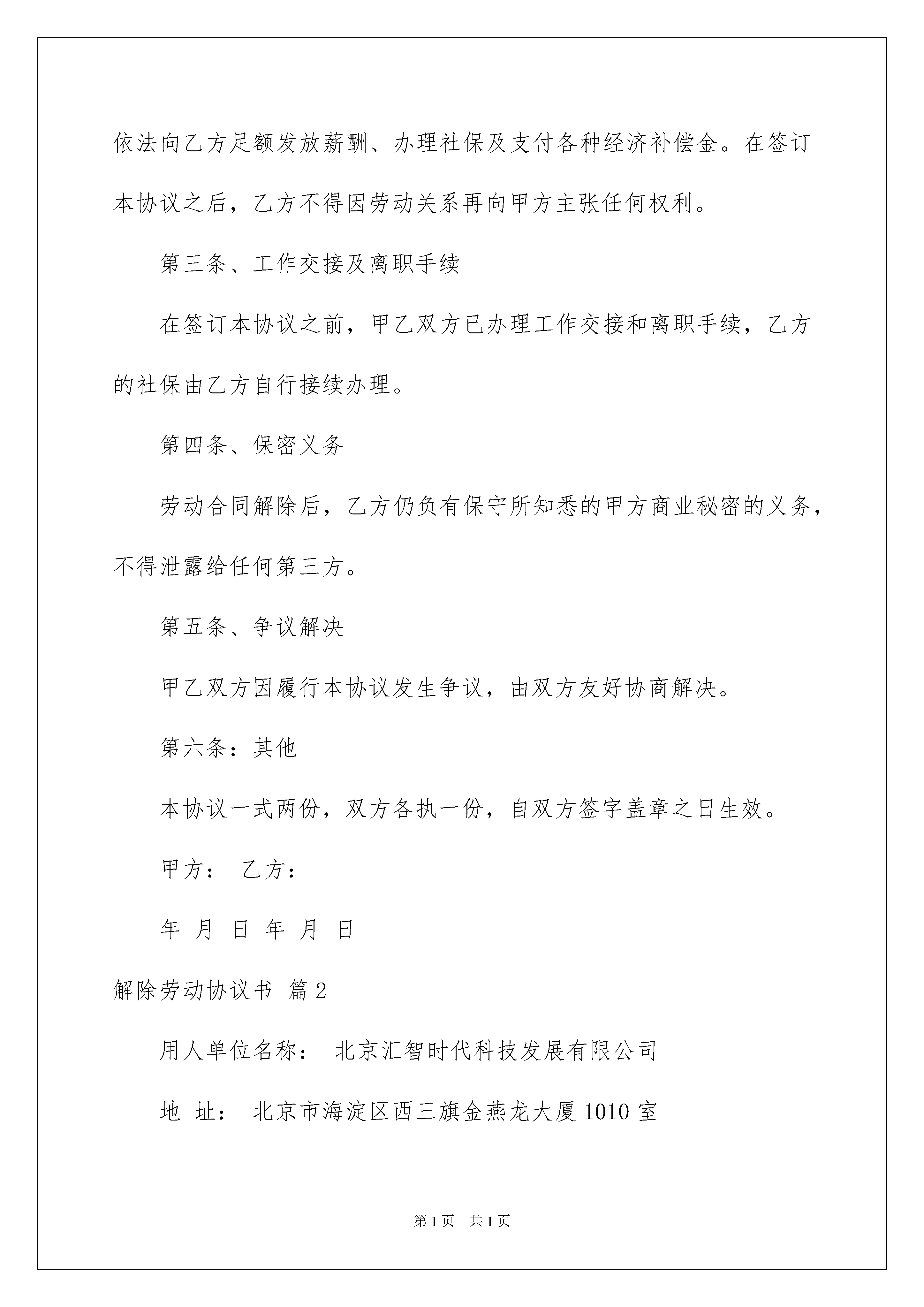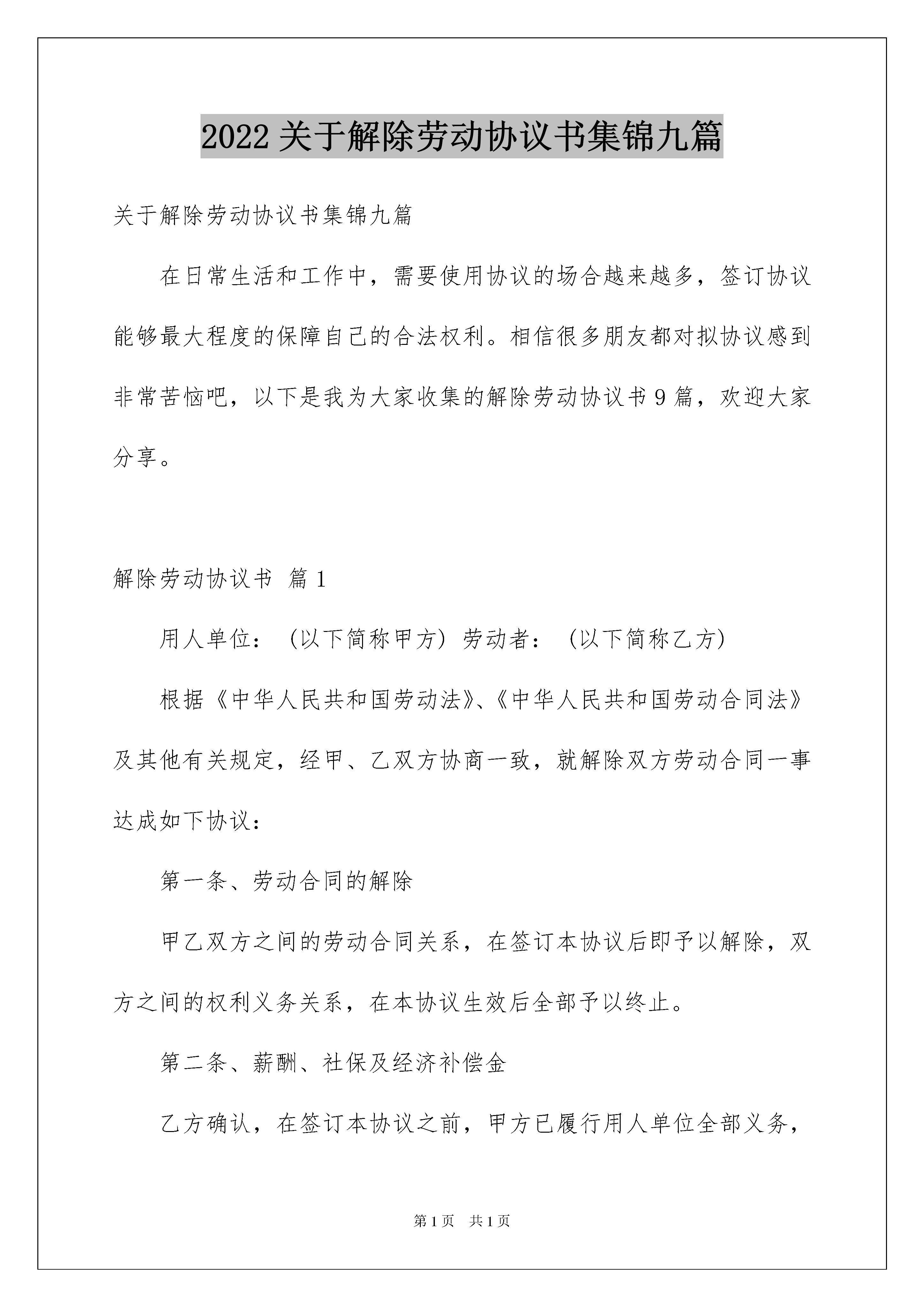 2022关于解除劳动协议书集锦九篇关于解除劳动协议书集锦九篇在日常生活和工作中,需要使用协议的场合越来越多,签订协议能够最大程度的保障自己的合法权利。相信很多朋友都对拟协议感到非常苦恼吧,以下是我为大家收集的解除劳动协议书9篇,欢迎大家分享。解除劳动协议书篇1用人单位:(以下简称甲方)劳动者:(以下简称乙方)根据《中华人民共和国劳动法》、《中华人民共和国劳动合同法》及其他有关规定,经甲、乙双方协商一致,就解除双方劳动合同一事达成如下协议:第一条、劳动合同的解除甲乙双方之间的劳动合同关系,在签订本协议后即予以解除,双方之间的权利义务关系,在本协议生效后全部予以终止。第二条、薪酬、社保及经济补偿金乙方确认,在签订本协议之前,甲方已履行用人单位全部义务,依法向乙方足额发放薪酬、办理社保及支付各种经济补偿金。在签订本协议之后,乙方不得因劳动关系再向甲方主张任何权利。第三条、工作交接及离职手续在签订本协议之前,甲乙双方已办理工作交接和离职手续,乙方的社保由乙方自行接续办理。第四条、保密义务劳动合同解除后,乙方仍负有保守所知悉的甲方商业秘密的义务,不得泄露给任何第三方。第五条、争议解决甲乙双方因履行本协议发生争议,由双方友好协商解决。第六条:其他本协议一式两份,双方各执一份,自双方签字盖章之日生效。甲方:乙方:年月日年月日解除劳动协议书篇2用人单位名称:北京汇智时代科技发展有限公司地址:北京市海淀区西三旗金燕龙大厦1010室联系人:石卫燕联系电话:010-82952070劳动者姓名:身份证号码:工作岗位:联系电话:以下将用人单位北京汇智时代科技发展有限公司简称为甲方,劳动者本人简称为乙方。现乙方因个人原因于年月日提出解除劳动合同,经双方平等自愿协商,共同就解除劳动合同事宜达成以下协议:第一条:劳动者提出离职,解除劳动合同,公司批准同意。第二条:双方同意于年月日解除劳动合同、工薪及福利同时截止。第三条:乙方保证本协议书签订之日起一周之内,按照甲方的相关规定和要求办理完毕全部的交接手续,包括但不限于:项目的移交,资产的回收、工作的汇,付清对甲方应付的款项,提供客户信息,与此同时,双方办理完毕全部的离职手续。第四条:因乙方在职期间曾担任职务,为保障甲方的权益,乙方保证在离职后遵守如下约定,如因违反下列内容给甲方造成损失的将赔偿甲方人民币最低20万元整。1.乙方不得外泄在职期间从甲方获悉的任何商业秘密。内容包括但不限于公司产品著作权,薪金制度,营销模式以及其他公司相关的资源,上述内容均归北京汇智时代科技发展有限公司所有。劳动者离职后不得私自使用及将上述内容外泄透露给第三方使用。(2)乙方在职期间所参与的项目清单详见附件,上诉作品著作权均归甲方所有,乙方离职后不得私自使用及将上述作品外泄透漏给第三方使用,如有违反乙方将赔偿甲方人民币元整。2.自解除劳动合同之日起一年内,不得从事与公司主营业务相冲突的商业活动。3.不得以任何方式做出有损于甲方与客户的合作关系的行为。4.劳动者在职期间所从事的项目,在劳动者离职之后对之前所做工作内容仍有义务对交接人的不明之处进行咨询指导。第五条:乙方承诺将继续履行劳动合同中约定的在劳动合同终止或接触后乙方继续承担的其他义务。第六条:本协议书壹式贰份,甲乙双方各执壹份,于双方签字或盖章之日起生效。单位名称(盖章)乙方:年月日年月日解除劳动协议书篇3甲方:________________________有限公司(以下简称甲方)乙方:________________________(以下简称乙方)甲乙双方于____________________年______月______日签订从____________________年______月______日起至____________________年______月______日止的劳动合同,现甲乙双方同意解除劳动合同关系。经双方协商一致,签订本协议如下:_______________1.自____________________年______月______日起,解除双方签订的劳动合同,双方的权利义务随之终止;2.乙方工资结算至离职之日,甲方于离职当日一次性结清支付给乙方。3.甲方支付乙方经济补偿金人民币____________元(大写____________),于____________年______月______日以现金(或通过银行转账方式,账号:_______________________________________)支付给乙方。4.甲方为乙方缴纳社会保险至____________年______月______日止。