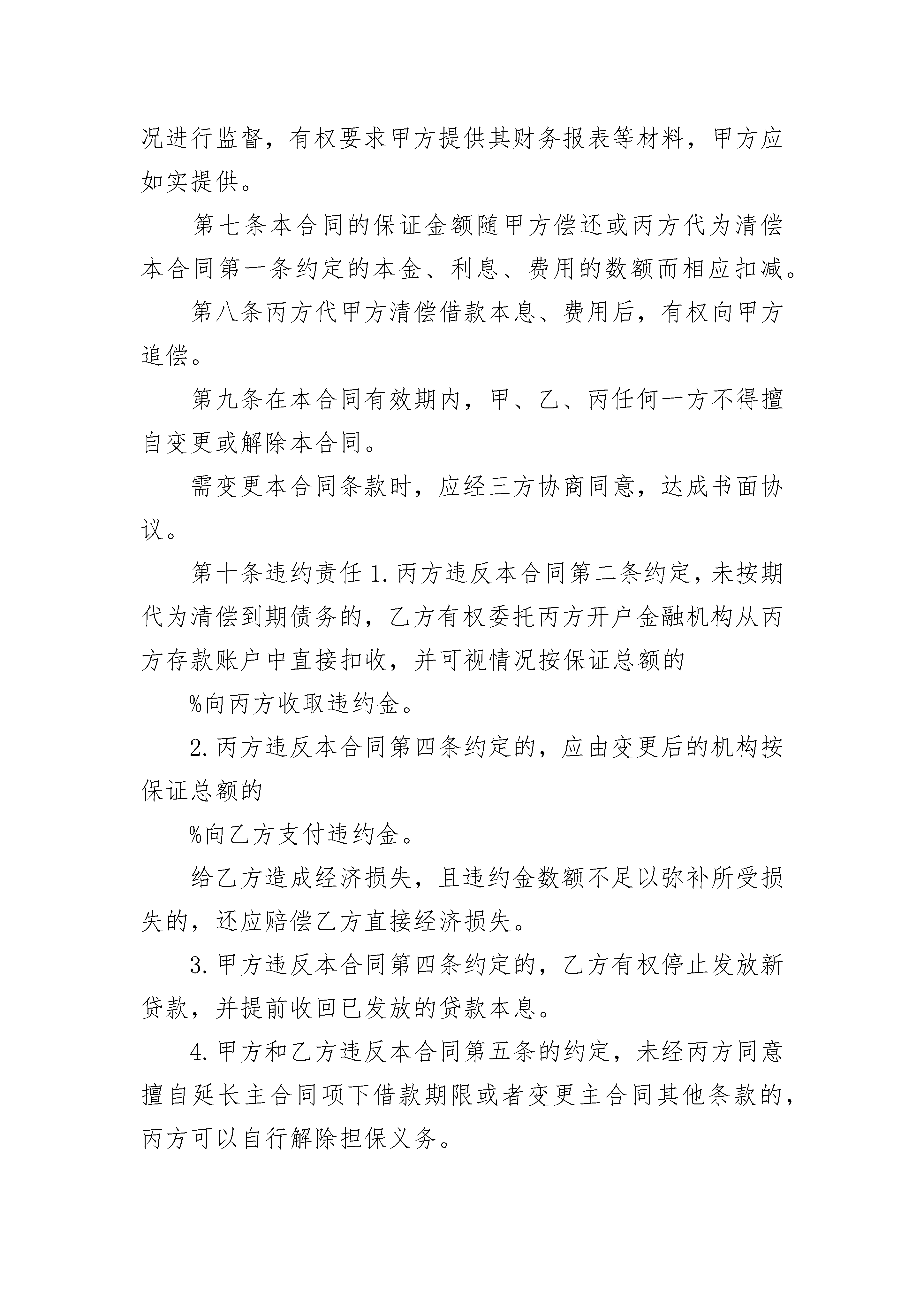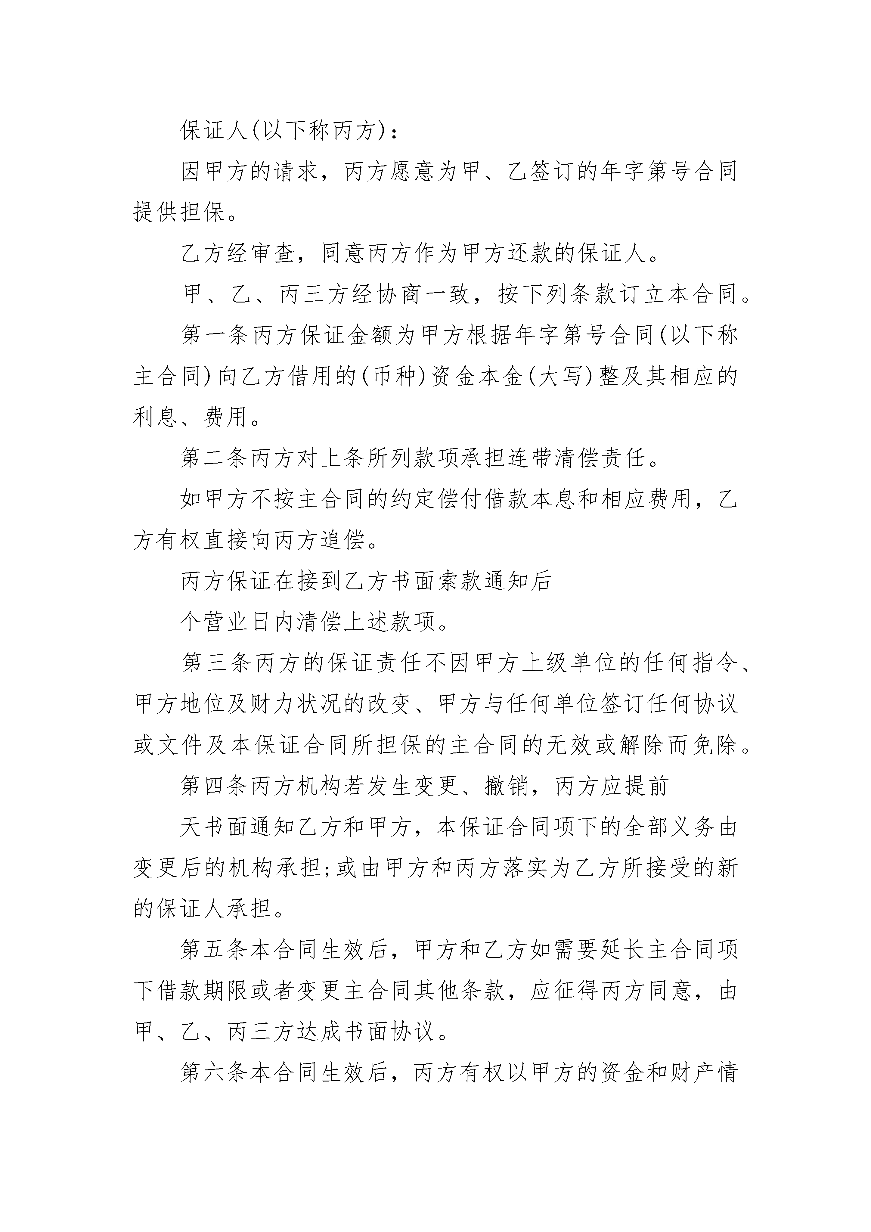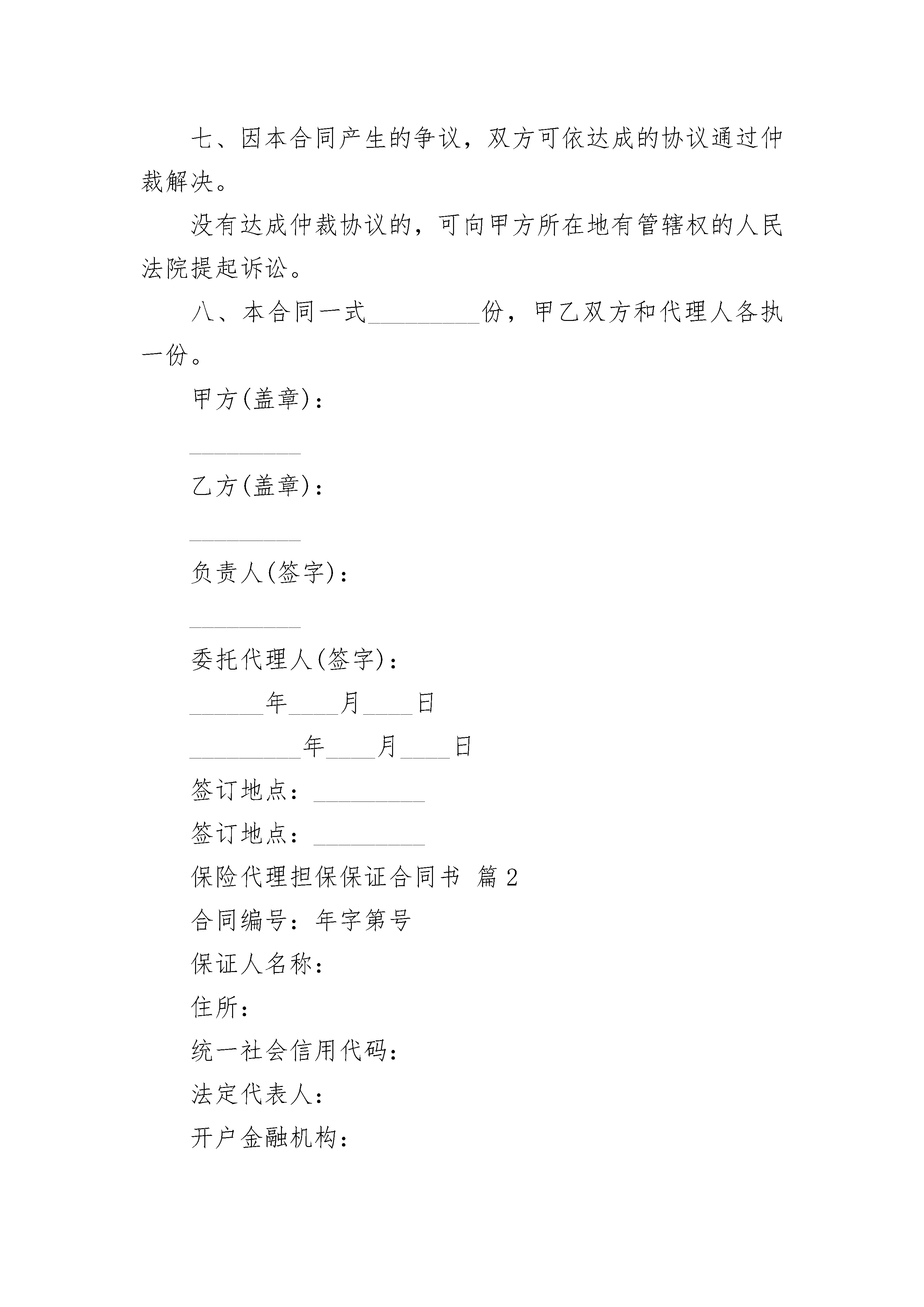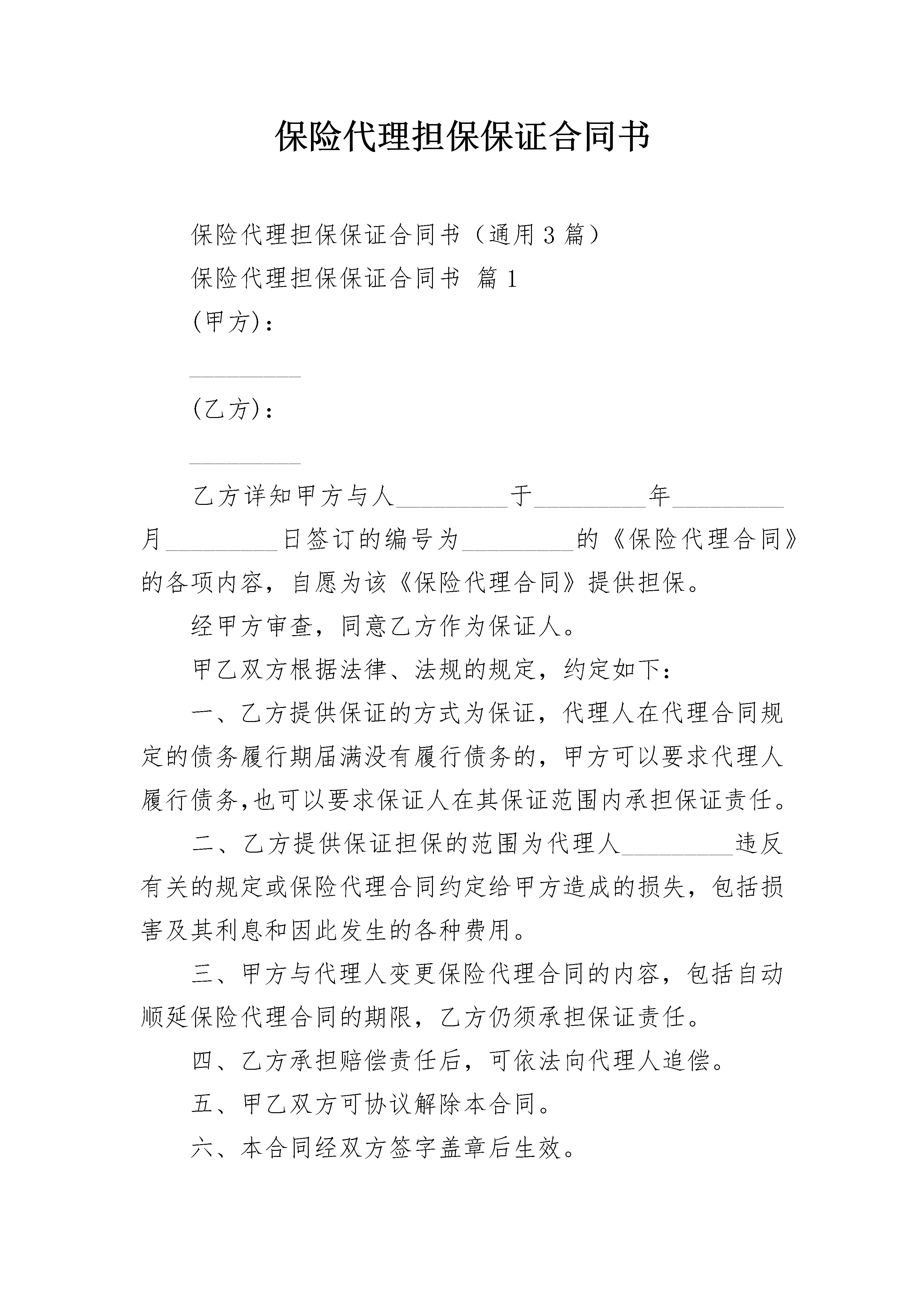 保险代理担保保证合同书保险代理担保保证合同书(通用3篇)保险代理担保保证合同书篇1(甲方):_________(乙方):_________乙方详知甲方与人_________于_________年_________月_________日签订的编号为_________的《保险代理合同》的各项内容,自愿为该《保险代理合同》提供担保。经甲方审查,同意乙方作为保证人。甲乙双方根据法律、法规的规定,约定如下:一、乙方提供保证的方式为保证,代理人在代理合同规定的债务履行期届满没有履行债务的,甲方可以要求代理人履行债务,也可以要求保证人在其保证范围内承担保证责任。二、乙方提供保证担保的范围为代理人_________违反有关的规定或保险代理合同约定给甲方造成的损失,包括损害及其利息和因此发生的各种费用。三、甲方与代理人变更保险代理合同的内容,包括自动顺延保险代理合同的期限,乙方仍须承担保证责任。四、乙方承担赔偿责任后,可依法向代理人追偿。五、甲乙双方可协议解除本合同。六、本合同经双方签字盖章后生效。七、因本合同产生的争议,双方可依达成的协议通过仲裁解决。没有达成仲裁协议的,可向甲方所在地有管辖权的人民法院提起诉讼。八、本合同一式_________份,甲乙双方和代理人各执一份。甲方(盖章):_________乙方(盖章):_________负责人(签字):_________委托代理人(签字):______年____月____日_________年____月____日签订地点:_________签订地点:_________保险代理担保保证合同书篇2合同编号:年字第号保证人名称:住所:统一社会信用代码:法定代表人:开户金融机构:账号:电话:邮政编码:传真:贷款人名称:身份证号:住所:法定代表人:电话:邮政编码:传真:借款人名称:统一社会信用代码:住所:法定代表人:开户金融机构:账号:电话:邮政编码:传真:签订合同日期:年月日签订合同地点:省(市)市县(区)借款人(以下称甲方):贷款人(以下称乙方):保证人(以下称丙方):因甲方的请求,丙方愿意为甲、乙签订的年字第号合同提供担保。乙方经审查,同意丙方作为甲方还款的保证人。甲、乙、丙三方经协商一致,按下列条款订立本合同。第一条丙方保证金额为甲方根据年字第号合同(以下称主合同)向乙方借用的(币种)资金本金(大写)整及其相应的利息、费用。第二条丙方对上条所列款项承担连带清偿责任。如甲方不按主合同的约定偿付借款本息和相应费用,乙方有权直接向丙方追偿。丙方保证在接到乙方书面索款通知后个营业日内清偿上述款项。第三条丙方的保证责任不因甲方上级单位的任何指令、甲方地位及财力状况的改变、甲方与任何单位签订任何协议或文件及本保证合同所担保的主合同的无效或解除而免除。第四条丙方机构若发生变更、撤销,丙方应提前天书面通知乙方和甲方,本保证合同项下的全部义务由变更后的机构承担;或由甲方和丙方落实为乙方所接受的新的保证人承担。第五条本合同生效后,甲方和乙方如需要延长主合同项下借款期限或者变更主合同其他条款,应征得丙方同意,由甲、乙、丙三方达成书面协议。第六条本合同生效后,丙方有权以甲方的资金和财产情况进行监督,有权要求甲方提供其财务报表等材料,甲方应如实提供。第七条本合同的保证金额随甲方偿还或丙方代为清偿本合同第一条约定的本金、利息、费用的数额而相应扣减。第八条丙方代甲方清偿借款本息、费用后,有权向甲方追偿。第九条在本合同有效期内,甲、乙、丙任何一方不得擅自变更或解除本合同。需变更本合同条款时,应经三方协商同意,达成书面协议。第十条违约责任1.丙方违反本合同第二条约定,未按期代为清偿到期债务的,乙方有权委托丙方开户金融机构从丙方存款账户中直接扣收,并可视情况按保证总额的%向丙方收取违约金。2.丙方违反本合同第四条约定的,应由变更后的机构按保证总额的%向乙方支付违约金。给乙方造成经济损失,且违约金数额不足以弥补所受损失的,还应赔偿乙方直接经济损失。3.甲方违反本合同第四条约定的,乙方有权停止发放新贷款,并提前收回已发放的贷款本息。4.甲方和乙方违反本合同第五条的约定,未经丙方同意擅自延长主合同项下借款期限或者变更主合同其他条款的,丙方可以自行解除担保义务。5.本条所列违约金的支付方式,甲、乙双方商定如下:。第十一条争议的解决方式:甲、乙、丙三方在履行本合同中发生的争议,由三方协商或通过调解解决。协商或调解不成,可以向仲裁机构申请仲裁,或者向人民法院起诉(仲裁或诉讼选择一种)。第十二条甲、乙、丙三方商定的其他事项:。第十三条本合同由甲、乙、丙三方法定代表人或法定代表人授权的代理人签字并加盖单位公章,并自主合同生效之日起生效。第十四条本合同正本一式叁份,甲、乙、丙三方各执壹份。(以下无合同正文,为合同签章部分)甲方(签章):乙方(签