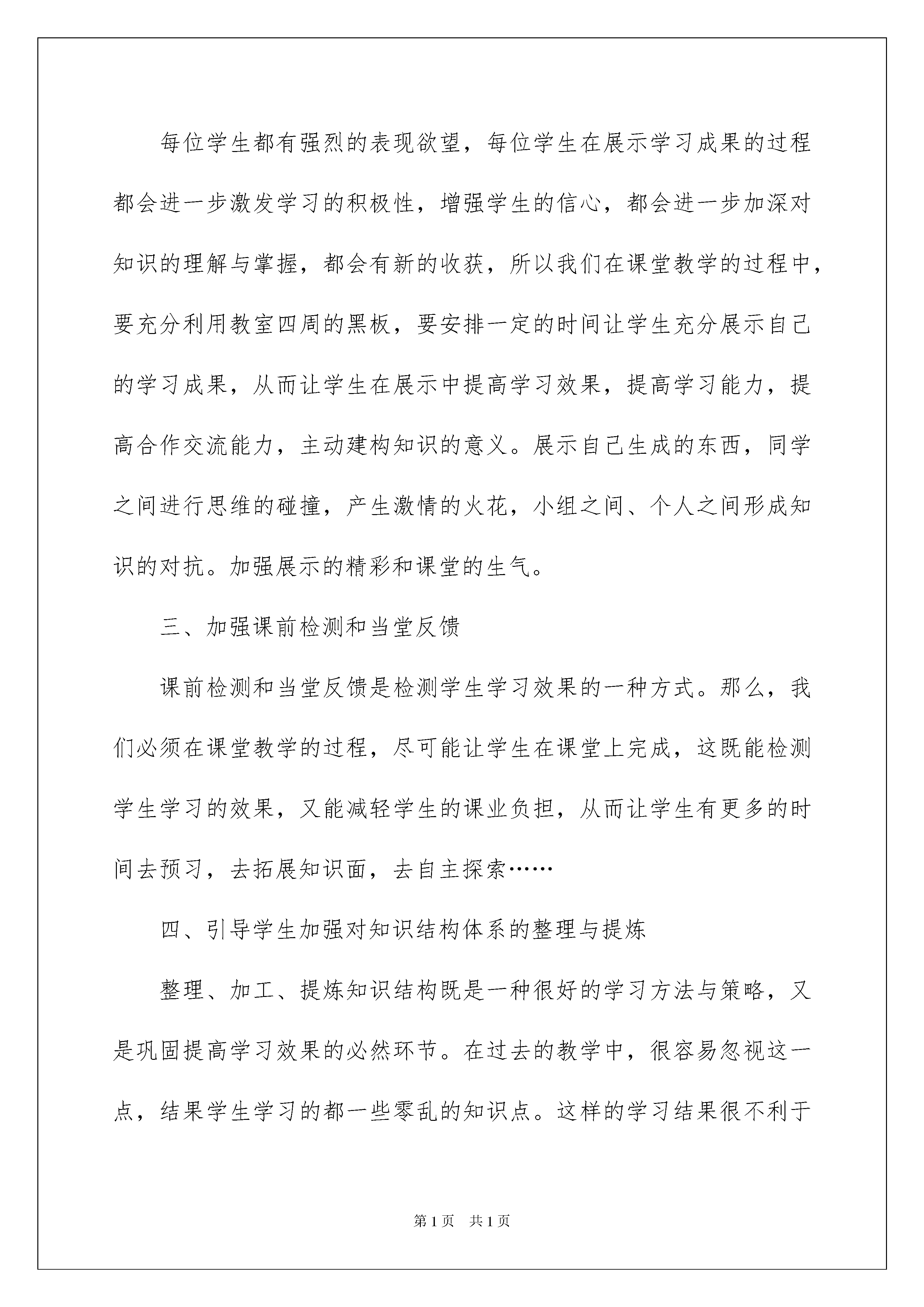 2022关于课堂教学心得体会三篇关于课堂教学心得体会三篇我们从一些事情上得到感悟后,写一篇心得体会,记录下来,这样能够培养人思考的习惯。应该怎么写才合适呢?下面是我精心整理的课堂教学心得体会3篇,仅供参考,欢迎大家阅读。课堂教学心得体会篇1一、加强预习环节的教学以前我们在教学中也曾要求学生进行预习,甚至在新教材中也要求学生进行课前预习,但是一方面,我们对预习这一环节重视不够,只有要求没有落实,或流于形式,甚至根本就没有用到这一环节。另一方面是我们也没有充分利用这一环节的应有价值,没有充分发挥其作用。我们在布置预习任务时不明确,没有分解学习任务,没有进行学习方法的指导,没有对学生的预习能力进行专门的培养。学习高效课堂必须高度重视预习环节,要加强对预习环节的具体要求、效果检测等方面的落实,保证预习的效果。二、加强展示的精彩每位学生都有强烈的表现欲望,每位学生在展示学习成果的过程都会进一步激发学习的积极性,增强学生的信心,都会进一步加深对知识的理解与掌握,都会有新的收获,所以我们在课堂教学的过程中,要充分利用教室四周的黑板,要安排一定的时间让学生充分展示自己的学习成果,从而让学生在展示中提高学习效果,提高学习能力,提高合作交流能力,主动建构知识的意义。展示自己生成的东西,同学之间进行思维的碰撞,产生激情的火花,小组之间、个人之间形成知识的对抗。加强展示的精彩和课堂的生气。三、加强课前检测和当堂反馈课前检测和当堂反馈是检测学生学习效果的一种方式。那么,我们必须在课堂教学的过程,尽可能让学生在课堂上完成,这既能检测学生学习的效果,又能减轻学生的课业负担,从而让学生有更多的时间去预习,去拓展知识面,去自主探索……四、引导学生加强对知识结构体系的整理与提炼整理、加工、提炼知识结构既是一种很好的学习方法与策略,又是巩固提高学习效果的必然环节。在过去的教学中,很容易忽视这一点,结果学生学习的都一些零乱的知识点。这样的学习结果很不利于学生对知识的灵活运用,不利于学生认识学习内容的实质与核心,不利于学生对知识之间进行联系,不利于学生在学习中的创新。因此,在高效课堂的教学中,教师必须树立引导学生对所学内容进行理由,归纳,概括、提炼的意识,要给学生总结概括的时间与空间,要不断提高学生的总结能力,从而让总结成为学生每一节课学习的最后一个环节,也是最有价值、最有效的一个环节。课堂教学心得体会篇2今天在美苑小学听陈传荣校长的《从课堂观察和诊断谈有效教学》在唐惠慧青年成长助推站的讲座报告。在此之前我一直认为听课只是听老师如何去讲,学生如何参与课堂教学,听了陈校的报告以后我才认识到应用课堂观察技术才能够更清晰具体的对一节课进行诊断和评价。而作为一名教师,理解认识了课堂观察技术这一科学有效的研究方法后,能够促进自己更加注重一些教学环节的设计与处理,从而使课堂教学更加有效,使得教师个人专业素养有着更快的提升。那课堂诊断的意义何在,难道就是为了提高自己的评课能力?不是,而是教师参与课堂观察、诊断具有重要的教育意义,课堂观察、诊断有助于促进教师个人的发展和所教班级的改进,通过观察研究能使得教师更为注重如何去关注学生、研究与促进学生的学习,因为学生学习是课堂的重要组织部分,教和学是紧密联系在一起的,不管是观察、诊断教师,还是学生,最终都是指向学生的学习,由学生的输出结果来检验,课堂观察、诊断的起点和归宿就是为了改善学生的课堂学习。在促进课堂教学有效性的同时教师个人的专业发展也能得到快速的提升,通过课堂观察、诊断,教师借助合作的力量在实践性知识、反省能力等方面将获得新的发展,进而提高教师的整体教学质量。因为,无论是观察、诊断者还是被观察、诊断者,无论是处在哪个发展阶段的教师,都可以根据自己的实际需要,有针对性地进行课堂观察、诊断,经由观察、诊断他人课堂或接受同伴的诊断,反思自己的教育理念和教学行为,形成新的认识回馈,发展个人的教学实践智慧。故而,通过课堂教学观察与评价学习吸收大量的`教学理论、经验和先进的信息,在教师教学中去运用。从而把自己的经验总结概括形成理论。如此循环反复,教师的教学业务素质必然会获得很大的提高。听完陈传荣校长的讲座才意识到课堂教学中应该关注的几个方面:如陈校讲到的关注学生的成长水平与内在学习的要求,关注教学的现实性、真实性,关注数学的本质,关注学与至用,关注情境和数学化。从而使自己在今后听课和参加评课中,知道应从哪个方面去看待一节课及如何去评价一节课的好与坏,要想很好的观察一节课的有效性还需要不断的学习,以及不断的观察课堂及记录分析,只有多做、多想、多实践,才能从课堂观察和诊断的有效性教学才能够让