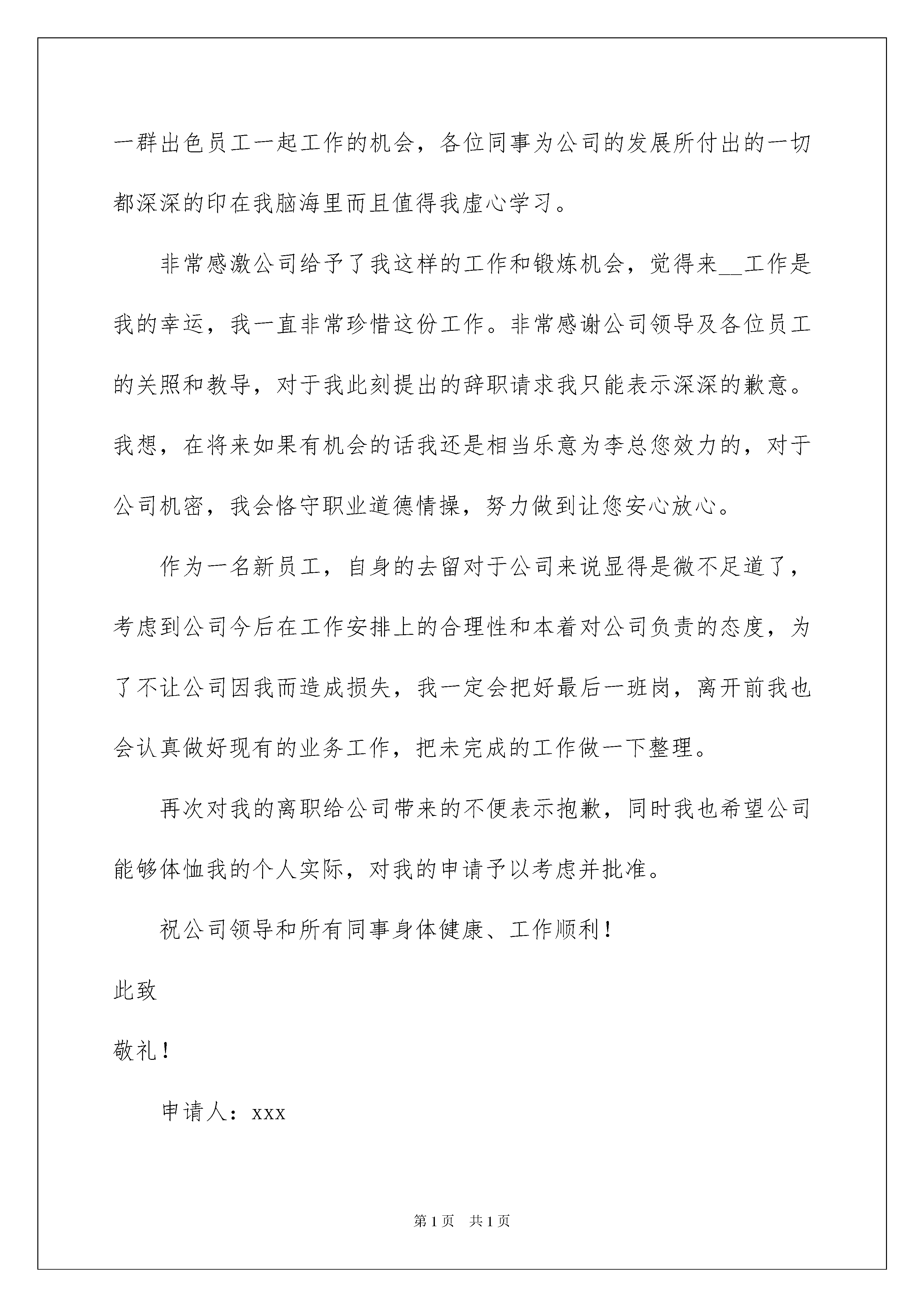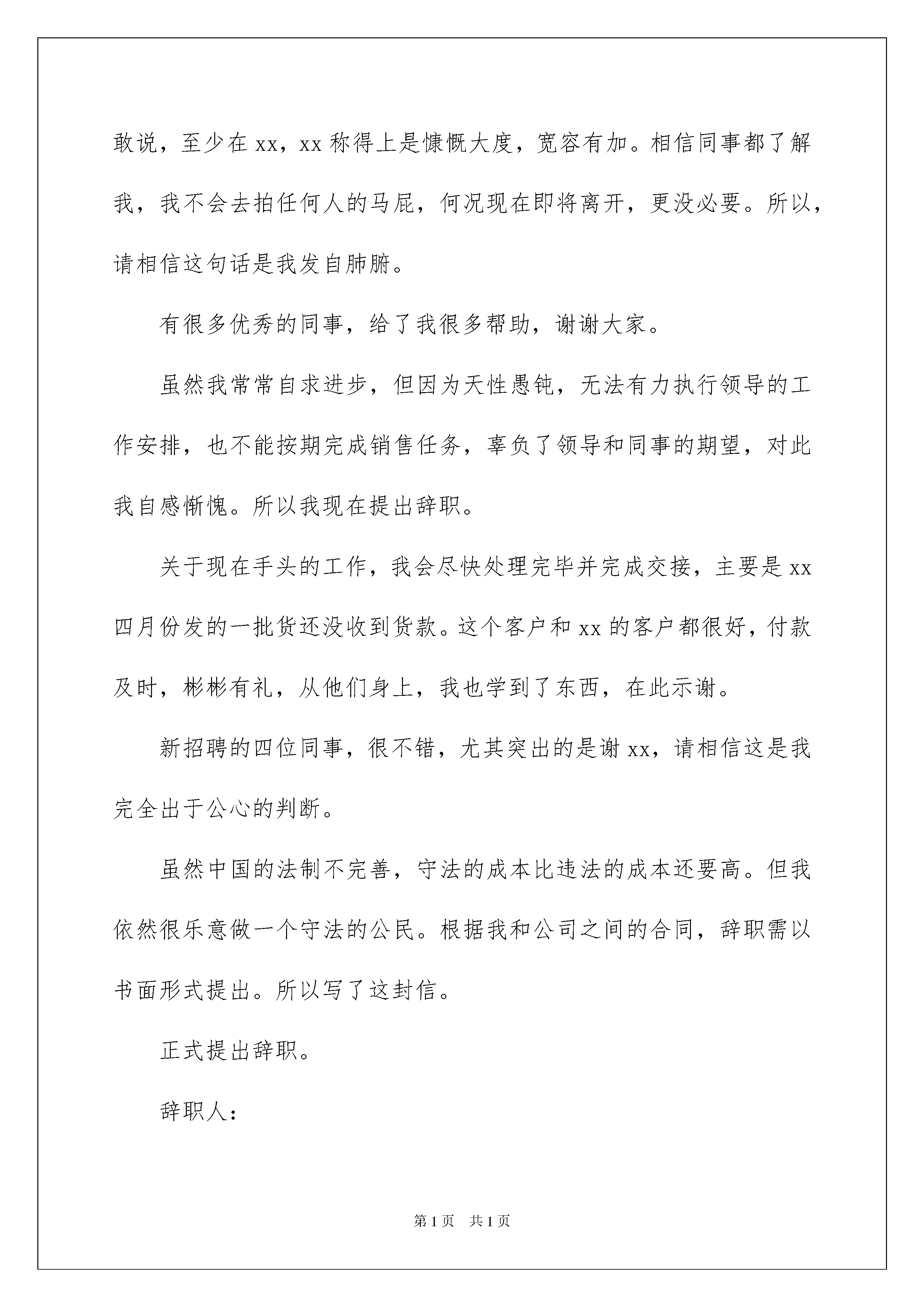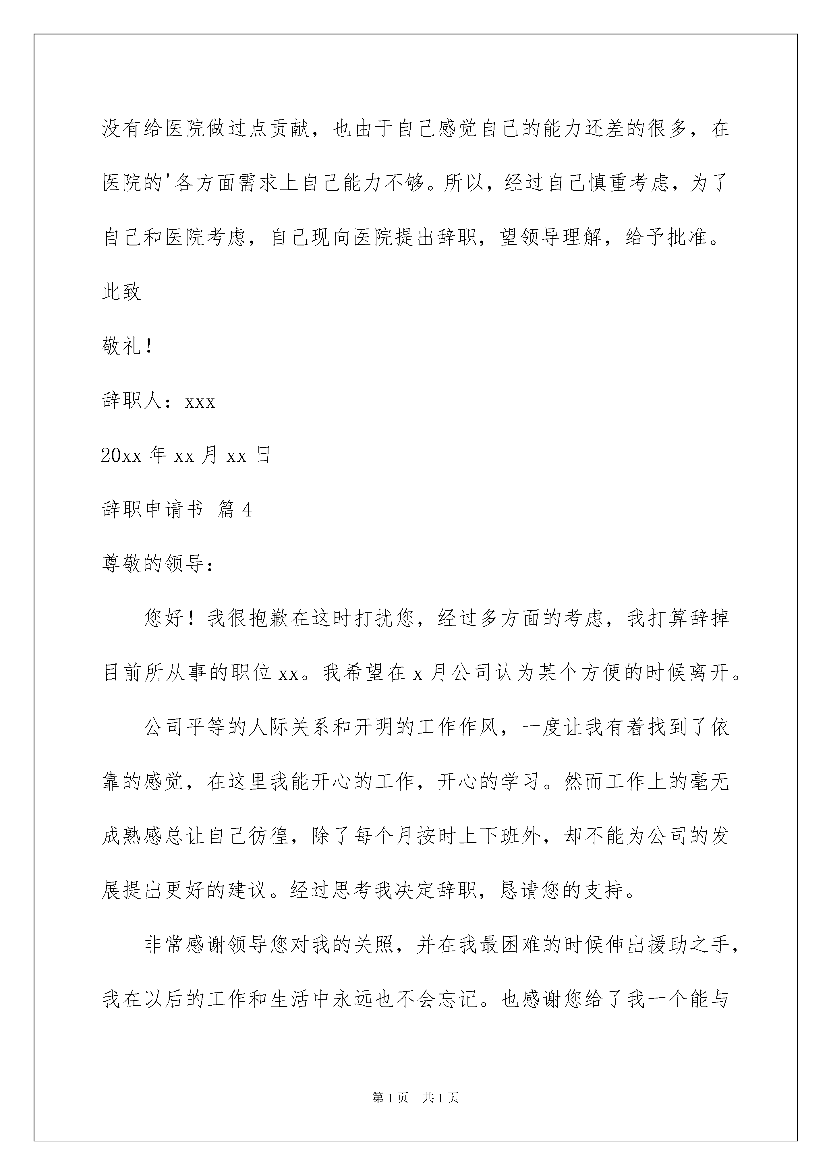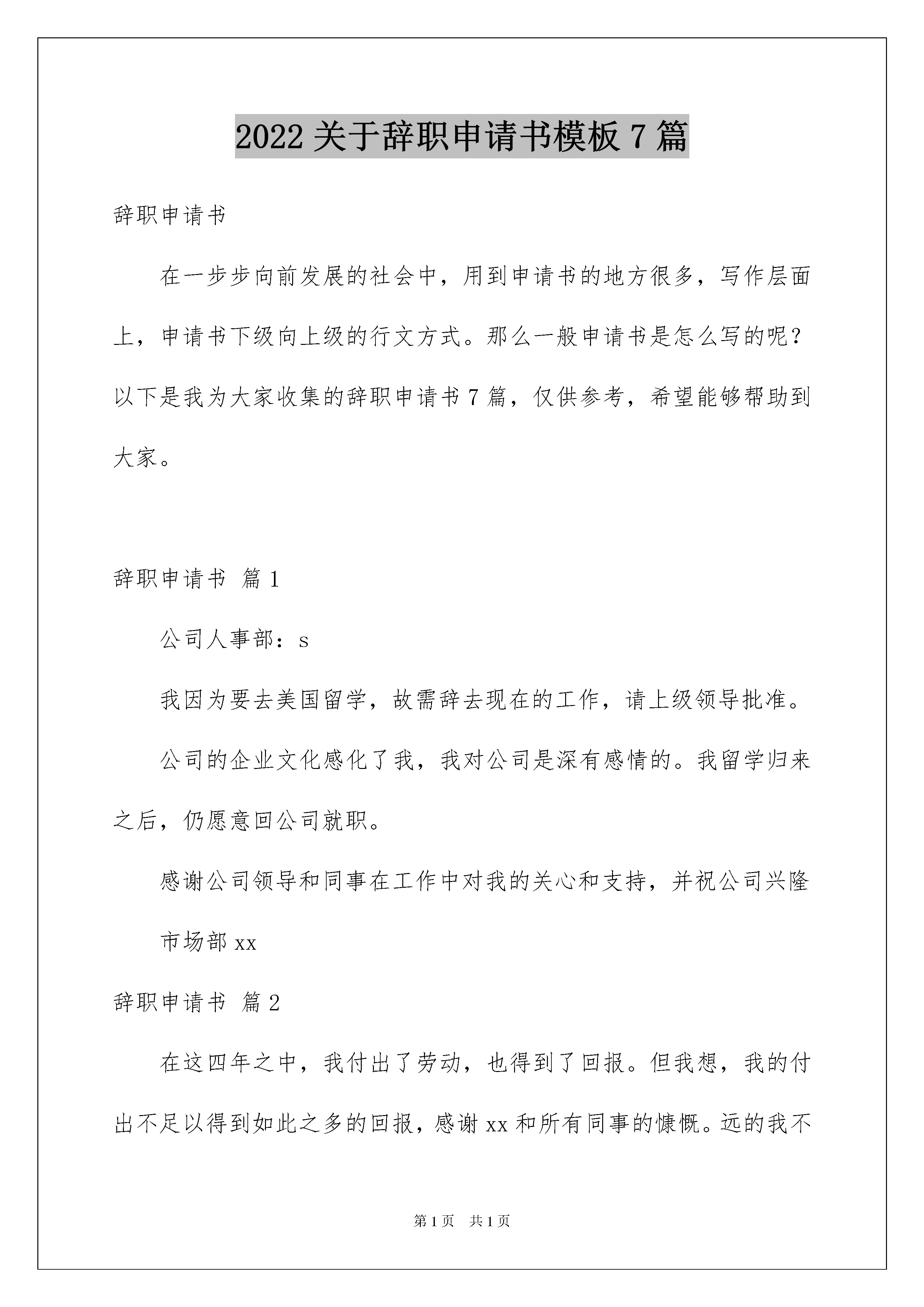 2022关于辞职申请书模板7篇辞职申请书在一步步向前发展的社会中,用到申请书的地方很多,写作层面上,申请书下级向上级的行文方式。那么一般申请书是怎么写的呢?以下是我为大家收集的辞职申请书7篇,仅供参考,希望能够帮助到大家。辞职申请书篇1公司人事部:s我因为要去美国留学,故需辞去现在的工作,请上级领导批准。公司的企业文化感化了我,我对公司是深有感情的。我留学归来之后,仍愿意回公司就职。感谢公司领导和同事在工作中对我的关心和支持,并祝公司兴隆市场部xx辞职申请书篇2在这四年之中,我付出了劳动,也得到了回报。但我想,我的付出不足以得到如此之多的回报,感谢xx和所有同事的慷慨。远的我不敢说,至少在xx,xx称得上是慷慨大度,宽容有加。相信同事都了解我,我不会去拍任何人的马屁,何况现在即将离开,更没必要。所以,请相信这句话是我发自肺腑。有很多优秀的同事,给了我很多帮助,谢谢大家。虽然我常常自求进步,但因为天性愚钝,无法有力执行领导的工作安排,也不能按期完成销售任务,辜负了领导和同事的期望,对此我自感惭愧。所以我现在提出辞职。关于现在手头的工作,我会尽快处理完毕并完成交接,主要是xx四月份发的一批货还没收到货款。这个客户和xx的客户都很好,付款及时,彬彬有礼,从他们身上,我也学到了东西,在此示谢。新招聘的四位同事,很不错,尤其突出的是谢xx,请相信这是我完全出于公心的判断。虽然中国的法制不完善,守法的成本比违法的成本还要高。但我依然很乐意做一个守法的公民。根据我和公司之间的合同,辞职需以书面形式提出。所以写了这封信。正式提出辞职。辞职人:日期:辞职申请书篇3尊敬的领导:您好!从20xx年初至今,进入医院工作xx年的时间里,得到了医院各位同事的多方帮助,我非常感谢医院各位同事。在过去的xx年里,我在医院里工作的很开心,感觉医院的气氛就和一个大家庭一样,大家相处的融洽和睦,同时在医院里也学会了如何与同事相处,如何与客户建立良好关系等方面的东西。并在医院的过去x年里,利用医院给予良好学习时间,学习了一些新的东西来充实了自己,并增加自己的一些知识和实践经验。我对于医院xx年多的照顾表示真心的感谢!在经过xx年的时间里,医院给予了很好的机会,让自己学习做市场方面的运做,但由于自己缺乏市场等方面的经验,自己没有能很好的为医院做好新的市场开发,自己身感有愧医院的x年的培养。由于我个人感觉,我在过去的一段时间里的表现不能让自己感觉满意,感觉有些愧对医院这x年的照顾,自己也感觉自己在过去xx年没有给医院做过点贡献,也由于自己感觉自己的能力还差的很多,在医院的'各方面需求上自己能力不够。所以,经过自己慎重考虑,为了自己和医院考虑,自己现向医院提出辞职,望领导理解,给予批准。此致敬礼!辞职人:xxx20xx年xx月xx日辞职申请书篇4尊敬的领导:您好!我很抱歉在这时打扰您,经过多方面的考虑,我打算辞掉目前所从事的职位xx。我希望在x月公司认为某个方便的时候离开。公司平等的人际关系和开明的工作作风,一度让我有着找到了依靠的感觉,在这里我能开心的工作,开心的学习。然而工作上的毫无成熟感总让自己彷徨,除了每个月按时上下班外,却不能为公司的发展提出更好的建议。经过思考我决定辞职,恳请您的支持。非常感谢领导您对我的关照,并在我最困难的时候伸出援助之手,我在以后的工作和生活中永远也不会忘记。也感谢您给了我一个能与一群出色员工一起工作的机会,各位同事为公司的发展所付出的一切都深深的印在我脑海里而且值得我虚心学习。非常感激公司给予了我这样的工作和锻炼机会,觉得来__工作是我的幸运,我一直非常珍惜这份工作。非常感谢公司领导及各位员工的关照和教导,对于我此刻提出的辞职请求我只能表示深深的歉意。我想,在将来如果有机会的话我还是相当乐意为李总您效力的,对于公司机密,我会恪守职业道德情操,努力做到让您安心放心。作为一名新员工,自身的去留对于公司来说显得是微不足道了,考虑到公司今后在工作安排上的合理性和本着对公司负责的态度,为了不让公司因我而造成损失,我一定会把好最后一班岗,离开前我也会认真做好现有的业务工作,把未完成的工作做一下整理。再次对我的离职给公司带来的不便表示抱歉,同时我也希望公司能够体恤我的个人实际,对我的申请予以考虑并批准。祝公司领导和所有同事身体健康、工作顺利!此致敬礼!申请人:xxx20xx年x月x日辞职申请书篇5尊敬的领导:您们好!截止到今天,已然过去了X月。在这段时间,和很多优秀的人成为同事,让我受益匪浅,并且我相信在将来也一定会深深的影响我,我诚挚的感谢大家,感谢这个企业中的每一位,因为你们让我成长!非常感谢