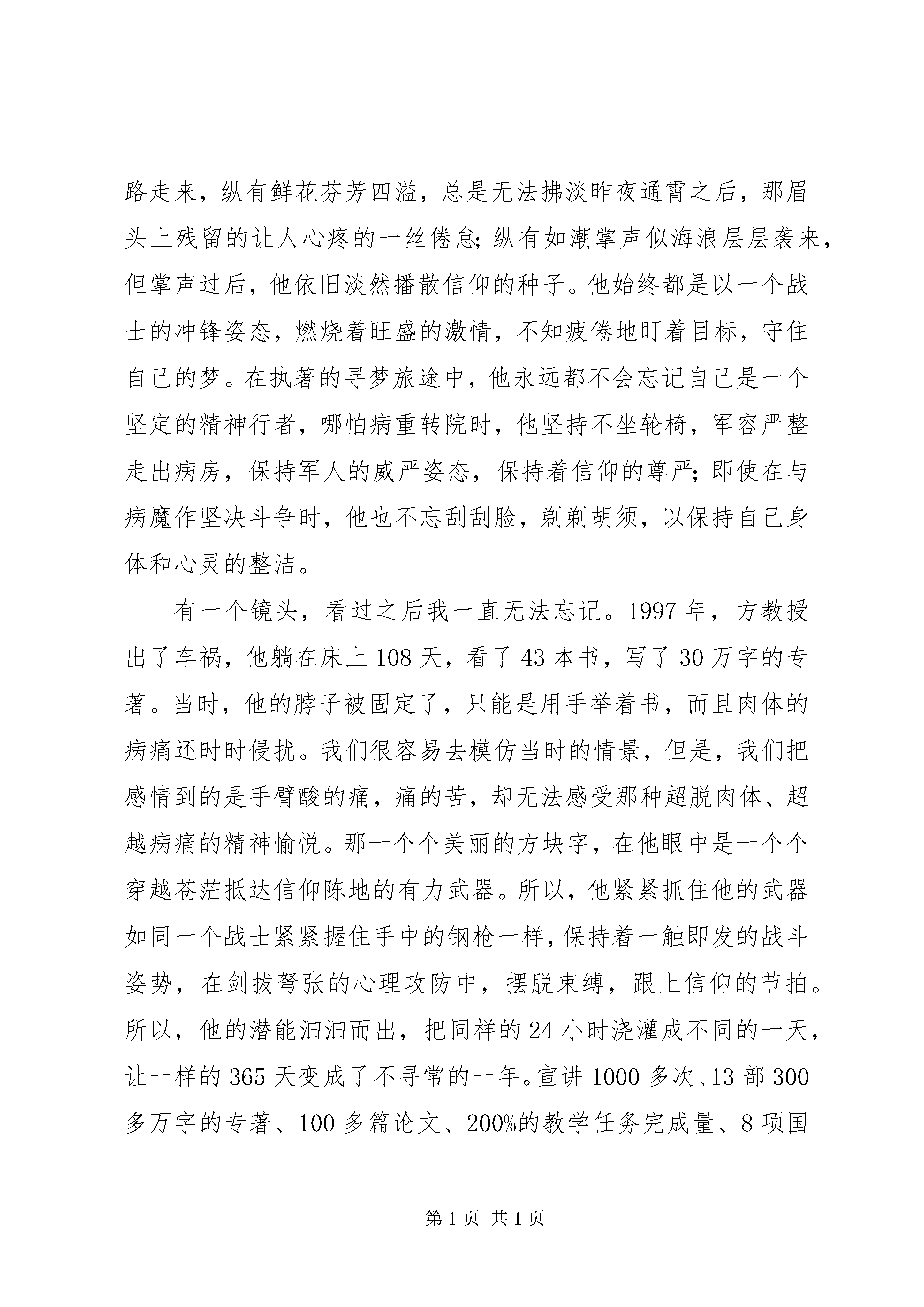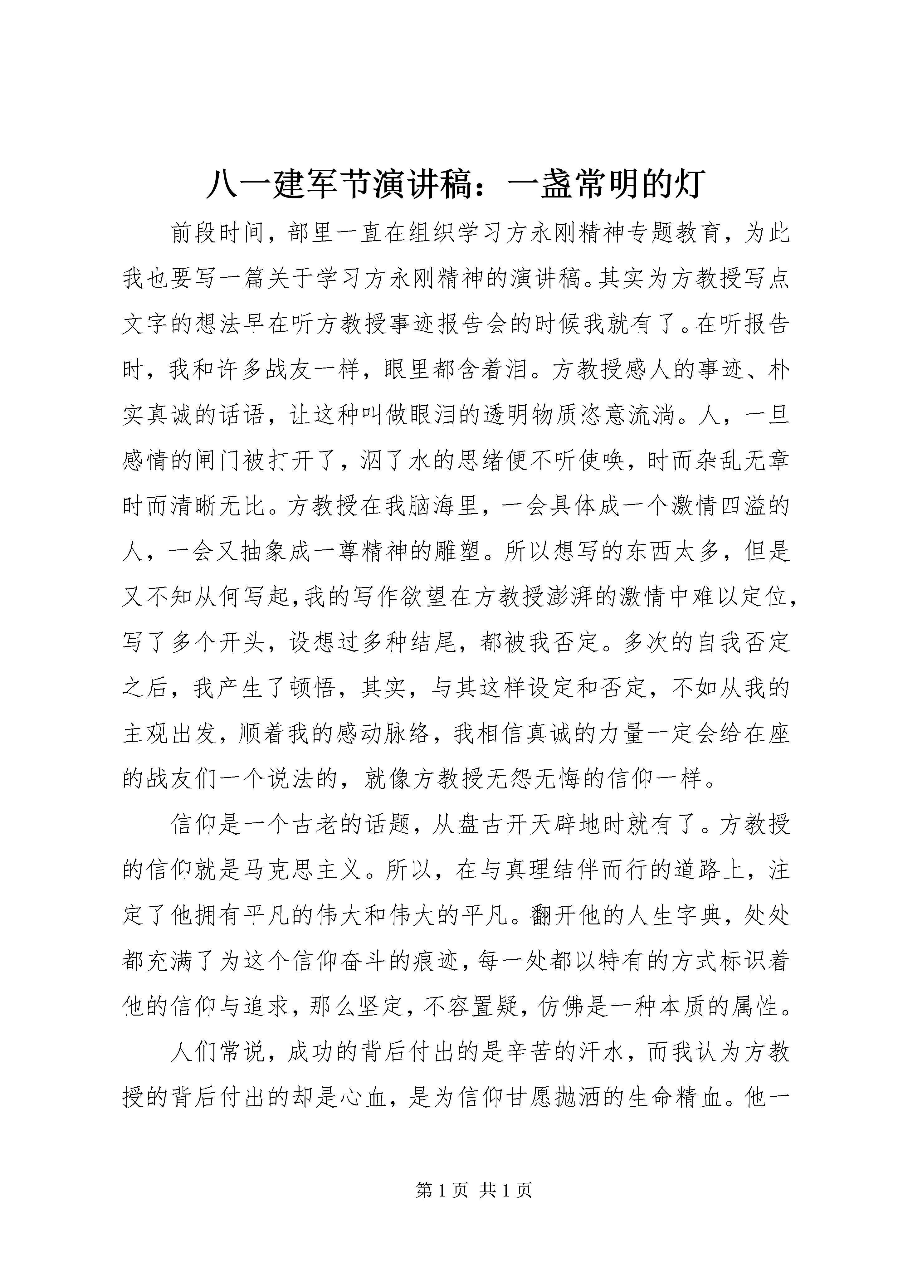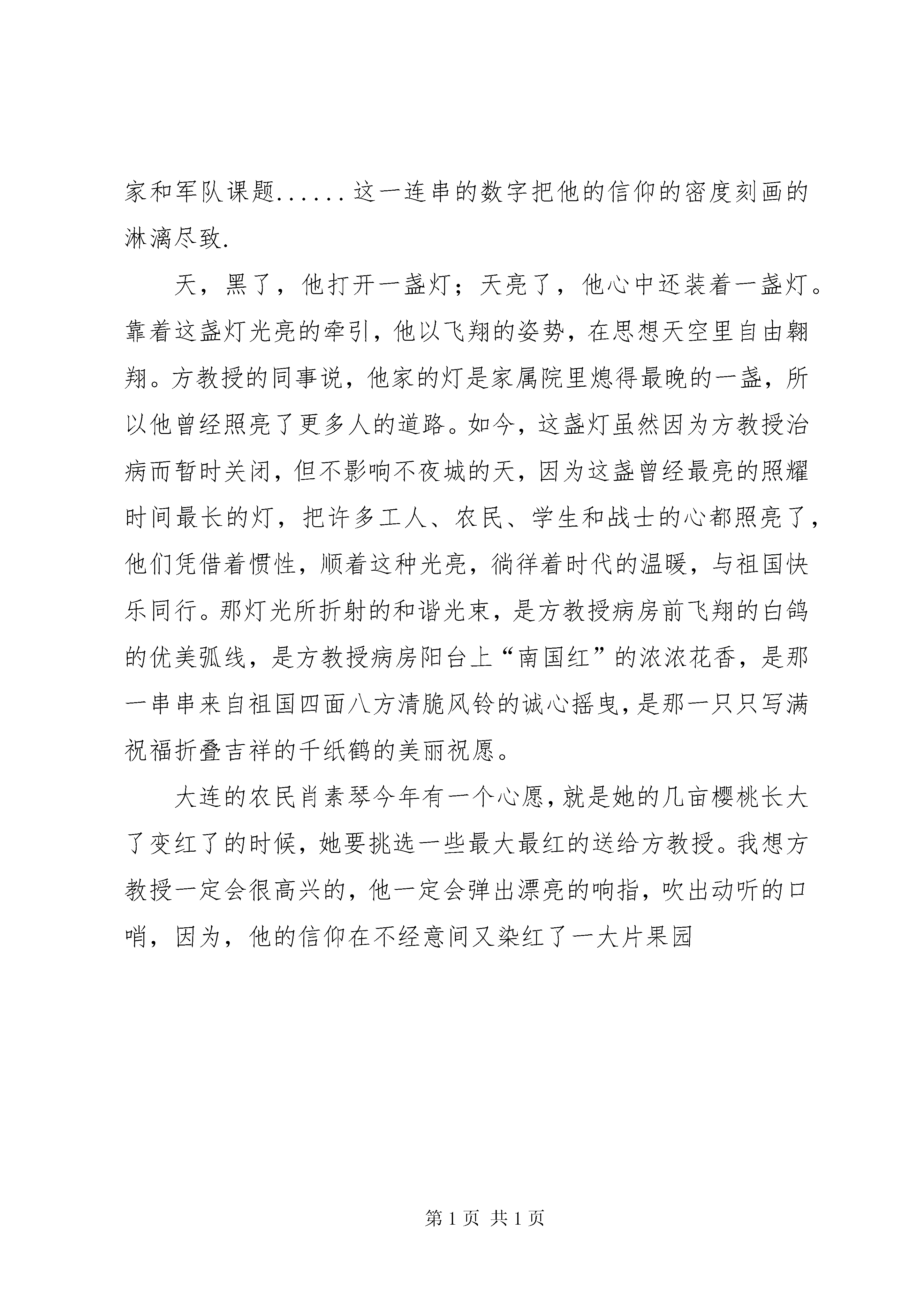 八一建军节演讲稿:一盏常明的灯前段时间,部里一直在组织学习方永刚精神专题教育,为此我也要写一篇关于学习方永刚精神的演讲稿。其实为方教授写点文字的想法早在听方教授事迹报告会的时候我就有了。在听报告时,我和许多战友一样,眼里都含着泪。方教授感人的事迹、朴实真诚的话语,让这种叫做眼泪的透明物质恣意流淌。人,一旦感情的闸门被打开了,泅了水的思绪便不听使唤,时而杂乱无章时而清晰无比。方教授在我脑海里,一会具体成一个激情四溢的人,一会又抽象成一尊精神的雕塑。所以想写的东西太多,但是又不知从何写起,我的写作欲望在方教授澎湃的激情中难以定位,写了多个开头,设想过多种结尾,都被我否定。多次的自我否定之后,我产生了顿悟,其实,与其这样设定和否定,不如从我的主观出发,顺着我的感动脉络,我相信真诚的力量一定会给在座的战友们一个说法的,就像方教授无怨无悔的信仰一样。信仰是一个古老的话题,从盘古开天辟地时就有了。方教授的信仰就是马克思主义。所以,在与真理结伴而行的道路上,注定了他拥有平凡的伟大和伟大的平凡。翻开他的人生字典,处处都充满了为这个信仰奋斗的痕迹,每一处都以特有的方式标识着他的信仰与追求,那么坚定,不容置疑,仿佛是一种本质的属性。人们常说,成功的背后付出的是辛苦的汗水,而我认为方教授的背后付出的却是心血,是为信仰甘愿抛洒的生命精血。他一路走来,纵有鲜花芬芳四溢,总是无法拂淡昨夜通霄之后,那眉头上残留的让人心疼的一丝倦怠;纵有如潮掌声似海浪层层袭来,但掌声过后,他依旧淡然播散信仰的种子。他始终都是以一个战士的冲锋姿态,燃烧着旺盛的激情,不知疲倦地盯着目标,守住自己的梦。在执著的寻梦旅途中,他永远都不会忘记自己是一个坚定的精神行者,哪怕病重转院时,他坚持不坐轮椅,军容严整走出病房,保持军人的威严姿态,保持着信仰的尊严;即使在与病魔作坚决斗争时,他也不忘刮刮脸,剃剃胡须,以保持自己身体和心灵的整洁。有一个镜头,看过之后我一直无法忘记。1997年,方教授出了车祸,他躺在床上108天,看了43本书,写了30万字的专著。当时,他的脖子被固定了,只能是用手举着书,而且肉体的病痛还时时侵扰。我们很容易去模仿当时的情景,但是,我们把感情到的是手臂酸的痛,痛的苦,却无法感受那种超脱肉体、超越病痛的精神愉悦。那一个个美丽的方块字,在他眼中是一个个穿越苍茫抵达信仰陈地的有力武器。所以,他紧紧抓住他的武器如同一个战士紧紧握住手中的钢枪一样,保持着一触即发的战斗姿势,在剑拔弩张的心理攻防中,摆脱束缚,跟上信仰的节拍。所以,他的潜能汩汩而出,把同样的24小时浇灌成不同的一天,让一样的365天变成了不寻常的一年。宣讲1000多次、13部300多万字的专著、100多篇论文、200%的教学任务完成量、8项国家和军队课题......这一连串的数字把他的信仰的密度刻画的淋漓尽致.天,黑了,他打开一盏灯;天亮了,他心中还装着一盏灯。靠着这盏灯光亮的牵引,他以飞翔的姿势,在思想天空里自由翱翔。方教授的同事说,他家的灯是家属院里熄得最晚的一盏,所以他曾经照亮了更多人的道路。如今,这盏灯虽然因为方教授治病而暂时关闭,但不影响不夜城的天,因为这盏曾经最亮的照耀时间最长的灯,把许多工人、农民、学生和战士的心都照亮了,他们凭借着惯性,顺着这种光亮,徜徉着时代的温暖,与祖国快乐同行。那灯光所折射的和谐光束,是方教授病房前飞翔的白鸽的优美弧线,是方教授病房阳台上“南国红”的浓浓花香,是那一串串来自祖国四面八方清脆风铃的诚心摇曳,是那一只只写满祝福折叠吉祥的千纸鹤的美丽祝愿。大连的农民肖素琴今年有一个心愿,就是她的几亩樱桃长大了变红了的时候,她要挑选一些最大最红的送给方教授。我想方教授一定会很高兴的,他一定会弹出漂亮的响指,吹出动听的口哨,因为,他的信仰在不经意间又染红了一大片果园