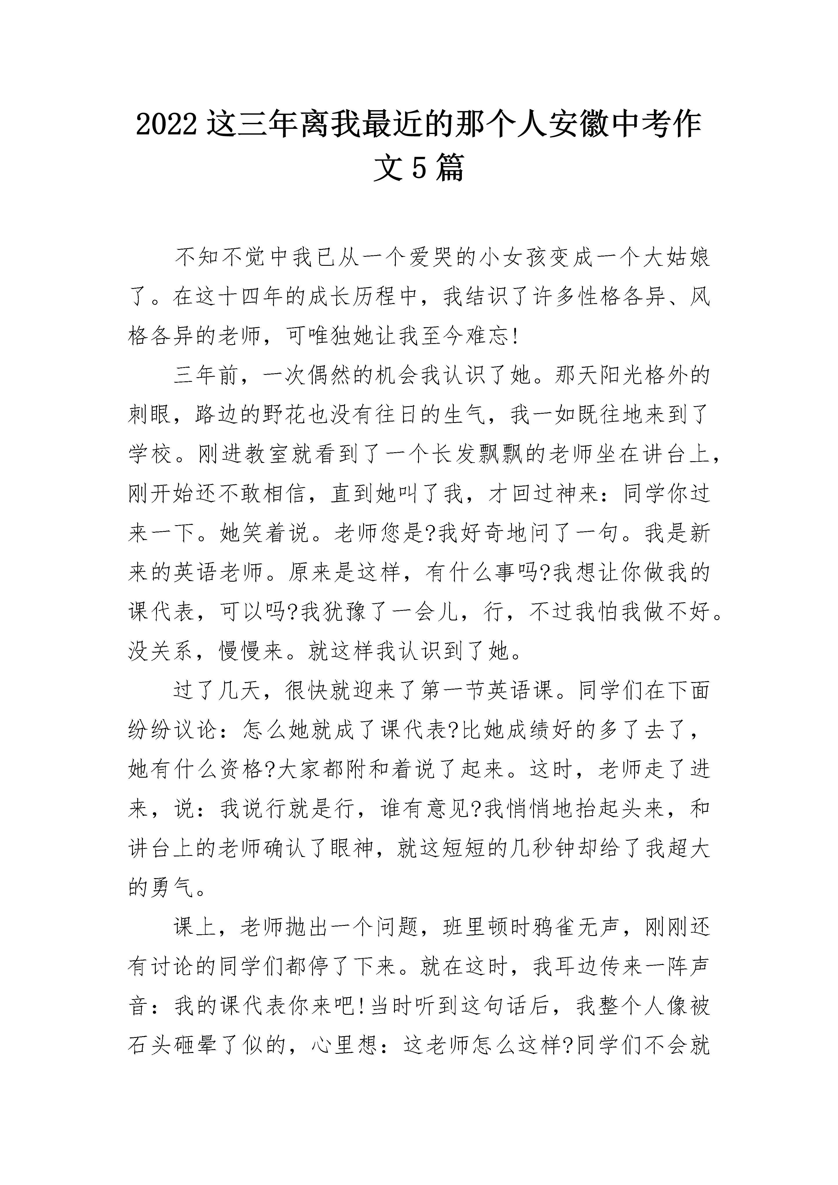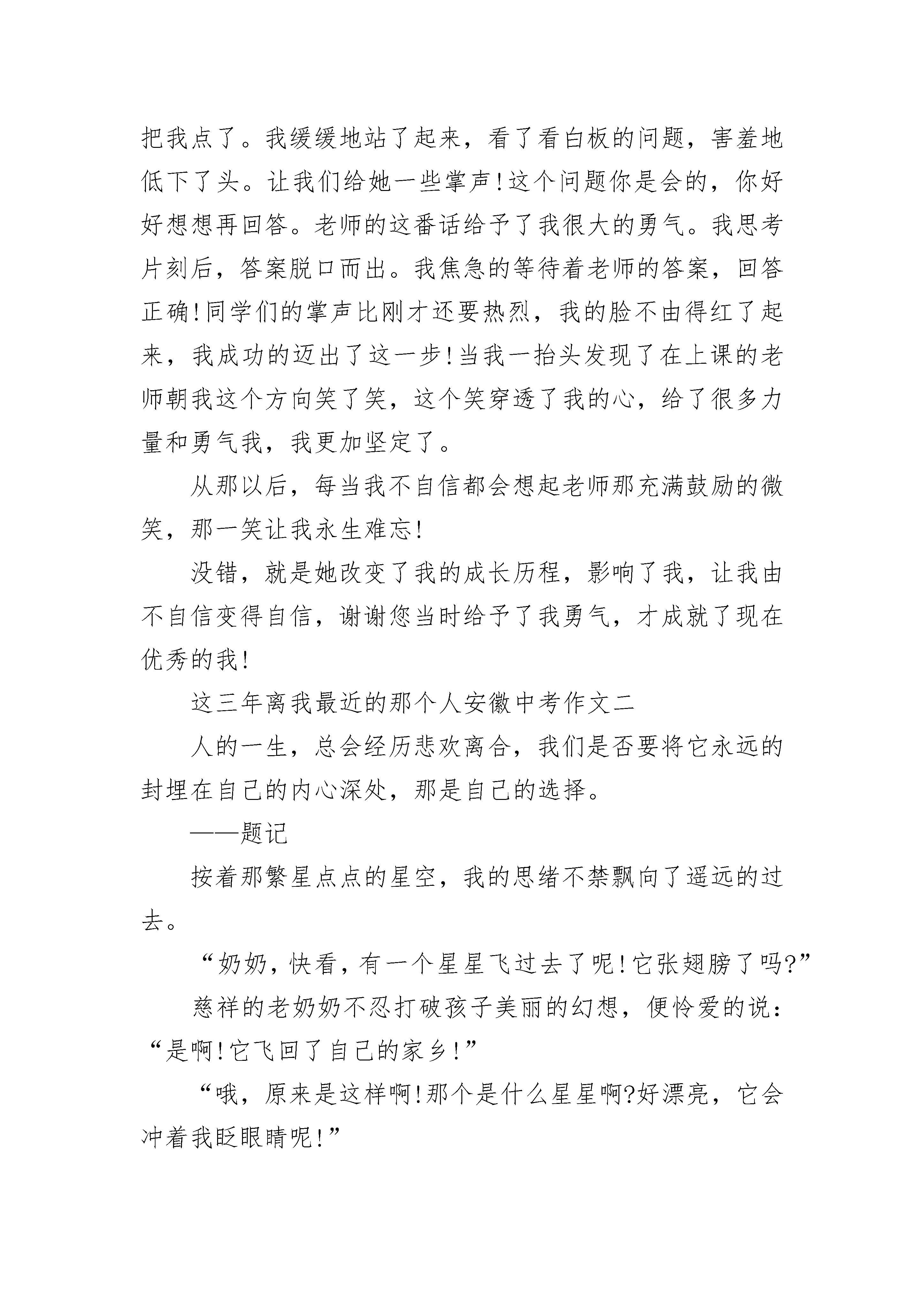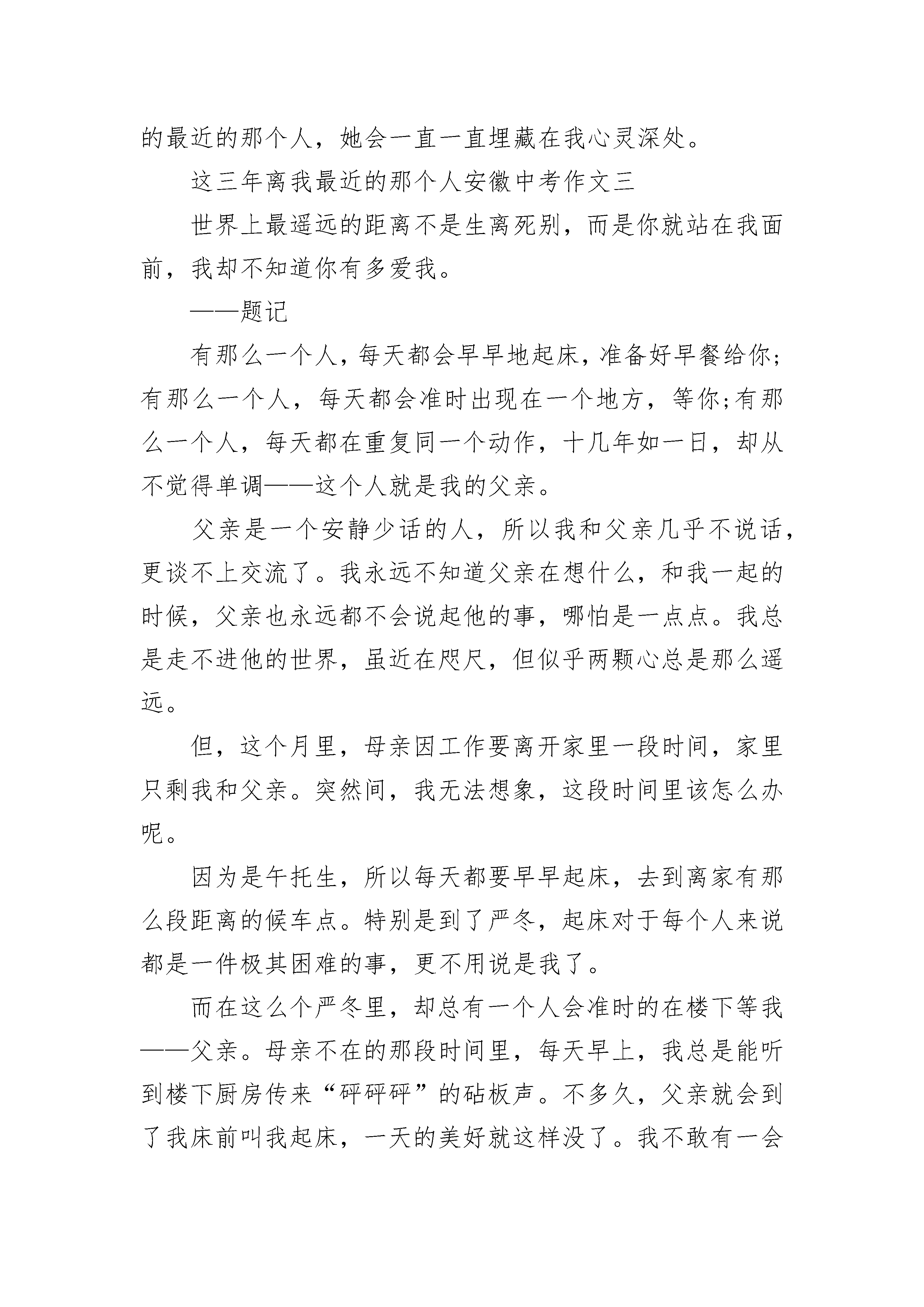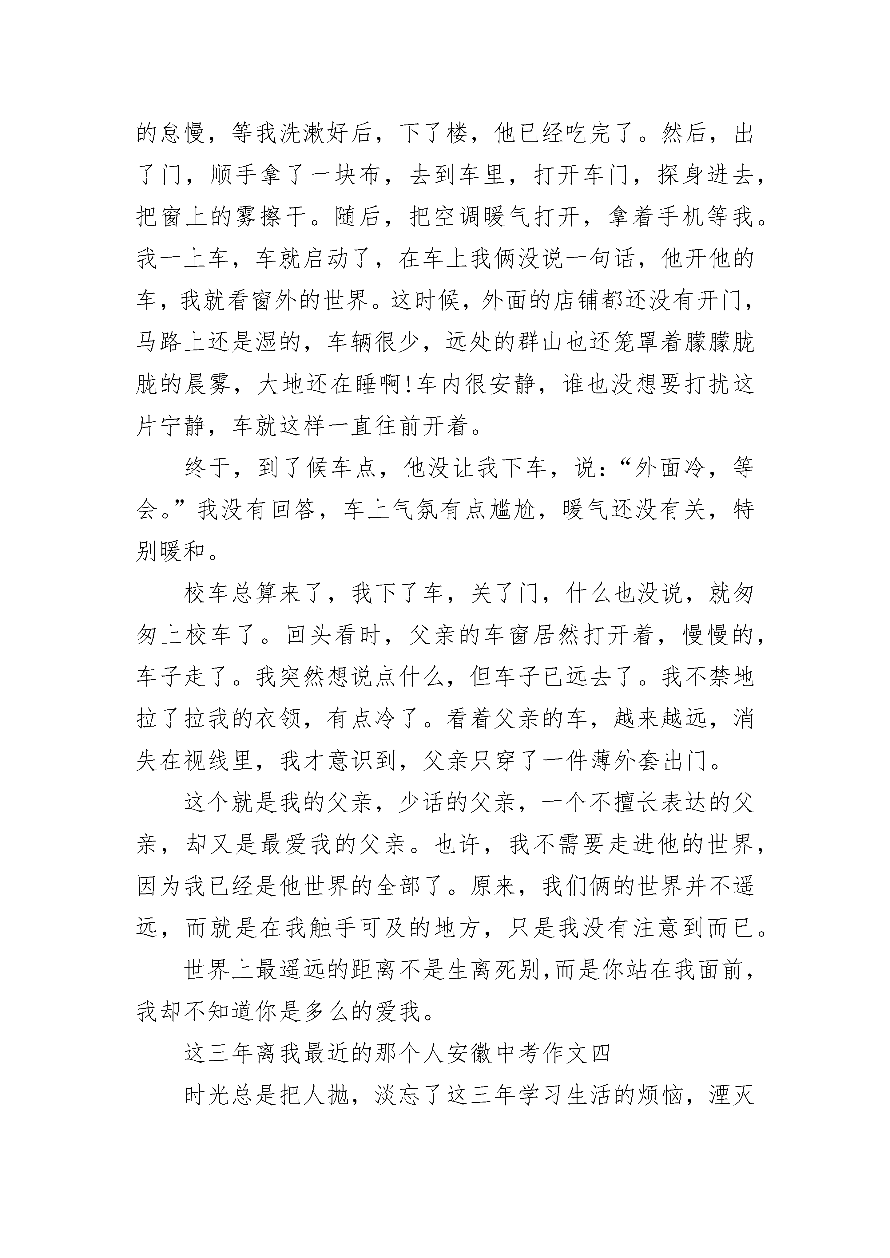2022这三年离我最近的那个人安徽中考作文5篇不知不觉中我已从一个爱哭的小女孩变成一个大姑娘了。在这十四年的成长历程中,我结识了许多性格各异、风格各异的老师,可唯独她让我至今难忘!三年前,一次偶然的机会我认识了她。那天阳光格外的刺眼,路边的野花也没有往日的生气,我一如既往地来到了学校。刚进教室就看到了一个长发飘飘的老师坐在讲台上,刚开始还不敢相信,直到她叫了我,才回过神来:同学你过来一下。她笑着说。老师您是?我好奇地问了一句。我是新来的英语老师。原来是这样,有什么事吗?我想让你做我的课代表,可以吗?我犹豫了一会儿,行,不过我怕我做不好。没关系,慢慢来。就这样我认识到了她。过了几天,很快就迎来了第一节英语课。同学们在下面纷纷议论:怎么她就成了课代表?比她成绩好的多了去了,她有什么资格?大家都附和着说了起来。这时,老师走了进来,说:我说行就是行,谁有意见?我悄悄地抬起头来,和讲台上的老师确认了眼神,就这短短的几秒钟却给了我超大的勇气。课上,老师抛出一个问题,班里顿时鸦雀无声,刚刚还有讨论的同学们都停了下来。就在这时,我耳边传来一阵声音:我的课代表你来吧!当时听到这句话后,我整个人像被石头砸晕了似的,心里想:这老师怎么这样?同学们不会就把我点了。我缓缓地站了起来,看了看白板的问题,害羞地低下了头。让我们给她一些掌声!这个问题你是会的,你好好想想再回答。老师的这番话给予了我很大的勇气。我思考片刻后,答案脱口而出。我焦急的等待着老师的答案,回答正确!同学们的掌声比刚才还要热烈,我的脸不由得红了起来,我成功的迈出了这一步!当我一抬头发现了在上课的老师朝我这个方向笑了笑,这个笑穿透了我的心,给了很多力量和勇气我,我更加坚定了。从那以后,每当我不自信都会想起老师那充满鼓励的微笑,那一笑让我永生难忘!没错,就是她改变了我的成长历程,影响了我,让我由不自信变得自信,谢谢您当时给予了我勇气,才成就了现在优秀的我!这三年离我最近的那个人安徽中考作文二人的一生,总会经历悲欢离合,我们是否要将它永远的封埋在自己的内心深处,那是自己的选择。——题记按着那繁星点点的星空,我的思绪不禁飘向了遥远的过去。“奶奶,快看,有一个星星飞过去了呢!它张翅膀了吗?”慈祥的老奶奶不忍打破孩子美丽的幻想,便怜爱的说:“是啊!它飞回了自己的家乡!”“哦,原来是这样啊!那个是什么星星啊?好漂亮,它会冲着我眨眼睛呢!”“傻孩子,那个是北极星,他喜欢你,才会冲你眨眼睛呢。”“那天上的星星是怎么来的呢?”“这个问题呀!先不告诉你,等你长大了,上学了,自然会知道的。”“哦,是这样啊!奶奶,我累了,我想睡觉。”“好啊,我们一起数一会星星吧!’“1,2,3,4,5,6,7,,8,9……………。”这样的声音,和谐而有幸福!不错,那个就是小时候,我和我最亲爱的奶奶,不过。那都是以前了!在我刚懂人情世故的时候,我的奶奶走了,悄无声息地走了,我感到我是多么无助。当时正直夏日,夏日炎炎,花儿竞相开放,数目正是茂盛之时,在别人眼里,特别美丽,但是在我看来。一切都失去了原有的色彩,染了一层厚厚的墨色,看到它们,只觉得心情特别烦闷,每当夜深人静,我便会打开窗,看着那繁星点点的天空,又不禁想起一起和奶奶数星星的场景,想起奶奶曾给我说过一句话:“如果有一天,你发现奶奶消失了,不要害怕,不要担心,我只是变成了一颗星星,换了一种方式守护着你,只要你看着星空,用心感应,便会听见我和你说话。”这是,我便真的那样做了,我好像真的听见了奶奶对我说:你看,这样,我们心灵的距离不是更近了吗?”是的,我们的心灵更近了,奶奶便成了一个唯一与我离的最近的那个人,她会一直一直埋藏在我心灵深处。这三年离我最近的那个人安徽中考作文三世界上最遥远的距离不是生离死别,而是你就站在我面前,我却不知道你有多爱我。——题记有那么一个人,每天都会早早地起床,准备好早餐给你;有那么一个人,每天都会准时出现在一个地方,等你;有那么一个人,每天都在重复同一个动作,十几年如一日,却从不觉得单调——这个人就是我的父亲。父亲是一个安静少话的人,所以我和父亲几乎不说话,更谈不上交流了。我永远不知道父亲在想什么,和我一起的时候,父亲也永远都不会说起他的事,哪怕是一点点。我总是走不进他的世界,虽近在咫尺,但似乎两颗心总是那么遥远。但,这个月里,母亲因工作要离开家里一段时间,家里只剩我和父亲。突然间,我无法想象,这段时间里该怎么办呢。因为是午托生,所以每天都要早早起床,去到离家有那么段距离的候车点。特别是到了严冬,起床对于每个人来说都是一件极其困难的事,更不用说是我了。而在这么个严冬里,却总有一个人会准时的在楼下等我——父亲。母亲不在的那段时间里,每天早上,我总是能听到楼下厨房传来“砰砰砰”的砧板声。不多久,父亲就会到了我床前叫我起床,一天的美好就这样没了。我不敢有