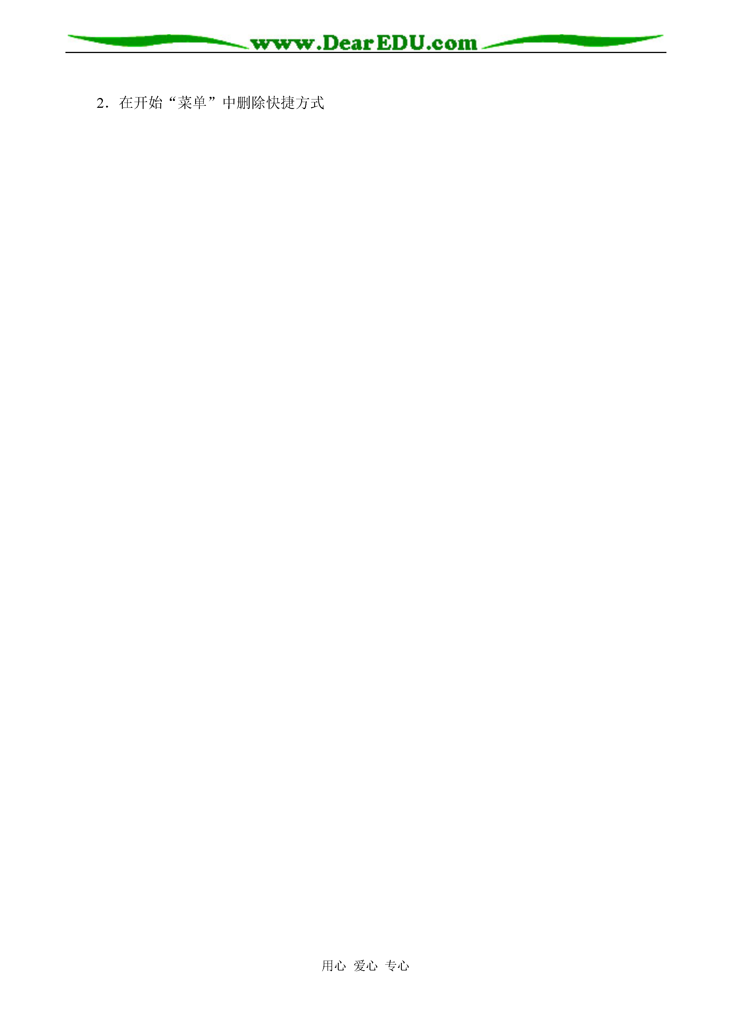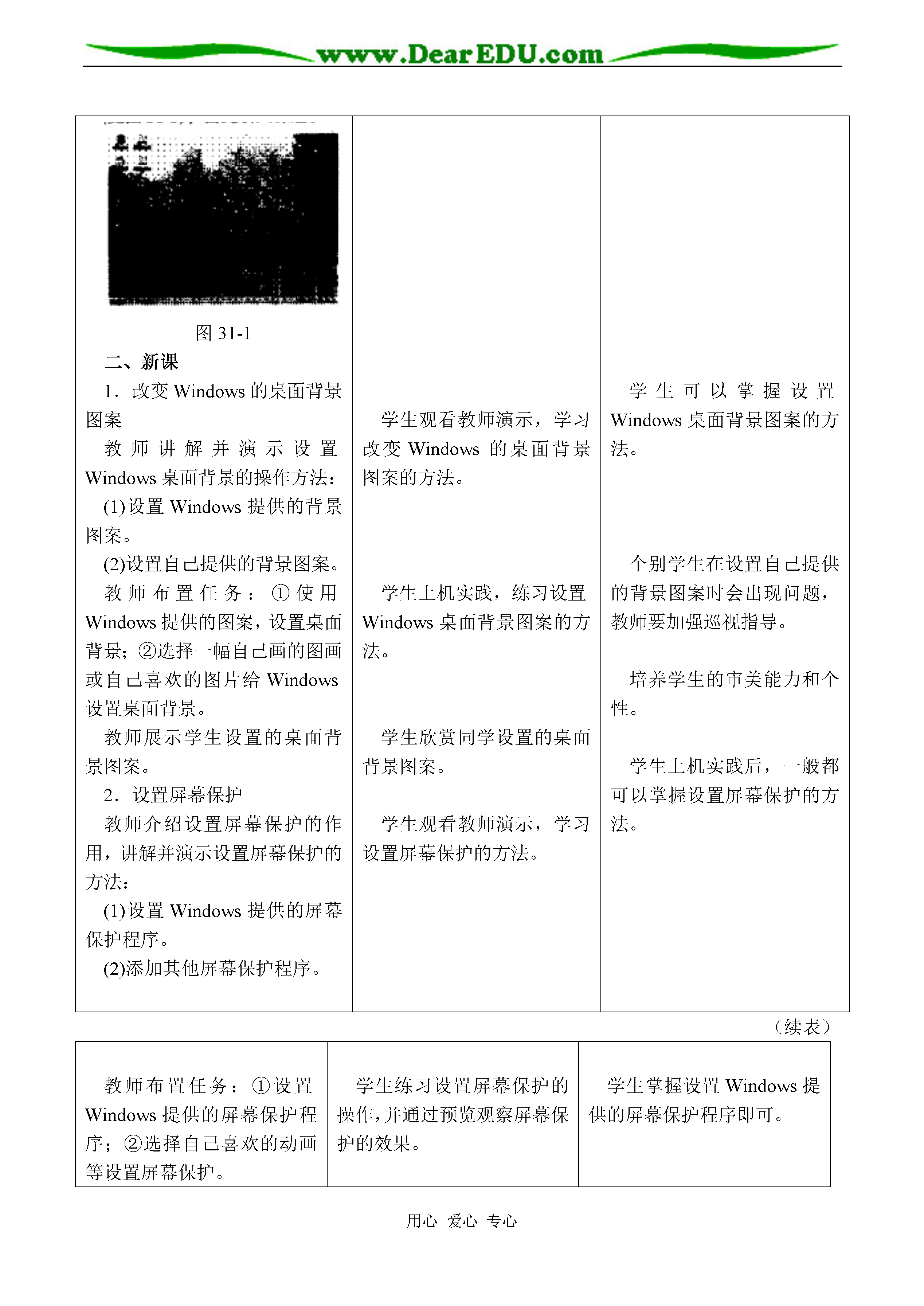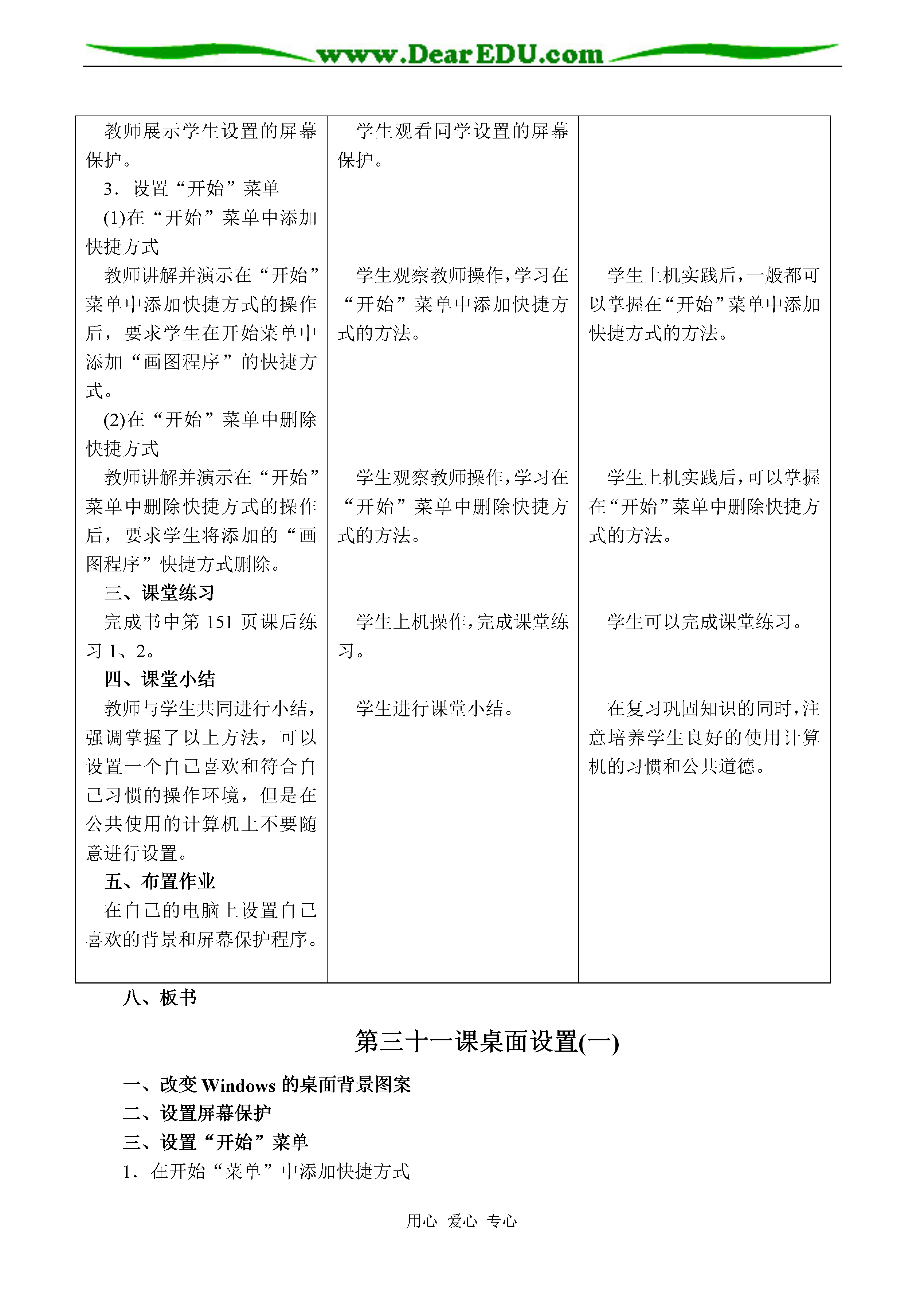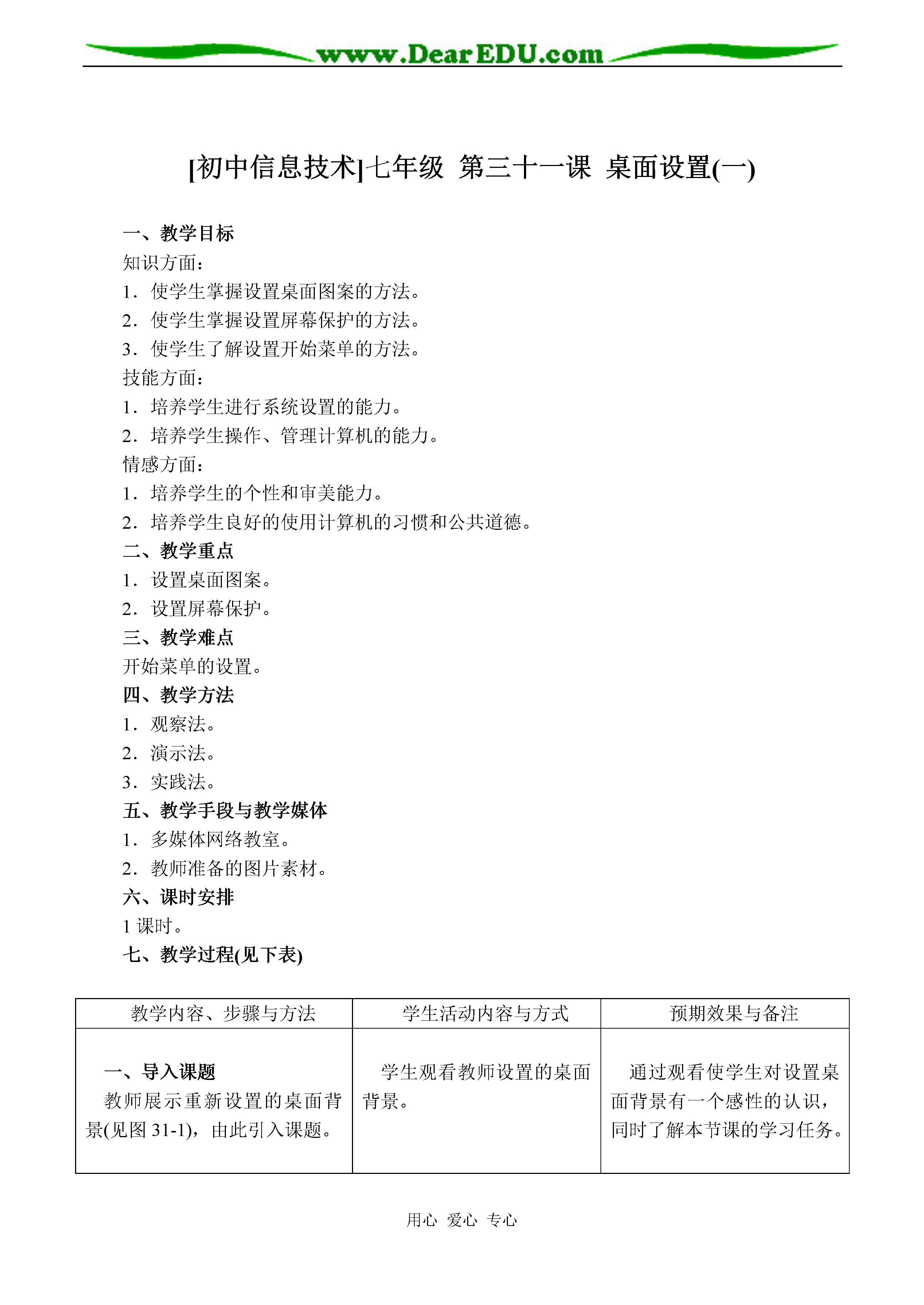 用心爱心专心[初中信息技术]七年级第三十一课桌面设置(一)一、教学目标知识方面:1.使学生掌握设置桌面图案的方法。2.使学生掌握设置屏幕保护的方法。3.使学生了解设置开始菜单的方法。技能方面:1.培养学生进行系统设置的能力。2.培养学生操作、管理计算机的能力。情感方面:1.培养学生的个性和审美能力。2.培养学生良好的使用计算机的习惯和公共道德。二、教学重点1.设置桌面图案。2.设置屏幕保护。三、教学难点开始菜单的设置。四、教学方法1.观察法。2.演示法。3.实践法。五、教学手段与教学媒体1.多媒体网络教室。2.教师准备的图片素材。六、课时安排1课时。七、教学过程(见下表)教学内容、步骤与方法学生活动内容与方式预期效果与备注一、导入课题教师展示重新设置的桌面背景(见图31-1),由此引入课题。图31-1二、新课1.改变Windows的桌面背景图案教师讲解并演示设置Windows桌面背景的操作方法:(1)设置Windows提供的背景图案。(2)设置自己提供的背景图案。教师布置任务:①使用Windows提供的图案,设置桌面背景;②选择一幅自己画的图画或自己喜欢的图片给Windows设置桌面背景。教师展示学生设置的桌面背景图案。2.设置屏幕保护教师介绍设置屏幕保护的作用,讲解并演示设置屏幕保护的方法:(1)设置Windows提供的屏幕保护程序。(2)添加其他屏幕保护程序。学生观看教师设置的桌面背景。学生观看教师演示,学习改变Windows的桌面背景图案的方法。学生上机实践,练习设置Windows桌面背景图案的方法。学生欣赏同学设置的桌面背景图案。学生观看教师演示,学习设置屏幕保护的方法。通过观看使学生对设置桌面背景有一个感性的认识,同时了解本节课的学习任务。学生可以掌握设置Windows桌面背景图案的方法。个别学生在设置自己提供的背景图案时会出现问题,教师要加强巡视指导。培养学生的审美能力和个性。学生上机实践后,一般都可以掌握设置屏幕保护的方法。(续表)教师布置任务:①设置Windows提供的屏幕保护程序;②选择自己喜欢的动画等设置屏幕保护。教师展示学生设置的屏幕保护。3.设置“开始”菜单(1)在“开始”菜单中添加快捷方式教师讲解并演示在“开始”菜单中添加快捷方式的操作后,要求学生在开始菜单中添加“画图程序”的快捷方式。(2)在“开始”菜单中删除快捷方式教师讲解并演示在“开始”菜单中删除快捷方式的操作后,要求学生将添加的“画图程序”快捷方式删除。三、课堂练习完成书中课后练习1、2。四、课堂小结教师与学生共同进行小结,强调掌握了以上方法,可以设置一个自己喜欢和符合自己习惯的操作环境,但是在公共使用的计算机上不要随意进行设置。五、布置作业在自己的电脑上设置自己喜欢的背景和屏幕保护程序。学生练习设置屏幕保护的操作,并通过预览观察屏幕保护的效果。学生观看同学设置的屏幕保护。学生观察教师操作,学习在“开始”菜单中添加快捷方式的方法。学生观察教师操作,学习在“开始”菜单中删除快捷方式的方法。学生上机操作,完成课堂练习。学生进行课堂小结。学生掌握设置Windows提供的屏幕保护程序即可。学生上机实践后,一般都可以掌握在“开始”菜单中添加快捷方式的方法。学生上机实践后,可以掌握在“开始”菜单中删除快捷方式的方法。学生可以完成课堂练习。在复习巩固知识的同时,注意培养学生良好的使用计算机的习惯和公共道德。八、板书第三十一课桌面设置(一)一、改变Windows的桌面背景图案二、设置屏幕保护三、设置“开始”菜单1.在开始“菜单”中添加快捷方式2.在开始“菜单”中删除快捷方式