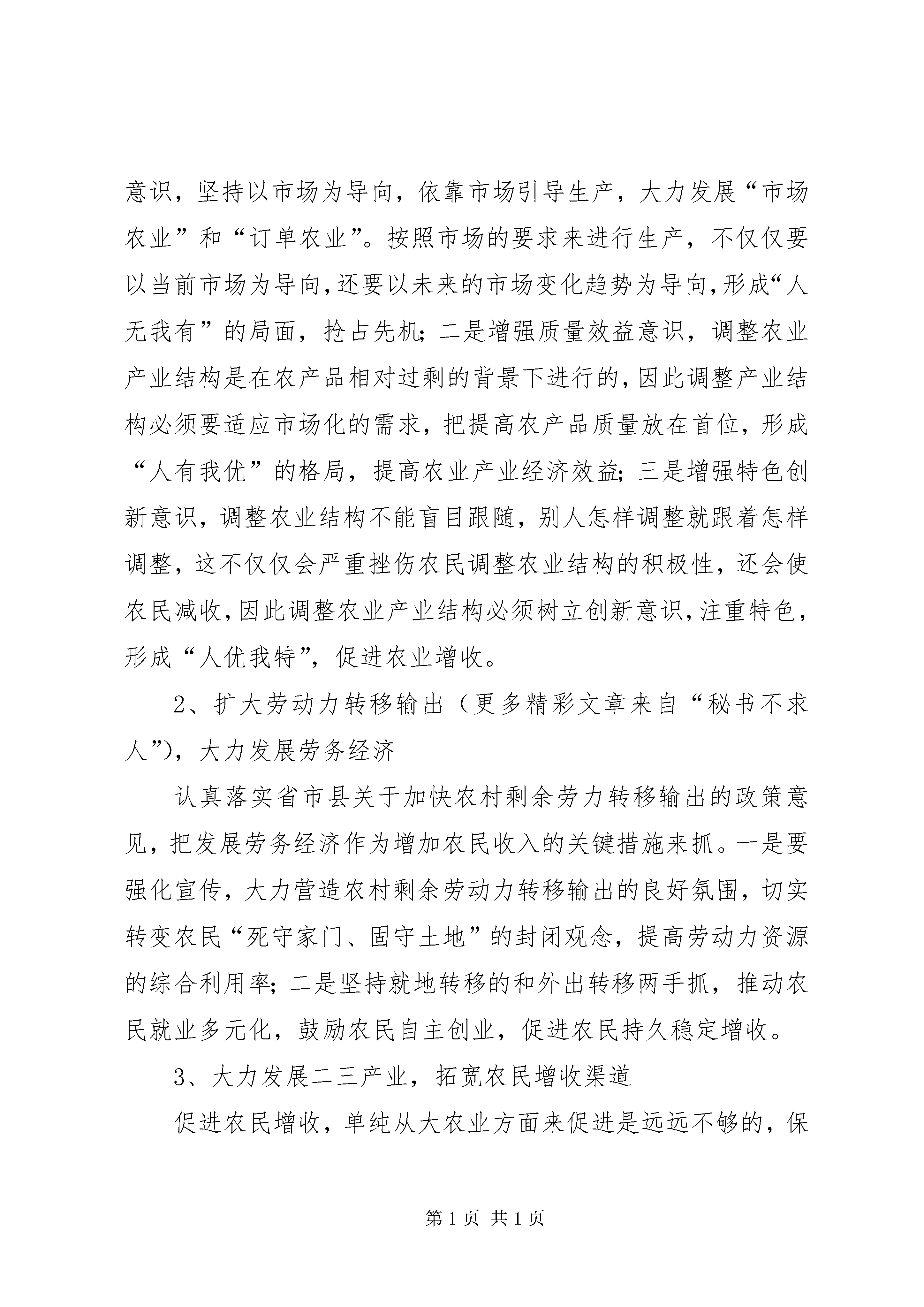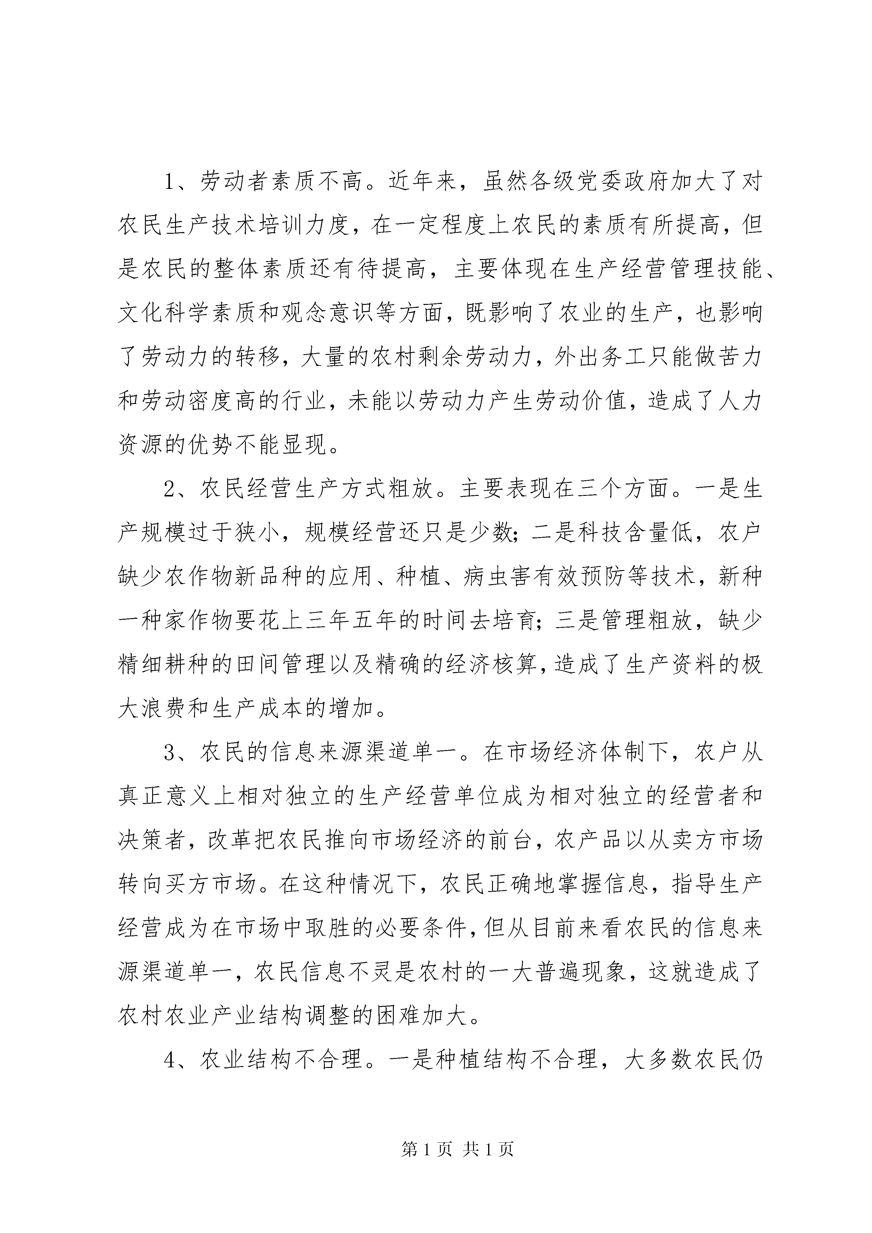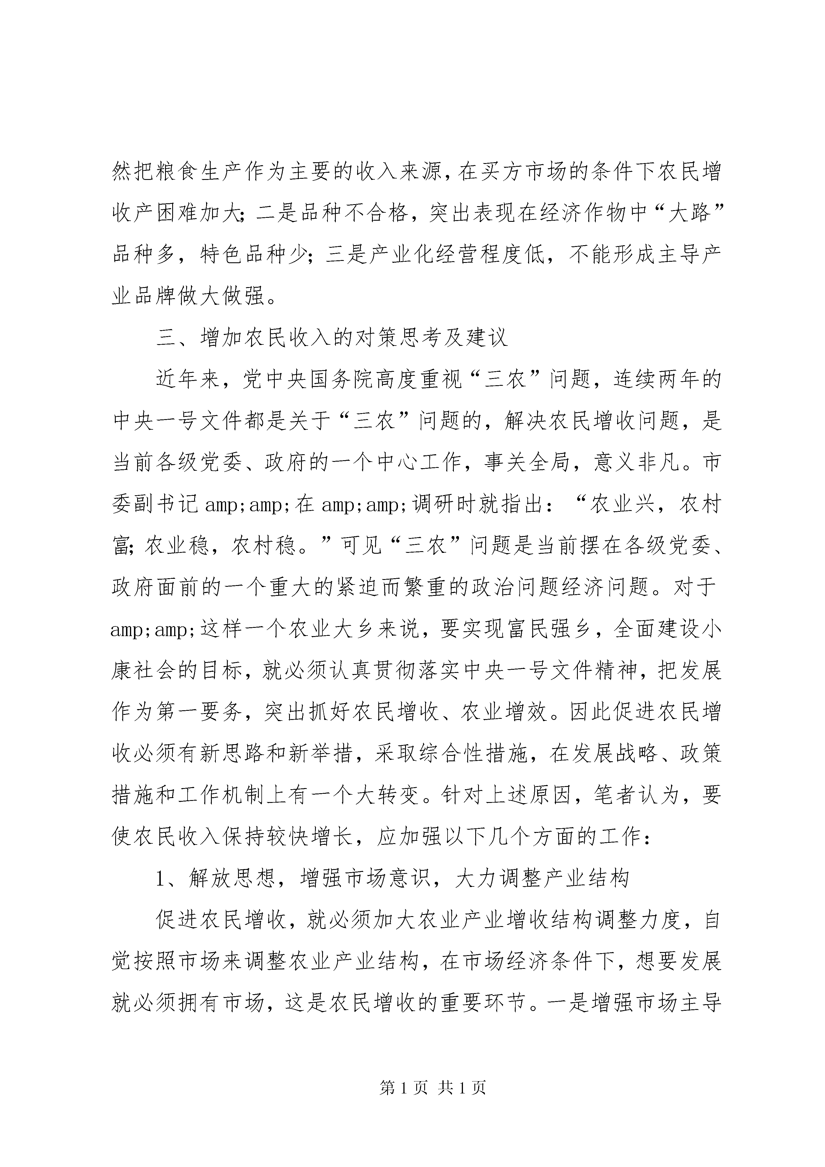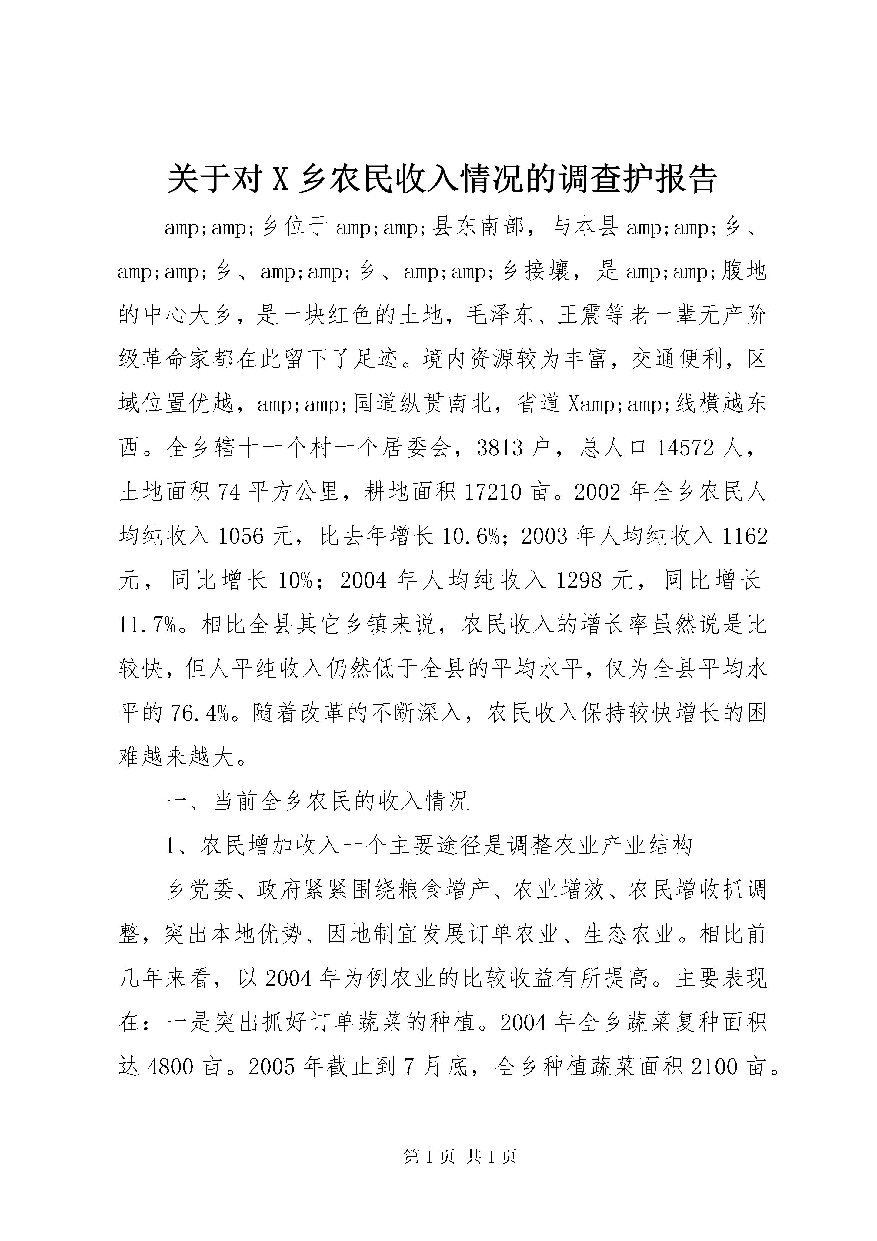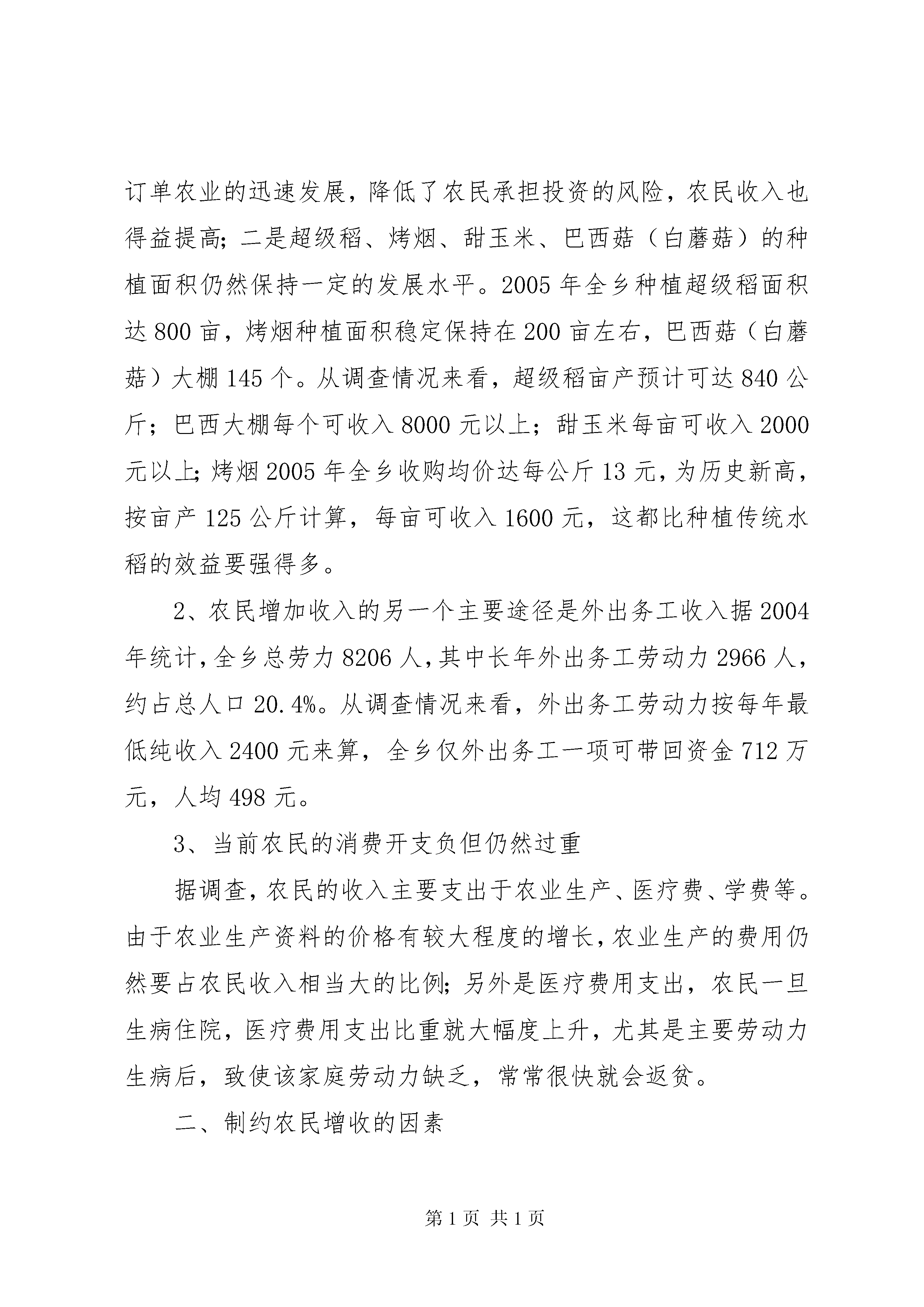 关于对X乡农民收入情况的调查护报告amp;amp;乡位于amp;amp;县东南部,与本县amp;amp;乡、amp;amp;乡、amp;amp;乡、amp;amp;乡接壤,是amp;amp;腹地的中心大乡,是一块红色的土地,毛泽东、王震等老一辈无产阶级革命家都在此留下了足迹。境内资源较为丰富,交通便利,区域位置优越,amp;amp;国道纵贯南北,省道Xamp;amp;线横越东西。全乡辖十一个村一个居委会,3813户,总人口14572人,土地面积74平方公里,耕地面积17210亩。2002年全乡农民人均纯收入1056元,比去年增长10.6%;2003年人均纯收入1162元,同比增长10%;2004年人均纯收入1298元,同比增长11.7%。相比全县其它乡镇来说,农民收入的增长率虽然说是比较快,但人平纯收入仍然低于全县的平均水平,仅为全县平均水平的76.4%。随着改革的不断深入,农民收入保持较快增长的困难越来越大。一、当前全乡农民的收入情况1、农民增加收入一个主要途径是调整农业产业结构乡党委、政府紧紧围绕粮食增产、农业增效、农民增收抓调整,突出本地优势、因地制宜发展订单农业、生态农业。相比前几年来看,以2004年为例农业的比较收益有所提高。主要表现在:一是突出抓好订单蔬菜的种植。2004年全乡蔬菜复种面积达4800亩。2005年截止到7月底,全乡种植蔬菜面积2100亩。订单农业的迅速发展,降低了农民承担投资的风险,农民收入也得益提高;二是超级稻、烤烟、甜玉米、巴西菇(白蘑菇)的种植面积仍然保持一定的发展水平。2005年全乡种植超级稻面积达800亩,烤烟种植面积稳定保持在200亩左右,巴西菇(白蘑菇)大棚145个。从调查情况来看,超级稻亩产预计可达840公斤;巴西大棚每个可收入8000元以上;甜玉米每亩可收入2000元以上;烤烟2005年全乡收购均价达每公斤13元,为历史新高,按亩产125公斤计算,每亩可收入1600元,这都比种植传统水稻的效益要强得多。2、农民增加收入的另一个主要途径是外出务工收入据2004年统计,全乡总劳力8206人,其中长年外出务工劳动力2966人,约占总人口20.4%。从调查情况来看,外出务工劳动力按每年最低纯收入2400元来算,全乡仅外出务工一项可带回资金712万元,人均498元。3、当前农民的消费开支负但仍然过重据调查,农民的收入主要支出于农业生产、医疗费、学费等。由于农业生产资料的价格有较大程度的增长,农业生产的费用仍然要占农民收入相当大的比例;另外是医疗费用支出,农民一旦生病住院,医疗费用支出比重就大幅度上升,尤其是主要劳动力生病后,致使该家庭劳动力缺乏,常常很快就会返贫。二、制约农民增收的因素1、劳动者素质不高。近年来,虽然各级党委政府加大了对农民生产技术培训力度,在一定程度上农民的素质有所提高,但是农民的整体素质还有待提高,主要体现在生产经营管理技能、文化科学素质和观念意识等方面,既影响了农业的生产,也影响了劳动力的转移,大量的农村剩余劳动力,外出务工只能做苦力和劳动密度高的行业,未能以劳动力产生劳动价值,造成了人力资源的优势不能显现。2、农民经营生产方式粗放。主要表现在三个方面。一是生产规模过于狭小,规模经营还只是少数;二是科技含量低,农户缺少农作物新品种的应用、种植、病虫害有效预防等技术,新种一种家作物要花上三年五年的时间去培育;三是管理粗放,缺少精细耕种的田间管理以及精确的经济核算,造成了生产资料的极大浪费和生产成本的增加。3、农民的信息来源渠道单一。在市场经济体制下,农户从真正意义上相对独立的生产经营单位成为相对独立的经营者和决策者,改革把农民推向市场经济的前台,农产品以从卖方市场转向买方市场。在这种情况下,农民正确地掌握信息,指导生产经营成为在市场中取胜的必要条件,但从目前来看农民的信息来源渠道单一,农民信息不灵是农村的一大普遍现象,这就造成了农村农业产业结构调整的困难加大。4、农业结构不合理。一是种植结构不合理,大多数农民仍然把粮食生产作为主要的收入来源,在买方市场的条件下农民增收产困难加大;二是品种不合格,突出表现在经济作物中“大路”品种多,特色品种少;三是产业化经营程度低,不能形成主导产业品牌做大做强。三、增加农民收入的对策思考及建议近年来,党中央国务院高度重视“三农”问题,连续两年的中央一号文件都是关于“三农”问题的,解决农民增收问题,是当前各级党委、政府的一个中心工作,事关全局,意义非凡。市委副书记amp;amp;在amp;amp;调研时就指出:“农业兴,农村富;农业稳,农村稳。”可见“三农”问题是当前摆在各级党委、政府面前的一个重大的紧迫而繁重的政治问题经济问题。对于amp;amp;这样一个农业大乡来说,要实现富民强乡,全面建设小康社会的目标,就必须