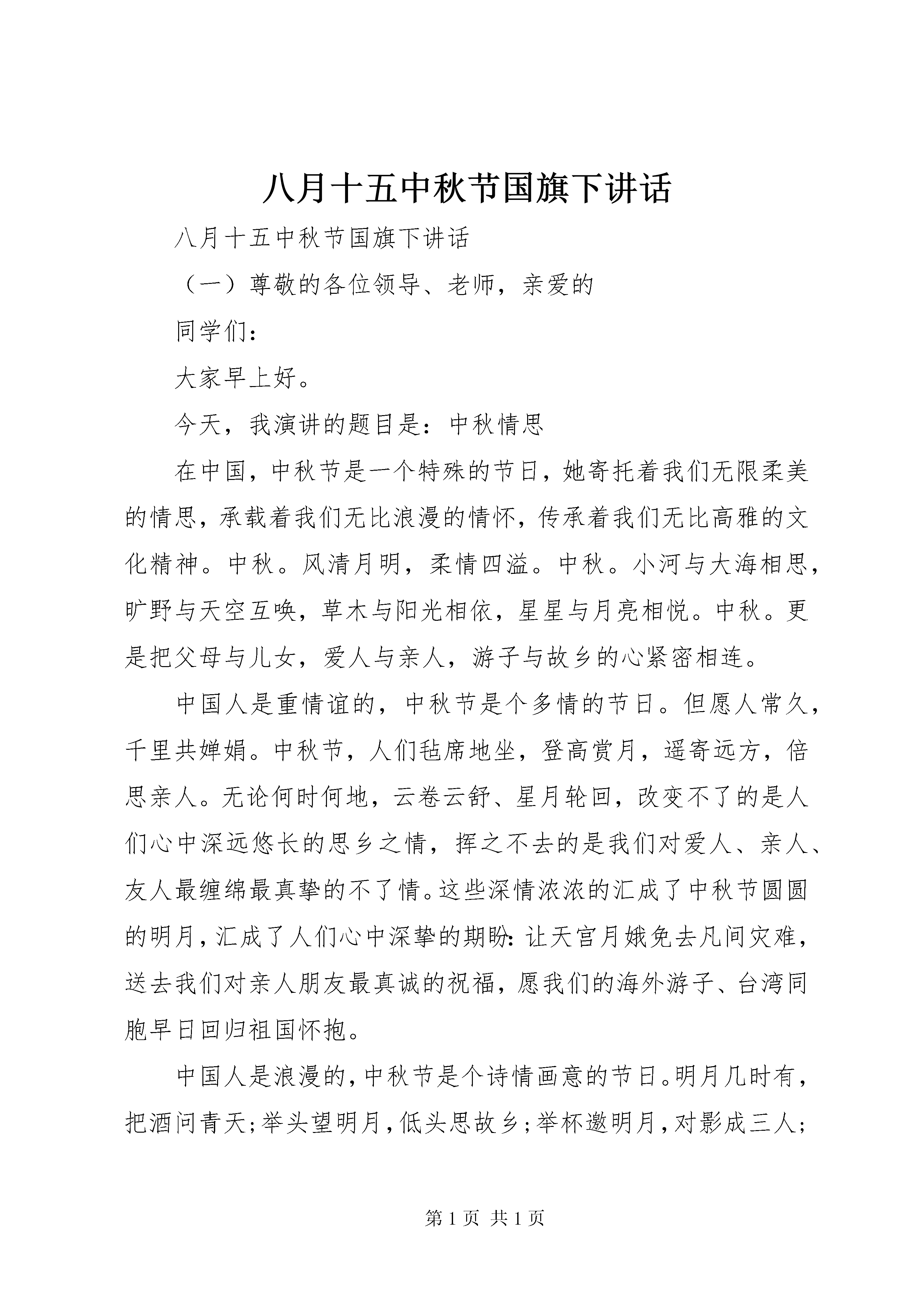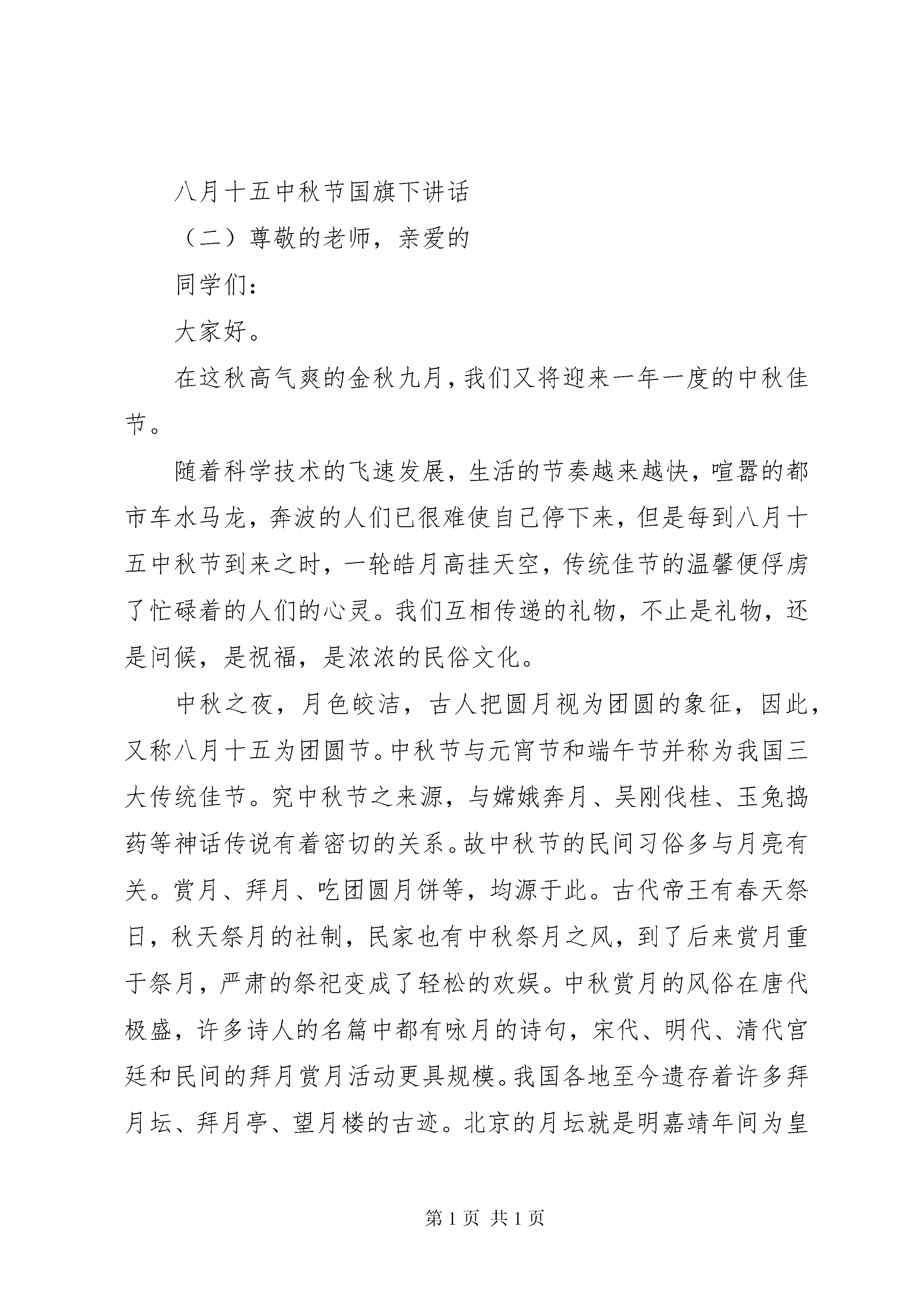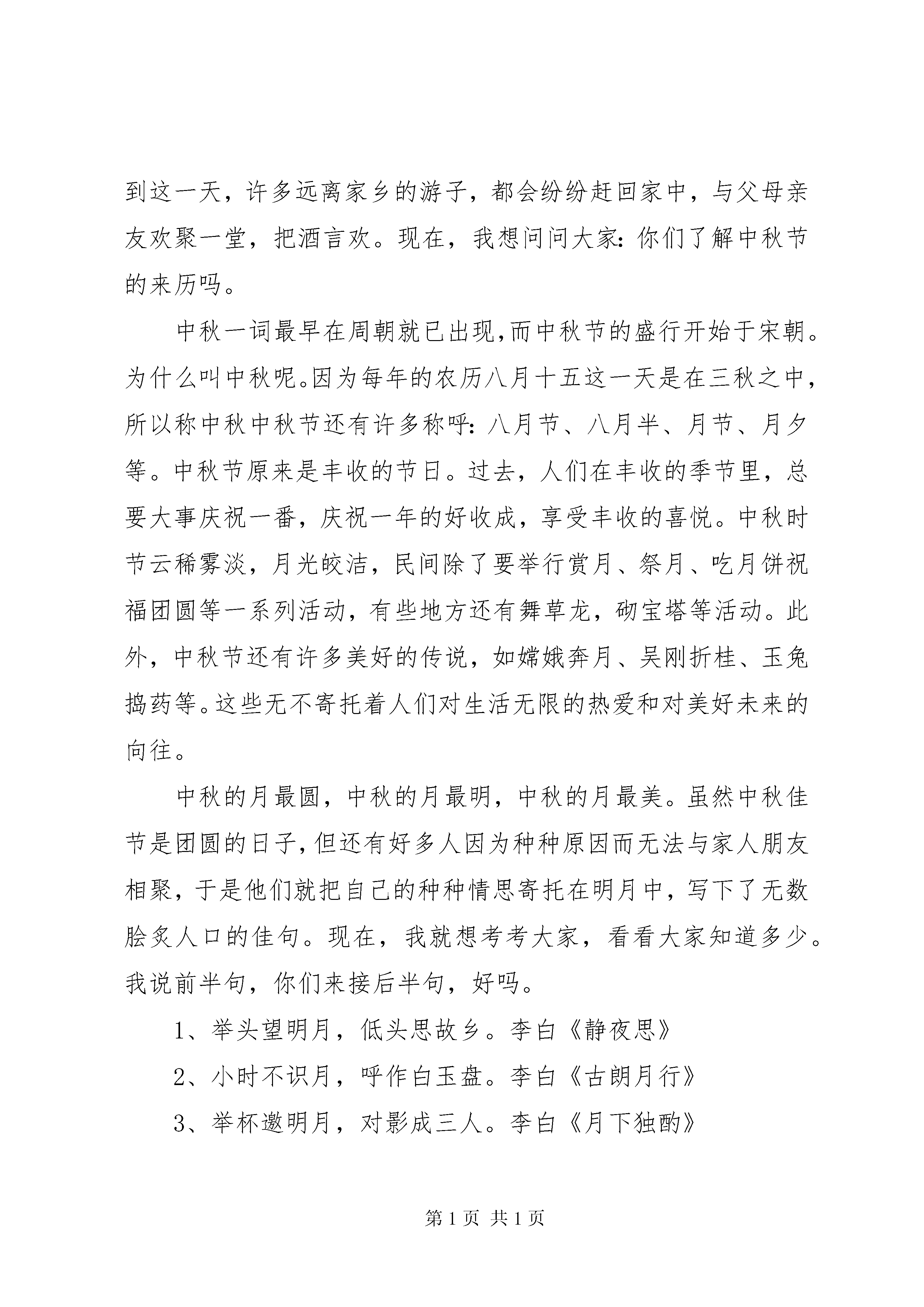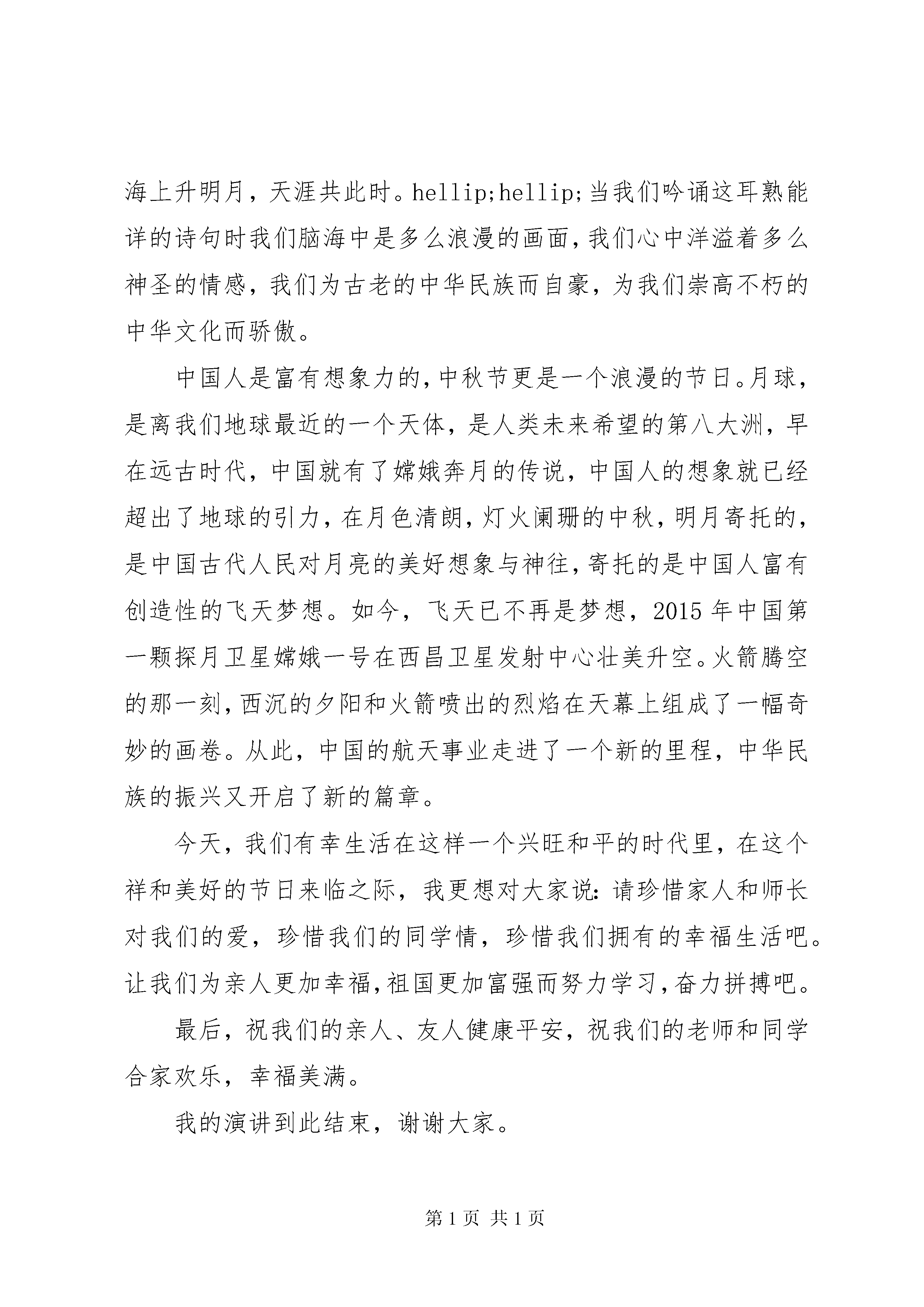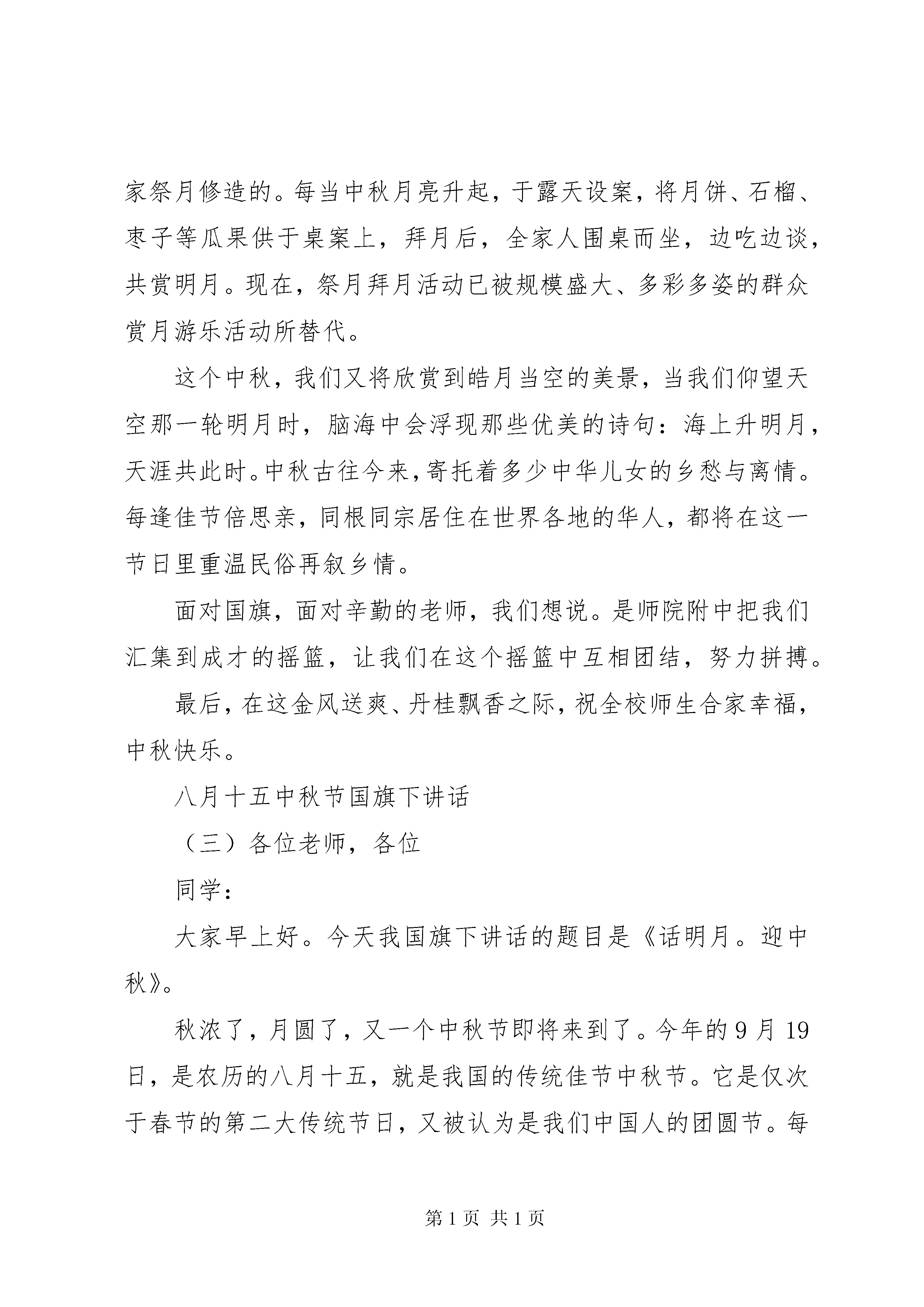 八月十五中秋节国旗下讲话八月十五中秋节国旗下讲话(一)尊敬的各位领导、老师,亲爱的同学们:大家早上好。今天,我演讲的题目是:中秋情思在中国,中秋节是一个特殊的节日,她寄托着我们无限柔美的情思,承载着我们无比浪漫的情怀,传承着我们无比高雅的文化精神。中秋。风清月明,柔情四溢。中秋。小河与大海相思,旷野与天空互唤,草木与阳光相依,星星与月亮相悦。中秋。更是把父母与儿女,爱人与亲人,游子与故乡的心紧密相连。中国人是重情谊的,中秋节是个多情的节日。但愿人常久,千里共婵娟。中秋节,人们毡席地坐,登高赏月,遥寄远方,倍思亲人。无论何时何地,云卷云舒、星月轮回,改变不了的是人们心中深远悠长的思乡之情,挥之不去的是我们对爱人、亲人、友人最缠绵最真挚的不了情。这些深情浓浓的汇成了中秋节圆圆的明月,汇成了人们心中深挚的期盼:让天宫月娥免去凡间灾难,送去我们对亲人朋友最真诚的祝福,愿我们的海外游子、台湾同胞早日回归祖国怀抱。中国人是浪漫的,中秋节是个诗情画意的节日。明月几时有,把酒问青天;举头望明月,低头思故乡;举杯邀明月,对影成三人;海上升明月,天涯共此时。hellip;hellip;当我们吟诵这耳熟能详的诗句时我们脑海中是多么浪漫的画面,我们心中洋溢着多么神圣的情感,我们为古老的中华民族而自豪,为我们崇高不朽的中华文化而骄傲。中国人是富有想象力的,中秋节更是一个浪漫的节日。月球,是离我们地球最近的一个天体,是人类未来希望的第八大洲,早在远古时代,中国就有了嫦娥奔月的传说,中国人的想象就已经超出了地球的引力,在月色清朗,灯火阑珊的中秋,明月寄托的,是中国古代人民对月亮的美好想象与神往,寄托的是中国人富有创造性的飞天梦想。如今,飞天已不再是梦想,2015年中国第一颗探月卫星嫦娥一号在西昌卫星发射中心壮美升空。火箭腾空的那一刻,西沉的夕阳和火箭喷出的烈焰在天幕上组成了一幅奇妙的画卷。从此,中国的航天事业走进了一个新的里程,中华民族的振兴又开启了新的篇章。今天,我们有幸生活在这样一个兴旺和平的时代里,在这个祥和美好的节日来临之际,我更想对大家说:请珍惜家人和师长对我们的爱,珍惜我们的同学情,珍惜我们拥有的幸福生活吧。让我们为亲人更加幸福,祖国更加富强而努力学习,奋力拼搏吧。最后,祝我们的亲人、友人健康平安,祝我们的老师和同学合家欢乐,幸福美满。我的演讲到此结束,谢谢大家。八月十五中秋节国旗下讲话(二)尊敬的老师,亲爱的同学们:大家好。在这秋高气爽的金秋九月,我们又将迎来一年一度的中秋佳节。随着科学技术的飞速发展,生活的节奏越来越快,喧嚣的都市车水马龙,奔波的人们已很难使自己停下来,但是每到八月十五中秋节到来之时,一轮皓月高挂天空,传统佳节的温馨便俘虏了忙碌着的人们的心灵。我们互相传递的礼物,不止是礼物,还是问候,是祝福,是浓浓的民俗文化。中秋之夜,月色皎洁,古人把圆月视为团圆的象征,因此,又称八月十五为团圆节。中秋节与元宵节和端午节并称为我国三大传统佳节。究中秋节之来源,与嫦娥奔月、吴刚伐桂、玉兔捣药等神话传说有着密切的关系。故中秋节的民间习俗多与月亮有关。赏月、拜月、吃团圆月饼等,均源于此。古代帝王有春天祭日,秋天祭月的社制,民家也有中秋祭月之风,到了后来赏月重于祭月,严肃的祭祀变成了轻松的欢娱。中秋赏月的风俗在唐代极盛,许多诗人的名篇中都有咏月的诗句,宋代、明代、清代宫廷和民间的拜月赏月活动更具规模。我国各地至今遗存着许多拜月坛、拜月亭、望月楼的古迹。北京的月坛就是明嘉靖年间为皇家祭月修造的。每当中秋月亮升起,于露天设案,将月饼、石榴、枣子等瓜果供于桌案上,拜月后,全家人围桌而坐,边吃边谈,共赏明月。现在,祭月拜月活动已被规模盛大、多彩多姿的群众赏月游乐活动所替代。这个中秋,我们又将欣赏到皓月当空的美景,当我们仰望天空那一轮明月时,脑海中会浮现那些优美的诗句:海上升明月,天涯共此时。中秋古往今来,寄托着多少中华儿女的乡愁与离情。每逢佳节倍思亲,同根同宗居住在世界各地的华人,都将在这一节日里重温民俗再叙乡情。面对国旗,面对辛勤的老师,我们想说。是师院附中把我们汇集到成才的摇篮,让我们在这个摇篮中互相团结,努力拼搏。最后,在这金风送爽、丹桂飘香之际,祝全校师生合家幸福,中秋快乐。八月十五中秋节国旗下讲话(三)各位老师,各位同学:大家早上好。今天我国旗下讲话的题目是《话明月。迎中秋》。秋浓了,月圆了,又一个中秋节即将来到了。今年的9月19日,是农历的八月十五,就是我国的传统佳节中秋节。它是仅次于春节的第二大传统节日,又被认为是我们中国人的团圆节。每到这一天,许多远离家乡的游子,都会纷纷赶回家中,与父母亲友欢聚一堂,把酒言欢。现在,我想问问大家:你们了解中秋节的来历吗。中秋一词最早在周朝就已出现,而中秋节的盛行开始于宋朝。为什么叫