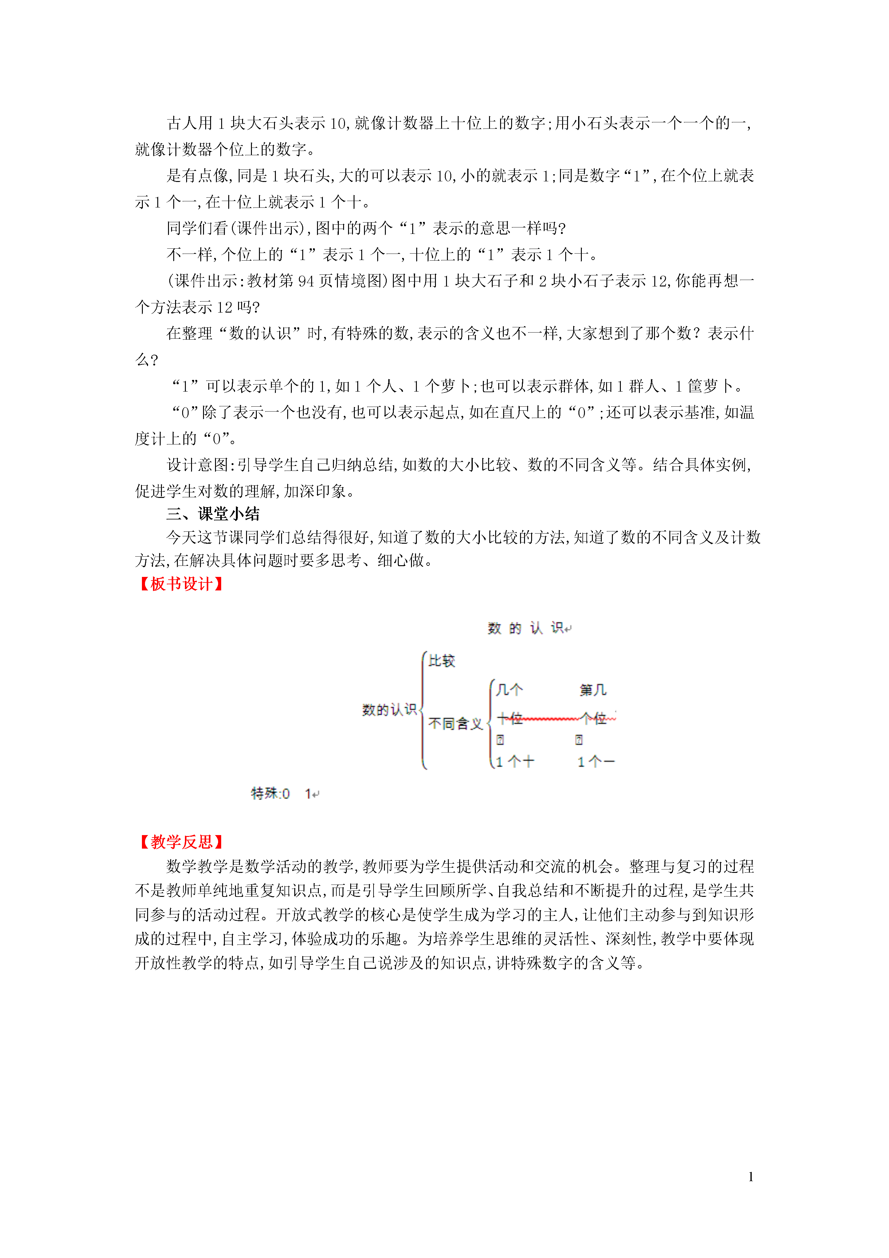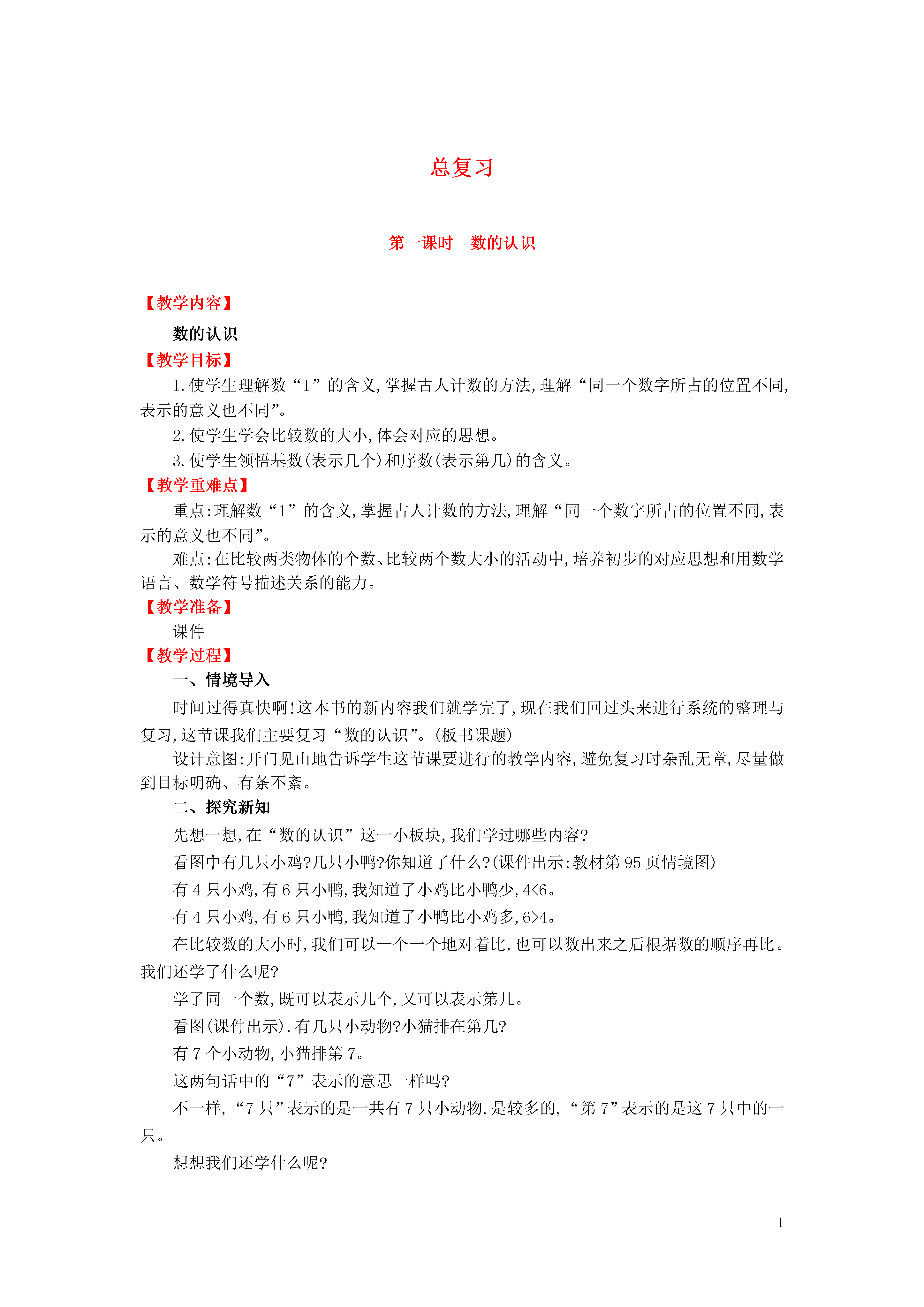 1总复习第一课时数的认识【教学内容】数的认识【教学目标】1.使学生理解数“1”的含义,掌握古人计数的方法,理解“同一个数字所占的位置不同,表示的意义也不同”。2.使学生学会比较数的大小,体会对应的思想。3.使学生领悟基数(表示几个)和序数(表示第几)的含义。【教学重难点】重点:理解数“1”的含义,掌握古人计数的方法,理解“同一个数字所占的位置不同,表示的意义也不同”。难点:在比较两类物体的个数、比较两个数大小的活动中,培养初步的对应思想和用数学语言、数学符号描述关系的能力。【教学准备】课件【教学过程】一、情境导入时间过得真快啊!这本书的新内容我们就学完了,现在我们回过头来进行系统的整理与复习,这节课我们主要复习“数的认识”。(板书课题)设计意图:开门见山地告诉学生这节课要进行的教学内容,避免复习时杂乱无章,尽量做到目标明确、有条不紊。二、探究新知先想一想,在“数的认识”这一小板块,我们学过哪些内容?看图中有几只小鸡?几只小鸭?你知道了什么?(课件出示:教材情境图)有4只小鸡,有6只小鸭,我知道了小鸡比小鸭少,4<6。有4只小鸡,有6只小鸭,我知道了小鸭比小鸡多,6>4。在比较数的大小时,我们可以一个一个地对着比,也可以数出来之后根据数的顺序再比。我们还学了什么呢?学了同一个数,既可以表示几个,又可以表示第几。看图(课件出示),有几只小动物?小猫排在第几?有7个小动物,小猫排第7。这两句话中的“7”表示的意思一样吗?不一样,“7只”表示的是一共有7只小动物,是较多的,“第7”表示的是这7只中的一只。想想我们还学什么呢?古人用1块大石头表示10,就像计数器上十位上的数字;用小石头表示一个一个的一,就像计数器个位上的数字。是有点像,同是1块石头,大的可以表示10,小的就表示1;同是数字“1”,在个位上就表示1个一,在十位上就表示1个十。同学们看(课件出示),图中的两个“1”表示的意思一样吗?不一样,个位上的“1”表示1个一,十位上的“1”表示1个十。(课件出示:教材情境图)图中用1块大石子和2块小石子表示12,你能再想一个方法表示12吗?在整理“数的认识”时,有特殊的数,表示的含义也不一样,大家想到了那个数?表示什么?“1”可以表示单个的1,如1个人、1个萝卜;也可以表示群体,如1群人、1筐萝卜。“0”除了表示一个也没有,也可以表示起点,如在直尺上的“0”;还可以表示基准,如温度计上的“0”。设计意图:引导学生自己归纳总结,如数的大小比较、数的不同含义等。结合具体实例,促进学生对数的理解,加深印象。三、课堂小结今天这节课同学们总结得很好,知道了数的大小比较的方法,知道了数的不同含义及计数方法,在解决具体问题时要多思考、细心做。【板书设计】【教学反思】数学教学是数学活动的教学,教师要为学生提供活动和交流的机会。整理与复习的过程不是教师单纯地重复知识点,而是引导学生回顾所学、自我总结和不断提升的过程,是学生共同参与的活动过程。开放式教学的核心是使学生成为学习的主人,让他们主动参与到知识形成的过程中,自主学习,体验成功的乐趣。为培养学生思维的灵活性、深刻性,教学中要体现开放性教学的特点,如引导学生自己说涉及的知识点,讲特殊数字的含义等。