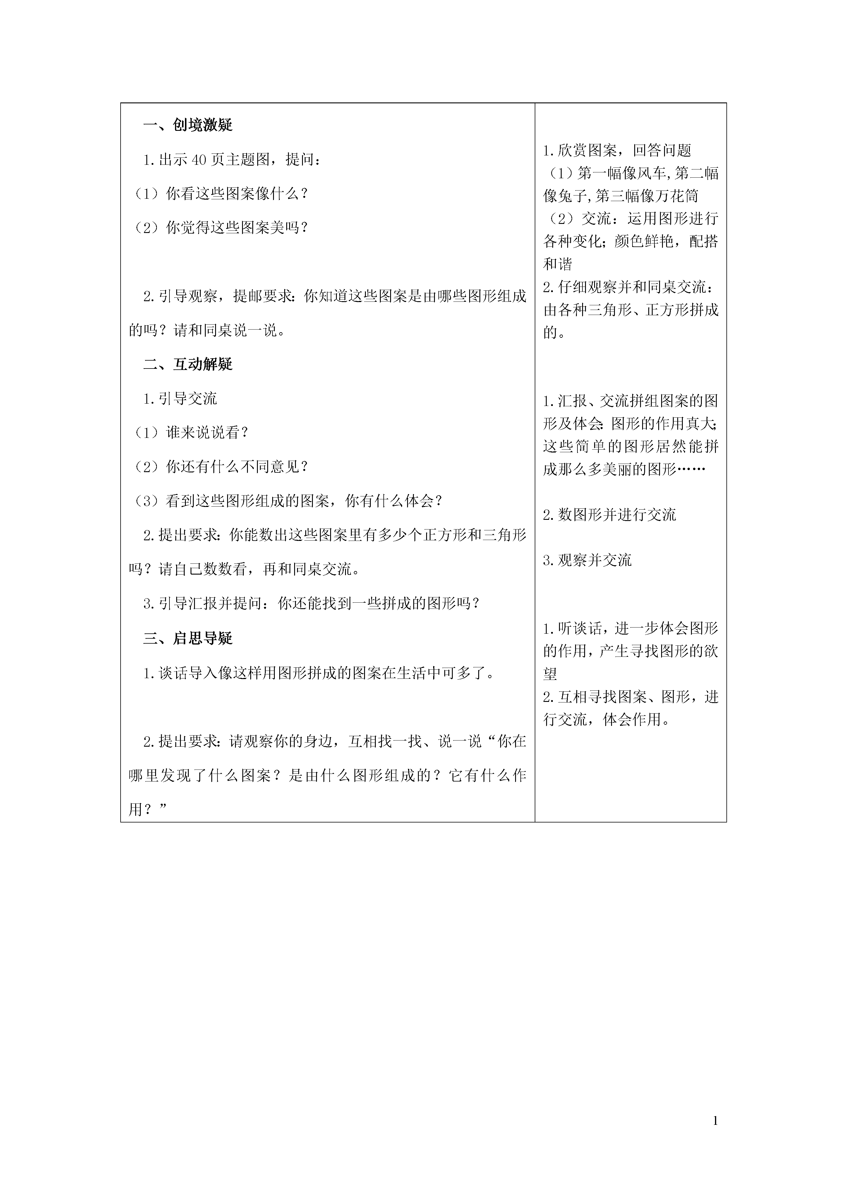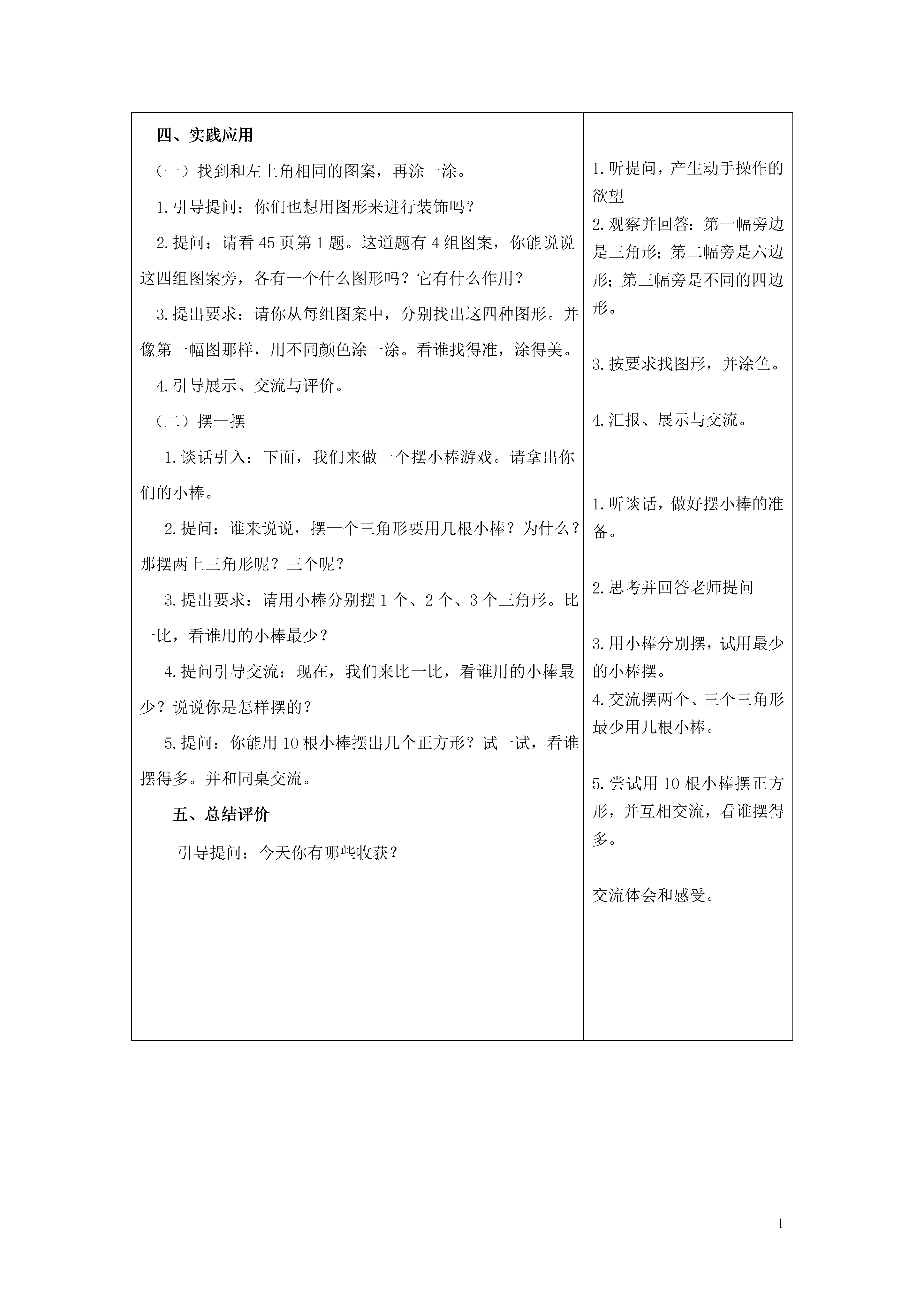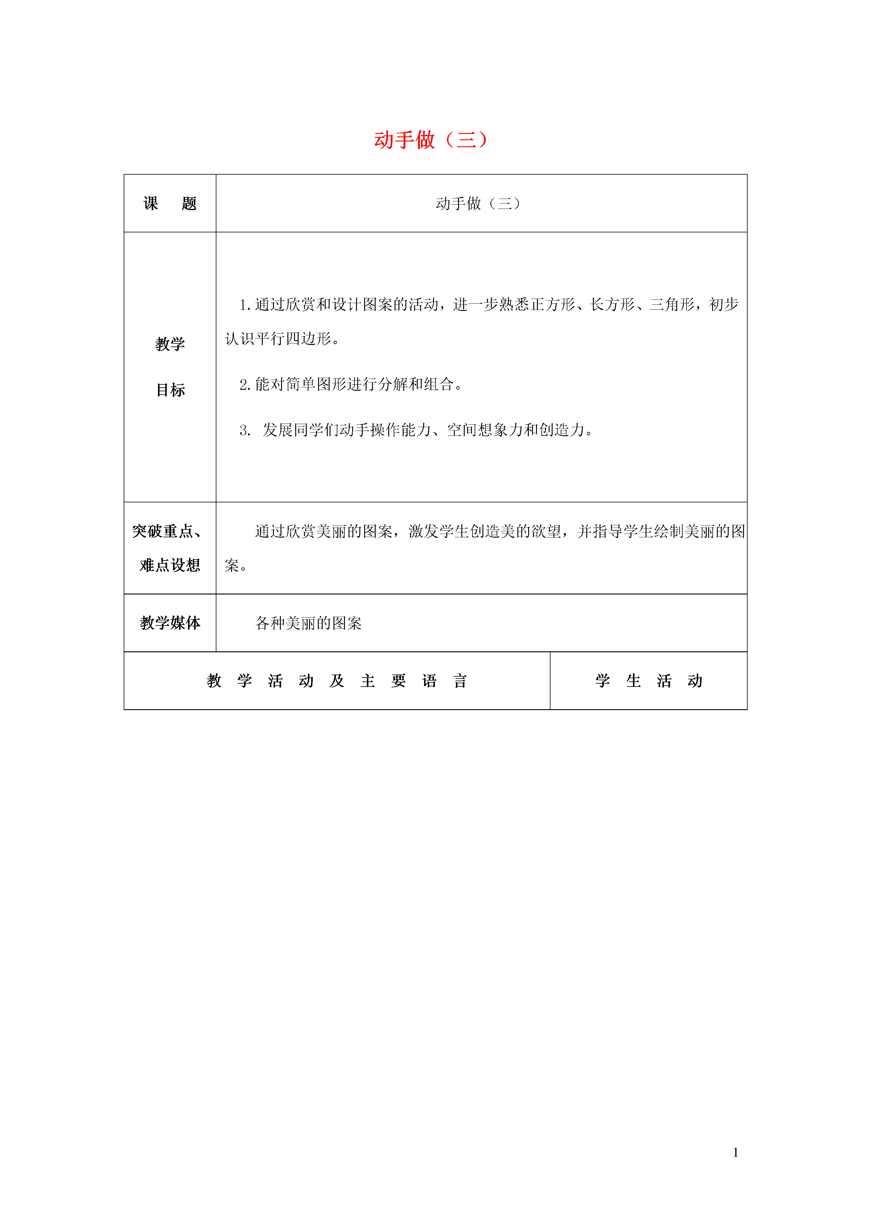1动手做(一)课题:动手做(一)教学目标:1.通过在钉板上围图形的活动,进一步认识正方形、长方形、三角形,认识四边形、五边形、六边形。2.发展同学们动手操作能力、空间想象力和创造力。教学重点:进一步认识平面图形。教学难点:发展学生的空间能力课前准备:钉子板教学过程:一、复习:活动:每组一个纸袋,里面装各种图形的纸片,找出学过的图形。二、展开:1.师:这些图形不但可以用纸剪出来,还可以在钉子板上围出来呢。今天我们就来研究“钉子板上的图形”。2.分工围出不同的图形,展示。3.讨论:又什么发现?4.数数长方形、正方形有几条边?小结:长方形和正方形都有四条边。5.反问:是不是有四条边的图形一定是长方形或正方形呢?动手试一试,展示。(引导数边)6.小结:原来还有很多图形都有四条边,你能给它们起一个共同的名字吗?(四边形)7.三角形是四边形吗?8.你还能围出其他图形吗?(各自围,展示,数边,小结:五边形、六边形)小结:其实钉子板上还可以围出边数更多的图形。三、拓展练习:1.照样子围一围。(1)基本图形(2)图案2.P39第2题板书设计:动手做(一)1《回收废品》教学目标:巩固认识三角形、圆、长方形和正方形。培养良好的动手实践能力。教学重、难点:动手实践操作。课时安排:1课时课前准备:1、图片;2、钉子板;3、橡皮筋。教学过程:指导操作介绍钉子板给你橡皮筋,你能在钉子板上围出图形吗?动手试一试介绍你的围法有别的不同的围法也可以介绍一下展示作品评议试一试围出四边形,五边形提问:下面的图形有几条边?你能围出来吗?你还能围出一个六边形吗?练一练动手围一围模仿图案画一画看一看,说说每个图案像什么试一试,围出你最喜欢的图案。1动手做(三)课题动手做(三)教学目标1.通过欣赏和设计图案的活动,进一步认识正方形、长方形、三角形和圆。2.发展空间观念、动手操作能力和创造力。3.培养学生的数学情感和创新意识。教学重点难点教学重点:能从图案中分离出平面图形,经历从具体到抽象的过程,进一步认识图形特征。教学难点:培养学生的数学情感和创新意识。教学过程课前三分钟口算训练。一、复习导入。1.教师出示正方形、长方形、三角形,请学生说说它们的名称。2.教师启发:人们利用这些图形可以创造和组合成许多美丽的、有趣的图案!它们会使我们的生活变得更加地美好和丰富。二、欣赏图案。1.出示事先准备好的图案。2.欣赏书上的图案。请小朋友们把数学书翻到44页,那里有好几幅美丽的图案,我们一起欣赏它们吧!依次出示每一幅图,请学生观察欣赏,并给每一幅图起一个合适的名称。师:小朋友们的想象力真好,像插上了翅膀一样,快要飞起来了。这么美的图案,它们是由哪些图形组成的呢?让学生自由讨论、交流。集体交流时,让学生指着图形说哪些是三角形,哪些是正方形和长方形。师:生活中还有许多的图形组成的图案,小朋友可以回家中去找一找,相信你能把它们找出来。3.数学万花筒。生活中,人们经常利用图形来编织美丽的图案。出示两幅图,让学生说一说它们美在什么地方?三、练一练。让学生完成练一练的第1、2题。学生如果有困难,可以进行适当的指导;合理的,都应给予肯定和表扬。四、全课总结。希望同学们在课外能继续设计出美丽的图案,扮亮我们的生活。1动手做(三)课题动手做(三)教学目标1.通过欣赏和设计图案的活动,进一步熟悉正方形、长方形、三角形,初步认识平行四边形。2.能对简单图形进行分解和组合。3.发展同学们动手操作能力、空间想象力和创造力。突破重点、难点设想通过欣赏美丽的图案,激发学生创造美的欲望,并指导学生绘制美丽的图案。教学媒体各种美丽的图案教学活动及主要语言学生活动一、创境激疑1.出示40页主题图,提问:(1)你看这些图案像什么?(2)你觉得这些图案美吗?2.引导观察,提邮要求:你知道这些图案是由哪些图形组成的吗?请和同桌说一说。二、互动解疑1.引导交流(1)谁来说说看?(2)你还有什么不同意见?(3)看到这些图形组成的图案,你有什么体会?2.提出要求:你能数出这些图案里有多少个正方形和三角形吗?请自己数数看,再和同桌交流。3.引导汇报并提问:你还能找到一些拼成的图形吗?三、启思导疑1.谈话导入像这样用图形拼成的图案在生活中可多了。2.提出要求:请观察你的身边,互相找一找、说一说“你在哪里发现了什么图案?是由什么图形组成的?它有什么作用?”1.欣赏图案,回答问题(1)第一幅像风车,第二幅像兔子,第三幅像万花筒(2)交流:运用图形进行各种变化;颜色鲜艳,配搭