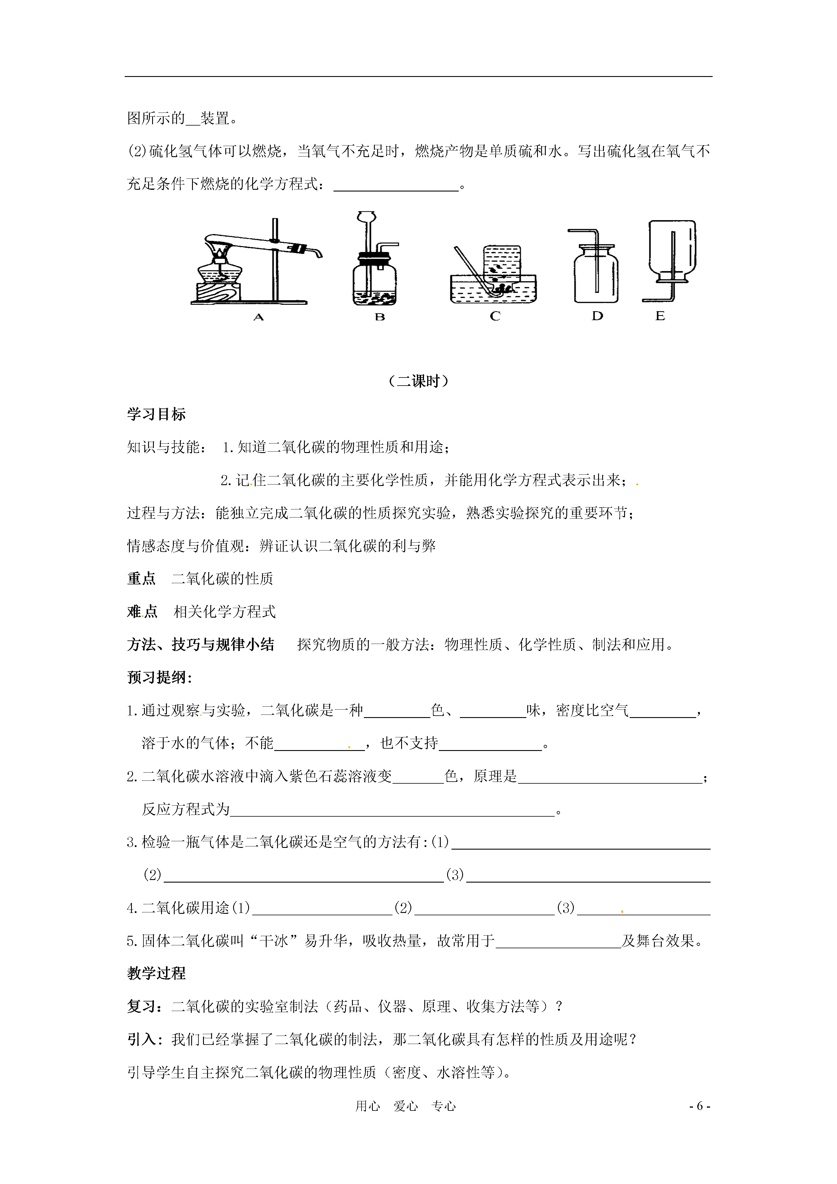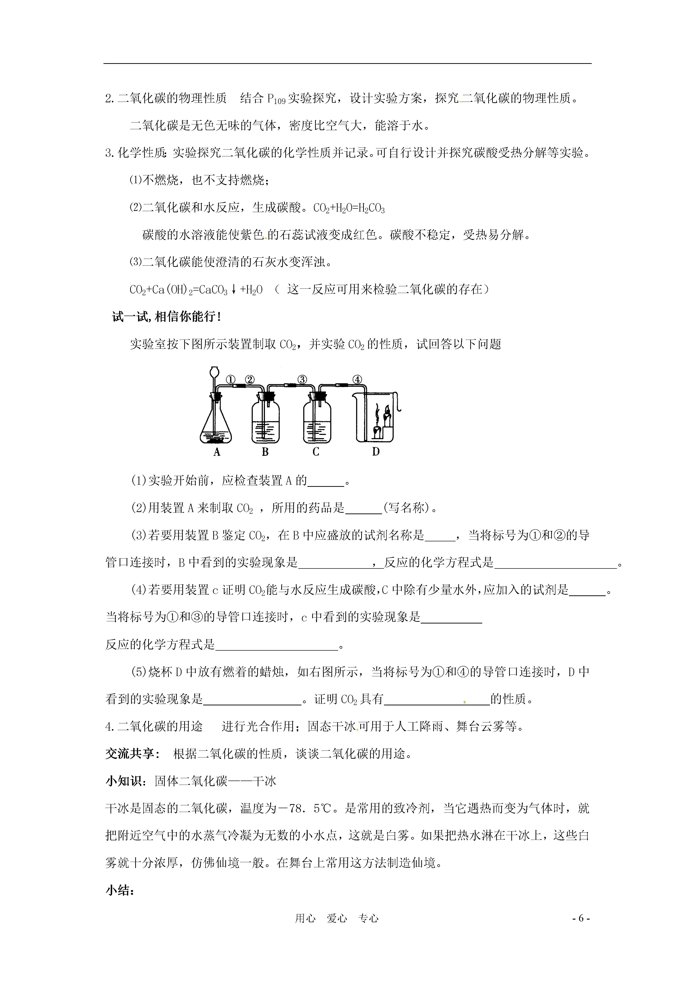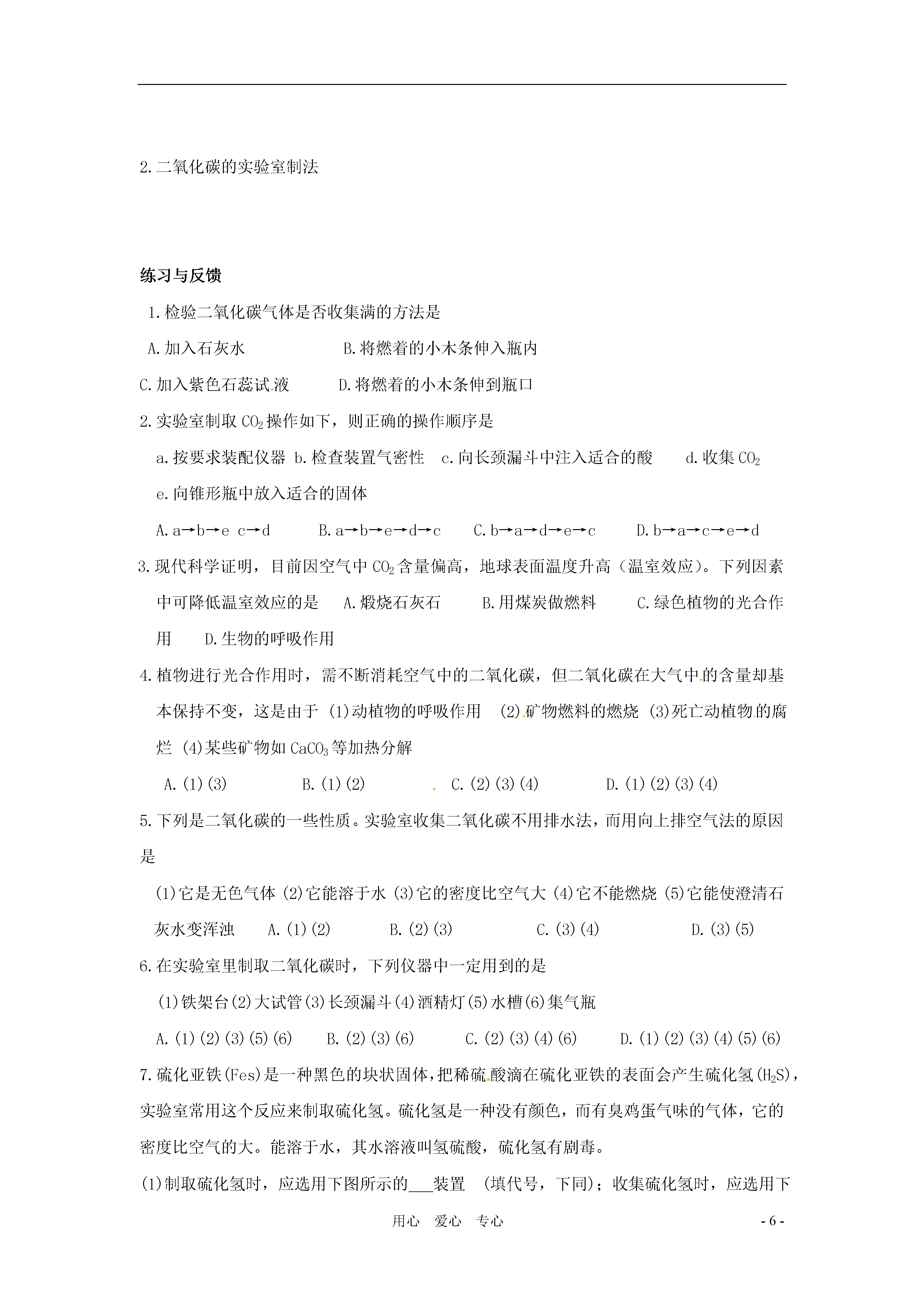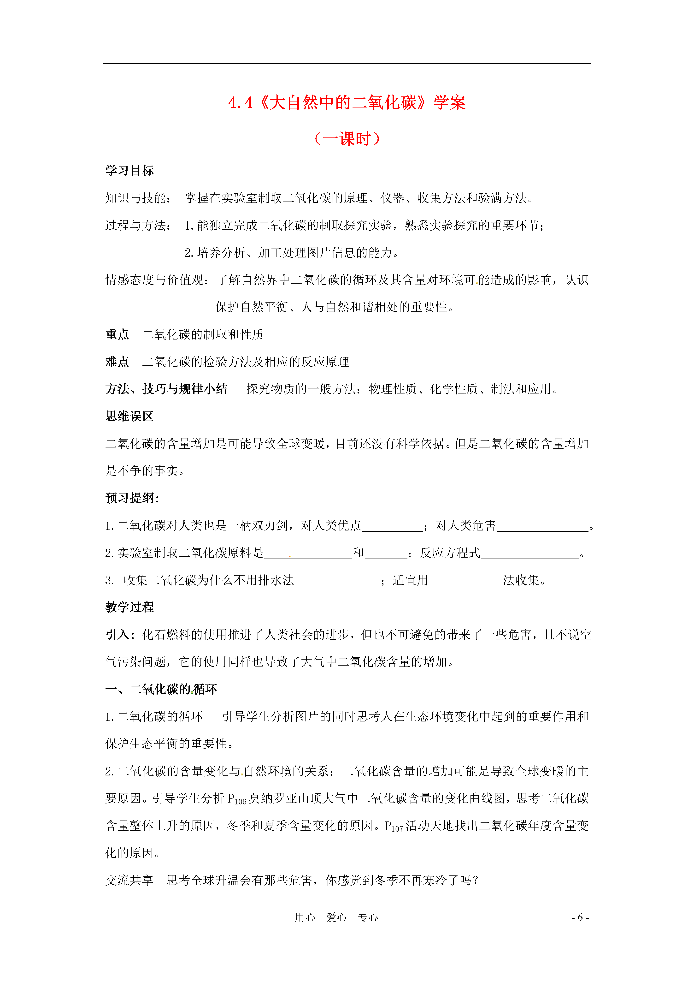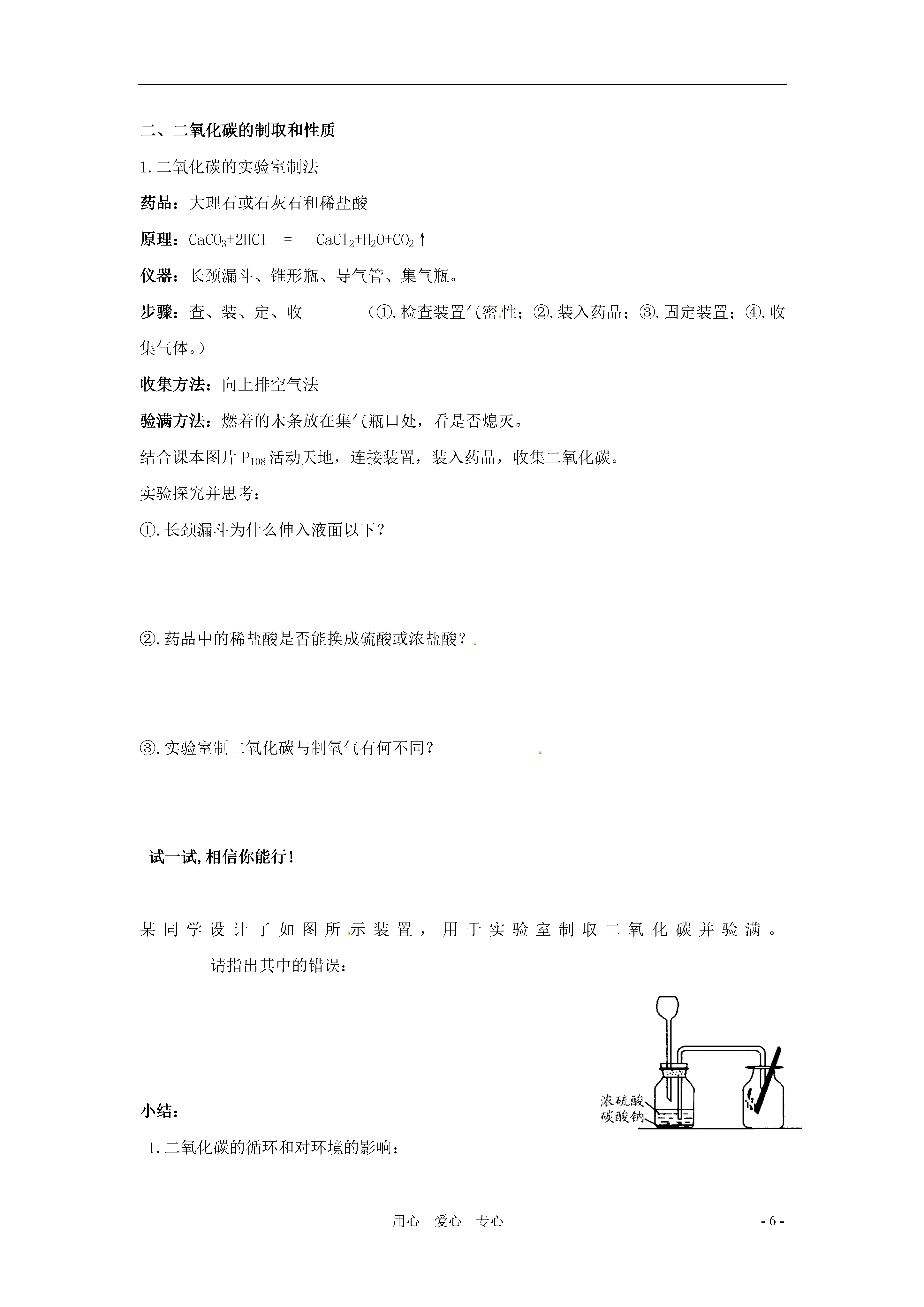 -6-用心爱心专心4.4《大自然中的二氧化碳》学案(一课时)学习目标知识与技能:掌握在实验室制取二氧化碳的原理、仪器、收集方法和验满方法。过程与方法:1.能独立完成二氧化碳的制取探究实验,熟悉实验探究的重要环节;2.培养分析、加工处理图片信息的能力。情感态度与价值观:了解自然界中二氧化碳的循环及其含量对环境可能造成的影响,认识保护自然平衡、人与自然和谐相处的重要性。重点二氧化碳的制取和性质难点二氧化碳的检验方法及相应的反应原理方法、技巧与规律小结探究物质的一般方法:物理性质、化学性质、制法和应用。思维误区二氧化碳的含量增加是可能导致全球变暖,目前还没有科学依据。但是二氧化碳的含量增加是不争的事实。预习提纲:1.二氧化碳对人类也是一柄双刃剑,对人类优点;对人类危害。2.实验室制取二氧化碳原料是和;反应方程式。3.收集二氧化碳为什么不用排水法;适宜用法收集。教学过程引入:化石燃料的使用推进了人类社会的进步,但也不可避免的带来了一些危害,且不说空气污染问题,它的使用同样也导致了大气中二氧化碳含量的增加。一、二氧化碳的循环1.二氧化碳的循环引导学生分析图片的同时思考人在生态环境变化中起到的重要作用和保护生态平衡的重要性。2.二氧化碳的含量变化与自然环境的关系:二氧化碳含量的增加可能是导致全球变暖的主要原因。引导学生分析P106莫纳罗亚山顶大气中二氧化碳含量的变化曲线图,思考二氧化碳含量整体上升的原因,冬季和夏季含量变化的原因。P107活动天地找出二氧化碳年度含量变化的原因。交流共享思考全球升温会有那些危害,你感觉到冬季不再寒冷了吗?二、二氧化碳的制取和性质1.二氧化碳的实验室制法药品:大理石或石灰石和稀盐酸原理:CaCO3+2HCl=CaCl2+H2O+CO2↑仪器:长颈漏斗、锥形瓶、导气管、集气瓶。步骤:查、装、定、收(①.检查装置气密性;②.装入药品;③.固定装置;④.收集气体。)收集方法:向上排空气法验满方法:燃着的木条放在集气瓶口处,看是否熄灭。结合课本图片P108活动天地,连接装置,装入药品,收集二氧化碳。实验探究并思考:①.长颈漏斗为什么伸入液面以下?②.药品中的稀盐酸是否能换成硫酸或浓盐酸?③.实验室制二氧化碳与制氧气有何不同?试一试,相信你能行!某同学设计了如图所示装置,用于实验室制取二氧化碳并验满。请指出其中的错误:小结:1.二氧化碳的循环和对环境的影响;2.二氧化碳的实验室制法练习与反馈1.检验二氧化碳气体是否收集满的方法是A.加入石灰水B.将燃着的小木条伸入瓶内C.加入紫色石蕊试液D.将燃着的小木条伸到瓶口2.实验室制取CO2操作如下,则正确的操作顺序是a.按要求装配仪器b.检查装置气密性c.向长颈漏斗中注入适合的酸d.收集CO2e.向锥形瓶中放入适合的固体A.a→b→ec→dB.a→b→e→d→cC.b→a→d→e→cD.b→a→c→e→d3.现代科学证明,目前因空气中CO2含量偏高,地球表面温度升高(温室效应)。下列因素中可降低温室效应的是A.煅烧石灰石B.用煤炭做燃料C.绿色植物的光合作用D.生物的呼吸作用4.植物进行光合作用时,需不断消耗空气中的二氧化碳,但二氧化碳在大气中的含量却基本保持不变,这是由于(1)动植物的呼吸作用(2)矿物燃料的燃烧(3)死亡动植物的腐烂(4)某些矿物如CaCO3等加热分解A.(1)(3)B.(1)(2)C.(2)(3)(4)D.(1)(2)(3)(4)5.下列是二氧化碳的一些性质。实验室收集二氧化碳不用排水法,而用向上排空气法的原因是(1)它是无色气体(2)它能溶于水(3)它的密度比空气大(4)它不能燃烧(5)它能使澄清石灰水变浑浊A.(1)(2)B.(2)(3)C.(3)(4)D.(3)(5)6.在实验室里制取二氧化碳时,下列仪器中一定用到的是(1)铁架台(2)大试管(3)长颈漏斗(4)酒精灯(5)水槽(6)集气瓶A.(1)(2)(3)(5)(6)B.(2)(3)(6)C.(2)(3)(4)(6)D.(1)(2)(3)(4)(5)(6)7.硫化亚铁(Fes)是一种黑色的块状固体,把稀硫酸滴在硫化亚铁的表面会产生硫化氢(H2S),实验室常用这个反应来制取硫化氢。硫化氢是一种没有颜色,而有臭鸡蛋气味的气体,它的密度比空气的大。能溶于水,其水溶液叫氢硫酸,硫化氢有剧毒。(1)制取硫化氢时,应选用下图所示的装置(填代号,下同);收集硫化氢时,应选用下图所示的装置。(2)硫化氢气体可以燃烧,当氧气不充足时,燃烧产物是单质硫和水。写出硫化氢在氧气不充足条件下燃烧的化学方程式:。(二课时)学习目标知识与技能:1.知