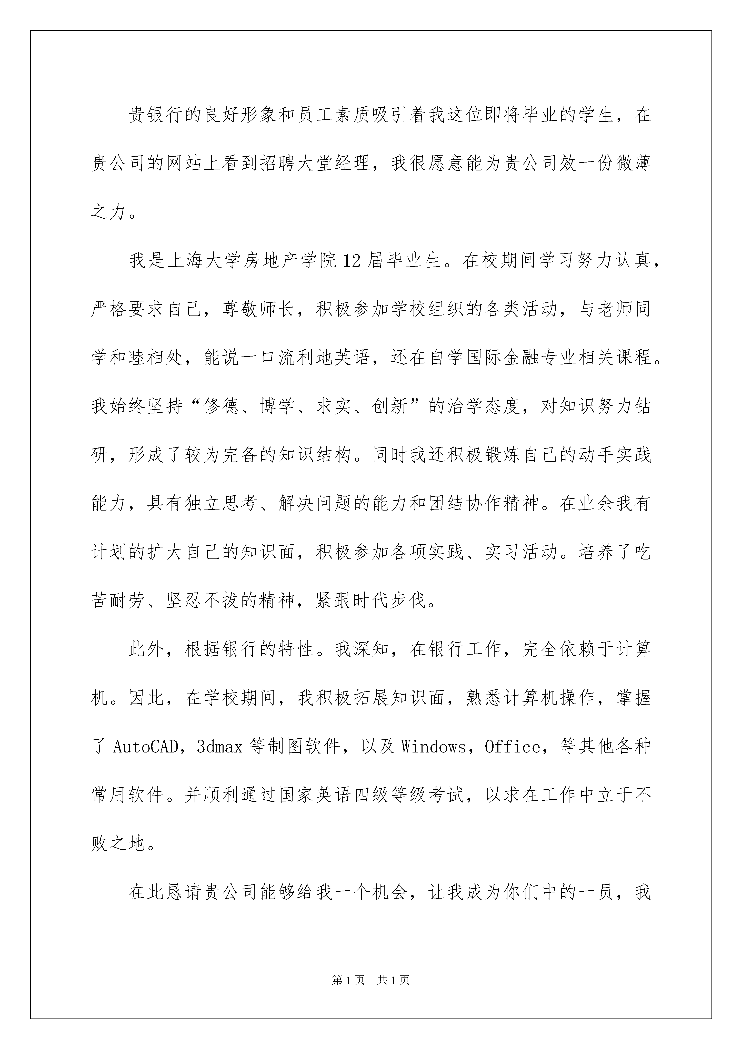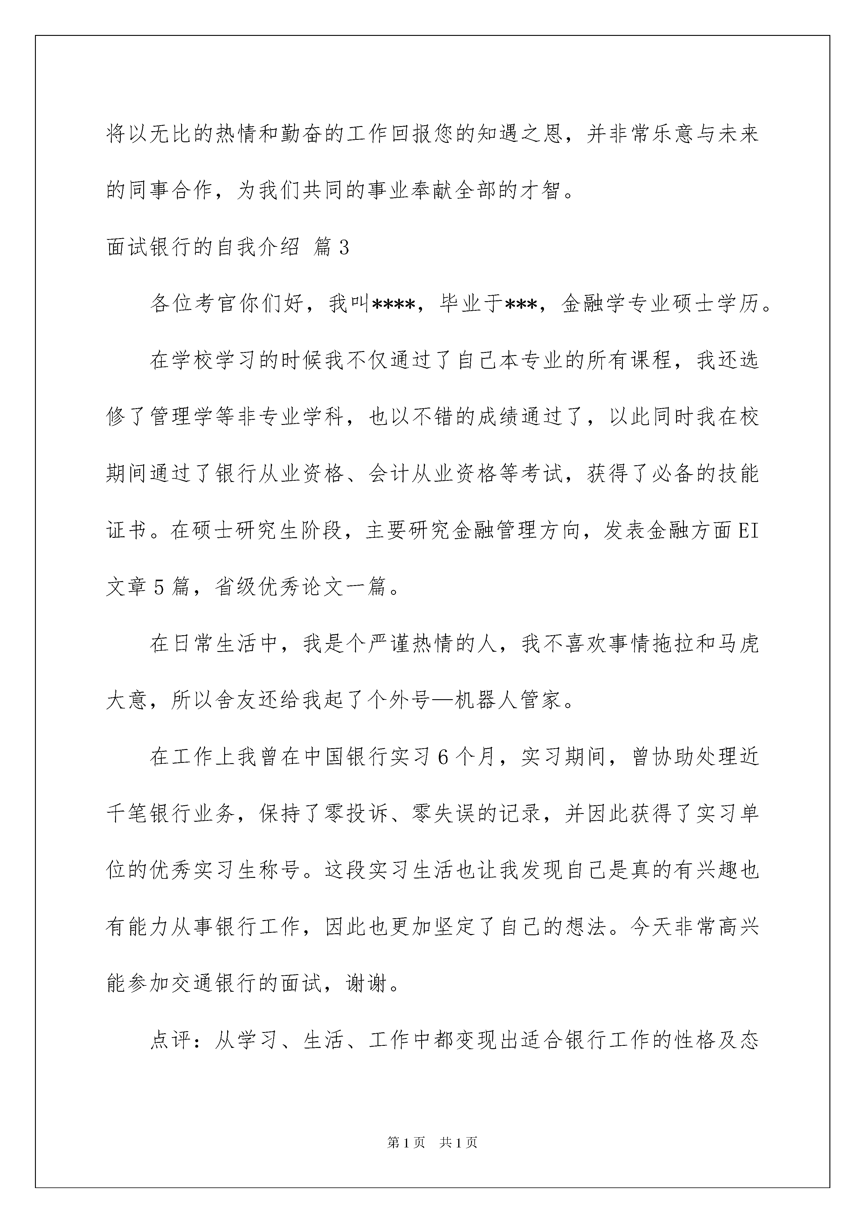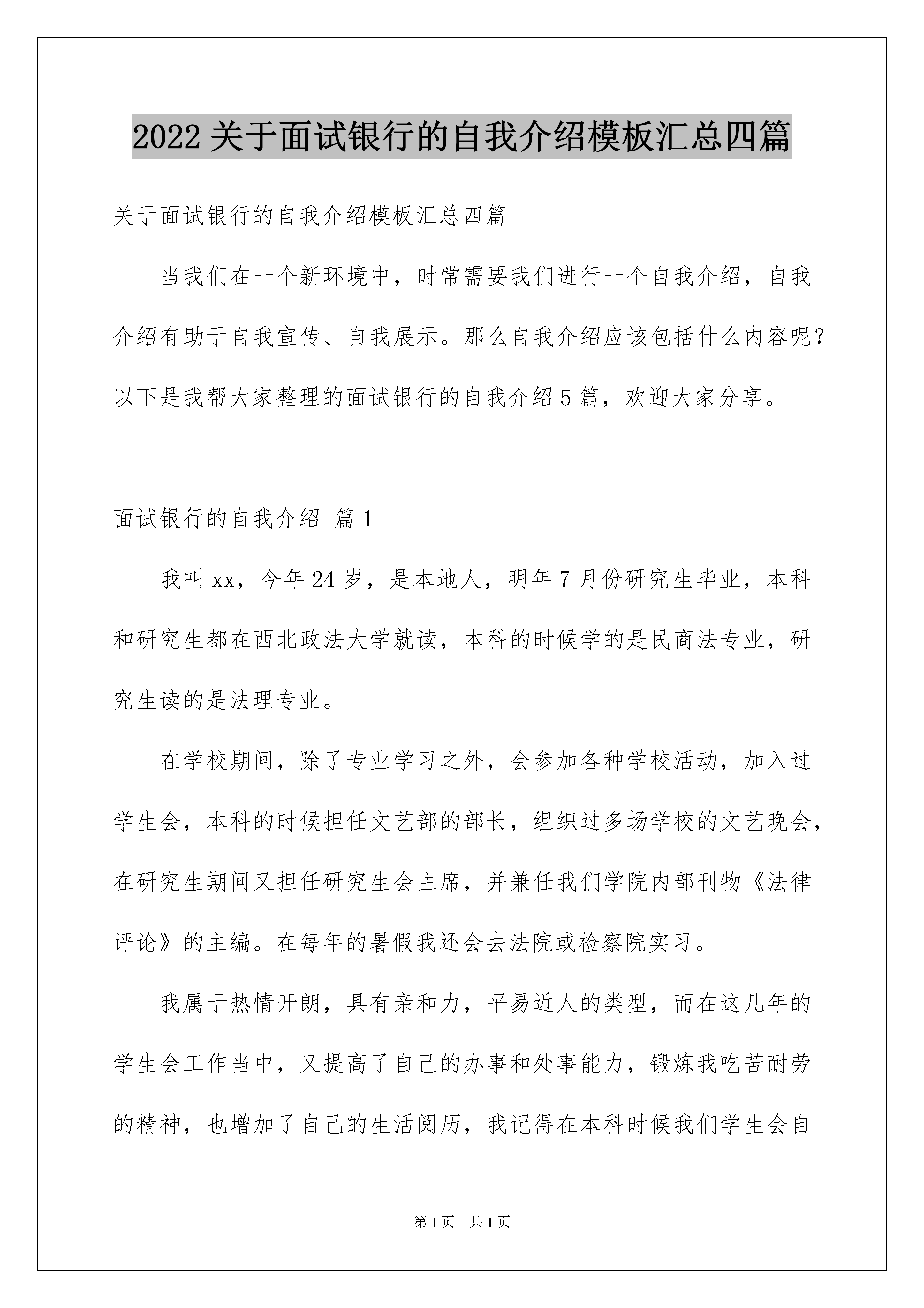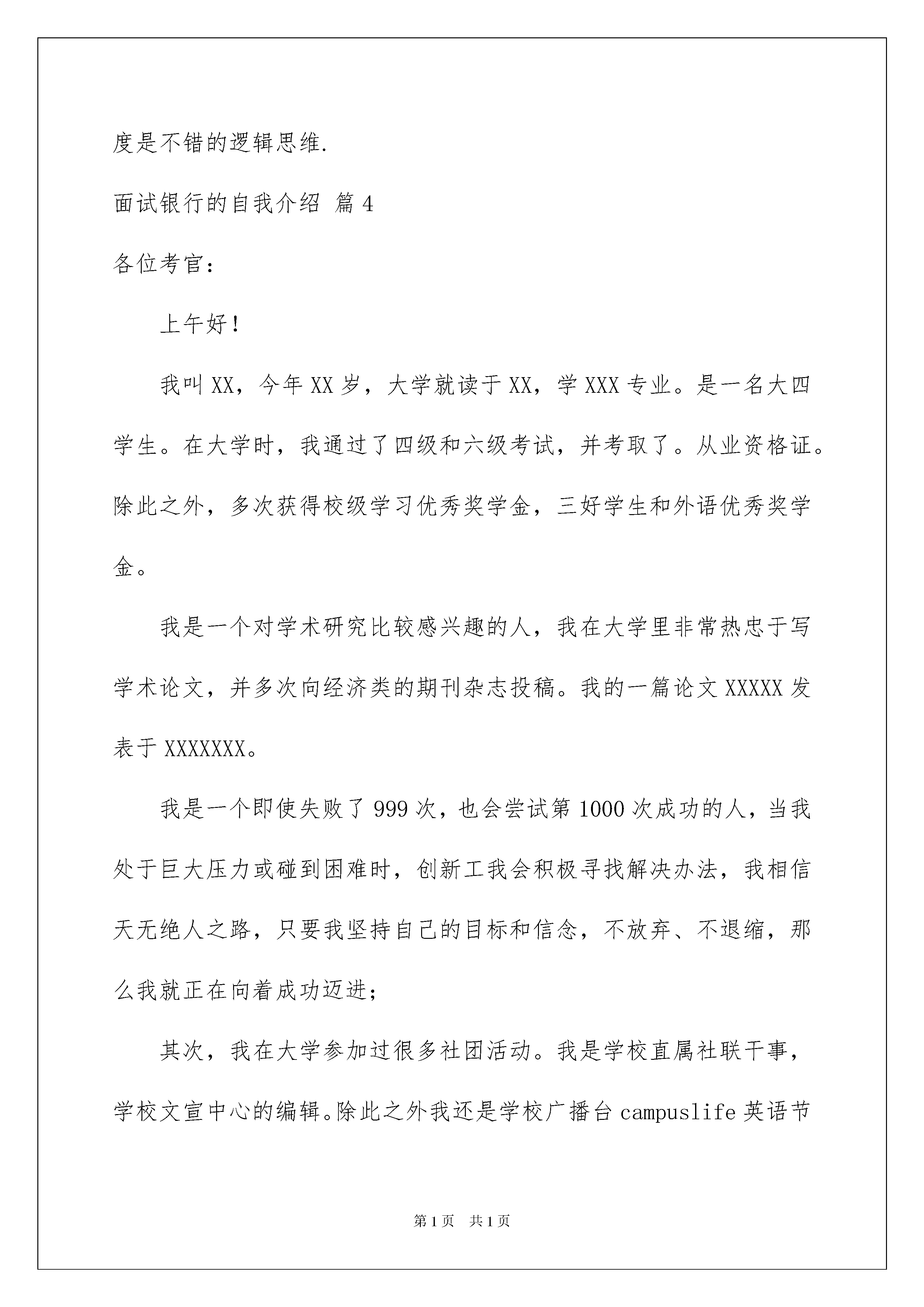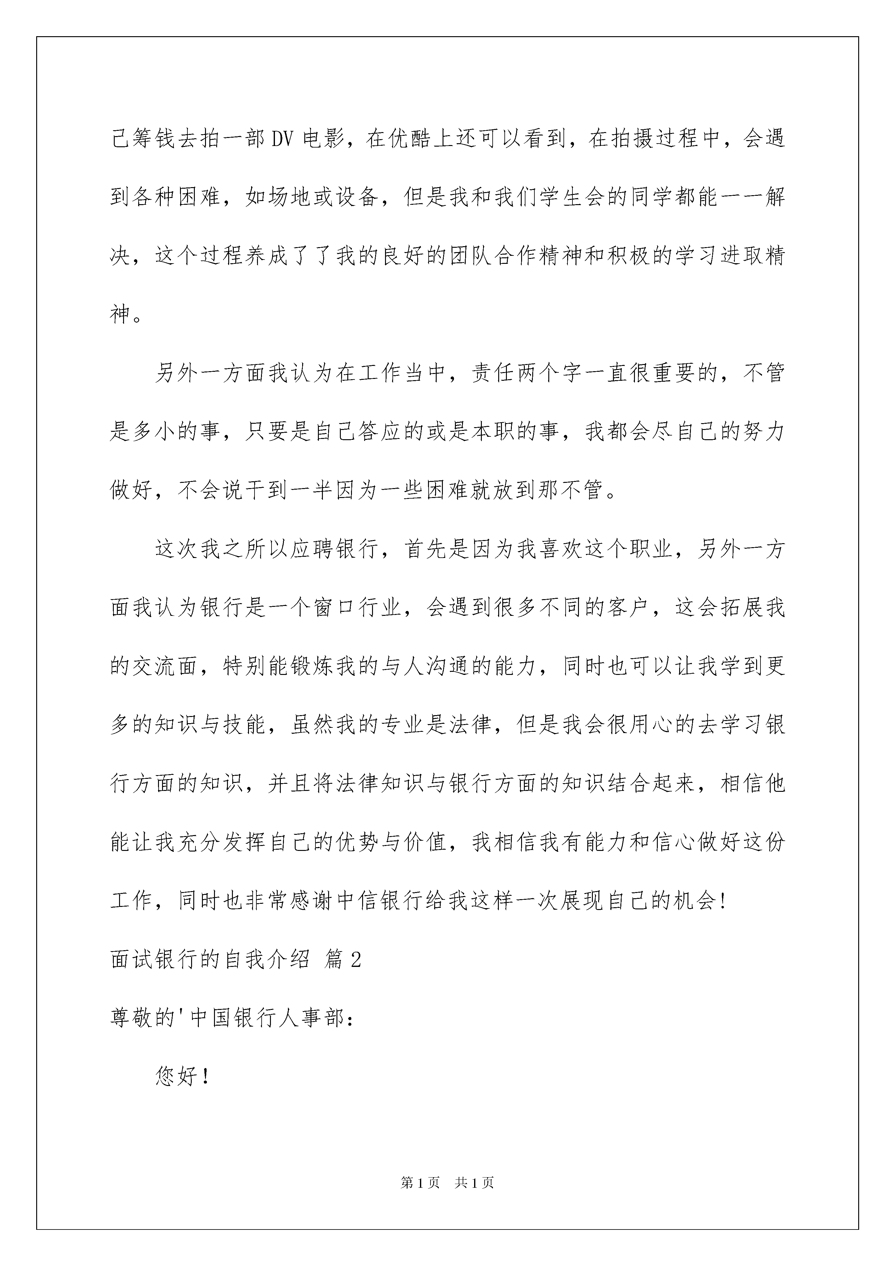 2022关于面试银行的自我介绍模板汇总四篇关于面试银行的自我介绍模板汇总四篇当我们在一个新环境中,时常需要我们进行一个自我介绍,自我介绍有助于自我宣传、自我展示。那么自我介绍应该包括什么内容呢?以下是我帮大家整理的面试银行的自我介绍5篇,欢迎大家分享。面试银行的自我介绍篇1我叫xx,今年24岁,是本地人,明年7月份研究生毕业,本科和研究生都在西北政法大学就读,本科的时候学的是民商法专业,研究生读的是法理专业。在学校期间,除了专业学习之外,会参加各种学校活动,加入过学生会,本科的时候担任文艺部的部长,组织过多场学校的文艺晚会,在研究生期间又担任研究生会主席,并兼任我们学院内部刊物《法律评论》的主编。在每年的暑假我还会去法院或检察院实习。我属于热情开朗,具有亲和力,平易近人的类型,而在这几年的学生会工作当中,又提高了自己的办事和处事能力,锻炼我吃苦耐劳的精神,也增加了自己的生活阅历,我记得在本科时候我们学生会自己筹钱去拍一部DV电影,在优酷上还可以看到,在拍摄过程中,会遇到各种困难,如场地或设备,但是我和我们学生会的同学都能一一解决,这个过程养成了了我的良好的团队合作精神和积极的学习进取精神。另外一方面我认为在工作当中,责任两个字一直很重要的,不管是多小的事,只要是自己答应的或是本职的事,我都会尽自己的努力做好,不会说干到一半因为一些困难就放到那不管。这次我之所以应聘银行,首先是因为我喜欢这个职业,另外一方面我认为银行是一个窗口行业,会遇到很多不同的客户,这会拓展我的交流面,特别能锻炼我的与人沟通的能力,同时也可以让我学到更多的知识与技能,虽然我的专业是法律,但是我会很用心的去学习银行方面的知识,并且将法律知识与银行方面的知识结合起来,相信他能让我充分发挥自己的优势与价值,我相信我有能力和信心做好这份工作,同时也非常感谢中信银行给我这样一次展现自己的机会!面试银行的自我介绍篇2尊敬的'中国银行人事部:您好!贵银行的良好形象和员工素质吸引着我这位即将毕业的学生,在贵公司的网站上看到招聘大堂经理,我很愿意能为贵公司效一份微薄之力。我是上海大学房地产学院12届毕业生。在校期间学习努力认真,严格要求自己,尊敬师长,积极参加学校组织的各类活动,与老师同学和睦相处,能说一口流利地英语,还在自学国际金融专业相关课程。我始终坚持“修德、博学、求实、创新”的治学态度,对知识努力钻研,形成了较为完备的知识结构。同时我还积极锻炼自己的动手实践能力,具有独立思考、解决问题的能力和团结协作精神。在业余我有计划的扩大自己的知识面,积极参加各项实践、实习活动。培养了吃苦耐劳、坚忍不拔的精神,紧跟时代步伐。此外,根据银行的特性。我深知,在银行工作,完全依赖于计算机。因此,在学校期间,我积极拓展知识面,熟悉计算机操作,掌握了AutoCAD,3dmax等制图软件,以及Windows,Office,等其他各种常用软件。并顺利通过国家英语四级等级考试,以求在工作中立于不败之地。在此恳请贵公司能够给我一个机会,让我成为你们中的一员,我将以无比的热情和勤奋的工作回报您的知遇之恩,并非常乐意与未来的同事合作,为我们共同的事业奉献全部的才智。面试银行的自我介绍篇3各位考官你们好,我叫****,毕业于***,金融学专业硕士学历。在学校学习的时候我不仅通过了自己本专业的所有课程,我还选修了管理学等非专业学科,也以不错的成绩通过了,以此同时我在校期间通过了银行从业资格、会计从业资格等考试,获得了必备的技能证书。在硕士研究生阶段,主要研究金融管理方向,发表金融方面EI文章5篇,省级优秀论文一篇。在日常生活中,我是个严谨热情的人,我不喜欢事情拖拉和马虎大意,所以舍友还给我起了个外号—机器人管家。在工作上我曾在中国银行实习6个月,实习期间,曾协助处理近千笔银行业务,保持了零投诉、零失误的记录,并因此获得了实习单位的优秀实习生称号。这段实习生活也让我发现自己是真的有兴趣也有能力从事银行工作,因此也更加坚定了自己的想法。今天非常高兴能参加交通银行的面试,谢谢。点评:从学习、生活、工作中都变现出适合银行工作的性格及态度是不错的逻辑思维.面试银行的自我介绍篇4各位考官:上午好!我叫XX,今年XX岁,大学就读于XX,学XXX专业。是一名大四学生。在大学时,我通过了四级和六级考试,并考取了。从业资格证。除此之外,多次获得校级学习优秀奖学金,三好学生和外语优秀奖学金。我是一个对学术研究比较感兴趣的人,我在大学里非常热忠于写学术论文,并多次向经济类的期刊杂志投稿。我的一篇论文XXXXX发表于XXXXXXX。我是一个即使失败了999次,也会尝试第100