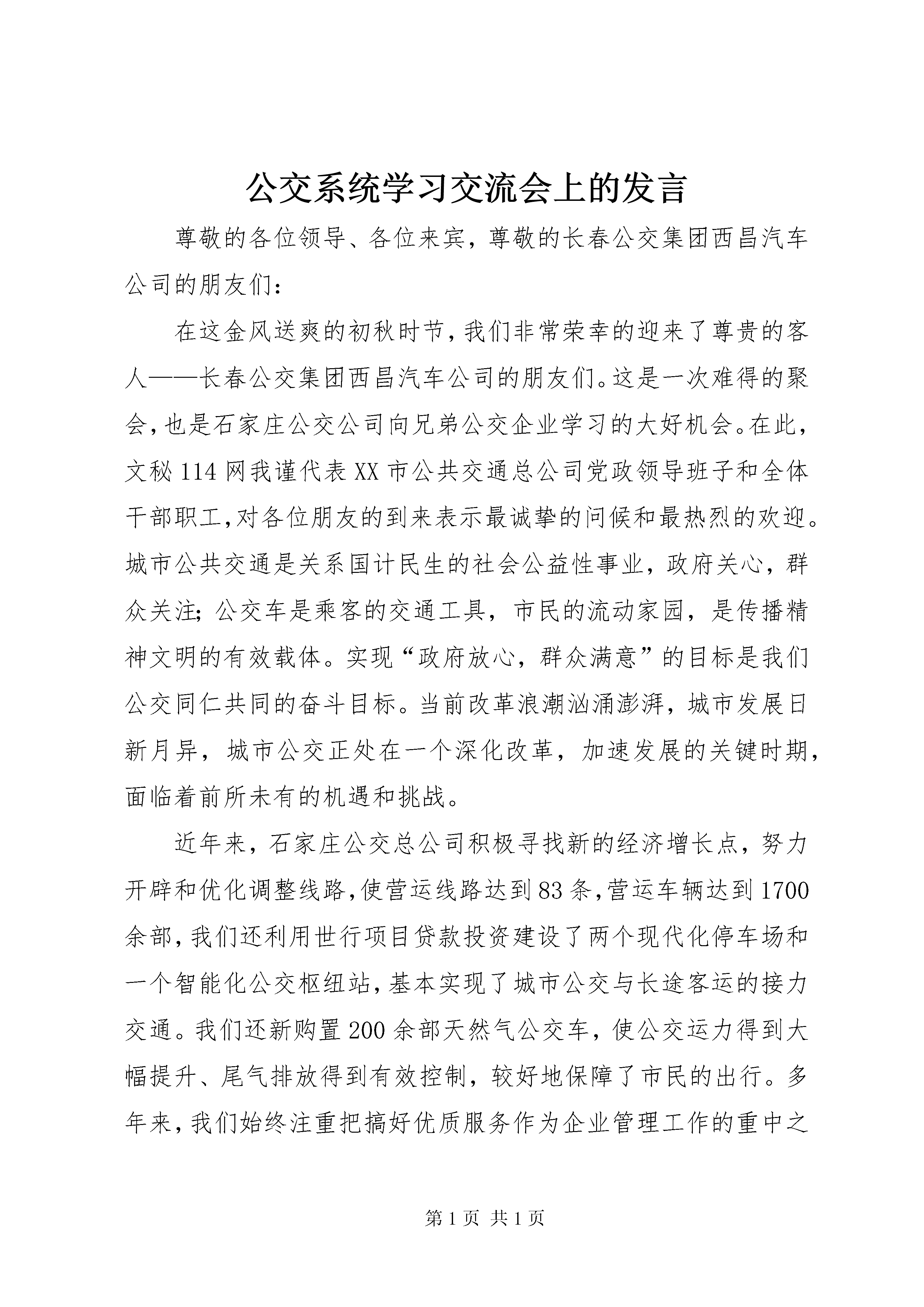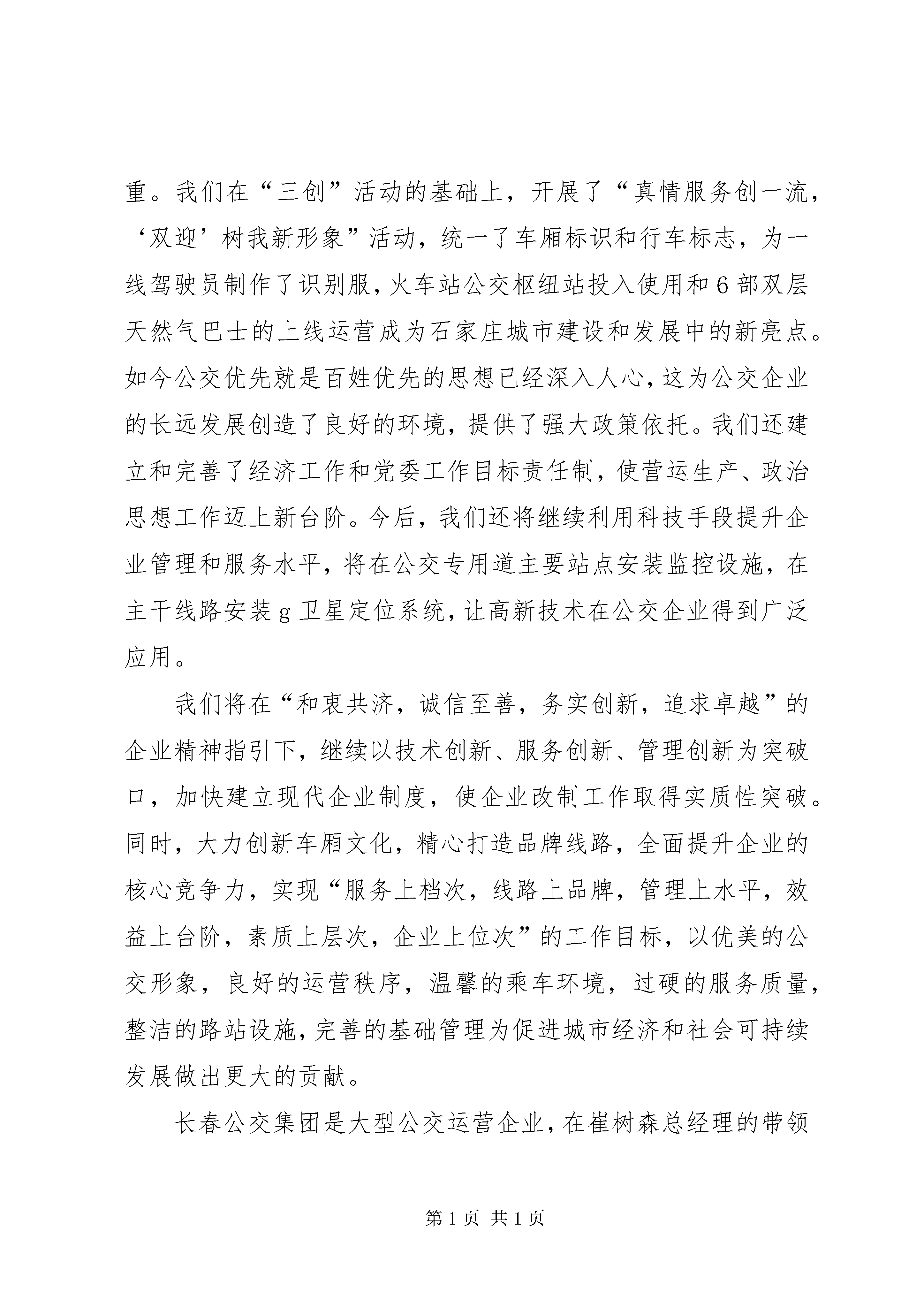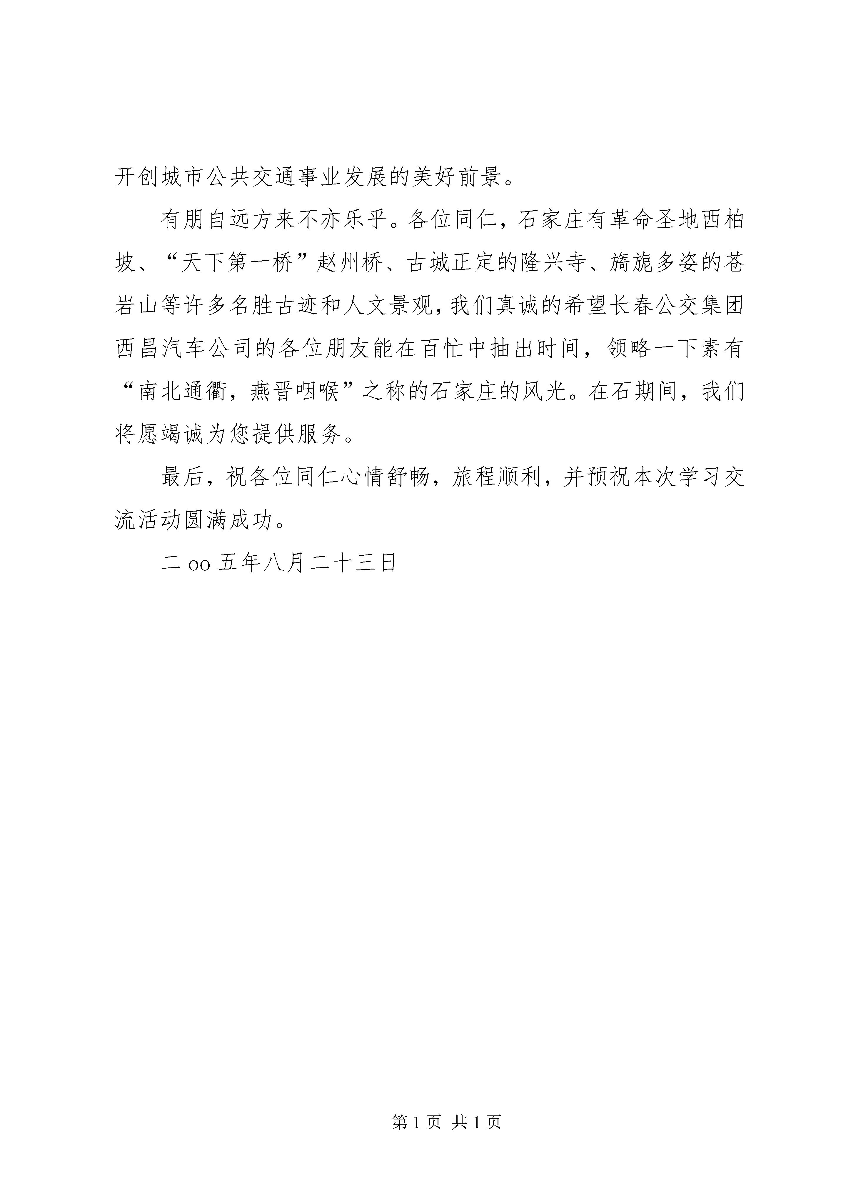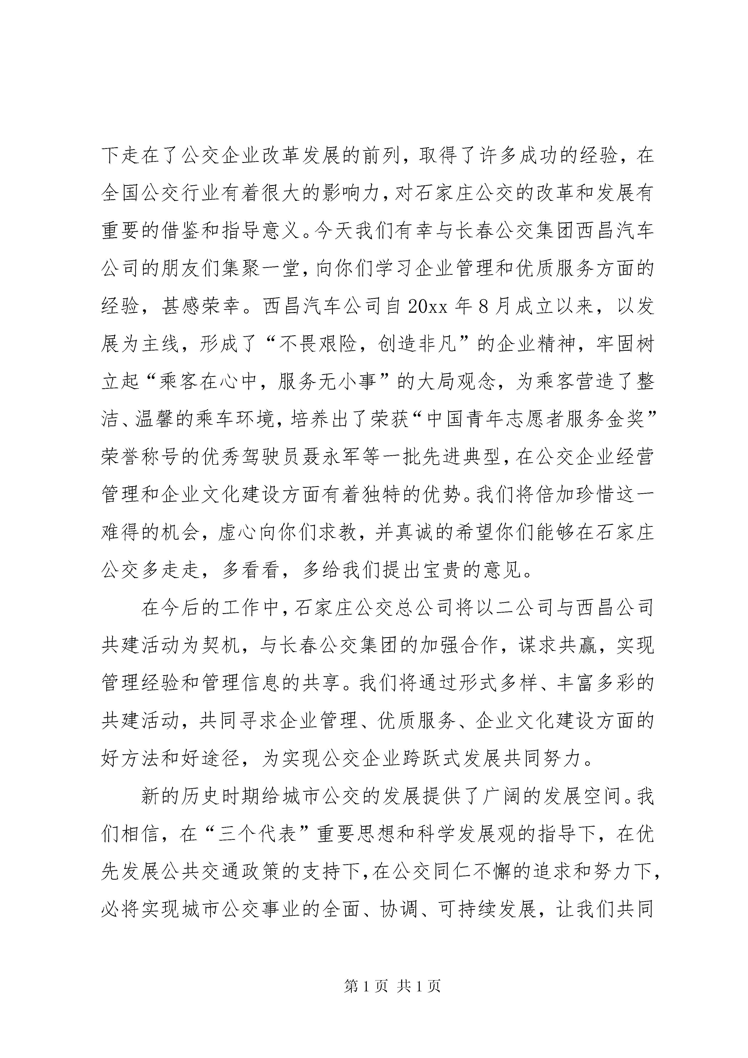 公交系统学习交流会上的发言尊敬的各位领导、各位来宾,尊敬的长春公交集团西昌汽车公司的朋友们:在这金风送爽的初秋时节,我们非常荣幸的迎来了尊贵的客人——长春公交集团西昌汽车公司的朋友们。这是一次难得的聚会,也是石家庄公交公司向兄弟公交企业学习的大好机会。在此,文秘114网我谨代表XX市公共交通总公司党政领导班子和全体干部职工,对各位朋友的到来表示最诚挚的问候和最热烈的欢迎。城市公共交通是关系国计民生的社会公益性事业,政府关心,群众关注;公交车是乘客的交通工具,市民的流动家园,是传播精神文明的有效载体。实现“政府放心,群众满意”的目标是我们公交同仁共同的奋斗目标。当前改革浪潮汹涌澎湃,城市发展日新月异,城市公交正处在一个深化改革,加速发展的关键时期,面临着前所未有的机遇和挑战。近年来,石家庄公交总公司积极寻找新的经济增长点,努力开辟和优化调整线路,使营运线路达到83条,营运车辆达到1700余部,我们还利用世行项目贷款投资建设了两个现代化停车场和一个智能化公交枢纽站,基本实现了城市公交与长途客运的接力交通。我们还新购置200余部天然气公交车,使公交运力得到大幅提升、尾气排放得到有效控制,较好地保障了市民的出行。多年来,我们始终注重把搞好优质服务作为企业管理工作的重中之重。我们在“三创”活动的基础上,开展了“真情服务创一流,‘双迎’树我新形象”活动,统一了车厢标识和行车标志,为一线驾驶员制作了识别服,火车站公交枢纽站投入使用和6部双层天然气巴士的上线运营成为石家庄城市建设和发展中的新亮点。如今公交优先就是百姓优先的思想已经深入人心,这为公交企业的长远发展创造了良好的环境,提供了强大政策依托。我们还建立和完善了经济工作和党委工作目标责任制,使营运生产、政治思想工作迈上新台阶。今后,我们还将继续利用科技手段提升企业管理和服务水平,将在公交专用道主要站点安装监控设施,在主干线路安装g卫星定位系统,让高新技术在公交企业得到广泛应用。我们将在“和衷共济,诚信至善,务实创新,追求卓越”的企业精神指引下,继续以技术创新、服务创新、管理创新为突破口,加快建立现代企业制度,使企业改制工作取得实质性突破。同时,大力创新车厢文化,精心打造品牌线路,全面提升企业的核心竞争力,实现“服务上档次,线路上品牌,管理上水平,效益上台阶,素质上层次,企业上位次”的工作目标,以优美的公交形象,良好的运营秩序,温馨的乘车环境,过硬的服务质量,整洁的路站设施,完善的基础管理为促进城市经济和社会可持续发展做出更大的贡献。长春公交集团是大型公交运营企业,在崔树森总经理的带领下走在了公交企业改革发展的前列,取得了许多成功的经验,在全国公交行业有着很大的影响力,对石家庄公交的改革和发展有重要的借鉴和指导意义。今天我们有幸与长春公交集团西昌汽车公司的朋友们集聚一堂,向你们学习企业管理和优质服务方面的经验,甚感荣幸。西昌汽车公司自20xx年8月成立以来,以发展为主线,形成了“不畏艰险,创造非凡”的企业精神,牢固树立起“乘客在心中,服务无小事”的大局观念,为乘客营造了整洁、温馨的乘车环境,培养出了荣获“中国青年志愿者服务金奖”荣誉称号的优秀驾驶员聂永军等一批先进典型,在公交企业经营管理和企业文化建设方面有着独特的优势。我们将倍加珍惜这一难得的机会,虚心向你们求教,并真诚的希望你们能够在石家庄公交多走走,多看看,多给我们提出宝贵的意见。在今后的工作中,石家庄公交总公司将以二公司与西昌公司共建活动为契机,与长春公交集团的加强合作,谋求共赢,实现管理经验和管理信息的共享。我们将通过形式多样、丰富多彩的共建活动,共同寻求企业管理、优质服务、企业文化建设方面的好方法和好途径,为实现公交企业跨跃式发展共同努力。新的历史时期给城市公交的发展提供了广阔的发展空间。我们相信,在“三个代表”重要思想和科学发展观的指导下,在优先发展公共交通政策的支持下,在公交同仁不懈的追求和努力下,必将实现城市公交事业的全面、协调、可持续发展,让我们共同开创城市公共交通事业发展的美好前景。有朋自远方来不亦乐乎。各位同仁,石家庄有革命圣地西柏坡、“天下第一桥”赵州桥、古城正定的隆兴寺、旖旎多姿的苍岩山等许多名胜古迹和人文景观,我们真诚的希望长春公交集团西昌汽车公司的各位朋友能在百忙中抽出时间,领略一下素有“南北通衢,燕晋咽喉”之称的石家庄的风光。在石期间,我们将愿竭诚为您提供服务。最后,祝各位同仁心情舒畅,旅程顺利,并预祝本次学习交流活动圆满成功。二oo五年八月二十三日
