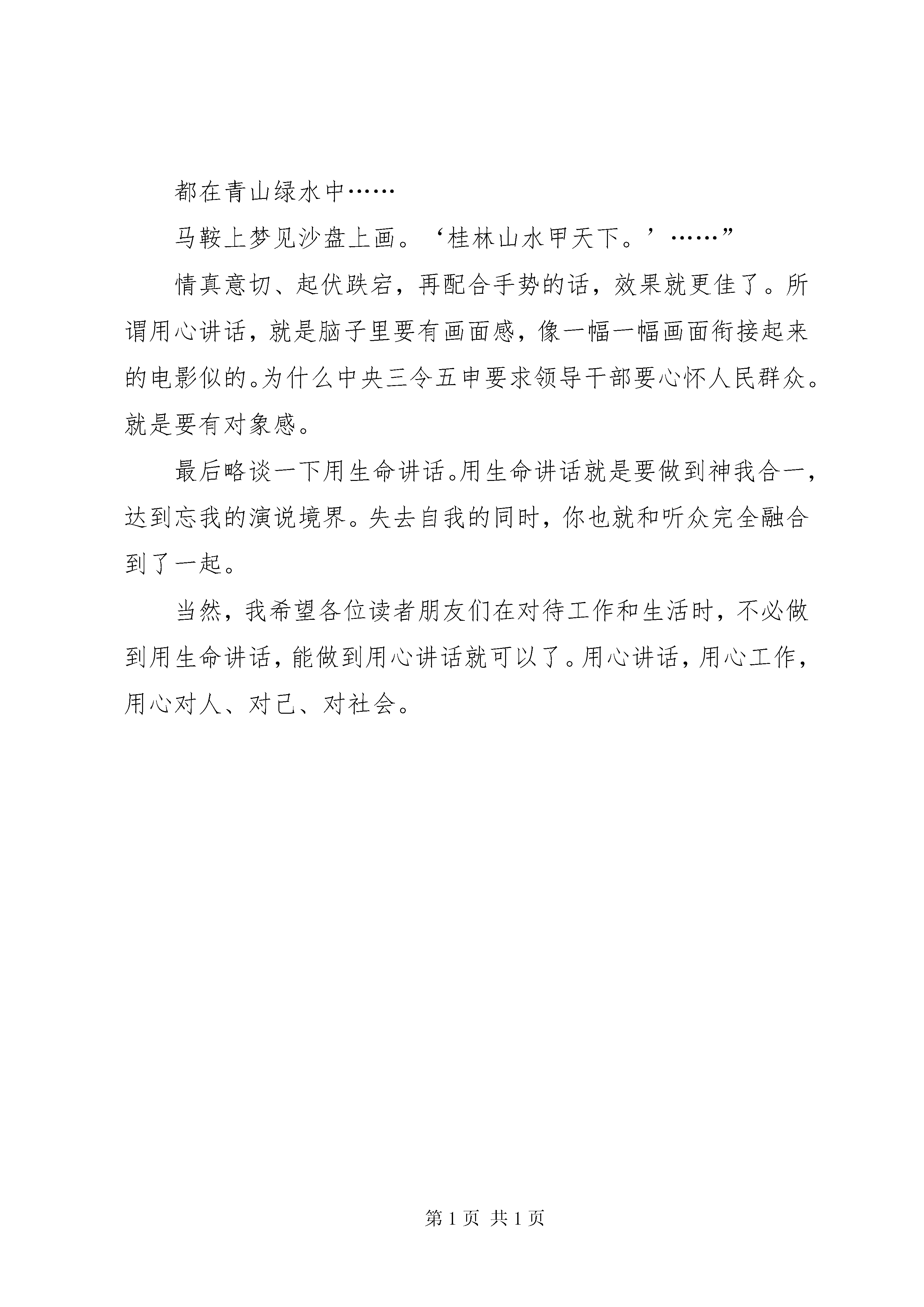 公众演说的三种境界以下,我们交流。第一,用口;第二,用心;第三,用生命。我给大家具体讲解一下,看我们平常应该做到哪一步。第一,用口讲话。怎么用口讲话呢。是这样的,比如说我做一个演说培训课程,当我走进演播室之后,我向在座的观众说了这么一段话:“好,亲爱的朋友们,我们今天上口才艺术课。既然是口才课,我们就以一个美好的气氛来开始。我给大家朗诵一首诗,是贺敬之的《桂林山水歌》:云中的神呵,雾中的仙,神姿仙态桂林的山,情一样深呵,梦一样美,如情似梦漓江的水。”如果语气平平、毫无节奏,如同念经一般,这叫用口讲话,没过脑子。用心讲话是这样的:“亲爱的朋友们,我们今天上的是语言艺术课程。最全面的范文参考写作网站既然是语言艺术课,我们就从一个美好的氛围中开始,我给大家送上一首诗——贺敬之的《桂林山水歌》。云中的神呵,雾中的仙,神姿仙态桂林的山。情一样深呵,梦一样美,如情似梦漓江的水。水几重呵,山几重。水绕山环桂林城……是山城呵是水城。都在青山绿水中……马鞍上梦见沙盘上画。‘桂林山水甲天下。’……”情真意切、起伏跌宕,再配合手势的话,效果就更佳了。所谓用心讲话,就是脑子里要有画面感,像一幅一幅画面衔接起来的电影似的。为什么中央三令五申要求领导干部要心怀人民群众。就是要有对象感。最后略谈一下用生命讲话。用生命讲话就是要做到神我合一,达到忘我的演说境界。失去自我的同时,你也就和听众完全融合到了一起。当然,我希望各位读者朋友们在对待工作和生活时,不必做到用生命讲话,能做到用心讲话就可以了。用心讲话,用心工作,用心对人、对己、对社会。