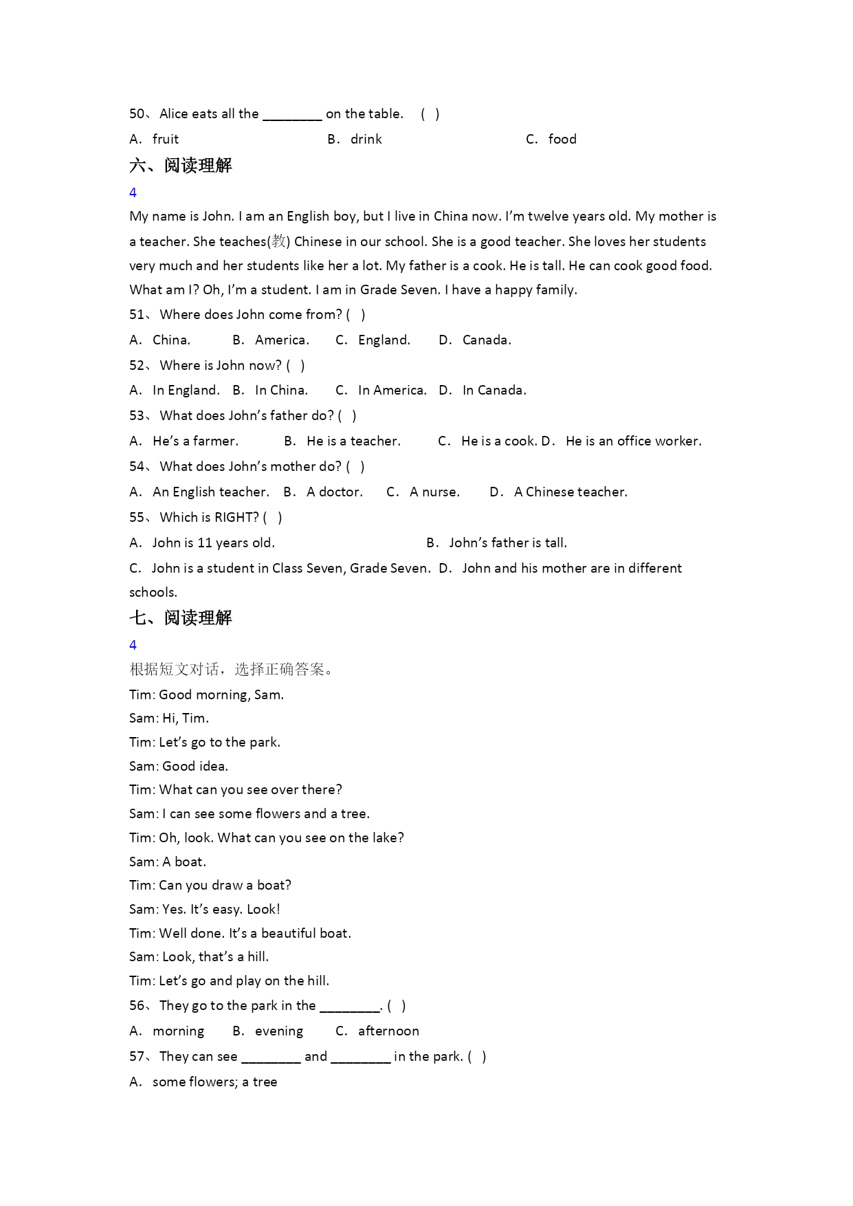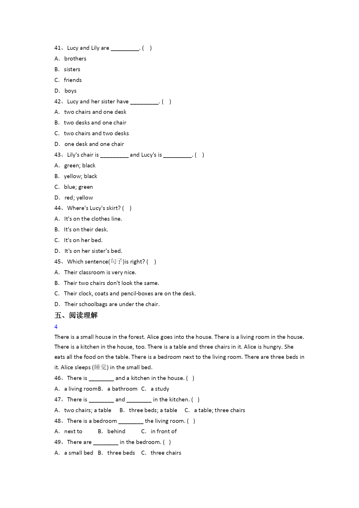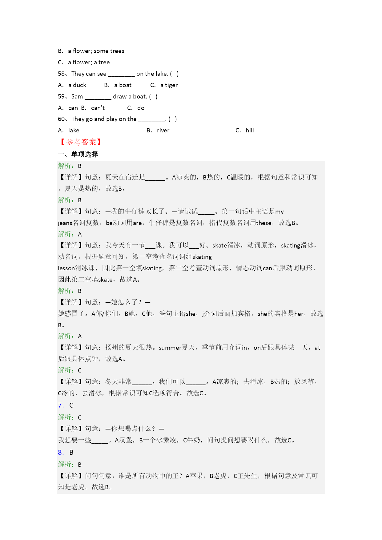 一、单项选择1.Insummer,itis______inSuqian.()A.coolB.hotC.warm2.—Myjeans_______toolong.()—Try_______,please.A.are;thisB.are;theseC.is;these3.Ihavea_______lessontoday.Ican_______well.()A.skating;skateB.skating;skatingC.skate;skating4.—What’sthematterwith________?()—Shehasacold.A.youB.herC.him5.It’sveryhot________summerinYangzhou.()A.inB.onC.at6.Winterisvery________.Wecan________.()A.cool;goskatingB.hot;flykitesC.cold;goskating7.—Whatdoyouwanttodrink?()—Iwantsome________.A.hamburgersB.anicecreamC.milk8.—Who’sthekingofalltheanimals?()—________.A.TheappleB.ThetigerC.MrWang9.—_______youlikeabananapie?()—No,thanks.A.DoB.CanC.Would10._______isthefirstseasonofayear.()A.SpringB.SundayC.Summer11.—_________shoesarethey?()—_________Helen's.A.Who's;It'sB.Whose;It'sC.Whose;They're12.TheSciencebookis________thebedroom,________thechair.()A.on;inB.in;onC.at;on13.Ihavean______________lessoneveryweek.()A.swimmingB.dancingC.English14.—Whoseskirtisthis?()—______A.It’sSuYang.B.They’reSuYang’s.C.It’sSuYang’s.15.Theshorts______toobig.Try______.()A.is;thisB.are;thisC.are;these二、用单词的适当形式填空1oyoulike________(mango),LiLei?17.It’snineo'clock.It’stime________(go)tobed.18.Those_______(peach)aresweet.Ilike_______(it).19.Thatis_________(we)newtimetable.20.That's__________(I)timetable.21.Herearesomenicepictures.Oh,Icandraw_______(they).22.—What’sthematterwith_______(she)?—She_______(be)ill.23.Lookatthese________(dress).Theyaresonice.2anIhave________(any)cakes?2rethere_______(some)flowersinthepark?26.Howmany________(book)dowehave?27.It's4o'clock.It'stime________(go)home.28.Arethese______(you),Tom?29.—Whoseumbrellaisthis?—Itismy________(mother).30.It'scoldoutside.Look,itis________(snow).三、完成句子31.Thestudents_________(画一些红花)bytheriver.32.Tinaisnoth_______.Hernewshoesaredirty(脏的).33._______doyougotoschool?Atsevenforty.34.______(春天)iswarmandwecango______(划船).35.I’mt_____,Iwanttogotobed.36.Ihaveap_____withmyfriendsinthepark.37.It’saf_______day.YangLingcanh_______apicnicinthepark.38.MrGreen_____(通常)hasaabasketballm