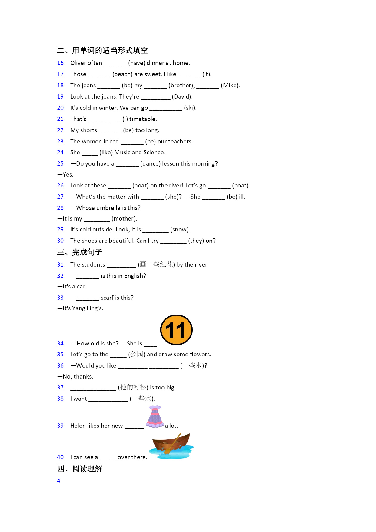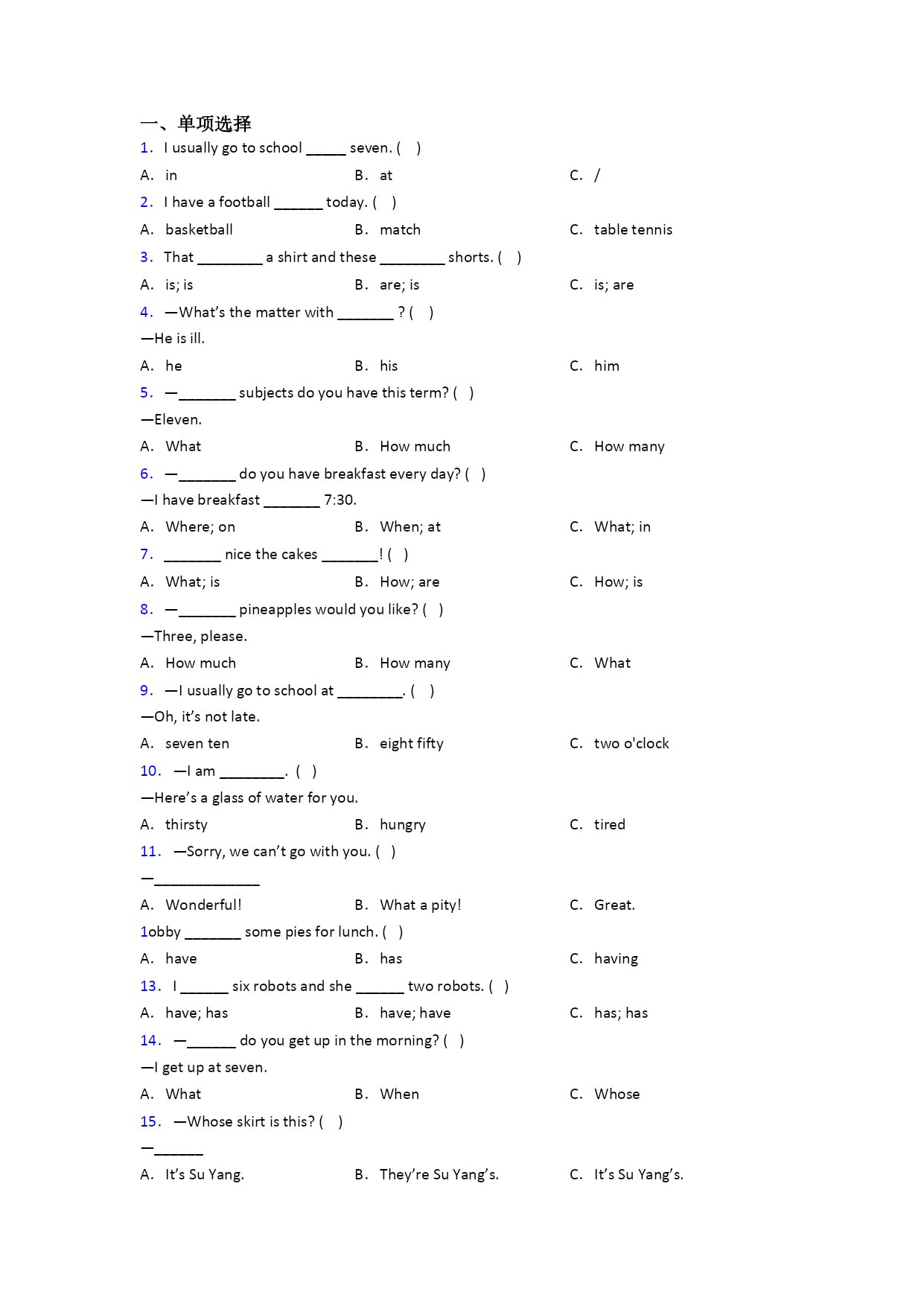 一、单项选择1.Iusuallygotoschool_____seven.()A.inB.atC./2.Ihaveafootball______today.()A.basketballB.matchC.tabletennis3.That________ashirtandthese________shorts.()A.is;isB.are;isC.is;are4.—What’sthematterwith_______?()—Heisill.A.heB.hisC.him5.—_______subjectsdoyouhavethisterm?()—Eleven.A.WhatB.HowmuchC.Howmany6.—_______doyouhavebreakfasteveryday?()—Ihavebreakfast_______7:30.A.Where;onB.When;atC.What;in7._______nicethecakes_______!()A.What;isB.How;areC.How;is8.—_______pineappleswouldyoulike?()—Three,please.A.HowmuchB.HowmanyC.What9.—Iusuallygotoschoolat________.()—Oh,it’snotlate.A.seventenB.eightfiftyC.twoo'clock10.—Iam________.()—Here’saglassofwaterforyou.A.thirstyB.hungryC.tired11.—Sorry,wecan’tgowithyou.()—_____________A.Wonderful!B.Whatapity!C.Great.1obby_______somepiesforlunch.()A.haveB.hasC.having13.I______sixrobotsandshe______tworobots.()A.have;hasB.have;haveC.has;has14.—______doyougetupinthemorning?()—Igetupatseven.A.WhatB.WhenC.Whose15.—Whoseskirtisthis?()—______A.It’sSuYang.B.They’reSuYang’s.C.It’sSuYang’s.二、用单词的适当形式填空16.Oliveroften_______(have)dinnerathome.17.Those_______(peach)aresweet.Ilike_______(it).18.Thejeans_______(be)my_______(brother),_______(Mike).19.Lookatthejeans.They're_________(David).20.It'scoldinwinter.Wecango__________(ski).21.That's__________(I)timetable.22.Myshorts_______(be)toolong.23.Thewomeninred_______(be)ourteachers.24.She_____(like)MusicandScience.25.—Doyouhavea_______(dance)lessonthismorning?—Yes.26.Lookatthese_______(boat)ontheriver!Let’sgo_______(boat).27.—What’sthematterwith_______(she)?—She_______(be)ill.28.—Whoseumbrellaisthis?—Itismy________(mother).29.It'scoldoutside.Look,itis________(snow).30.Theshoesarebeautiful.CanItry________(they)on?三、完成句子31.Thestudents_________(画一些红花)bytheriver.32.—_______isthisinEnglish?—It'sacar.33.—_______scarfisthis?—It'sYangLing's.34.-Howoldisshe?-Sheis____.35.Let’sgotothe_____(公园)anddrawsomeflowers.36.—Wouldyoulike__________________(一些水)?—No,thanks.37.______________(他的衬衫)istoobig.38.Iwant____________(