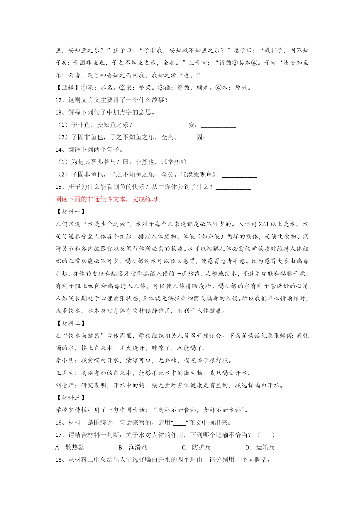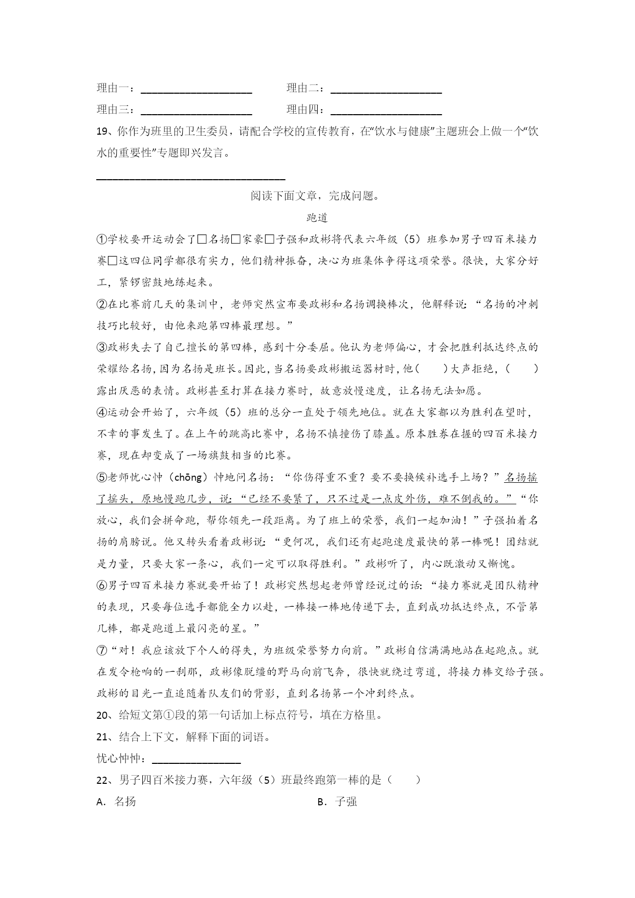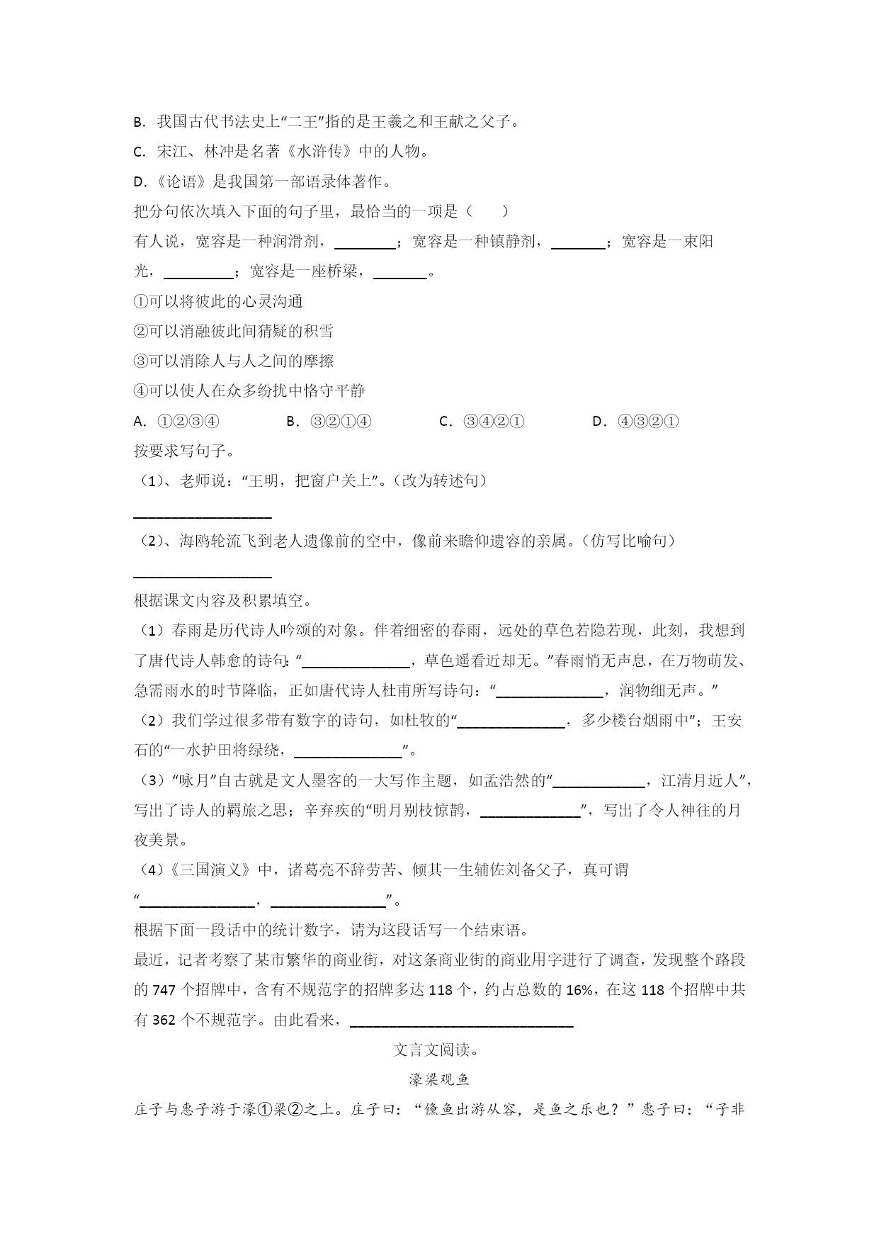 广东省深圳市福田区福田小学语文六年级小升初期末复习试卷读句子,根据拼音写词语。这次,刘一首同学突然来了línggǎn(),再出奇招。容不得片刻dāngē(),他立即fānxiāngdǎoguì(),寻出个小铁罐,反扣在地面上。然后点燃biānpào(),塞进罐底,“砰”的一响,铁罐直冲半空。弟弟觉得bùkěsīyì(),也跃跃欲试,nàihé()危险系数太高,wéikǒng()炸了手指,作无谓的“xīshēng()”,便只能作罢。下列划线字的读音完全正确的一项是()A.霎时(shà)疑惑(huò)浑浊(zhuó)灌溉(gài)B.骤雨(zhòu)田埂(gěn)叶柄(bǐng)蜗牛(wō)C.住宅(zhái)项目(xàng)铁锁(shuǒ)宽恕(shù)D.签订(dìng)诸位(zhù)船舶(pó)角色(jué)选出下列句子中没有错别字的一项()A.走出门,就与徽风撞了个满怀,风中含着露水和栀子花的气息。B.我目光追随着爬行的小虫,作了一次奇异的游厉。C.我对这两个母亲怀着同样崇高的敬意和同样真挚的爱慕。D.渐近故乡时,天气又阴侮了,冷风吹进船舱中,呜呜的响。选出不是比比喻句的一项是()A.往事历历在目,仿佛就发生在昨天。B.地中海被称为西方文明的摇篮。C.燕子像褐色的闪电,在高傲地飞翔。D.那又浓又翠的景色简直是青山绿水画。下列句子中,没有语病的一项是()A.我肯定李宁大概是生病了。B.一排排松树挺立在风雪中。C.中国的人口是世界上最多的国家。下列省略号的用法分析有误的是()A.同学们有节奏地喊着:“一二一,一二一……”(表示重复的省略)B.谢谢上帝,总算活着回来啦。……你在家里做些什么呢?(表示语意的跳跃)C.我盯着桌上的十元钱自言自语地说:“拿吧!反正又没人知道……爸爸回来了……不,是风声……!我这是在干什么呢?”(表示省略同类词句)D.“我嘛……缝缝补补……风吼得这么凶,真叫人害怕。”(表示说话断断续续)下列各项表述不正确的一项是()A.《白雪公主》和《皇帝的新装》都是《安徒生童话》里的故事。B.我国古代书法史上“二王”指的是王羲之和王献之父子。C.宋江、林冲是名著《水浒传》中的人物。D.《论语》是我国第一部语录体著作。把分句依次填入下面的句子里,最恰当的一项是()有人说,宽容是一种润滑剂,;宽容是一种镇静剂,;宽容是一束阳光,;宽容是一座桥梁,。①可以将彼此的心灵沟通②可以消融彼此间猜疑的积雪③可以消除人与人之间的摩擦④可以使人在众多纷扰中恪守平静A.①②③④B.③②①④C.③④②①D.④③②①按要求写句子。(1)、老师说:“王明,把窗户关上”。(改为转述句)__________________(2)、海鸥轮流飞到老人遗像前的空中,像前来瞻仰遗容的亲属。(仿写比喻句)__________________根据课文内容及积累填空。(1)春雨是历代诗人吟颂的对象。伴着细密的春雨,远处的草色若隐若现,此刻,我想到了唐代诗人韩愈的诗句:“______________,草色遥看近却无。”春雨悄无声息,在万物萌发、急需雨水的时节降临,正如唐代诗人杜甫所写诗句:“______________,润物细无声。”(2)我们学过很多带有数字的诗句,如杜牧的“______________,多少楼台烟雨中”;王安石的“一水护田将绿绕,______________”。(3)“咏月”自古就是文人墨客的一大写作主题,如孟浩然的“____________,江清月近人”,写出了诗人的羁旅之思;辛弃疾的“明月别枝惊鹊,_____________”,写出了令人神往的月夜美景。(4)《三国演义》中,诸葛亮不辞劳苦、倾其一生辅佐刘备父子,真可谓“_______________,_______________”。根据下面一段话中的统计数字,请为这段话写一个结束语。最近,记者考察了某市繁华的商业街,对这条商业街的商业用字进行了调查,发现整个路段的747个招牌中,含有不规范字的招牌多达118个,约占总数的16%,在这118个招牌中共有362个不规范字。由此看来,_____________________________文言文阅读。濠梁观鱼庄子与惠子游于濠①梁②之上。庄子曰:“儵鱼出游从容,是鱼之乐也?”惠子曰:“子非鱼,安知鱼之乐?”庄子曰:“子非我,安知我不知鱼之乐?”惠子曰:“我非子,固不知子矣;子固非鱼也,子之不知鱼之乐,全矣。”庄子曰:“请循③其本④。子曰‘汝安知鱼乐’云者,既已知吾知之而问我。我知之濠上也。”【注释】①濠:水名。②梁:桥梁。③循:遵循,顺着。④本:原来。12、这则文言文主要讲了一个什么故事?___________13、解释下列句子中加点字的意思。(1)子非鱼,安知鱼之乐?安:___________(2)子固非鱼也,子之不知鱼之乐,全矣。固:__
