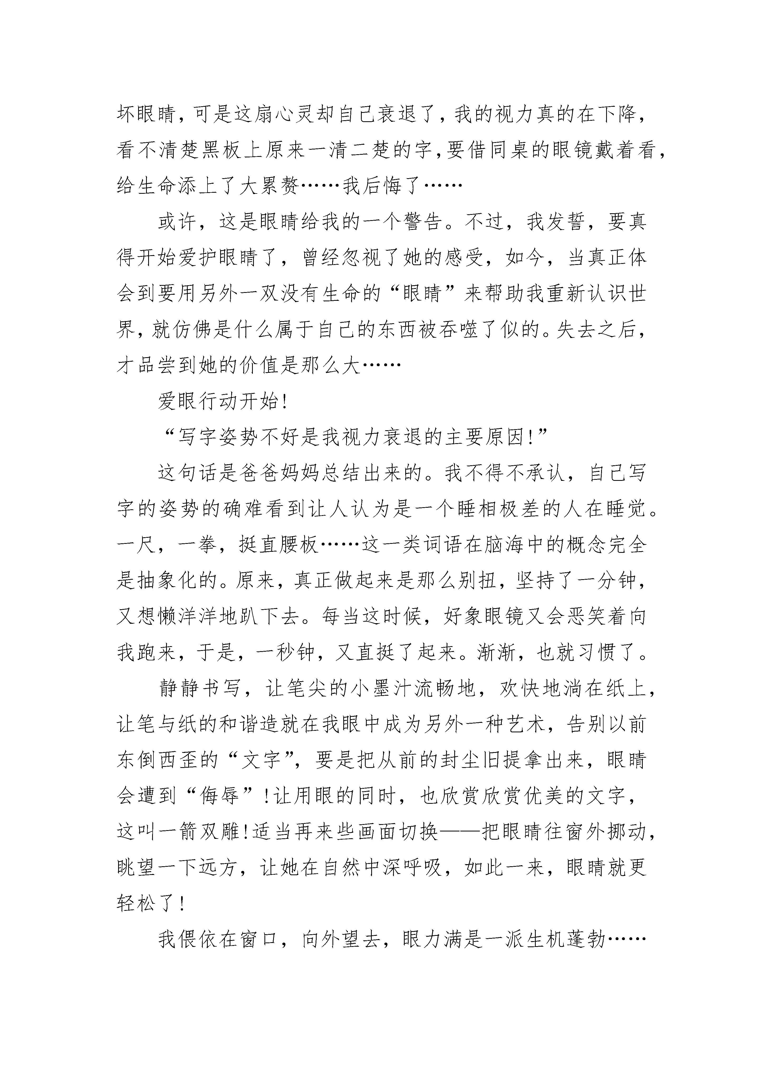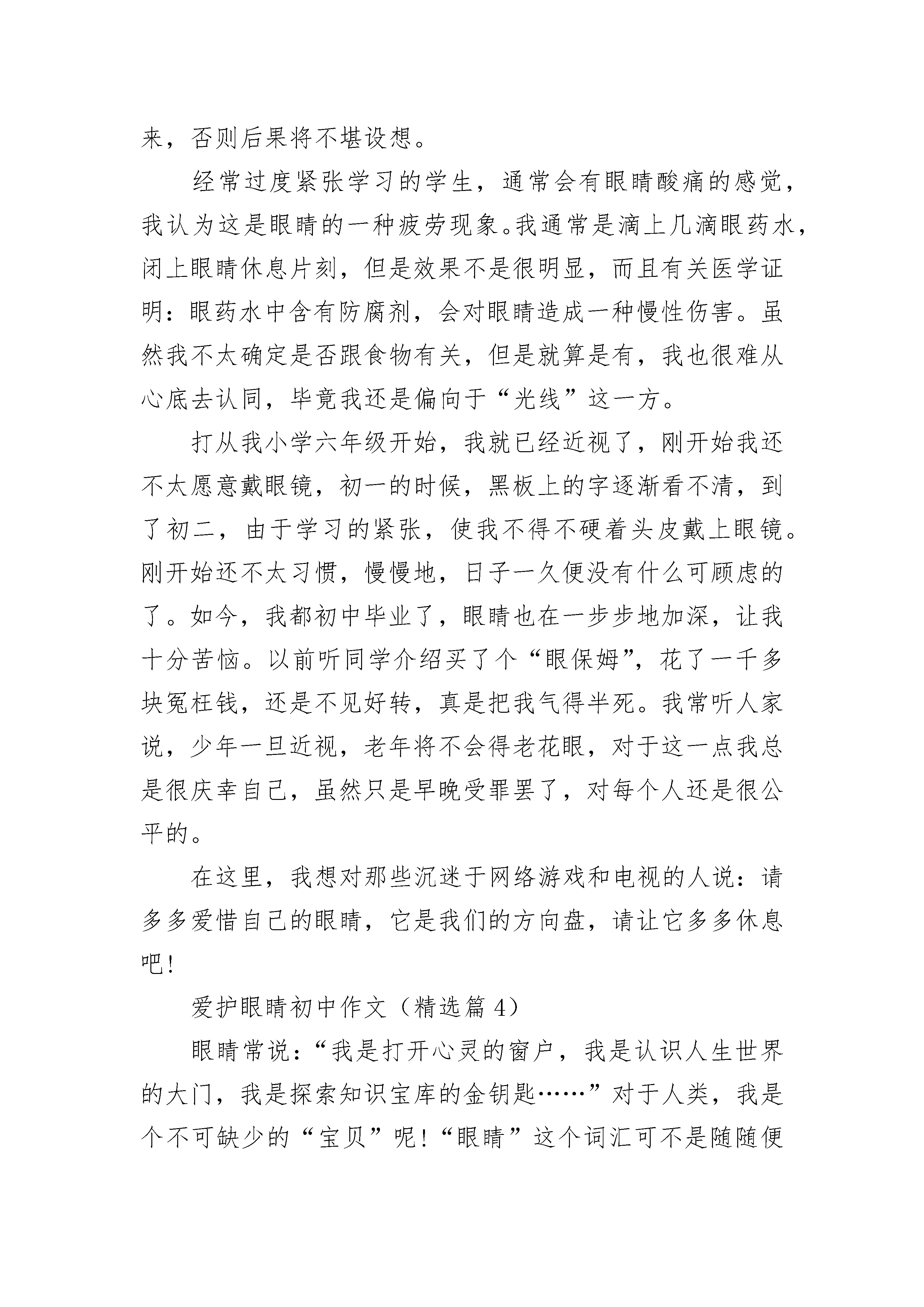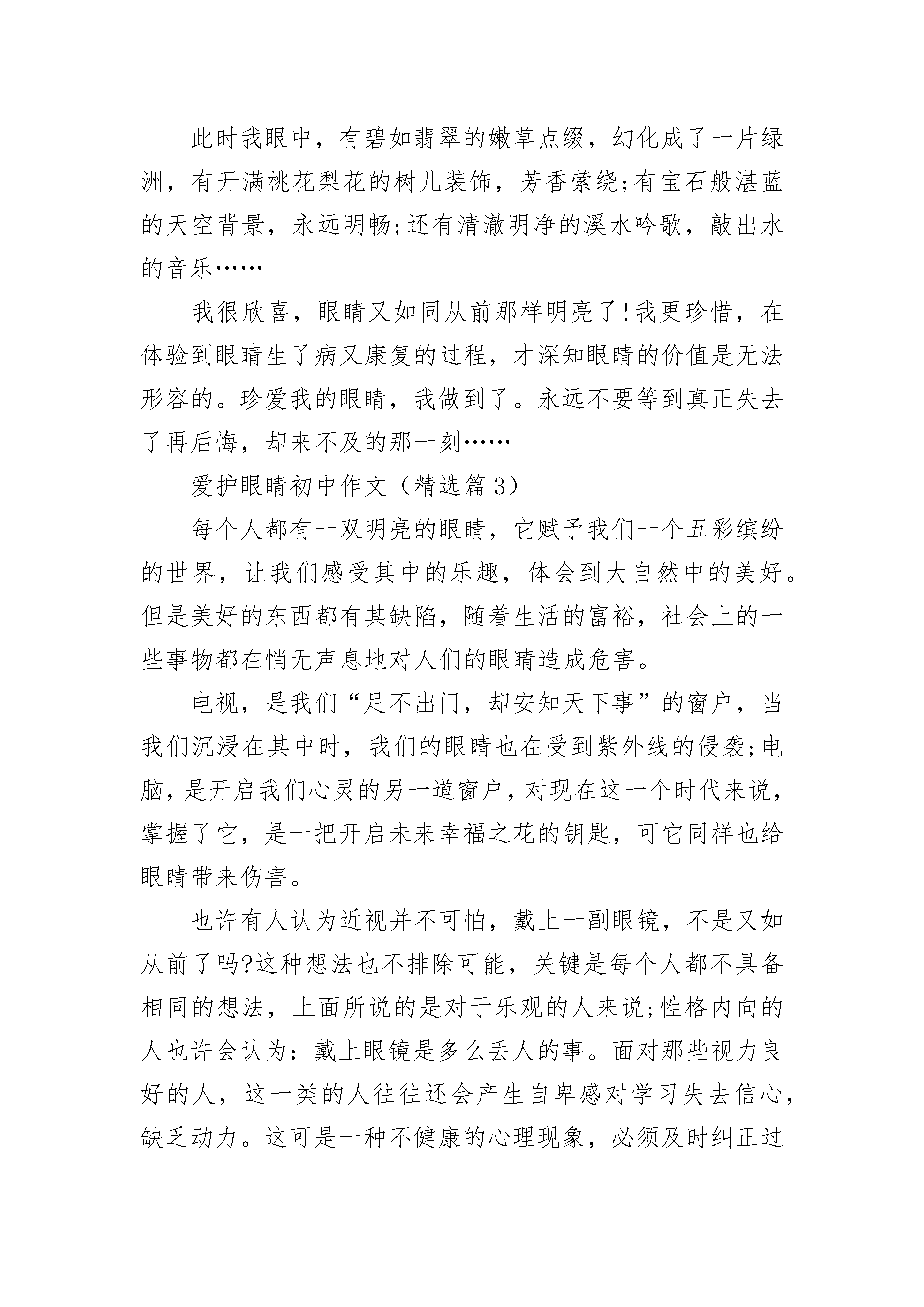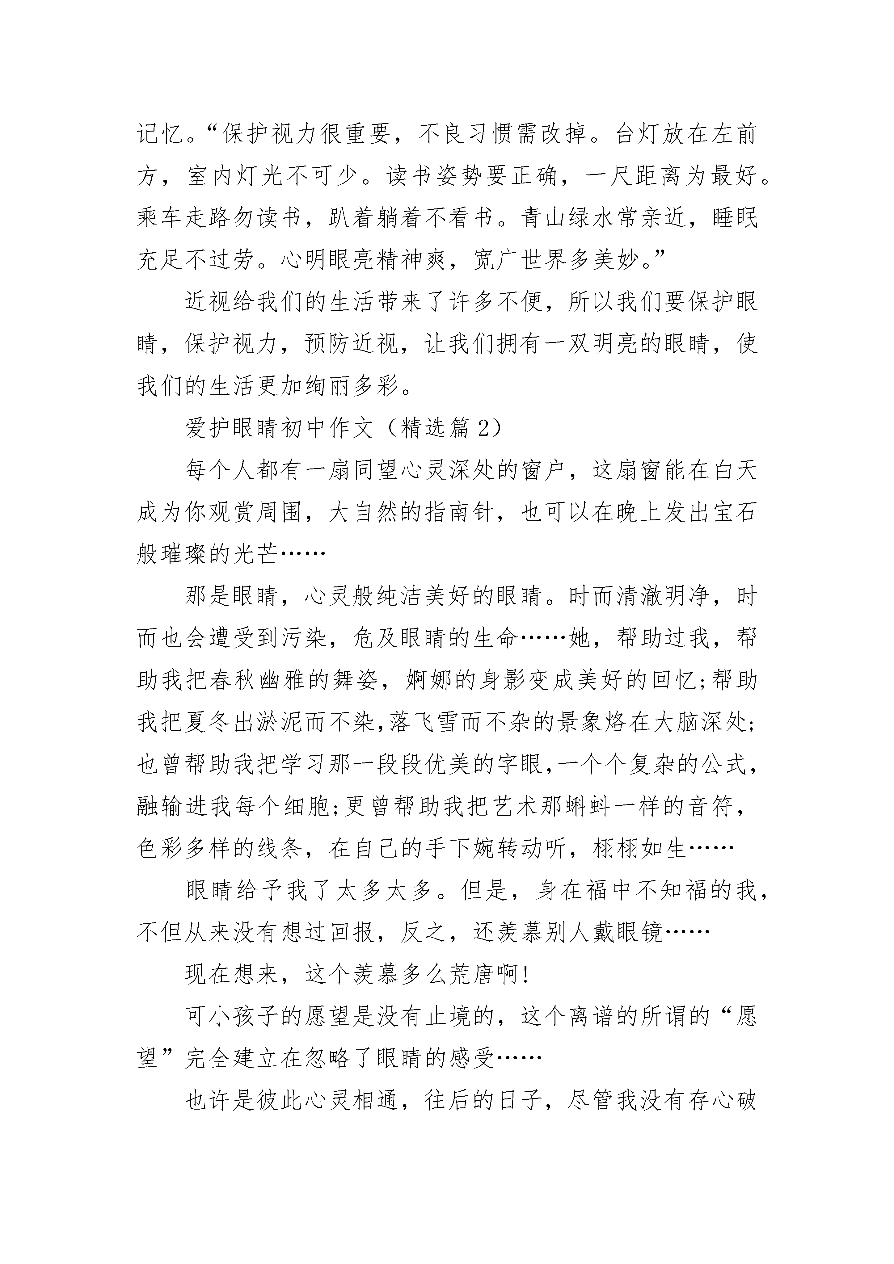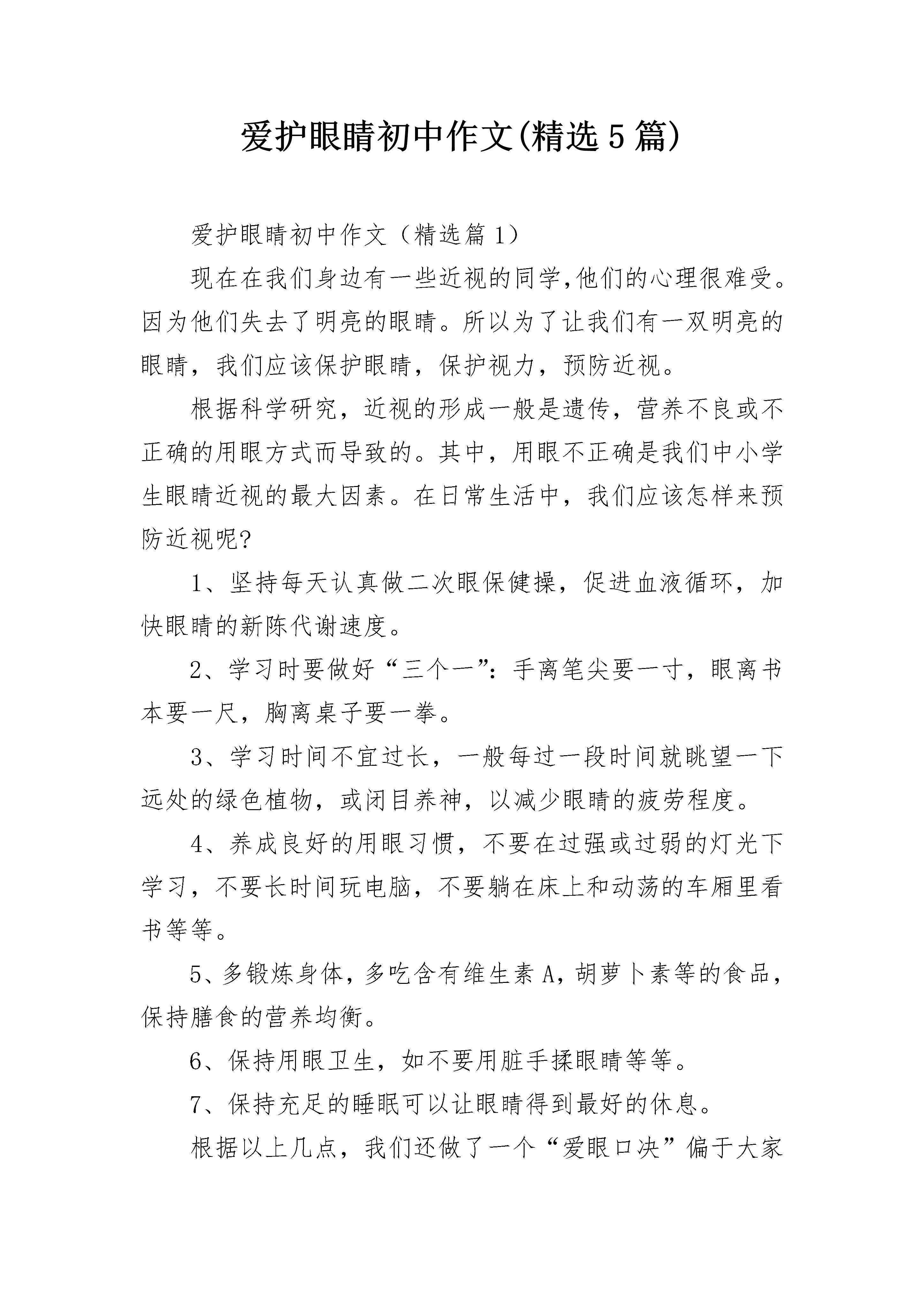 爱护眼睛初中作文(精选5篇)爱护眼睛初中作文(精选篇1)现在在我们身边有一些近视的同学,他们的心理很难受。因为他们失去了明亮的眼睛。所以为了让我们有一双明亮的眼睛,我们应该保护眼睛,保护视力,预防近视。根据科学研究,近视的形成一般是遗传,营养不良或不正确的用眼方式而导致的。其中,用眼不正确是我们中小学生眼睛近视的最大因素。在日常生活中,我们应该怎样来预防近视呢?1、坚持每天认真做二次眼保健操,促进血液循环,加快眼睛的新陈代谢速度。2、学习时要做好“三个一”:手离笔尖要一寸,眼离书本要一尺,胸离桌子要一拳。3、学习时间不宜过长,一般每过一段时间就眺望一下远处的绿色植物,或闭目养神,以减少眼睛的疲劳程度。4、养成良好的用眼习惯,不要在过强或过弱的灯光下学习,不要长时间玩电脑,不要躺在床上和动荡的车厢里看书等等。5、多锻炼身体,多吃含有维生素A,胡萝卜素等的食品,保持膳食的营养均衡。6、保持用眼卫生,如不要用脏手揉眼睛等等。7、保持充足的睡眠可以让眼睛得到最好的休息。根据以上几点,我们还做了一个“爱眼口决”偏于大家记忆。“保护视力很重要,不良习惯需改掉。台灯放在左前方,室内灯光不可少。读书姿势要正确,一尺距离为最好。乘车走路勿读书,趴着躺着不看书。青山绿水常亲近,睡眠充足不过劳。心明眼亮精神爽,宽广世界多美妙。”近视给我们的生活带来了许多不便,所以我们要保护眼睛,保护视力,预防近视,让我们拥有一双明亮的眼睛,使我们的生活更加绚丽多彩。爱护眼睛初中作文(精选篇2)每个人都有一扇同望心灵深处的窗户,这扇窗能在白天成为你观赏周围,大自然的指南针,也可以在晚上发出宝石般璀璨的光芒……那是眼睛,心灵般纯洁美好的眼睛。时而清澈明净,时而也会遭受到污染,危及眼睛的生命……她,帮助过我,帮助我把春秋幽雅的舞姿,婀娜的身影变成美好的回忆;帮助我把夏冬出淤泥而不染,落飞雪而不杂的景象烙在大脑深处;也曾帮助我把学习那一段段优美的字眼,一个个复杂的公式,融输进我每个细胞;更曾帮助我把艺术那蝌蚪一样的音符,色彩多样的线条,在自己的手下婉转动听,栩栩如生……眼睛给予我了太多太多。但是,身在福中不知福的我,不但从来没有想过回报,反之,还羡慕别人戴眼镜……现在想来,这个羡慕多么荒唐啊!可小孩子的愿望是没有止境的,这个离谱的所谓的“愿望”完全建立在忽略了眼睛的感受……也许是彼此心灵相通,往后的日子,尽管我没有存心破坏眼睛,可是这扇心灵却自己衰退了,我的视力真的在下降,看不清楚黑板上原来一清二楚的字,要借同桌的眼镜戴着看,给生命添上了大累赘……我后悔了……或许,这是眼睛给我的一个警告。不过,我发誓,要真得开始爱护眼睛了,曾经忽视了她的感受,如今,当真正体会到要用另外一双没有生命的“眼睛”来帮助我重新认识世界,就仿佛是什么属于自己的东西被吞噬了似的。失去之后,才品尝到她的价值是那么大……爱眼行动开始!“写字姿势不好是我视力衰退的主要原因!”这句话是爸爸妈妈总结出来的。我不得不承认,自己写字的姿势的确难看到让人认为是一个睡相极差的人在睡觉。一尺,一拳,挺直腰板……这一类词语在脑海中的概念完全是抽象化的。原来,真正做起来是那么别扭,坚持了一分钟,又想懒洋洋地趴下去。每当这时候,好象眼镜又会恶笑着向我跑来,于是,一秒钟,又直挺了起来。渐渐,也就习惯了。静静书写,让笔尖的小墨汁流畅地,欢快地淌在纸上,让笔与纸的和谐造就在我眼中成为另外一种艺术,告别以前东倒西歪的“文字”,要是把从前的封尘旧提拿出来,眼睛会遭到“侮辱”!让用眼的同时,也欣赏欣赏优美的文字,这叫一箭双雕!适当再来些画面切换——把眼睛往窗外挪动,眺望一下远方,让她在自然中深呼吸,如此一来,眼睛就更轻松了!我偎依在窗口,向外望去,眼力满是一派生机蓬勃……此时我眼中,有碧如翡翠的嫩草点缀,幻化成了一片绿洲,有开满桃花梨花的树儿装饰,芳香萦绕;有宝石般湛蓝的天空背景,永远明畅;还有清澈明净的溪水吟歌,敲出水的音乐……我很欣喜,眼睛又如同从前那样明亮了!我更珍惜,在体验到眼睛生了病又康复的过程,才深知眼睛的价值是无法形容的。珍爱我的眼睛,我做到了。永远不要等到真正失去了再后悔,却来不及的那一刻……爱护眼睛初中作文(精选篇3)每个人都有一双明亮的眼睛,它赋予我们一个五彩缤纷的世界,让我们感受其中的乐趣,体会到大自然中的美好。但是美好的东西都有其缺陷,随着生活的富裕,社会上的一些事物都在悄无声息地对人们的眼睛造成危害。电视,是我们“足不出门,却安知天下事”的窗户,当我们沉浸在其中时,我们的眼睛也在受到紫外线的侵袭;电脑,是开启我们心灵的另一道窗户,对现在这一个时代来说,掌握了它,是一把开启未来幸福之花的钥匙,可它同样也给眼睛带来伤害。也许有人认为近视并不可怕,戴上一副眼镜,不是又如从前了吗?这种想法也不排除可能,关键是每个人