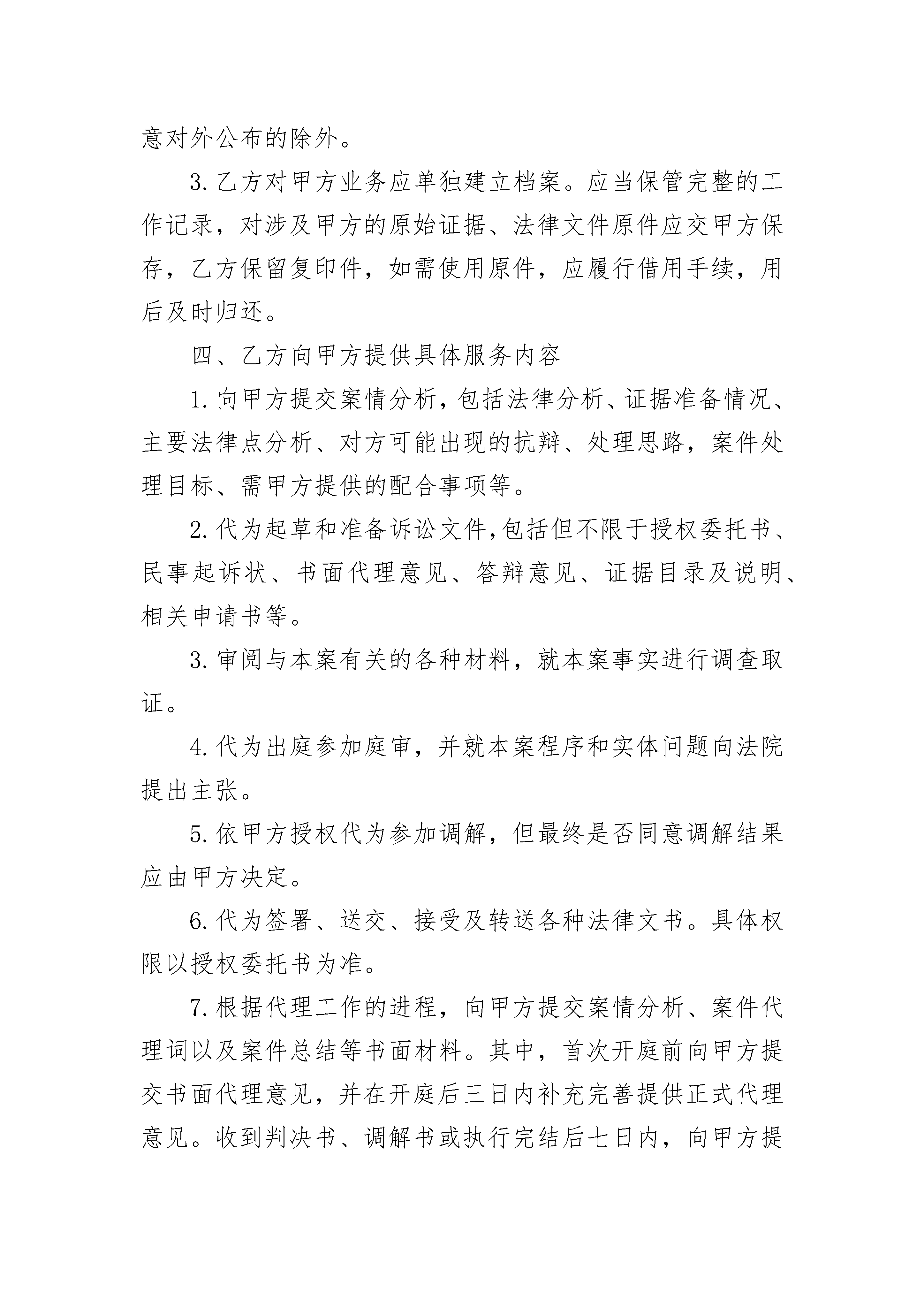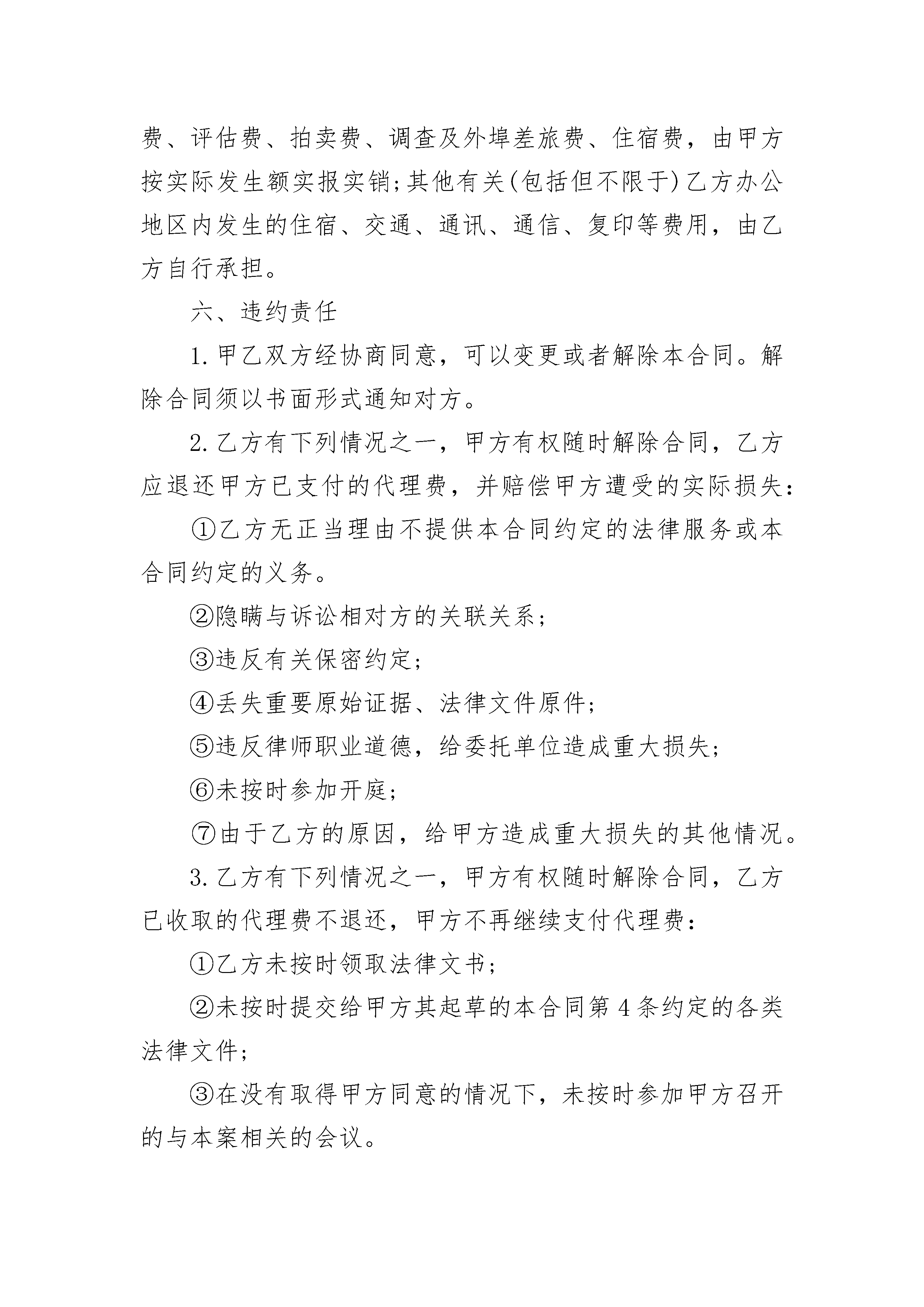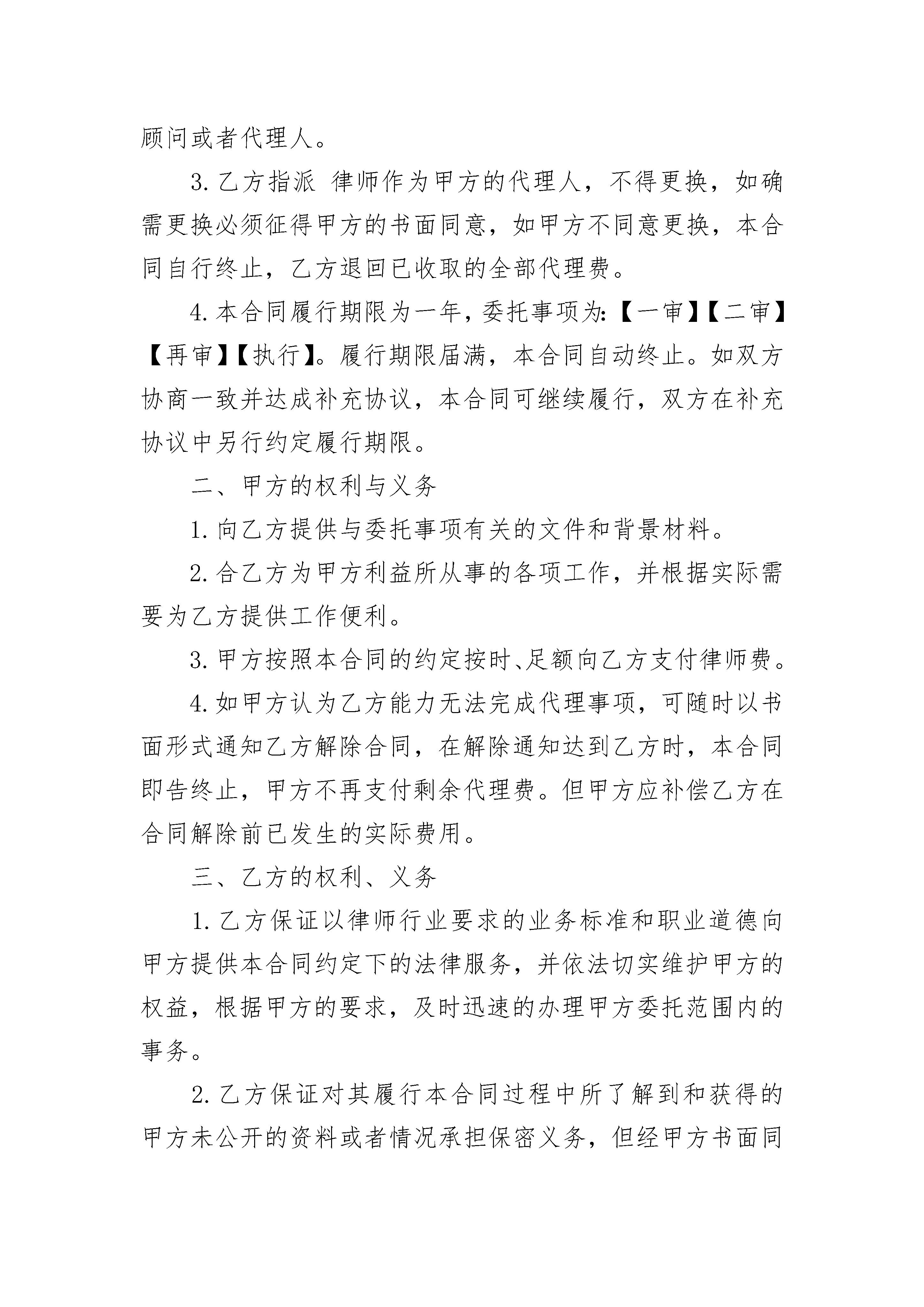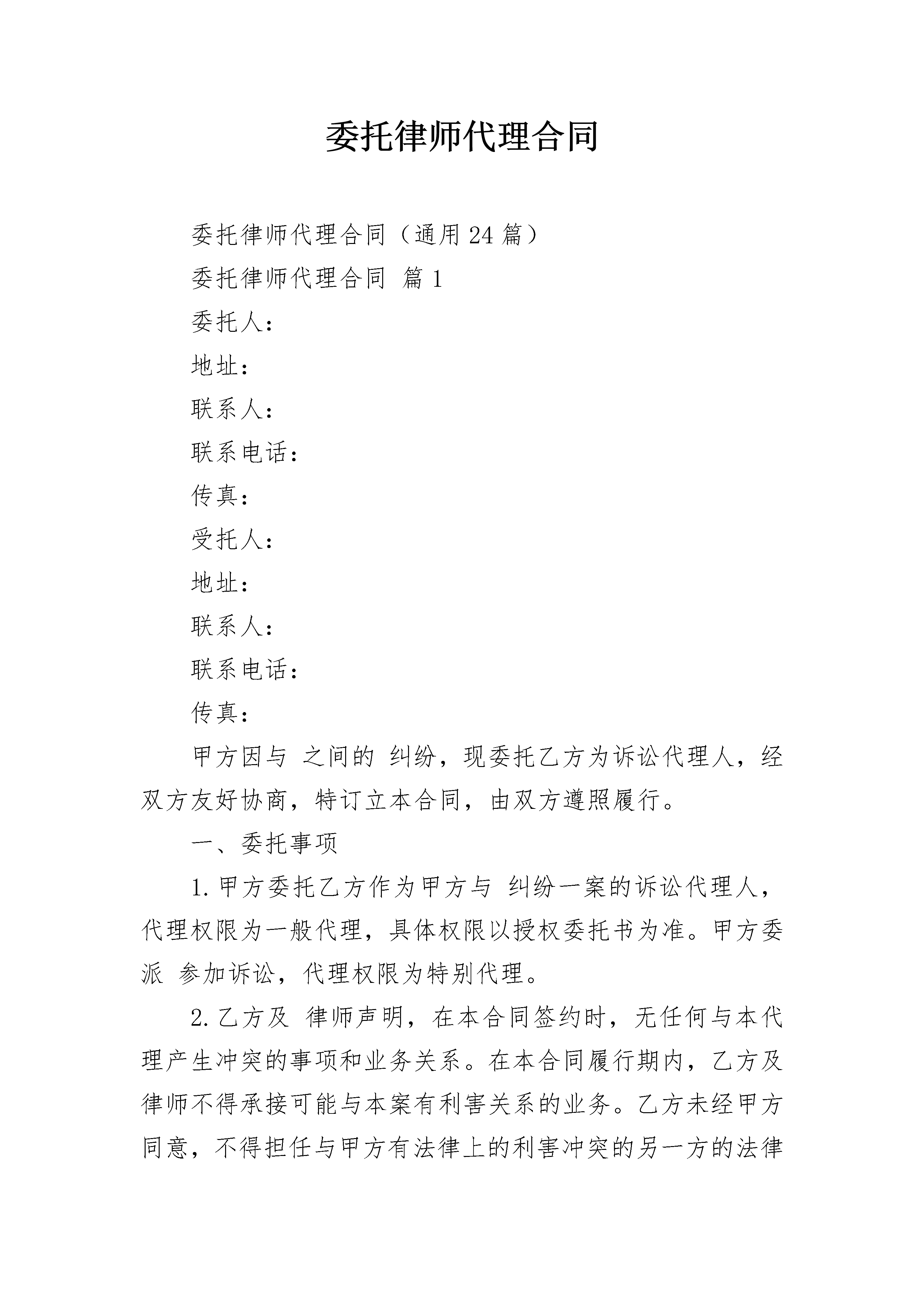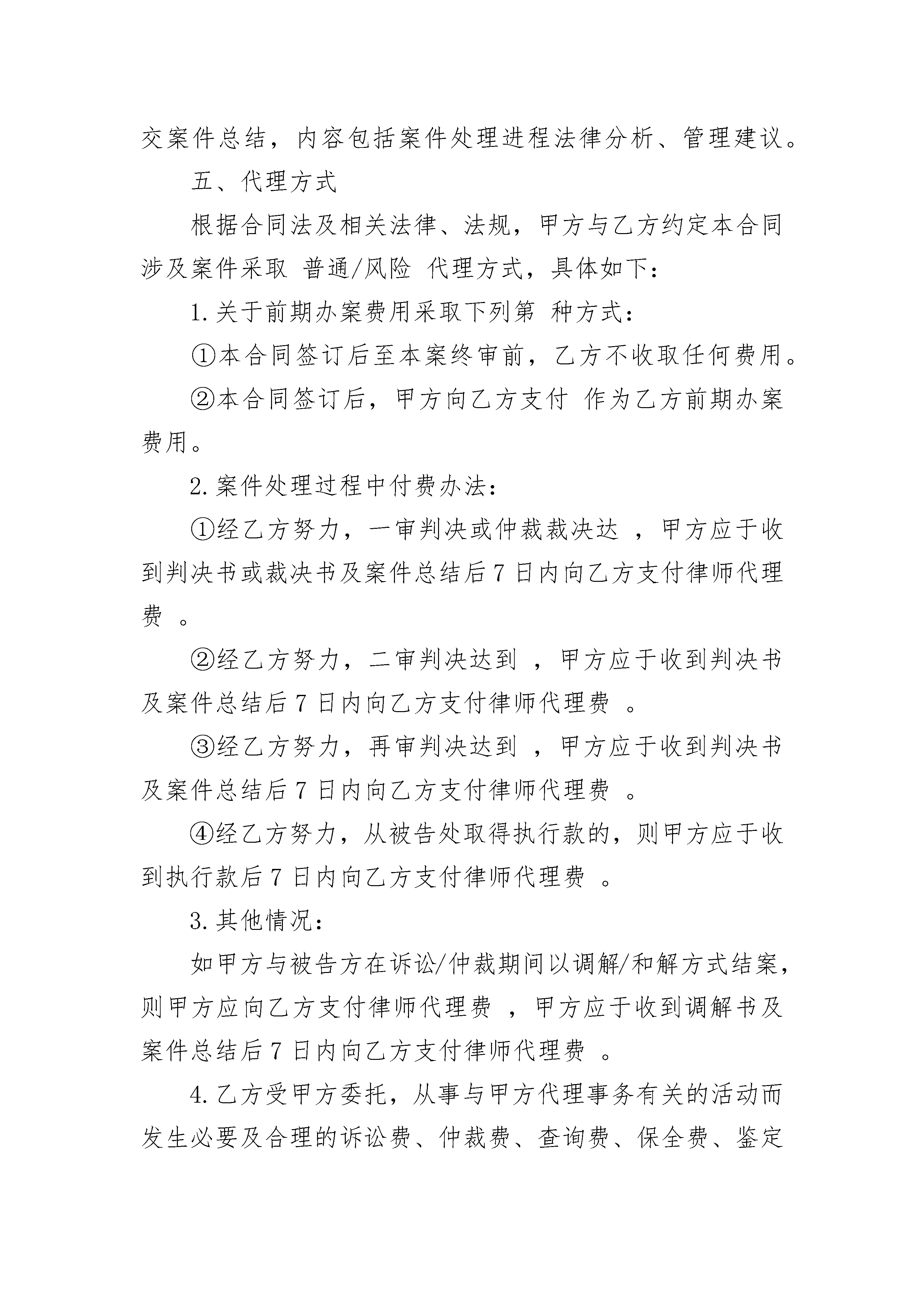 委托律师代理合同委托律师代理合同(通用24篇)委托律师代理合同篇1委托人:地址:联系人:联系电话:传真:受托人:地址:联系人:联系电话:传真:甲方因与之间的纠纷,现委托乙方为诉讼代理人,经双方友好协商,特订立本合同,由双方遵照履行。一、委托事项1.甲方委托乙方作为甲方与纠纷一案的诉讼代理人,代理权限为一般代理,具体权限以授权委托书为准。甲方委派参加诉讼,代理权限为特别代理。2.乙方及律师声明,在本合同签约时,无任何与本代理产生冲突的事项和业务关系。在本合同履行期内,乙方及律师不得承接可能与本案有利害关系的业务。乙方未经甲方同意,不得担任与甲方有法律上的利害冲突的另一方的法律顾问或者代理人。3.乙方指派律师作为甲方的代理人,不得更换,如确需更换必须征得甲方的书面同意,如甲方不同意更换,本合同自行终止,乙方退回已收取的全部代理费。4.本合同履行期限为一年,委托事项为:【一审】【二审】【再审】【执行】。履行期限届满,本合同自动终止。如双方协商一致并达成补充协议,本合同可继续履行,双方在补充协议中另行约定履行期限。二、甲方的权利与义务1.向乙方提供与委托事项有关的文件和背景材料。2.合乙方为甲方利益所从事的各项工作,并根据实际需要为乙方提供工作便利。3.甲方按照本合同的约定按时、足额向乙方支付律师费。4.如甲方认为乙方能力无法完成代理事项,可随时以书面形式通知乙方解除合同,在解除通知达到乙方时,本合同即告终止,甲方不再支付剩余代理费。但甲方应补偿乙方在合同解除前已发生的实际费用。三、乙方的权利、义务1.乙方保证以律师行业要求的业务标准和职业道德向甲方提供本合同约定下的法律服务,并依法切实维护甲方的权益,根据甲方的要求,及时迅速的办理甲方委托范围内的事务。2.乙方保证对其履行本合同过程中所了解到和获得的甲方未公开的资料或者情况承担保密义务,但经甲方书面同意对外公布的除外。3.乙方对甲方业务应单独建立档案。应当保管完整的工作记录,对涉及甲方的原始证据、法律文件原件应交甲方保存,乙方保留复印件,如需使用原件,应履行借用手续,用后及时归还。四、乙方向甲方提供具体服务内容1.向甲方提交案情分析,包括法律分析、证据准备情况、主要法律点分析、对方可能出现的抗辩、处理思路,案件处理目标、需甲方提供的配合事项等。2.代为起草和准备诉讼文件,包括但不限于授权委托书、民事起诉状、书面代理意见、答辩意见、证据目录及说明、相关申请书等。3.审阅与本案有关的各种材料,就本案事实进行调查取证。4.代为出庭参加庭审,并就本案程序和实体问题向法院提出主张。5.依甲方授权代为参加调解,但最终是否同意调解结果应由甲方决定。6.代为签署、送交、接受及转送各种法律文书。具体权限以授权委托书为准。7.根据代理工作的进程,向甲方提交案情分析、案件代理词以及案件总结等书面材料。其中,首次开庭前向甲方提交书面代理意见,并在开庭后三日内补充完善提供正式代理意见。收到判决书、调解书或执行完结后七日内,向甲方提交案件总结,内容包括案件处理进程法律分析、管理建议。五、代理方式根据合同法及相关法律、法规,甲方与乙方约定本合同涉及案件采取普通/风险代理方式,具体如下:1.关于前期办案费用采取下列第种方式:①本合同签订后至本案终审前,乙方不收取任何费用。②本合同签订后,甲方向乙方支付作为乙方前期办案费用。2.案件处理过程中付费办法:①经乙方努力,一审判决或仲裁裁决达,甲方应于收到判决书或裁决书及案件总结后7日内向乙方支付律师代理费。②经乙方努力,二审判决达到,甲方应于收到判决书及案件总结后7日内向乙方支付律师代理费。③经乙方努力,再审判决达到,甲方应于收到判决书及案件总结后7日内向乙方支付律师代理费。④经乙方努力,从被告处取得执行款的,则甲方应于收到执行款后7日内向乙方支付律师代理费。3.其他情况:如甲方与被告方在诉讼/仲裁期间以调解/和解方式结案,则甲方应向乙方支付律师代理费,甲方应于收到调解书及案件总结后7日内向乙方支付律师代理费。4.乙方受甲方委托,从事与甲方代理事务有关的活动而发生必要及合理的诉讼费、仲裁费、查询费、保全费、鉴定费、评估费、拍卖费、调查及外埠差旅费、住宿费,由甲方按实际发生额实报实销;其他有关(包括但不限于)乙方办公地区内发生的住宿、交通、通讯、通信、复印等费用,由乙方自行承担。六、违约责任1.甲乙双方经协商同意,可以变更或者解除本合同。解除合同须以书面形式通知对方。2.乙方有下列情况之一,甲方有权随时解除合同,乙方应退还甲方已支付的代理费,并赔偿甲方遭受的实际损失:①乙方无正当理由不提供本合同约定的法律服务或本合同约定的义务。②隐瞒与诉讼相对方的关联关系;③违反有关保密约定;④丢失重要原始证据、法律文件原件;⑤违反律师职业道德,给委托单位造成重大损失;⑥未按时参加开