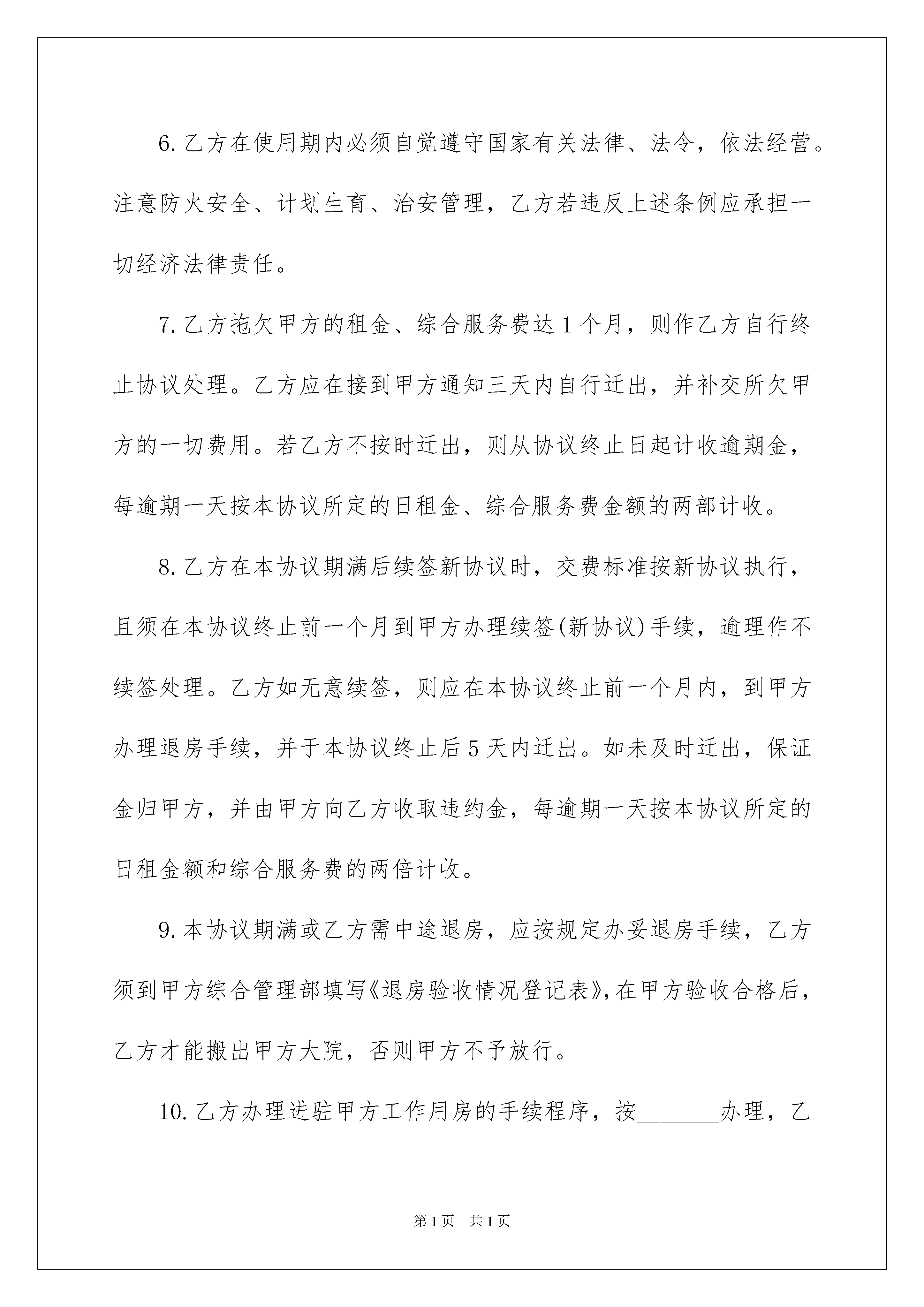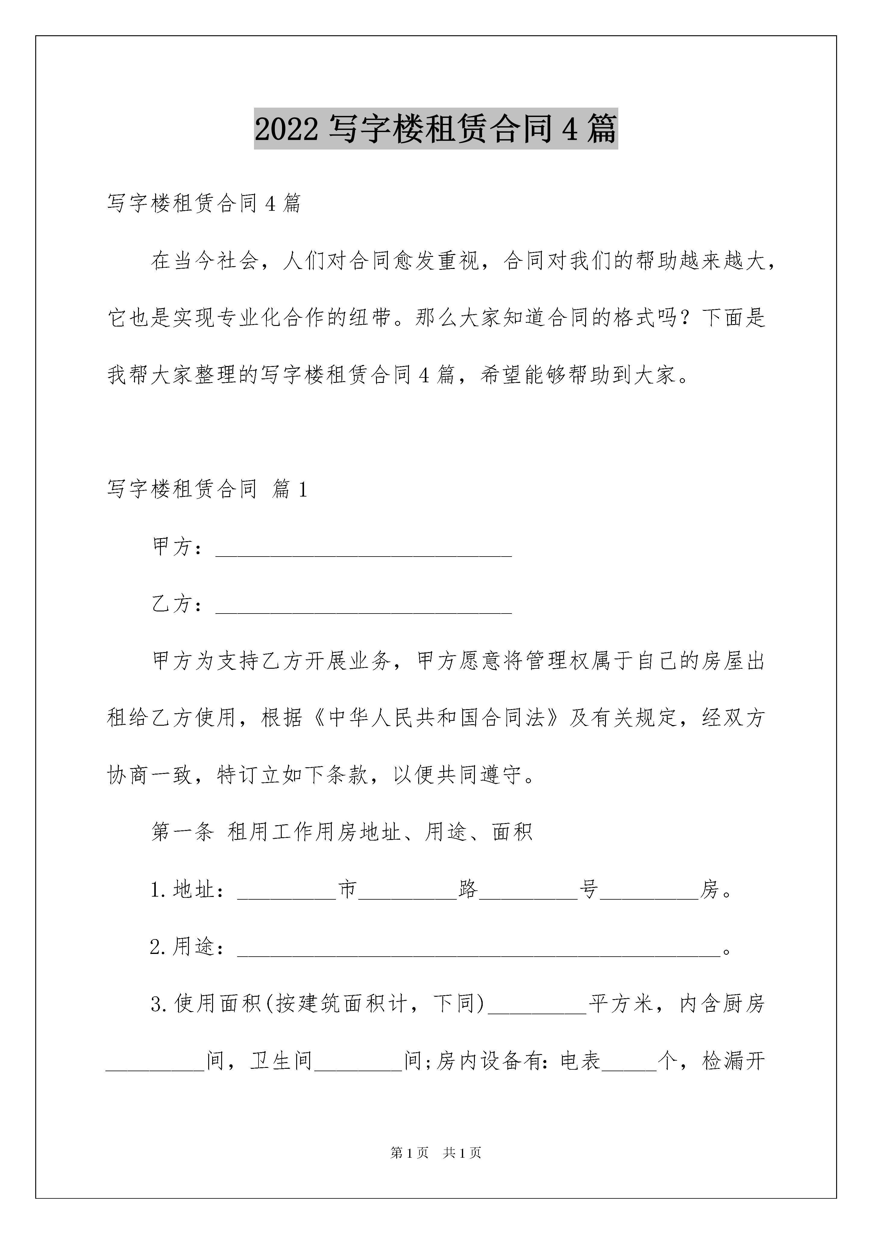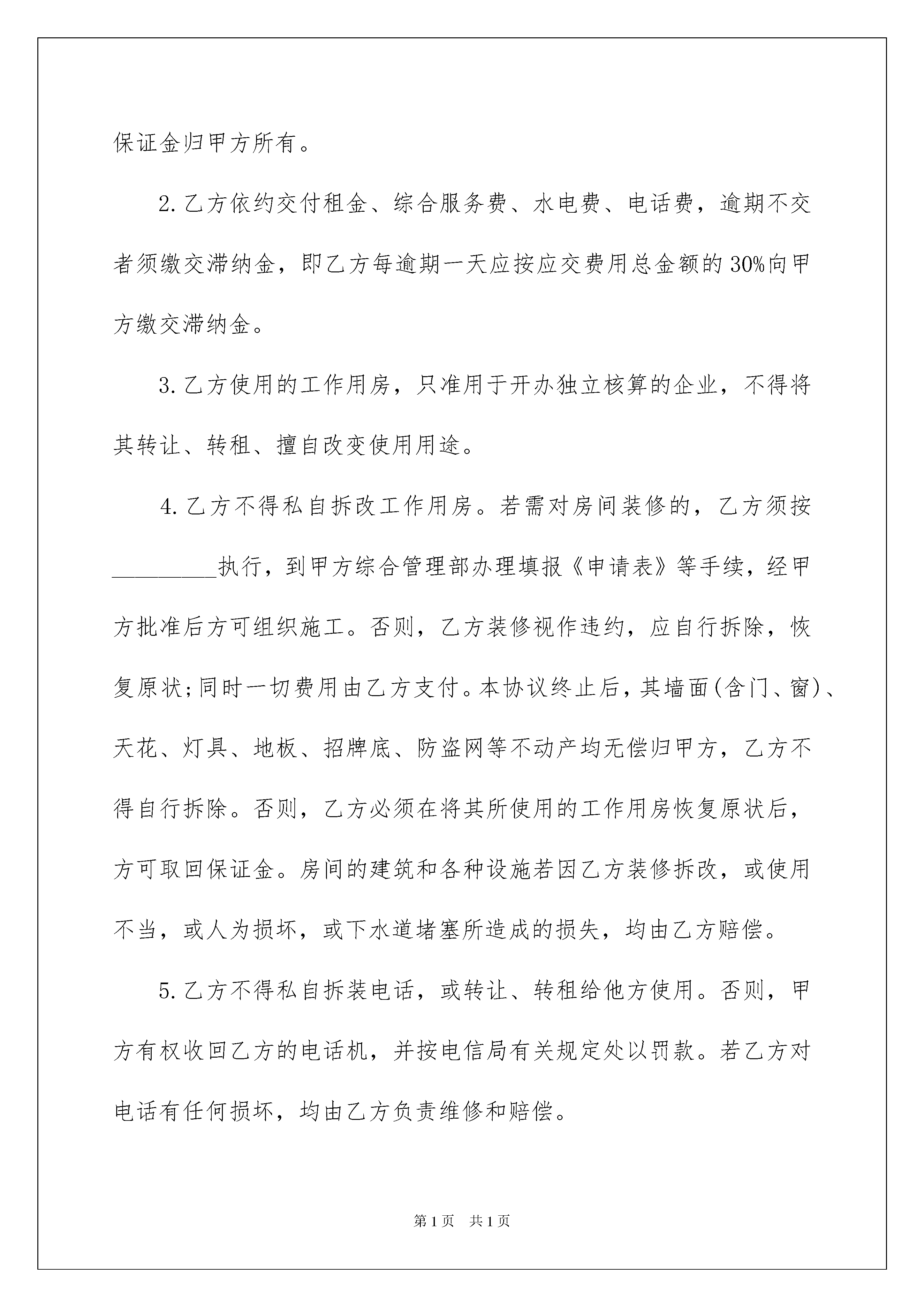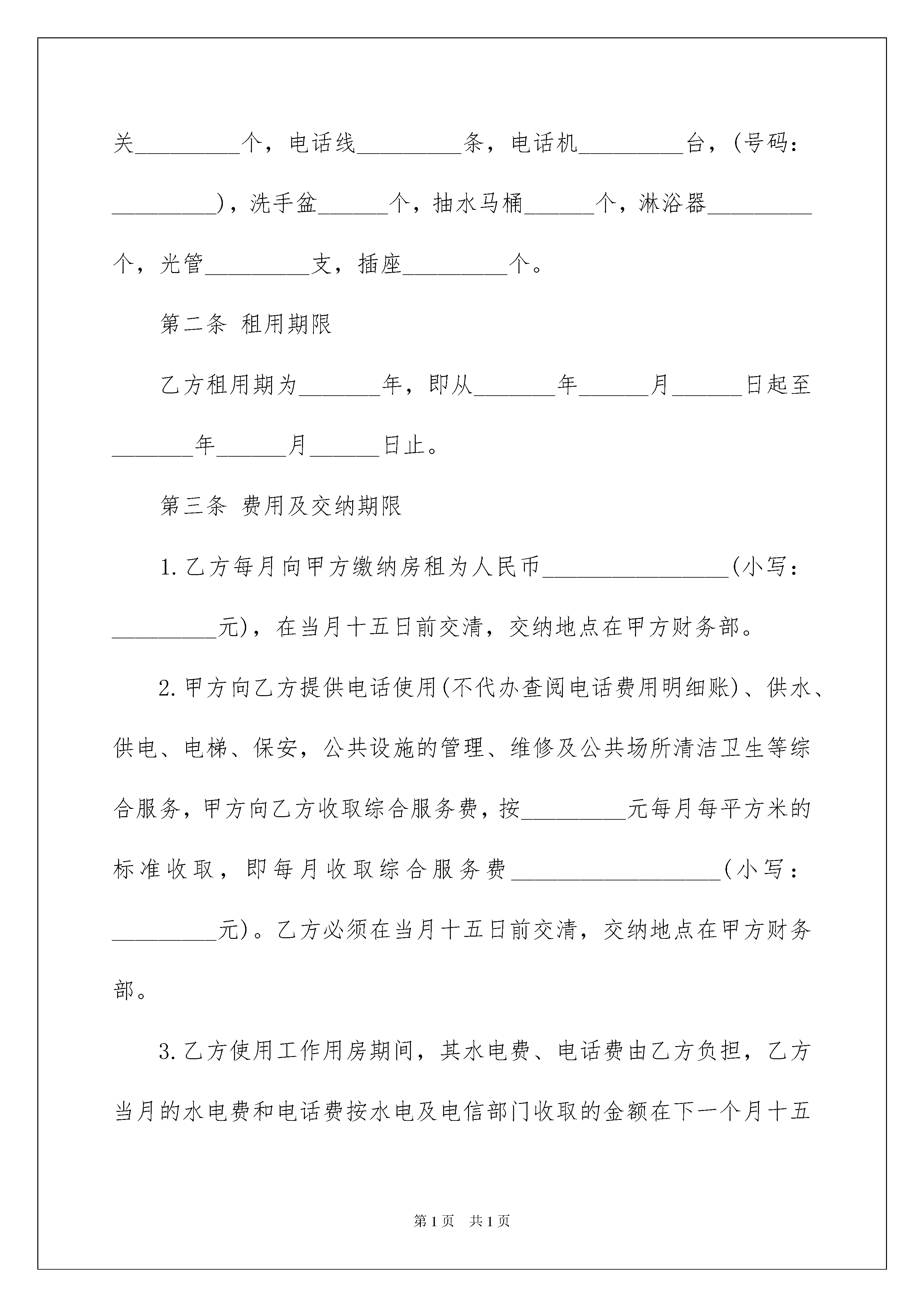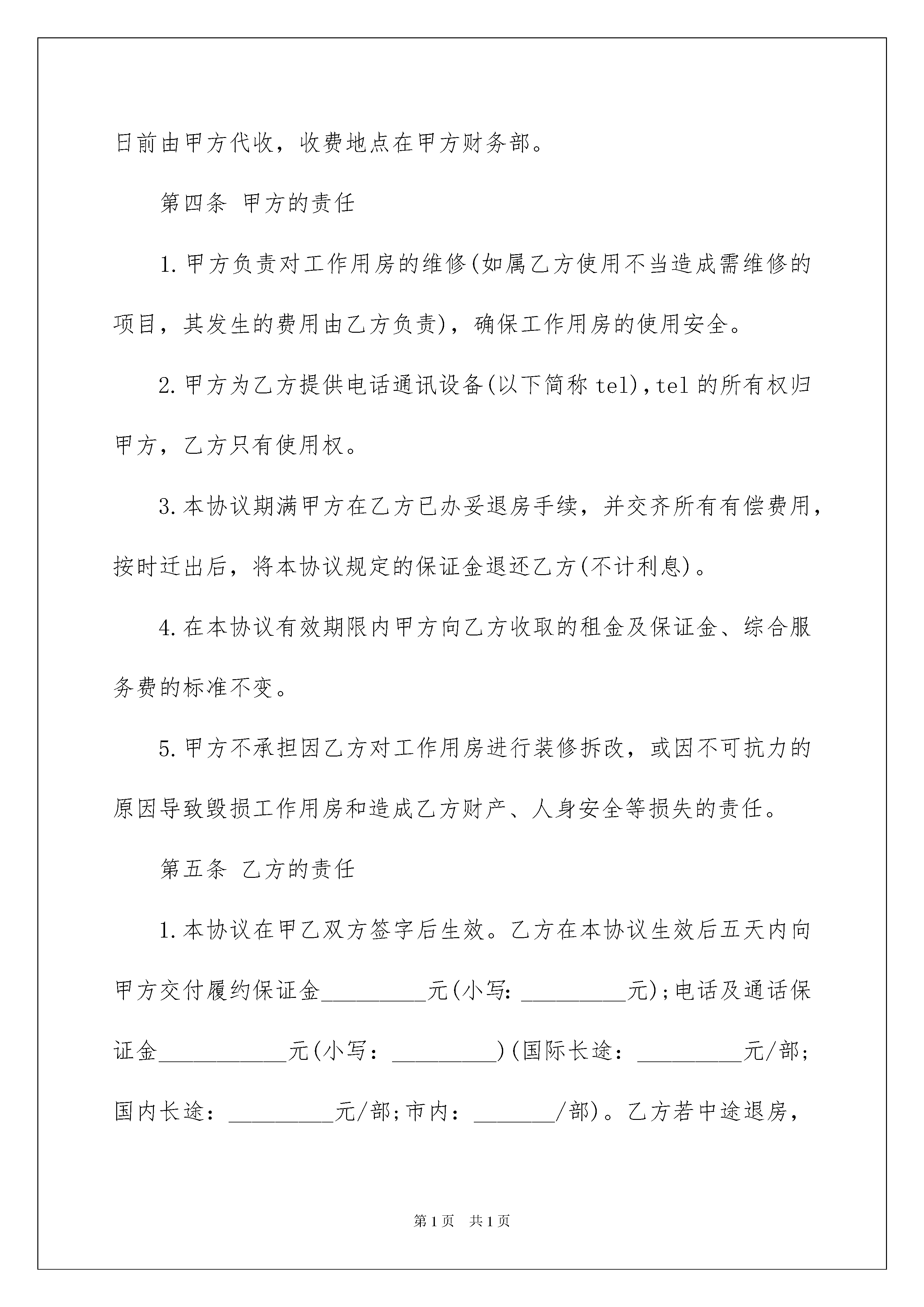 2022写字楼租赁合同4篇写字楼租赁合同4篇在当今社会,人们对合同愈发重视,合同对我们的帮助越来越大,它也是实现专业化合作的纽带。那么大家知道合同的格式吗?下面是我帮大家整理的写字楼租赁合同4篇,希望能够帮助到大家。写字楼租赁合同篇1甲方:___________________________乙方:___________________________甲方为支持乙方开展业务,甲方愿意将管理权属于自己的房屋出租给乙方使用,根据《中华人民共和国合同法》及有关规定,经双方协商一致,特订立如下条款,以便共同遵守。第一条租用工作用房地址、用途、面积1.地址:_________市_________路_________号_________房。2.用途:____________________________________________。3.使用面积(按建筑面积计,下同)_________平方米,内含厨房_________间,卫生间________间;房内设备有:电表_____个,检漏开关_________个,电话线_________条,电话机_________台,(号码:_________),洗手盆______个,抽水马桶______个,淋浴器_________个,光管_________支,插座_________个。第二条租用期限乙方租用期为_______年,即从_______年______月______日起至_______年______月______日止。第三条费用及交纳期限1.乙方每月向甲方缴纳房租为人民币________________(小写:_________元),在当月十五日前交清,交纳地点在甲方财务部。2.甲方向乙方提供电话使用(不代办查阅电话费用明细账)、供水、供电、电梯、保安,公共设施的管理、维修及公共场所清洁卫生等综合服务,甲方向乙方收取综合服务费,按_________元每月每平方米的标准收取,即每月收取综合服务费__________________(小写:_________元)。乙方必须在当月十五日前交清,交纳地点在甲方财务部。3.乙方使用工作用房期间,其水电费、电话费由乙方负担,乙方当月的水电费和电话费按水电及电信部门收取的金额在下一个月十五日前由甲方代收,收费地点在甲方财务部。第四条甲方的责任1.甲方负责对工作用房的维修(如属乙方使用不当造成需维修的项目,其发生的费用由乙方负责),确保工作用房的使用安全。2.甲方为乙方提供电话通讯设备(以下简称tel),tel的所有权归甲方,乙方只有使用权。3.本协议期满甲方在乙方已办妥退房手续,并交齐所有有偿费用,按时迁出后,将本协议规定的保证金退还乙方(不计利息)。4.在本协议有效期限内甲方向乙方收取的租金及保证金、综合服务费的标准不变。5.甲方不承担因乙方对工作用房进行装修拆改,或因不可抗力的原因导致毁损工作用房和造成乙方财产、人身安全等损失的责任。第五条乙方的责任1.本协议在甲乙双方签字后生效。乙方在本协议生效后五天内向甲方交付履约保证金_________元(小写:_________元);电话及通话保证金___________元(小写:_________)(国际长途:_________元/部;国内长途:_________元/部;市内:_______/部)。乙方若中途退房,保证金归甲方所有。2.乙方依约交付租金、综合服务费、水电费、电话费,逾期不交者须缴交滞纳金,即乙方每逾期一天应按应交费用总金额的30%向甲方缴交滞纳金。3.乙方使用的工作用房,只准用于开办独立核算的企业,不得将其转让、转租、擅自改变使用用途。4.乙方不得私自拆改工作用房。若需对房间装修的,乙方须按_________执行,到甲方综合管理部办理填报《申请表》等手续,经甲方批准后方可组织施工。否则,乙方装修视作违约,应自行拆除,恢复原状;同时一切费用由乙方支付。本协议终止后,其墙面(含门、窗)、天花、灯具、地板、招牌底、防盗网等不动产均无偿归甲方,乙方不得自行拆除。否则,乙方必须在将其所使用的工作用房恢复原状后,方可取回保证金。房间的建筑和各种设施若因乙方装修拆改,或使用不当,或人为损坏,或下水道堵塞所造成的损失,均由乙方赔偿。5.乙方不得私自拆装电话,或转让、转租给他方使用。否则,甲方有权收回乙方的电话机,并按电信局有关规定处以罚款。若乙方对电话有任何损坏,均由乙方负责维修和赔偿。6.乙方在使用期内必须自觉遵守国家有关法律、法令,依法经营。注意防火安全、计划生育、治安管理,乙方若违反上述条例应承担一切经济法律责任。7.乙方拖欠甲方的租金、综合服务费达1个