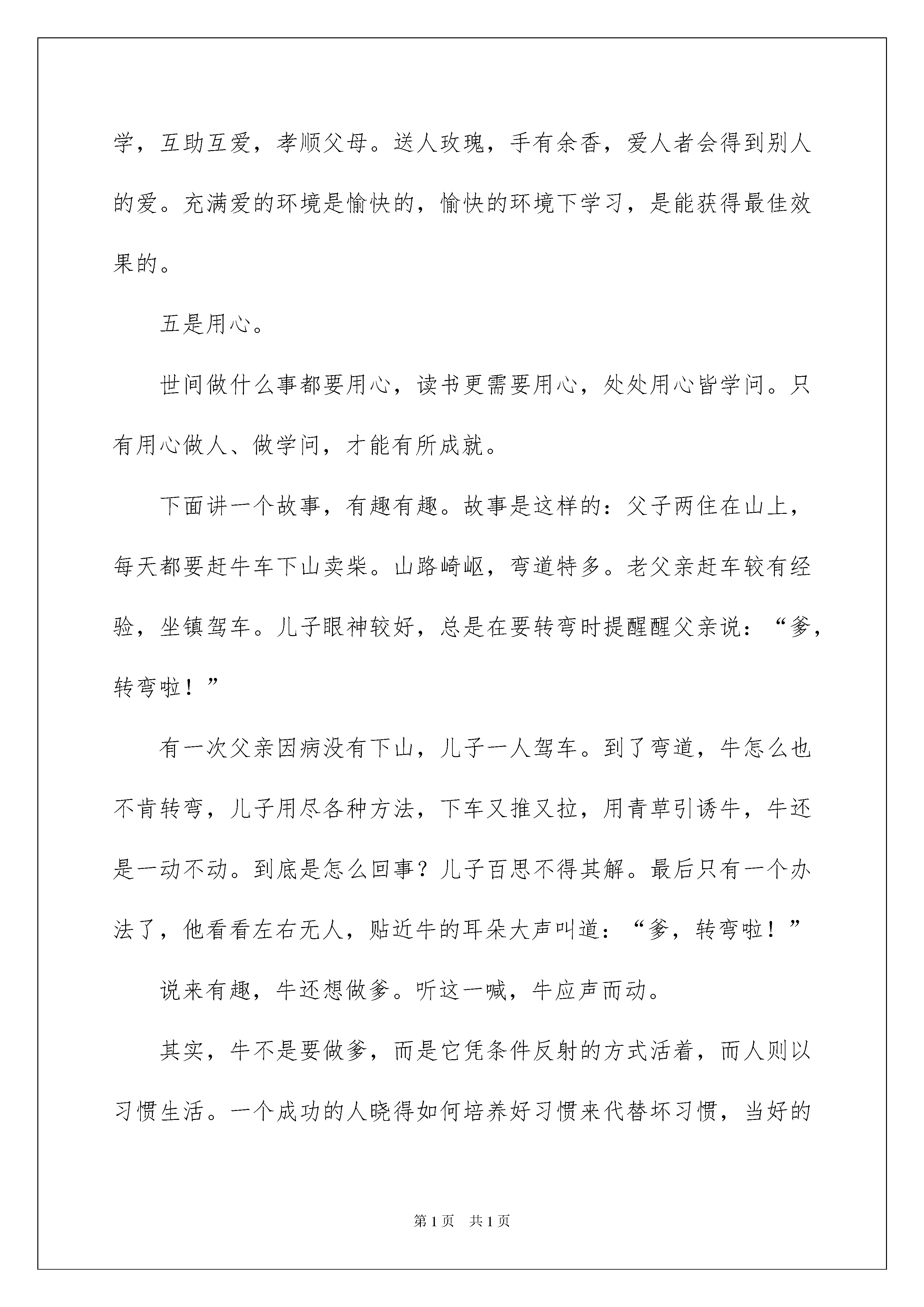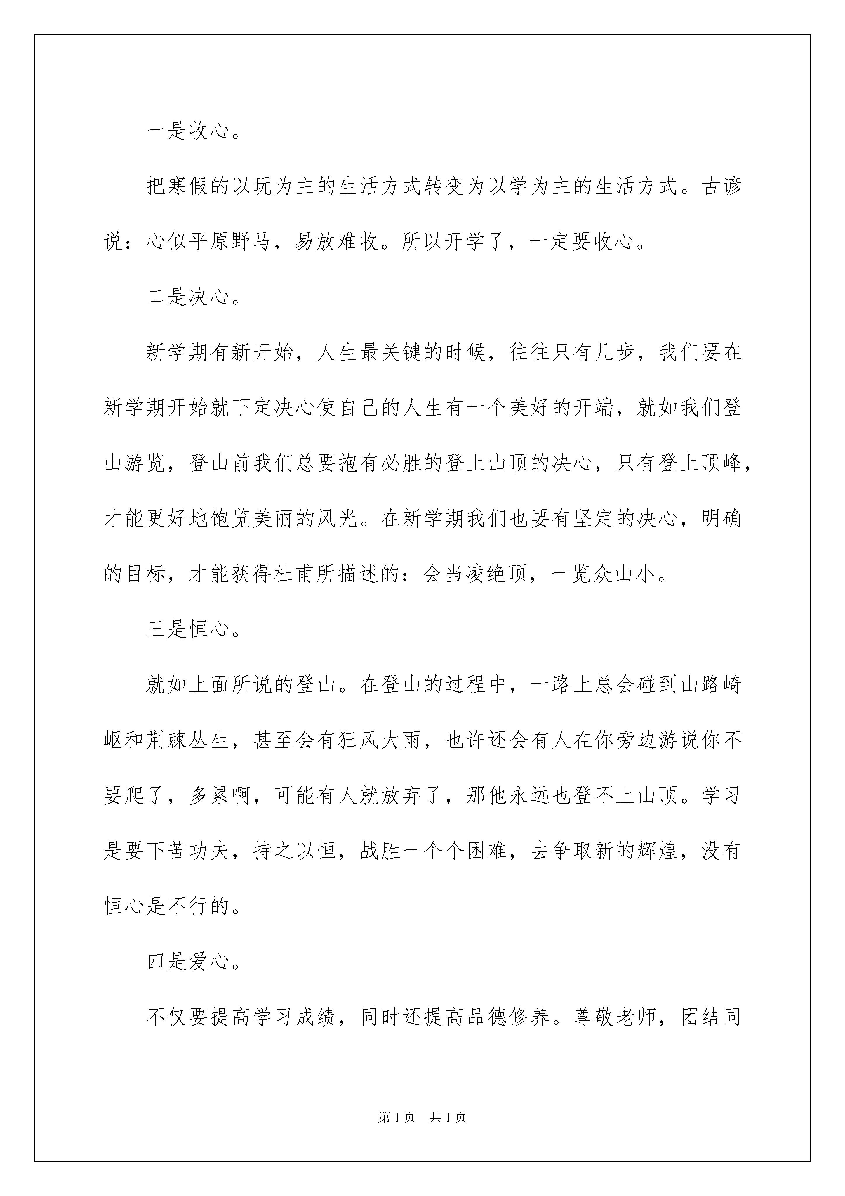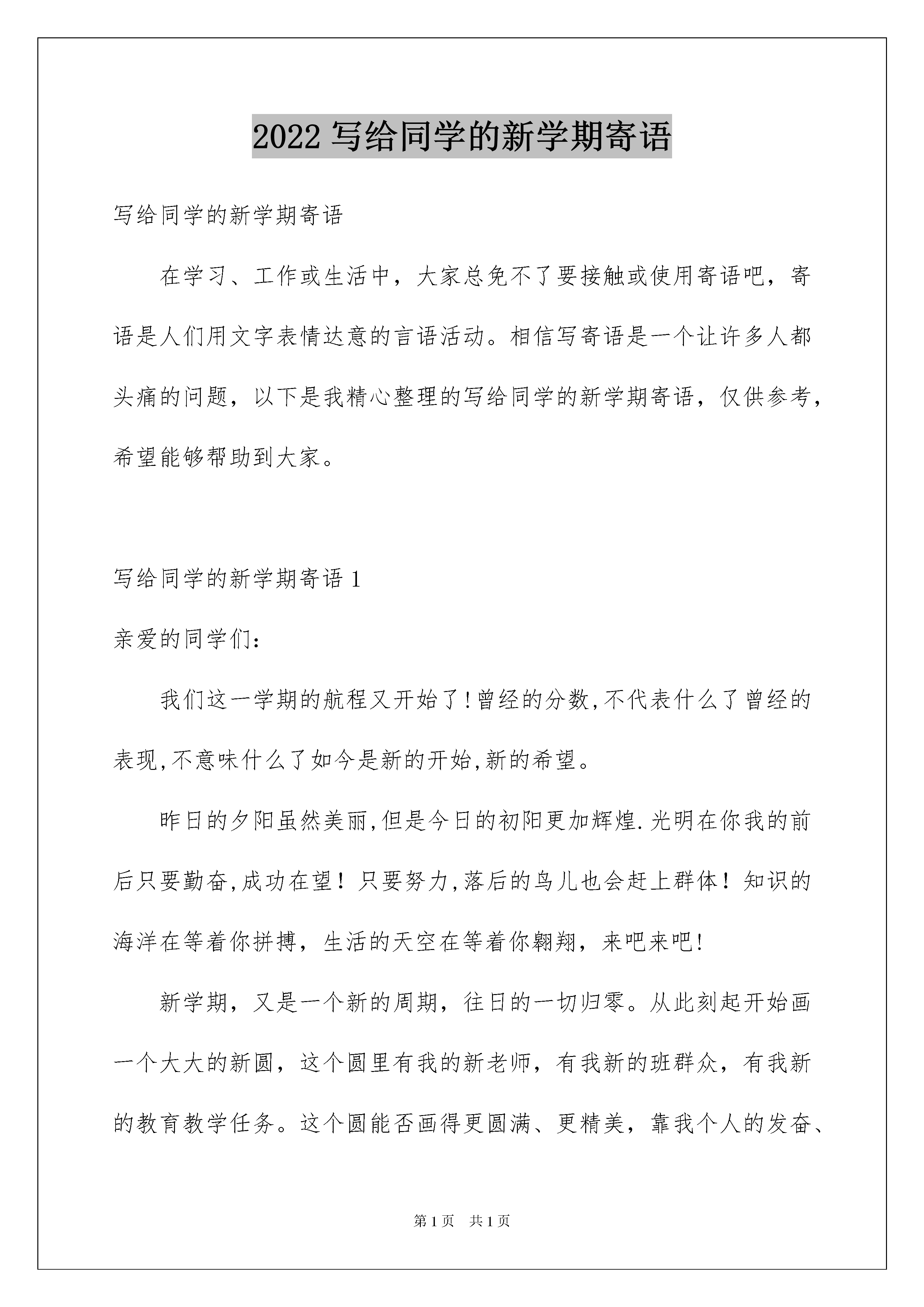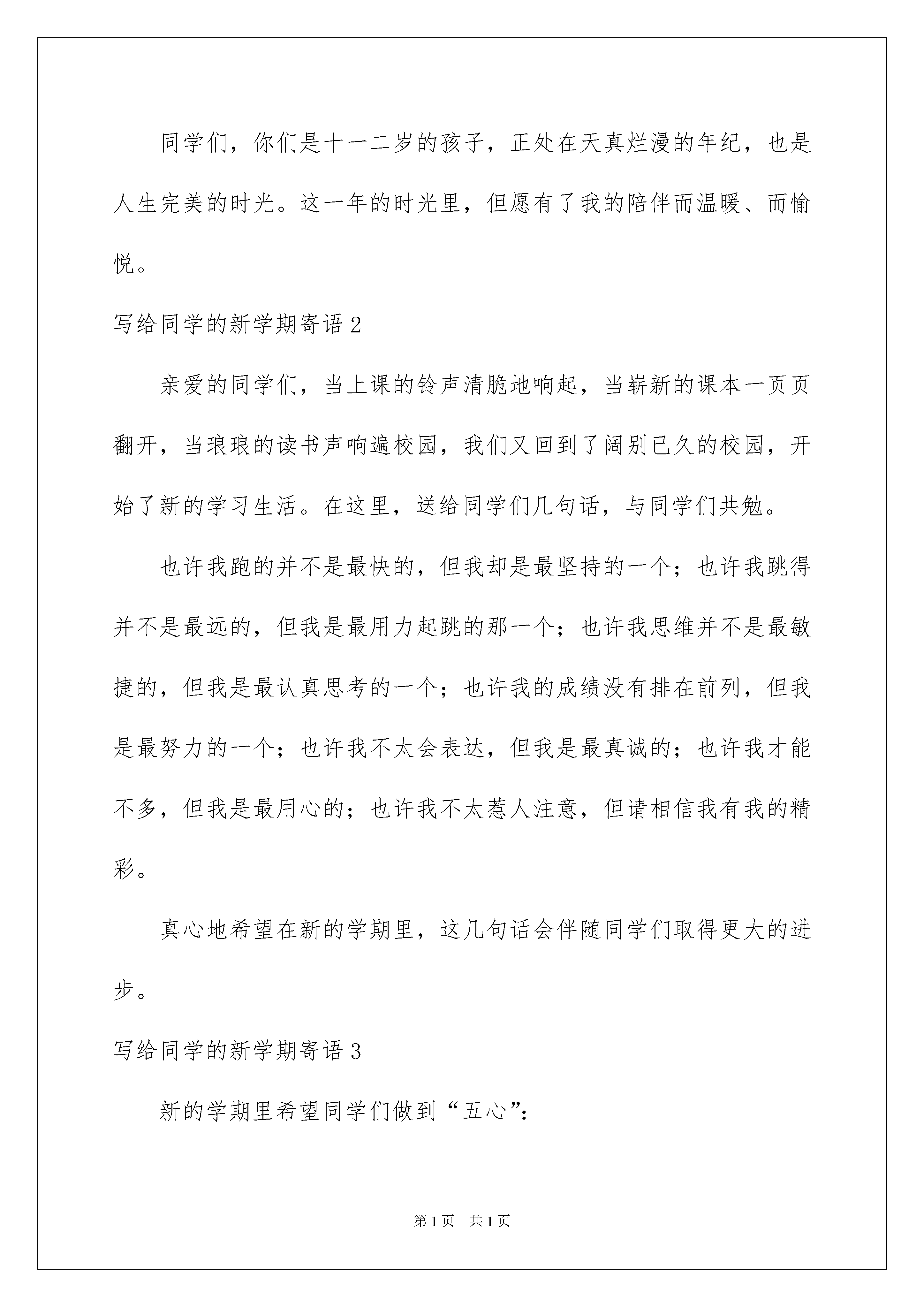 2022写给同学的新学期寄语写给同学的新学期寄语在学习、工作或生活中,大家总免不了要接触或使用寄语吧,寄语是人们用文字表情达意的言语活动。相信写寄语是一个让许多人都头痛的问题,以下是我精心整理的写给同学的新学期寄语,仅供参考,希望能够帮助到大家。写给同学的新学期寄语1亲爱的同学们:我们这一学期的航程又开始了!曾经的分数,不代表什么了曾经的表现,不意味什么了如今是新的开始,新的希望。昨日的夕阳虽然美丽,但是今日的初阳更加辉煌.光明在你我的前后只要勤奋,成功在望!只要努力,落后的鸟儿也会赶上群体!知识的海洋在等着你拼搏,生活的天空在等着你翱翔,来吧来吧!新学期,又是一个新的周期,往日的一切归零。从此刻起开始画一个大大的新圆,这个圆里有我的新老师,有我新的班群众,有我新的教育教学任务。这个圆能否画得更圆满、更精美,靠我个人的发奋、更有我和学生们齐心协力、共同描画。我坚信这个圆会五彩缤纷、精美绝伦,我期盼这个圆里的咱们更上进、更愉悦、更活跃,多出佳绩。此刻,最期盼的就是我的学生。今年我会和哪几十位学生有缘相聚呢?共同领悟的一年里又将发生怎样的精彩故事呢?作为班主任的我看着一个个学生的名字,开始默默地想象着你们的笑容,耳畔仿佛听到你们的俏皮话语,勾画着咱们班级的完美蓝图。新的学年,也是你们在小学领悟生活的最后一年。在这最后一年里,由我和你们共同度过。不管你们遇到领悟和生活中的任何事,我将竭尽全力帮忙你们;你们有什么不开心的事能够对我诉说,你们有什么高兴的事我能够帮着分享。老师的心会和你们一齐跳跃、一齐感受。同学们,你们在六年级的领悟任务很重,面临着升学。虽然,此刻升学不用考试,但一些跨区域及私立初中仍是按分数录取。即使不考试能上初中,也要把基本的学科知识牢固掌握,为将来的领悟打好基础。这一年,家长也会对你们要求更严格,要求你们顺利完成小学阶段的领悟,以优异的成绩进入高一级的阶段领悟,因此,你们肩上的任务会很重。期望你们把压力转化为领悟的动力,发奋进取,用心拼搏,打造出属于自我的辉煌。同学们,你们是十一二岁的孩子,正处在天真烂漫的年纪,也是人生完美的时光。这一年的时光里,但愿有了我的陪伴而温暖、而愉悦。写给同学的新学期寄语2亲爱的同学们,当上课的铃声清脆地响起,当崭新的课本一页页翻开,当琅琅的读书声响遍校园,我们又回到了阔别已久的校园,开始了新的学习生活。在这里,送给同学们几句话,与同学们共勉。也许我跑的并不是最快的,但我却是最坚持的一个;也许我跳得并不是最远的,但我是最用力起跳的那一个;也许我思维并不是最敏捷的,但我是最认真思考的一个;也许我的成绩没有排在前列,但我是最努力的一个;也许我不太会表达,但我是最真诚的;也许我才能不多,但我是最用心的;也许我不太惹人注意,但请相信我有我的精彩。真心地希望在新的学期里,这几句话会伴随同学们取得更大的进步。写给同学的新学期寄语3新的学期里希望同学们做到“五心”:一是收心。把寒假的以玩为主的生活方式转变为以学为主的生活方式。古谚说:心似平原野马,易放难收。所以开学了,一定要收心。二是决心。新学期有新开始,人生最关键的时候,往往只有几步,我们要在新学期开始就下定决心使自己的人生有一个美好的开端,就如我们登山游览,登山前我们总要抱有必胜的登上山顶的决心,只有登上顶峰,才能更好地饱览美丽的风光。在新学期我们也要有坚定的决心,明确的目标,才能获得杜甫所描述的:会当凌绝顶,一览众山小。三是恒心。就如上面所说的登山。在登山的过程中,一路上总会碰到山路崎岖和荆棘丛生,甚至会有狂风大雨,也许还会有人在你旁边游说你不要爬了,多累啊,可能有人就放弃了,那他永远也登不上山顶。学习是要下苦功夫,持之以恒,战胜一个个困难,去争取新的辉煌,没有恒心是不行的。四是爱心。不仅要提高学习成绩,同时还提高品德修养。尊敬老师,团结同学,互助互爱,孝顺父母。送人玫瑰,手有余香,爱人者会得到别人的爱。充满爱的环境是愉快的,愉快的环境下学习,是能获得最佳效果的。五是用心。世间做什么事都要用心,读书更需要用心,处处用心皆学问。只有用心做人、做学问,才能有所成就。下面讲一个故事,有趣有趣。故事是这样的:父子两住在山上,每天都要赶牛车下山卖柴。山路崎岖,弯道特多。老父亲赶车较有经验,坐镇驾车。儿子眼神较好,总是在要转弯时提醒醒父亲说:“爹,转弯啦!”有一次父亲因病没有下山,儿子一人驾车。到了弯道,牛怎么也不肯转弯,儿子用尽各种方法,下车又推又拉,用青草引诱牛,牛还是一动不动。到底是怎么回事?儿子百思不得其解。最后只有一个办法了,他看看左右无人,贴近牛的耳朵大声叫道:“爹,转弯啦!”说来有趣,牛