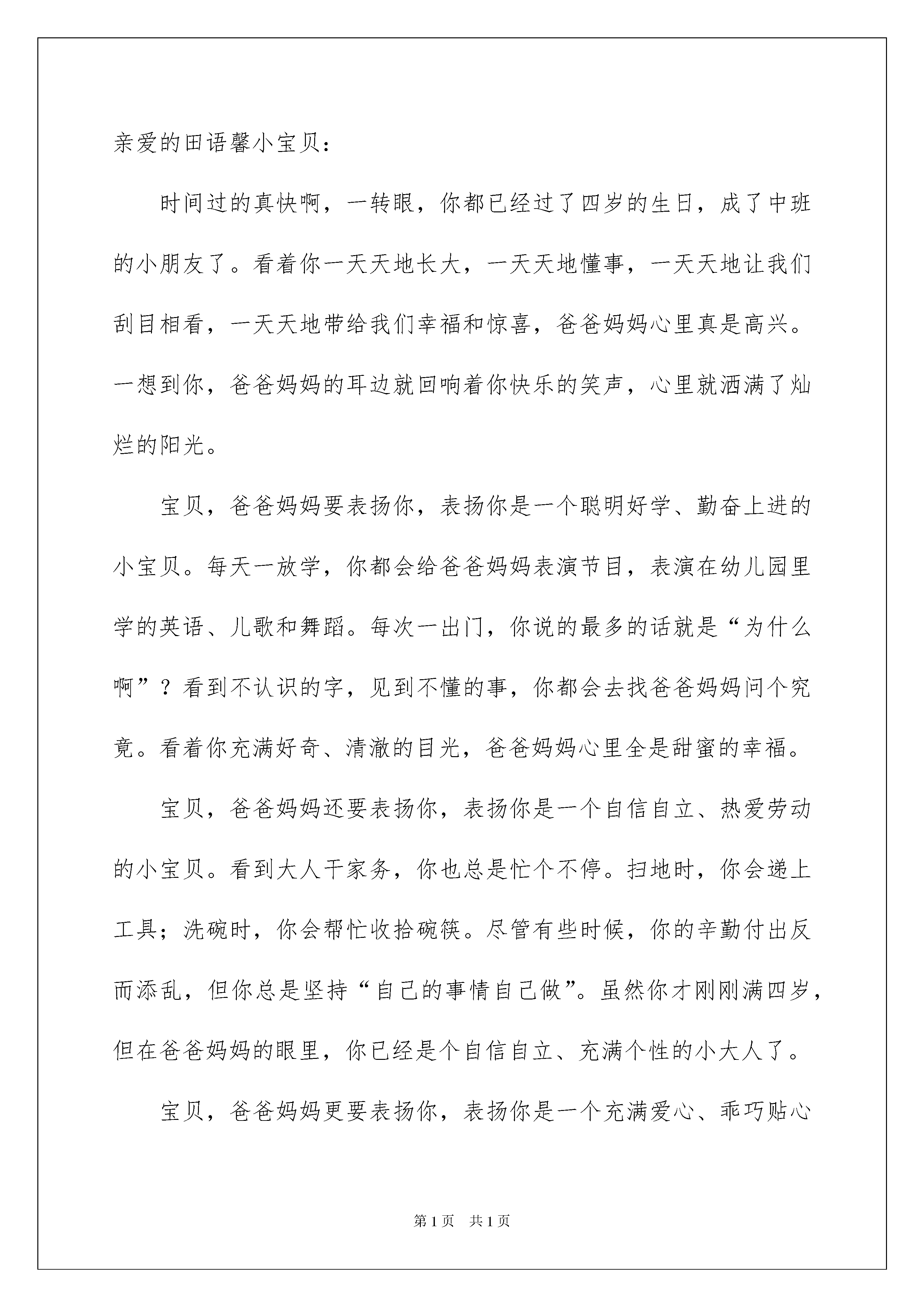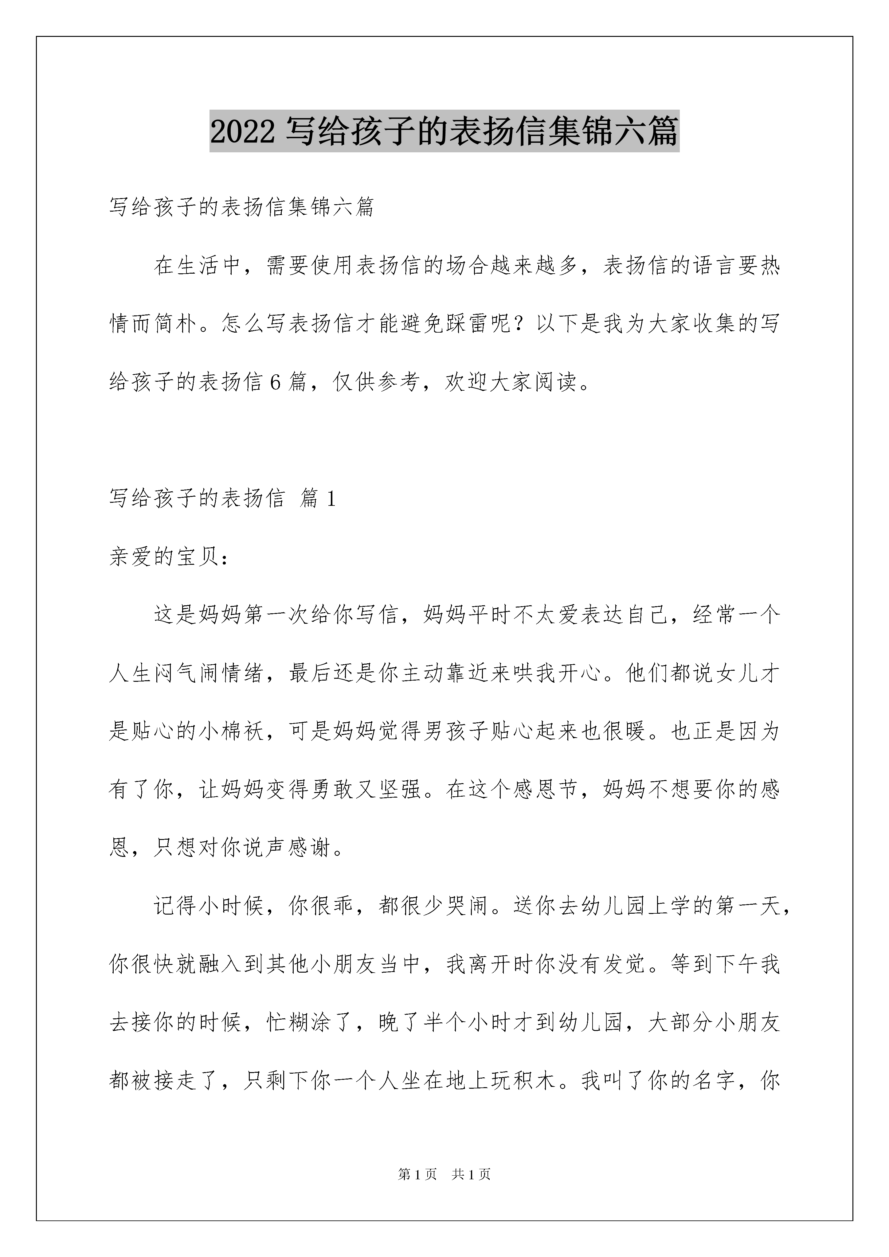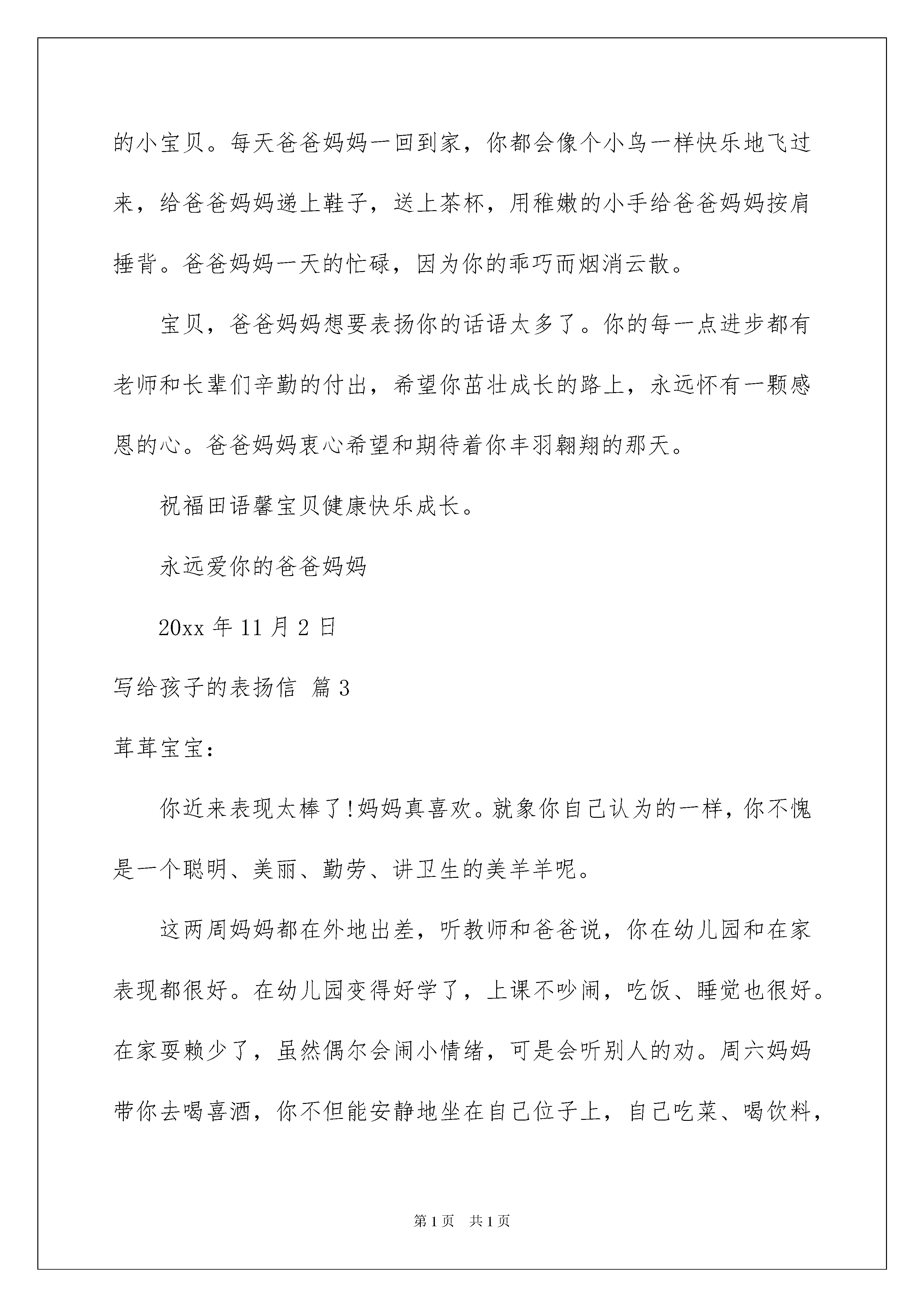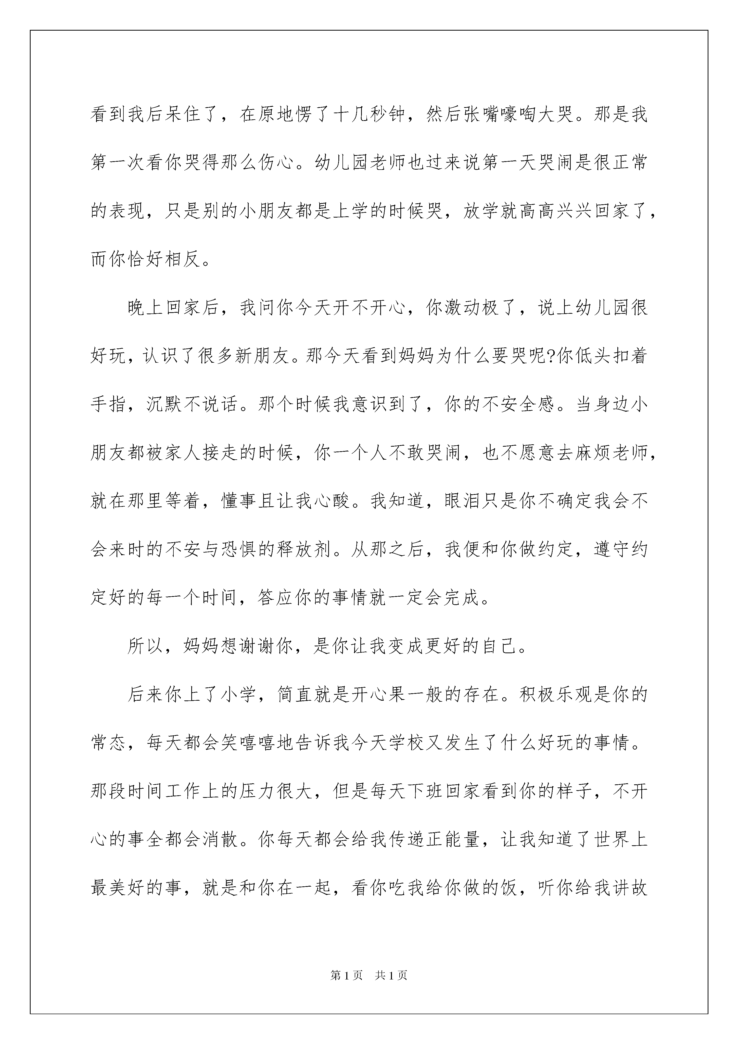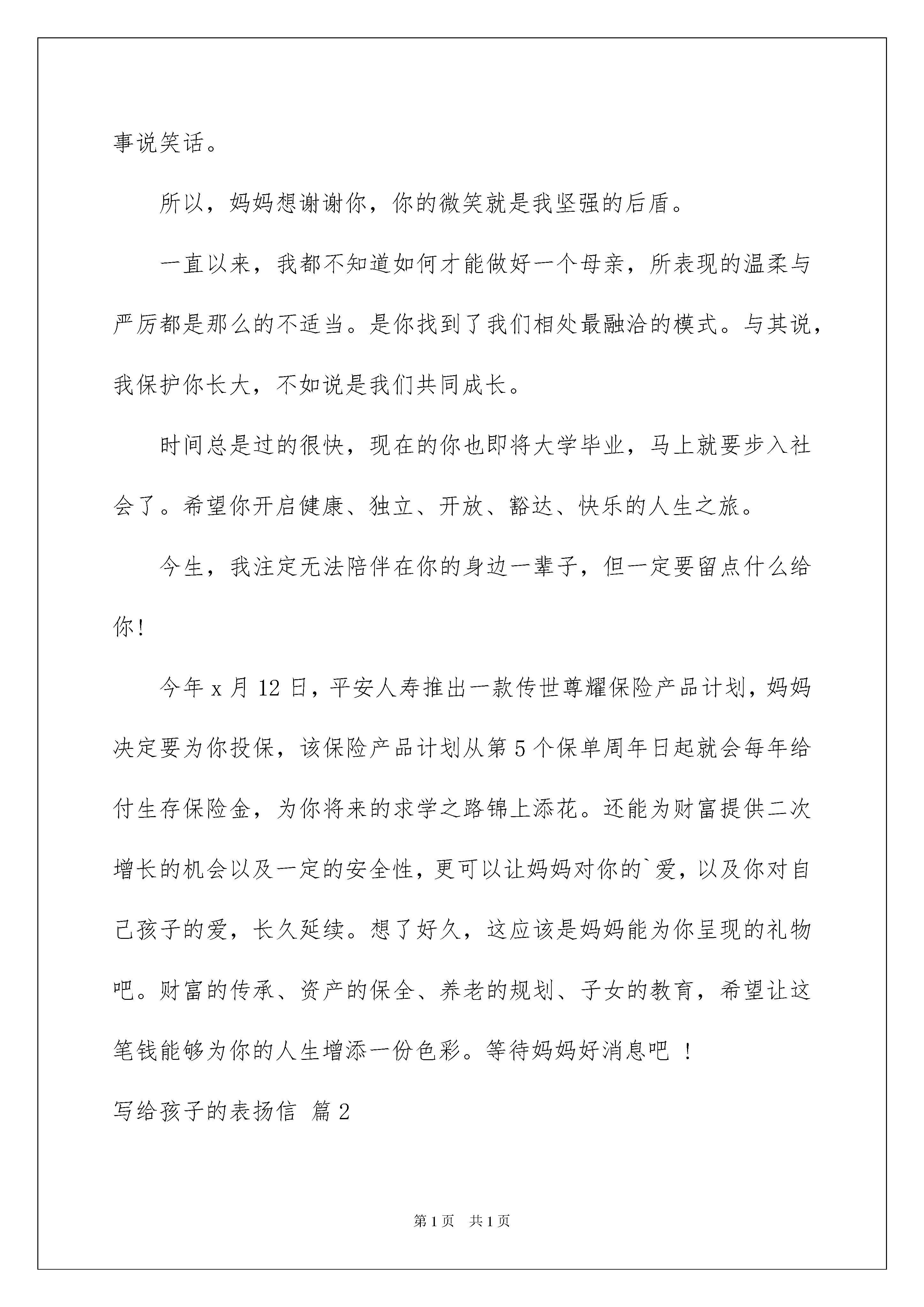 2022写给孩子的表扬信集锦六篇写给孩子的表扬信集锦六篇在生活中,需要使用表扬信的场合越来越多,表扬信的语言要热情而简朴。怎么写表扬信才能避免踩雷呢?以下是我为大家收集的写给孩子的表扬信6篇,仅供参考,欢迎大家阅读。写给孩子的表扬信篇1亲爱的宝贝:这是妈妈第一次给你写信,妈妈平时不太爱表达自己,经常一个人生闷气闹情绪,最后还是你主动靠近来哄我开心。他们都说女儿才是贴心的小棉袄,可是妈妈觉得男孩子贴心起来也很暖。也正是因为有了你,让妈妈变得勇敢又坚强。在这个感恩节,妈妈不想要你的感恩,只想对你说声感谢。记得小时候,你很乖,都很少哭闹。送你去幼儿园上学的第一天,你很快就融入到其他小朋友当中,我离开时你没有发觉。等到下午我去接你的时候,忙糊涂了,晚了半个小时才到幼儿园,大部分小朋友都被接走了,只剩下你一个人坐在地上玩积木。我叫了你的名字,你看到我后呆住了,在原地愣了十几秒钟,然后张嘴嚎啕大哭。那是我第一次看你哭得那么伤心。幼儿园老师也过来说第一天哭闹是很正常的表现,只是别的小朋友都是上学的时候哭,放学就高高兴兴回家了,而你恰好相反。晚上回家后,我问你今天开不开心,你激动极了,说上幼儿园很好玩,认识了很多新朋友。那今天看到妈妈为什么要哭呢?你低头扣着手指,沉默不说话。那个时候我意识到了,你的不安全感。当身边小朋友都被家人接走的时候,你一个人不敢哭闹,也不愿意去麻烦老师,就在那里等着,懂事且让我心酸。我知道,眼泪只是你不确定我会不会来时的不安与恐惧的释放剂。从那之后,我便和你做约定,遵守约定好的每一个时间,答应你的事情就一定会完成。所以,妈妈想谢谢你,是你让我变成更好的自己。后来你上了小学,简直就是开心果一般的存在。积极乐观是你的常态,每天都会笑嘻嘻地告诉我今天学校又发生了什么好玩的事情。那段时间工作上的压力很大,但是每天下班回家看到你的样子,不开心的事全都会消散。你每天都会给我传递正能量,让我知道了世界上最美好的事,就是和你在一起,看你吃我给你做的饭,听你给我讲故事说笑话。所以,妈妈想谢谢你,你的微笑就是我坚强的后盾。一直以来,我都不知道如何才能做好一个母亲,所表现的温柔与严厉都是那么的不适当。是你找到了我们相处最融洽的模式。与其说,我保护你长大,不如说是我们共同成长。时间总是过的很快,现在的你也即将大学毕业,马上就要步入社会了。希望你开启健康、独立、开放、豁达、快乐的人生之旅。今生,我注定无法陪伴在你的身边一辈子,但一定要留点什么给你!今年x月12日,平安人寿推出一款传世尊耀保险产品计划,妈妈决定要为你投保,该保险产品计划从第5个保单周年日起就会每年给付生存保险金,为你将来的求学之路锦上添花。还能为财富提供二次增长的机会以及一定的安全性,更可以让妈妈对你的`爱,以及你对自己孩子的爱,长久延续。想了好久,这应该是妈妈能为你呈现的礼物吧。财富的传承、资产的保全、养老的规划、子女的教育,希望让这笔钱能够为你的人生增添一份色彩。等待妈妈好消息吧!写给孩子的表扬信篇2亲爱的田语馨小宝贝:时间过的真快啊,一转眼,你都已经过了四岁的生日,成了中班的小朋友了。看着你一天天地长大,一天天地懂事,一天天地让我们刮目相看,一天天地带给我们幸福和惊喜,爸爸妈妈心里真是高兴。一想到你,爸爸妈妈的耳边就回响着你快乐的笑声,心里就洒满了灿烂的阳光。宝贝,爸爸妈妈要表扬你,表扬你是一个聪明好学、勤奋上进的小宝贝。每天一放学,你都会给爸爸妈妈表演节目,表演在幼儿园里学的英语、儿歌和舞蹈。每次一出门,你说的最多的话就是“为什么啊”?看到不认识的字,见到不懂的事,你都会去找爸爸妈妈问个究竟。看着你充满好奇、清澈的目光,爸爸妈妈心里全是甜蜜的幸福。宝贝,爸爸妈妈还要表扬你,表扬你是一个自信自立、热爱劳动的小宝贝。看到大人干家务,你也总是忙个不停。扫地时,你会递上工具;洗碗时,你会帮忙收拾碗筷。尽管有些时候,你的辛勤付出反而添乱,但你总是坚持“自己的事情自己做”。虽然你才刚刚满四岁,但在爸爸妈妈的眼里,你已经是个自信自立、充满个性的小大人了。宝贝,爸爸妈妈更要表扬你,表扬你是一个充满爱心、乖巧贴心的小宝贝。每天爸爸妈妈一回到家,你都会像个小鸟一样快乐地飞过来,给爸爸妈妈递上鞋子,送上茶杯,用稚嫩的小手给爸爸妈妈按肩捶背。爸爸妈妈一天的忙碌,因为你的乖巧而烟消云散。宝贝,爸爸妈妈想要表扬你的话语太多了。你的每一点进步都有老师和长辈们辛勤的付出,希望你茁壮成长的路上,永远怀有一颗感恩的心。爸爸妈妈衷心希望和期待着你丰羽翱翔的那天。祝福田语馨宝贝健康快乐成长。永远爱你的爸爸妈妈20xx年11月2日写给孩子的表扬信篇3茸茸宝宝