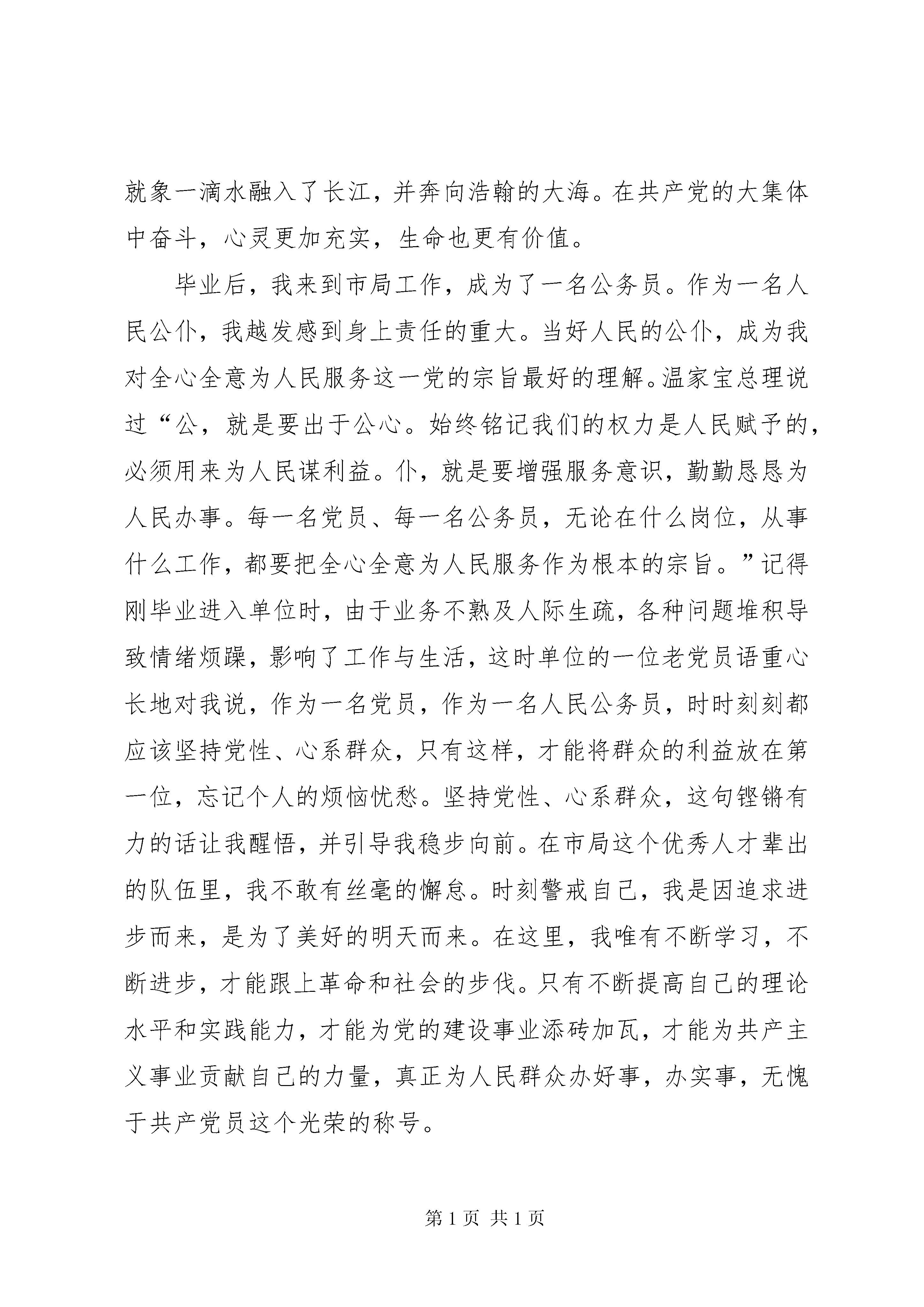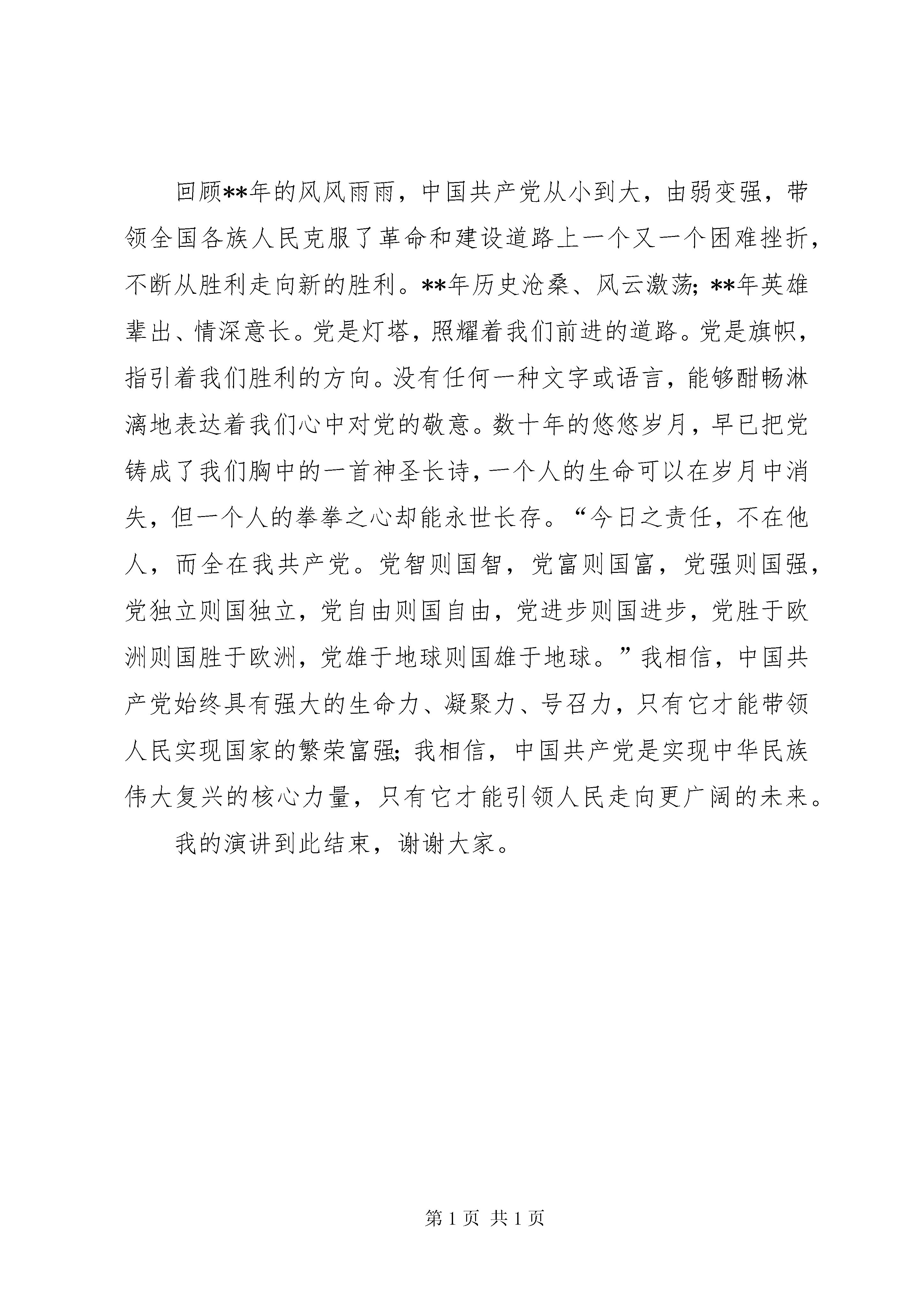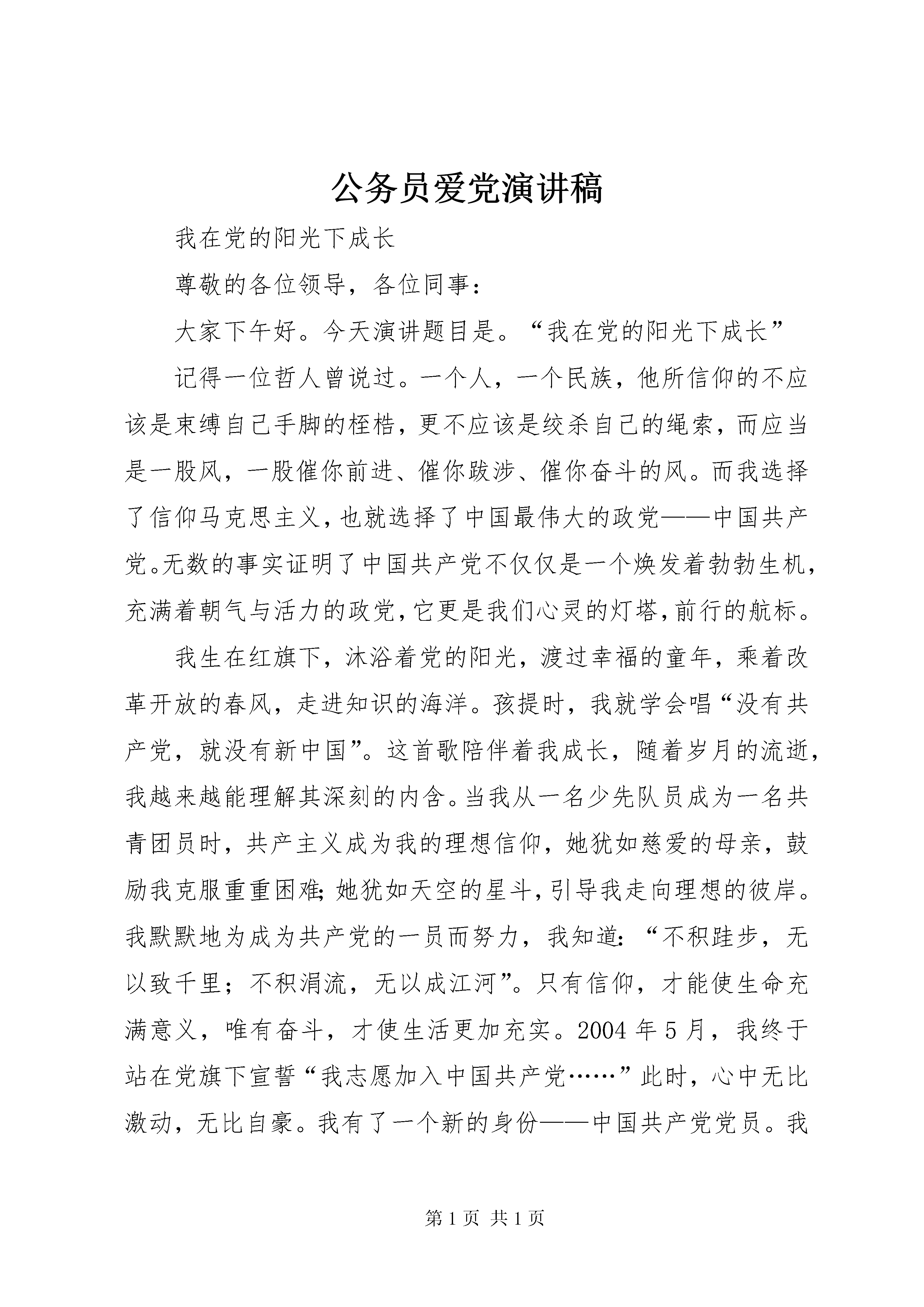 公务员爱党演讲稿我在党的阳光下成长尊敬的各位领导,各位同事:大家下午好。今天演讲题目是。“我在党的阳光下成长”记得一位哲人曾说过。一个人,一个民族,他所信仰的不应该是束缚自己手脚的桎梏,更不应该是绞杀自己的绳索,而应当是一股风,一股催你前进、催你跋涉、催你奋斗的风。而我选择了信仰马克思主义,也就选择了中国最伟大的政党——中国共产党。无数的事实证明了中国共产党不仅仅是一个焕发着勃勃生机,充满着朝气与活力的政党,它更是我们心灵的灯塔,前行的航标。我生在红旗下,沐浴着党的阳光,渡过幸福的童年,乘着改革开放的春风,走进知识的海洋。孩提时,我就学会唱“没有共产党,就没有新中国”。这首歌陪伴着我成长,随着岁月的流逝,我越来越能理解其深刻的内含。当我从一名少先队员成为一名共青团员时,共产主义成为我的理想信仰,她犹如慈爱的母亲,鼓励我克服重重困难;她犹如天空的星斗,引导我走向理想的彼岸。我默默地为成为共产党的一员而努力,我知道:“不积跬步,无以致千里;不积涓流,无以成江河”。只有信仰,才能使生命充满意义,唯有奋斗,才使生活更加充实。2004年5月,我终于站在党旗下宣誓“我志愿加入中国共产党……”此时,心中无比激动,无比自豪。我有了一个新的身份——中国共产党党员。我就象一滴水融入了长江,并奔向浩翰的大海。在共产党的大集体中奋斗,心灵更加充实,生命也更有价值。毕业后,我来到市局工作,成为了一名公务员。作为一名人民公仆,我越发感到身上责任的重大。当好人民的公仆,成为我对全心全意为人民服务这一党的宗旨最好的理解。温家宝总理说过“公,就是要出于公心。始终铭记我们的权力是人民赋予的,必须用来为人民谋利益。仆,就是要增强服务意识,勤勤恳恳为人民办事。每一名党员、每一名公务员,无论在什么岗位,从事什么工作,都要把全心全意为人民服务作为根本的宗旨。”记得刚毕业进入单位时,由于业务不熟及人际生疏,各种问题堆积导致情绪烦躁,影响了工作与生活,这时单位的一位老党员语重心长地对我说,作为一名党员,作为一名人民公务员,时时刻刻都应该坚持党性、心系群众,只有这样,才能将群众的利益放在第一位,忘记个人的烦恼忧愁。坚持党性、心系群众,这句铿锵有力的话让我醒悟,并引导我稳步向前。在市局这个优秀人才辈出的队伍里,我不敢有丝毫的懈怠。时刻警戒自己,我是因追求进步而来,是为了美好的明天而来。在这里,我唯有不断学习,不断进步,才能跟上革命和社会的步伐。只有不断提高自己的理论水平和实践能力,才能为党的建设事业添砖加瓦,才能为共产主义事业贡献自己的力量,真正为人民群众办好事,办实事,无愧于共产党员这个光荣的称号。回顾**年的风风雨雨,中国共产党从小到大,由弱变强,带领全国各族人民克服了革命和建设道路上一个又一个困难挫折,不断从胜利走向新的胜利。**年历史沧桑、风云激荡;**年英雄辈出、情深意长。党是灯塔,照耀着我们前进的道路。党是旗帜,指引着我们胜利的方向。没有任何一种文字或语言,能够酣畅淋漓地表达着我们心中对党的敬意。数十年的悠悠岁月,早已把党铸成了我们胸中的一首神圣长诗,一个人的生命可以在岁月中消失,但一个人的拳拳之心却能永世长存。“今日之责任,不在他人,而全在我共产党。党智则国智,党富则国富,党强则国强,党独立则国独立,党自由则国自由,党进步则国进步,党胜于欧洲则国胜于欧洲,党雄于地球则国雄于地球。”我相信,中国共产党始终具有强大的生命力、凝聚力、号召力,只有它才能带领人民实现国家的繁荣富强;我相信,中国共产党是实现中华民族伟大复兴的核心力量,只有它才能引领人民走向更广阔的未来。我的演讲到此结束,谢谢大家。