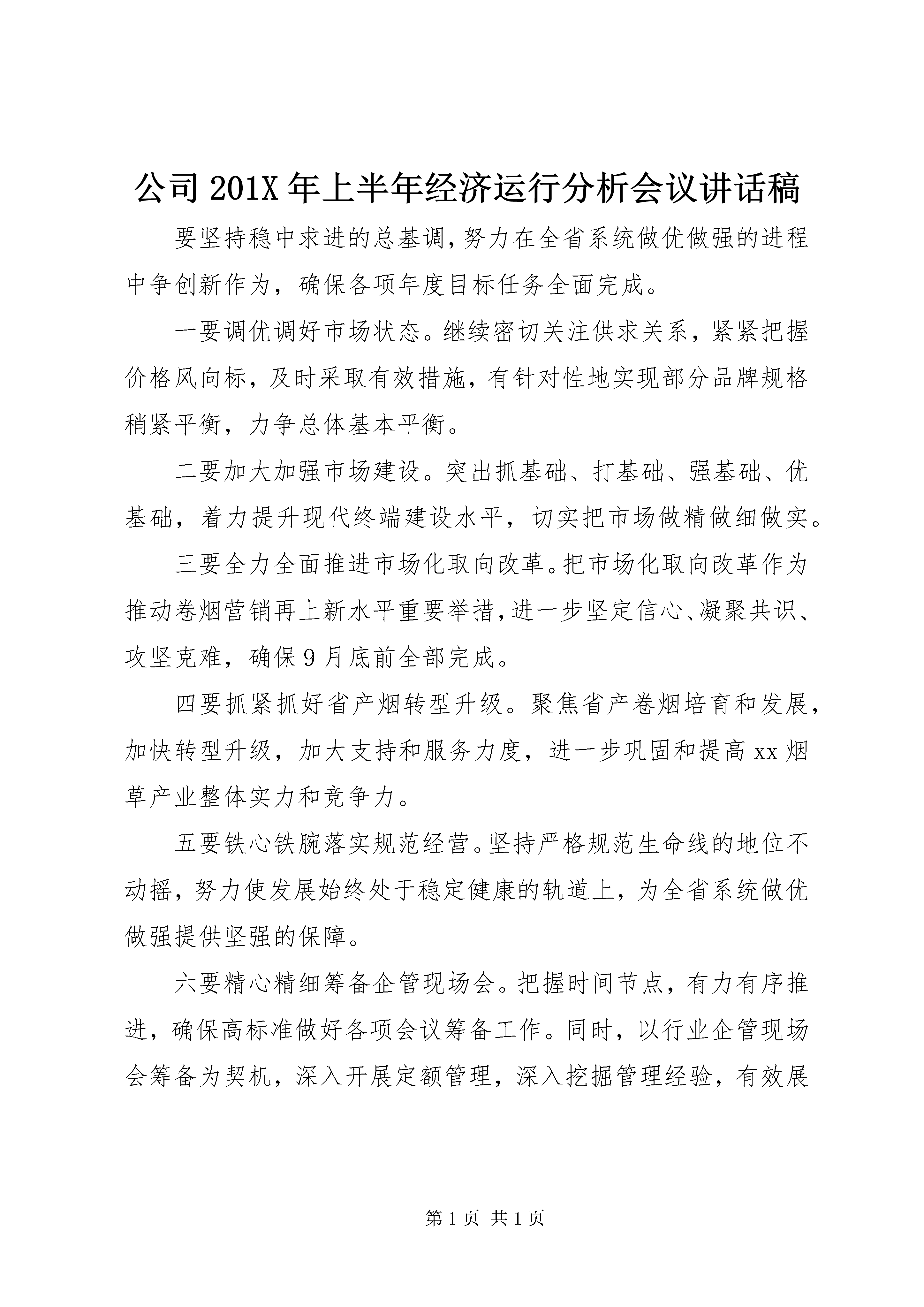 公司201X年上半年经济运行分析会议讲话稿要坚持稳中求进的总基调,努力在全省系统做优做强的进程中争创新作为,确保各项年度目标任务全面完成。一要调优调好市场状态。继续密切关注供求关系,紧紧把握价格风向标,及时采取有效措施,有针对性地实现部分品牌规格稍紧平衡,力争总体基本平衡。二要加大加强市场建设。突出抓基础、打基础、强基础、优基础,着力提升现代终端建设水平,切实把市场做精做细做实。三要全力全面推进市场化取向改革。把市场化取向改革作为推动卷烟营销再上新水平重要举措,进一步坚定信心、凝聚共识、攻坚克难,确保9月底前全部完成。四要抓紧抓好省产烟转型升级。聚焦省产卷烟培育和发展,加快转型升级,加大支持和服务力度,进一步巩固和提高xx烟草产业整体实力和竞争力。五要铁心铁腕落实规范经营。坚持严格规范生命线的地位不动摇,努力使发展始终处于稳定健康的轨道上,为全省系统做优做强提供坚强的保障。六要精心精细筹备企管现场会。把握时间节点,有力有序推进,确保高标准做好各项会议筹备工作。同时,以行业企管现场会筹备为契机,深入开展定额管理,深入挖掘管理经验,有效展示xx烟叶特色。