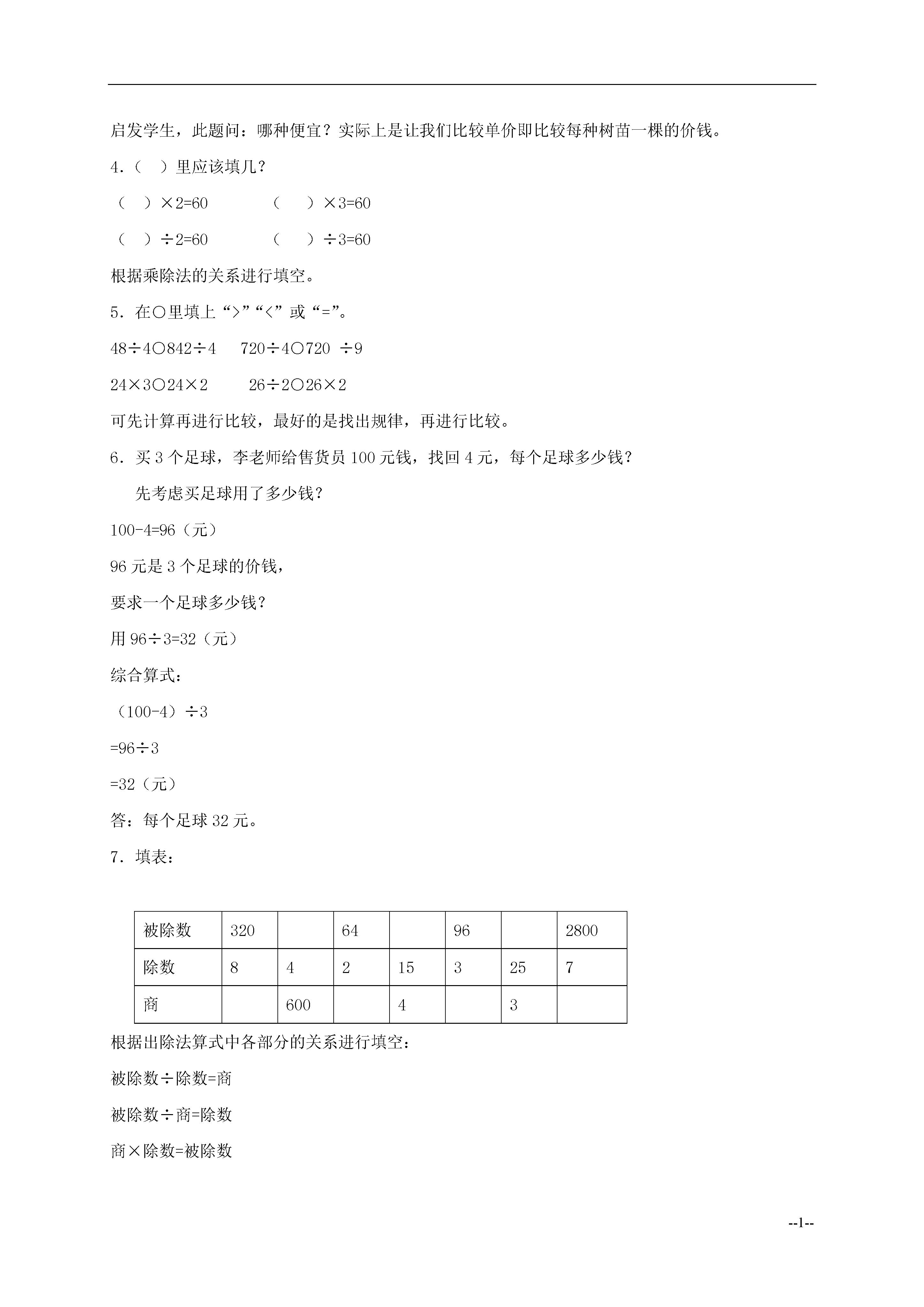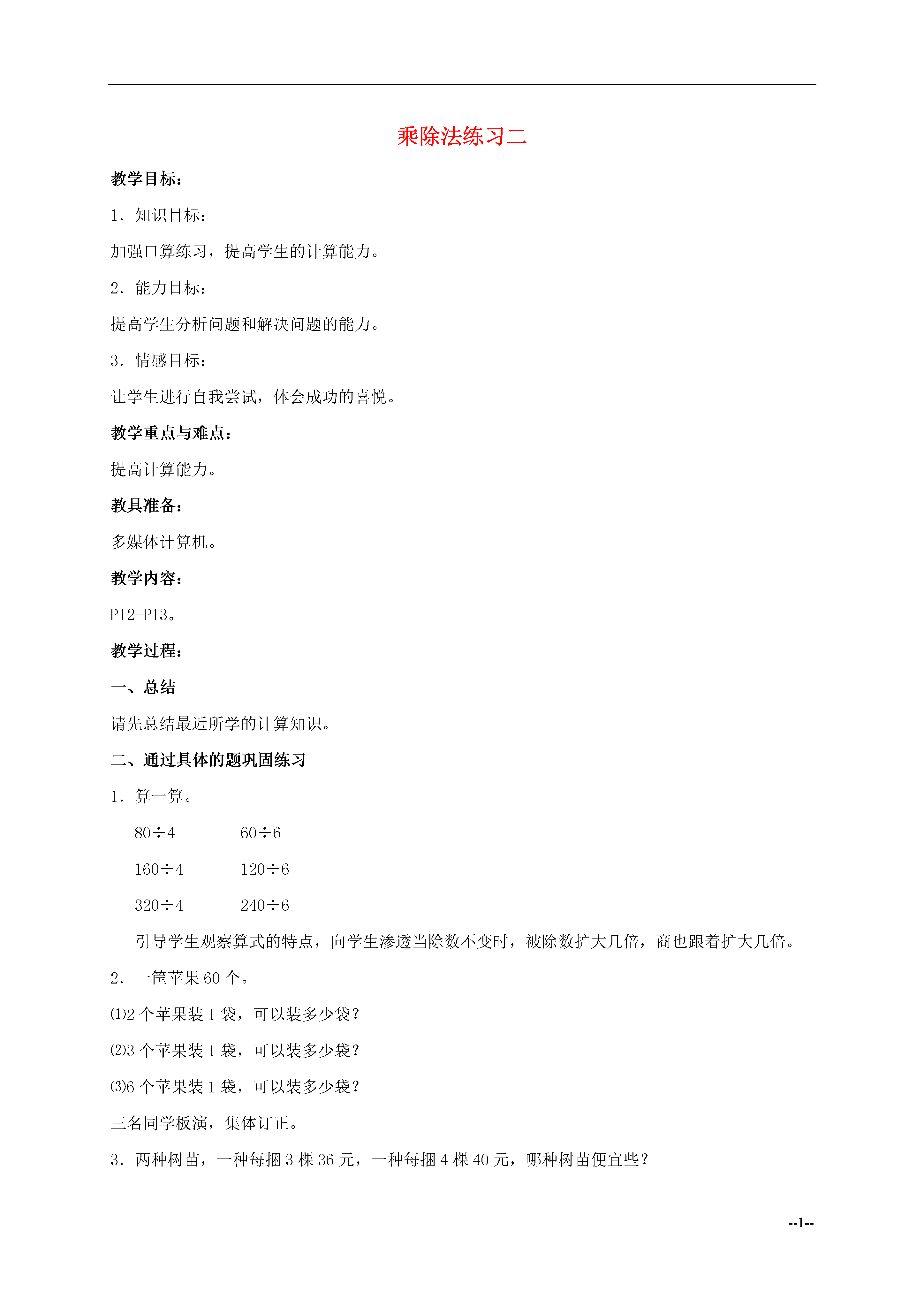 --1--乘除法练习二教学目标:1.知识目标:加强口算练习,提高学生的计算能力。2.能力目标:提高学生分析问题和解决问题的能力。3.情感目标:让学生进行自我尝试,体会成功的喜悦。教学重点与难点:提高计算能力。教具准备:多媒体计算机。教学内容:P12-P13。教学过程:一、总结请先总结最近所学的计算知识。二、通过具体的题巩固练习1.算一算。80÷460÷6160÷4120÷6320÷4240÷6引导学生观察算式的特点,向学生渗透当除数不变时,被除数扩大几倍,商也跟着扩大几倍。2.一筐苹果60个。⑴2个苹果装1袋,可以装多少袋?⑵3个苹果装1袋,可以装多少袋?⑶6个苹果装1袋,可以装多少袋?三名同学板演,集体订正。3.两种树苗,一种每捆3棵36元,一种每捆4棵40元,哪种树苗便宜些?启发学生,此题问:哪种便宜?实际上是让我们比较单价即比较每种树苗一棵的价钱。4.()里应该填几?()×2=60()×3=60()÷2=60()÷3=60根据乘除法的关系进行填空。5.在○里填上“>”“<”或“=”。48÷4○842÷4720÷4○720÷924×3○24×226÷2○26×2可先计算再进行比较,最好的是找出规律,再进行比较。6.买3个足球,李老师给售货员100元钱,找回4元,每个足球多少钱?先考虑买足球用了多少钱?100-4=96(元)96元是3个足球的价钱,要求一个足球多少钱?用96÷3=32(元)综合算式:(100-4)÷3=96÷3=32(元)答:每个足球32元。7.填表:被除数32064962800除数842153257商60043根据出除法算式中各部分的关系进行填空:被除数÷除数=商被除数÷商=除数商×除数=被除数8.在算草本上完成下列各题9.小丽借了一本故事书,。3天看了60页,照这样速度,一个星期她能看完吗?如果不能看完,请你给她提个建议。要想知道小丽一星期能不能看完,必须先算出什么?这一星期能看多少页?60÷3×7=20×7=140(页)这本故事书,小丽一星期看不完。建议:可每天多看几页或后两天每天多看5页,等等。三、布置作业