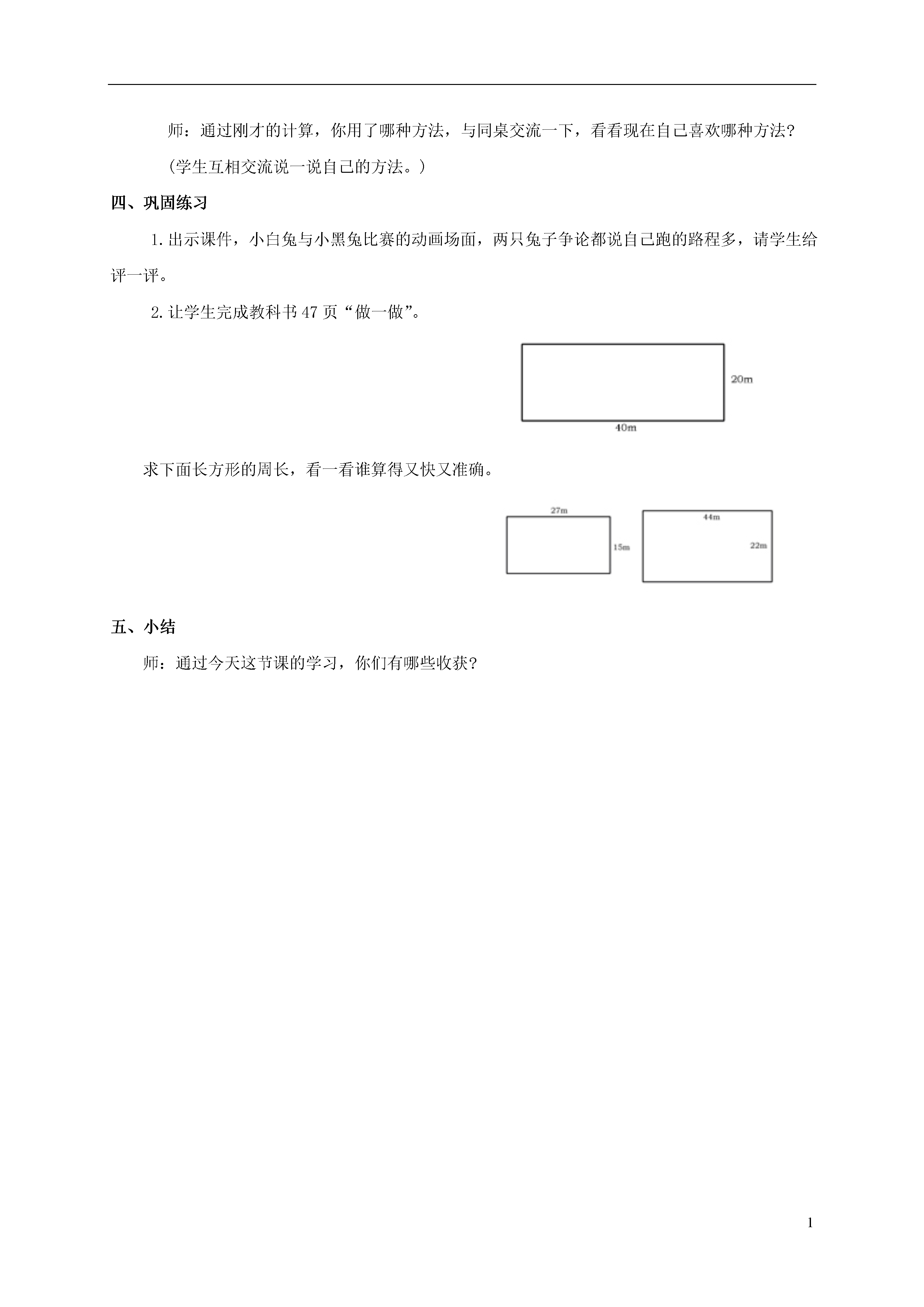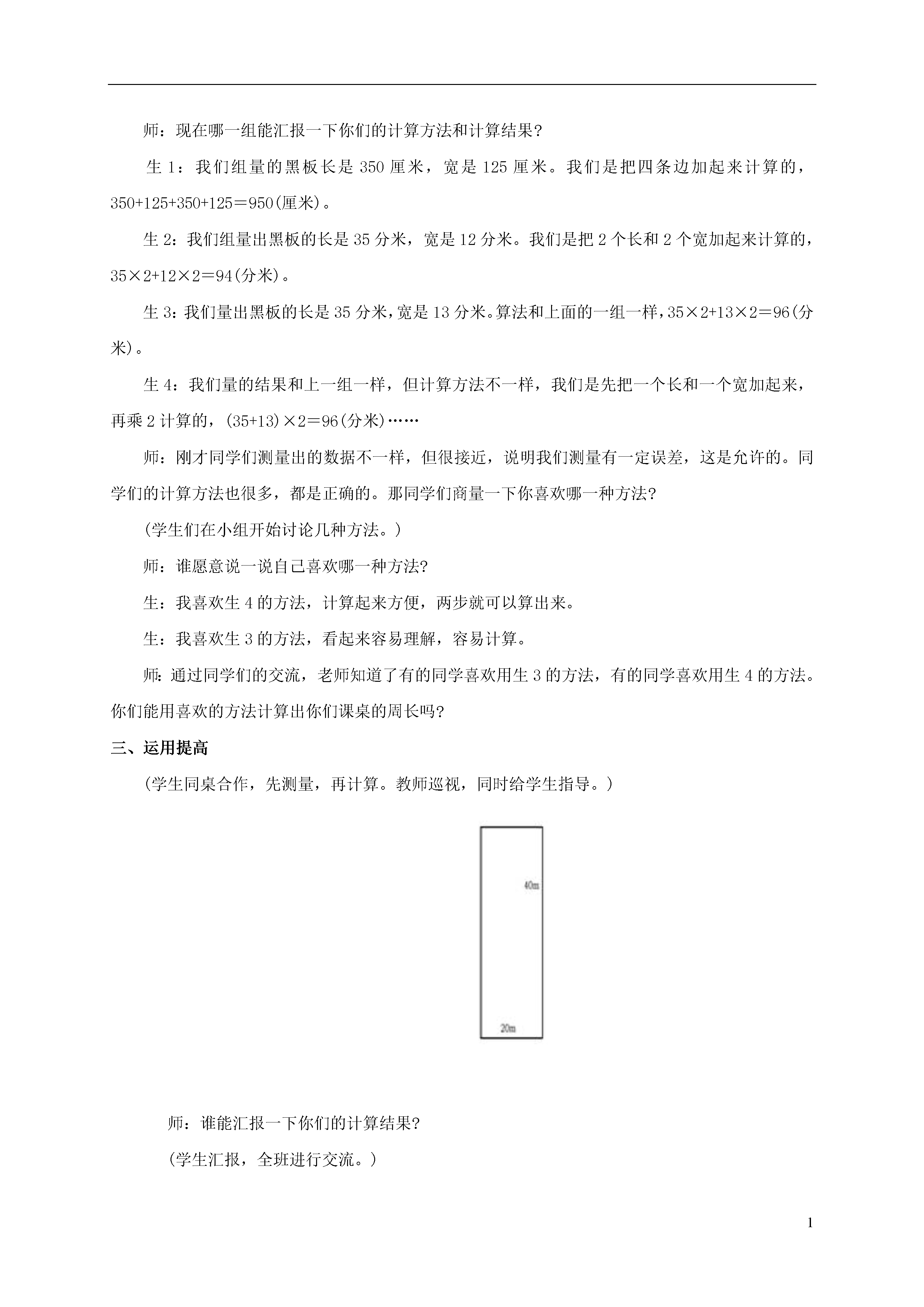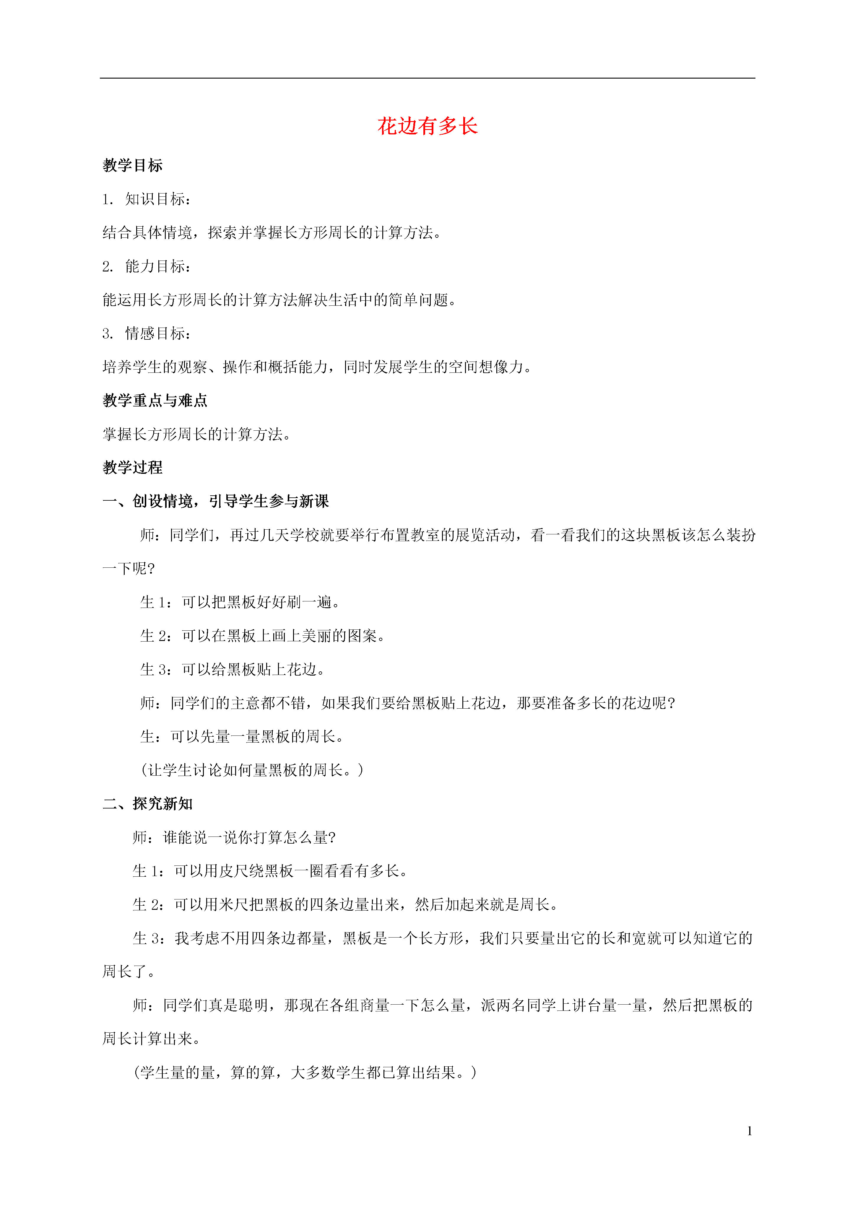1花边有多长教学目标1.知识目标:结合具体情境,探索并掌握长方形周长的计算方法。2.能力目标:能运用长方形周长的计算方法解决生活中的简单问题。3.情感目标:培养学生的观察、操作和概括能力,同时发展学生的空间想像力。教学重点与难点掌握长方形周长的计算方法。教学过程一、创设情境,引导学生参与新课师:同学们,再过几天学校就要举行布置教室的展览活动,看一看我们的这块黑板该怎么装扮一下呢?生1:可以把黑板好好刷一遍。生2:可以在黑板上画上美丽的图案。生3:可以给黑板贴上花边。师:同学们的主意都不错,如果我们要给黑板贴上花边,那要准备多长的花边呢?生:可以先量一量黑板的周长。(让学生讨论如何量黑板的周长。)二、探究新知师:谁能说一说你打算怎么量?生1:可以用皮尺绕黑板一圈看看有多长。生2:可以用米尺把黑板的四条边量出来,然后加起来就是周长。生3:我考虑不用四条边都量,黑板是一个长方形,我们只要量出它的长和宽就可以知道它的周长了。师:同学们真是聪明,那现在各组商量一下怎么量,派两名同学上讲台量一量,然后把黑板的周长计算出来。(学生量的量,算的算,大多数学生都已算出结果。)师:现在哪一组能汇报一下你们的计算方法和计算结果?生1:我们组量的黑板长是350厘米,宽是125厘米。我们是把四条边加起来计算的,350+125+350+125=950(厘米)。生2:我们组量出黑板的长是35分米,宽是12分米。我们是把2个长和2个宽加起来计算的,35×2+12×2=94(分米)。生3:我们量出黑板的长是35分米,宽是13分米。算法和上面的一组一样,35×2+13×2=96(分米)。生4:我们量的结果和上一组一样,但计算方法不一样,我们是先把一个长和一个宽加起来,再乘2计算的,(35+13)×2=96(分米)……师:刚才同学们测量出的数据不一样,但很接近,说明我们测量有一定误差,这是允许的。同学们的计算方法也很多,都是正确的。那同学们商量一下你喜欢哪一种方法?(学生们在小组开始讨论几种方法。)师:谁愿意说一说自己喜欢哪一种方法?生:我喜欢生4的方法,计算起来方便,两步就可以算出来。生:我喜欢生3的方法,看起来容易理解,容易计算。师:通过同学们的交流,老师知道了有的同学喜欢用生3的方法,有的同学喜欢用生4的方法。你们能用喜欢的方法计算出你们课桌的周长吗?三、运用提高(学生同桌合作,先测量,再计算。教师巡视,同时给学生指导。)师:谁能汇报一下你们的计算结果?(学生汇报,全班进行交流。)师:通过刚才的计算,你用了哪种方法,与同桌交流一下,看看现在自己喜欢哪种方法?(学生互相交流说一说自己的方法。)四、巩固练习1.出示课件,小白兔与小黑兔比赛的动画场面,两只兔子争论都说自己跑的路程多,请学生给评一评。2.让学生完成教科书47页“做一做”。求下面长方形的周长,看一看谁算得又快又准确。五、小结师:通过今天这节课的学习,你们有哪些收获?