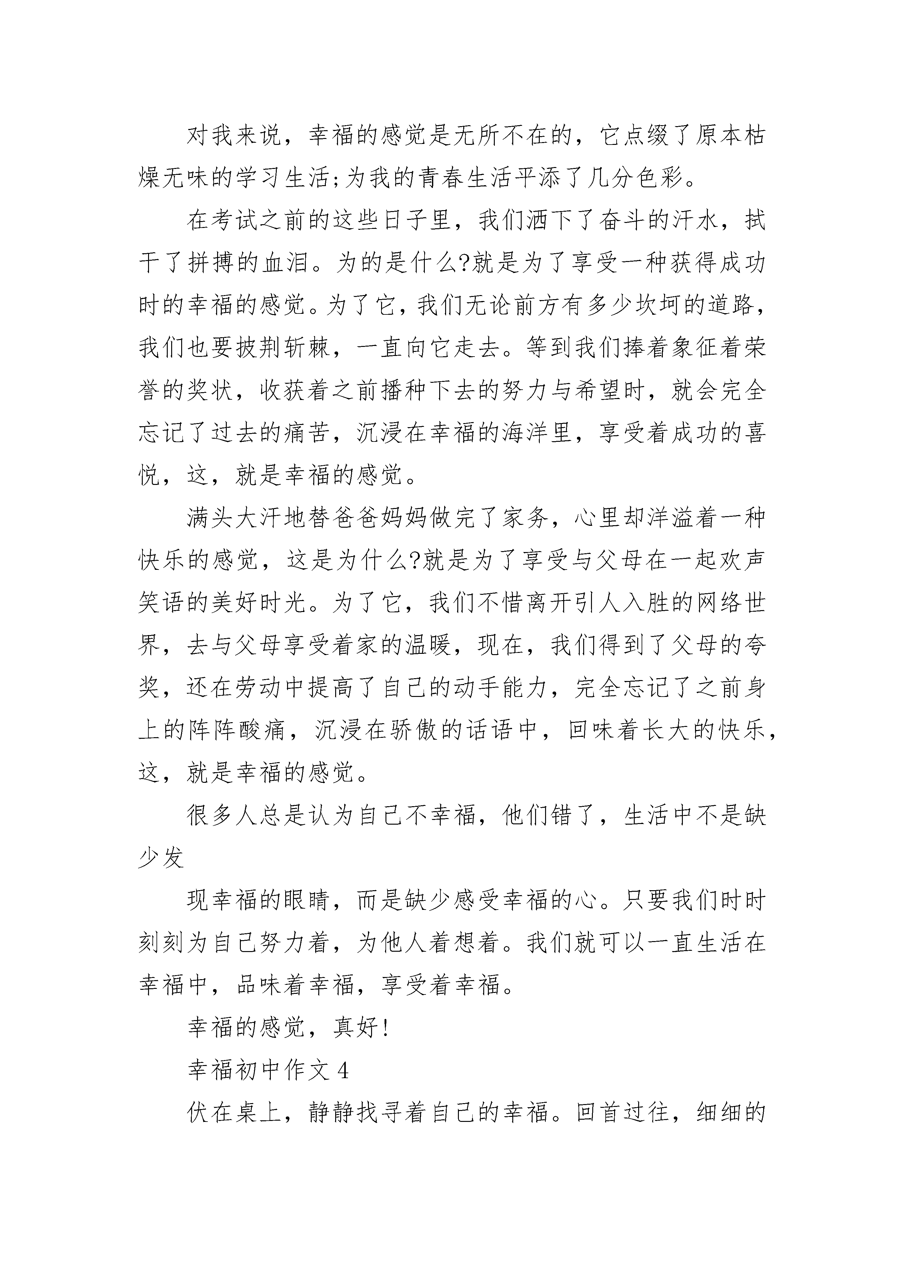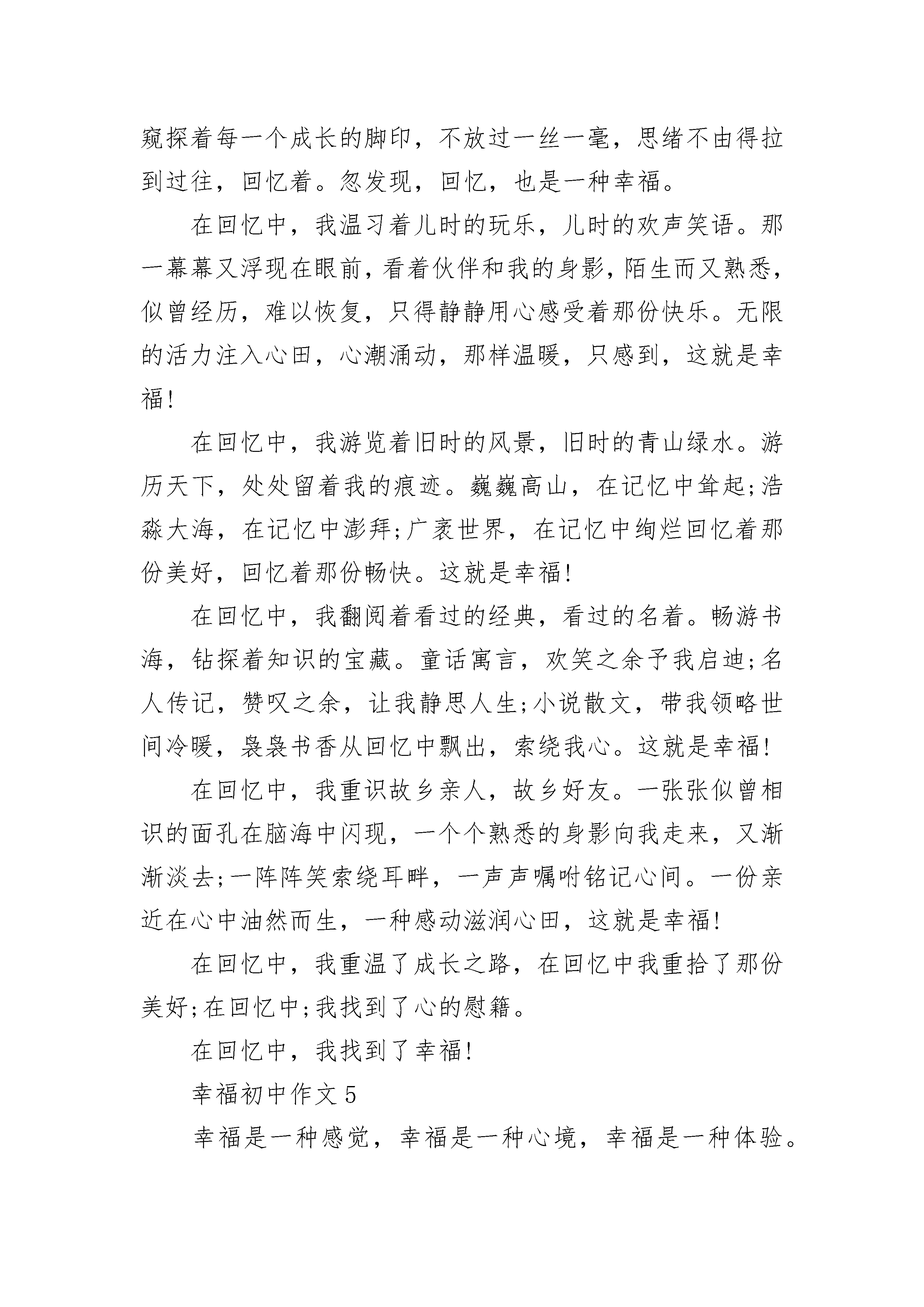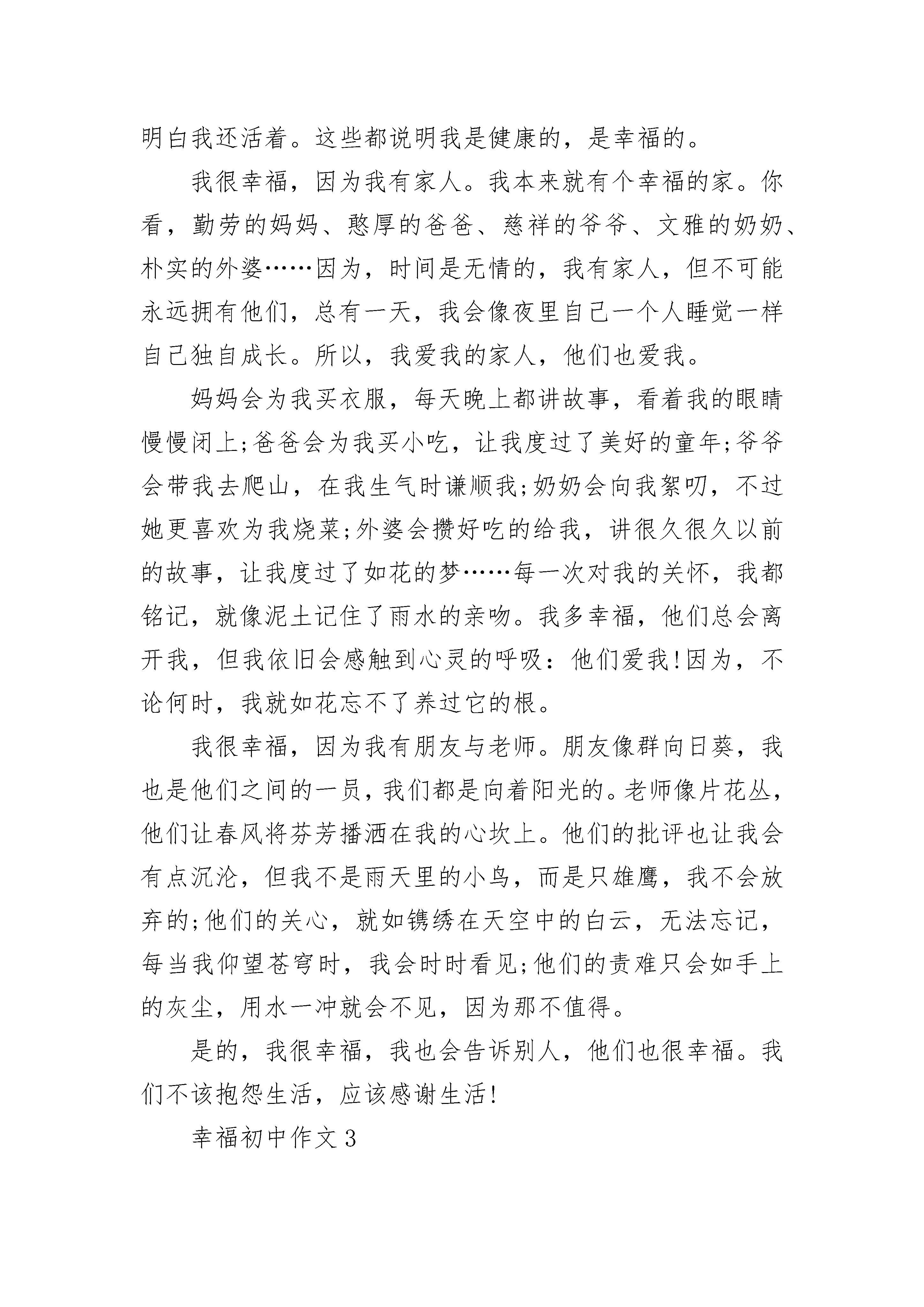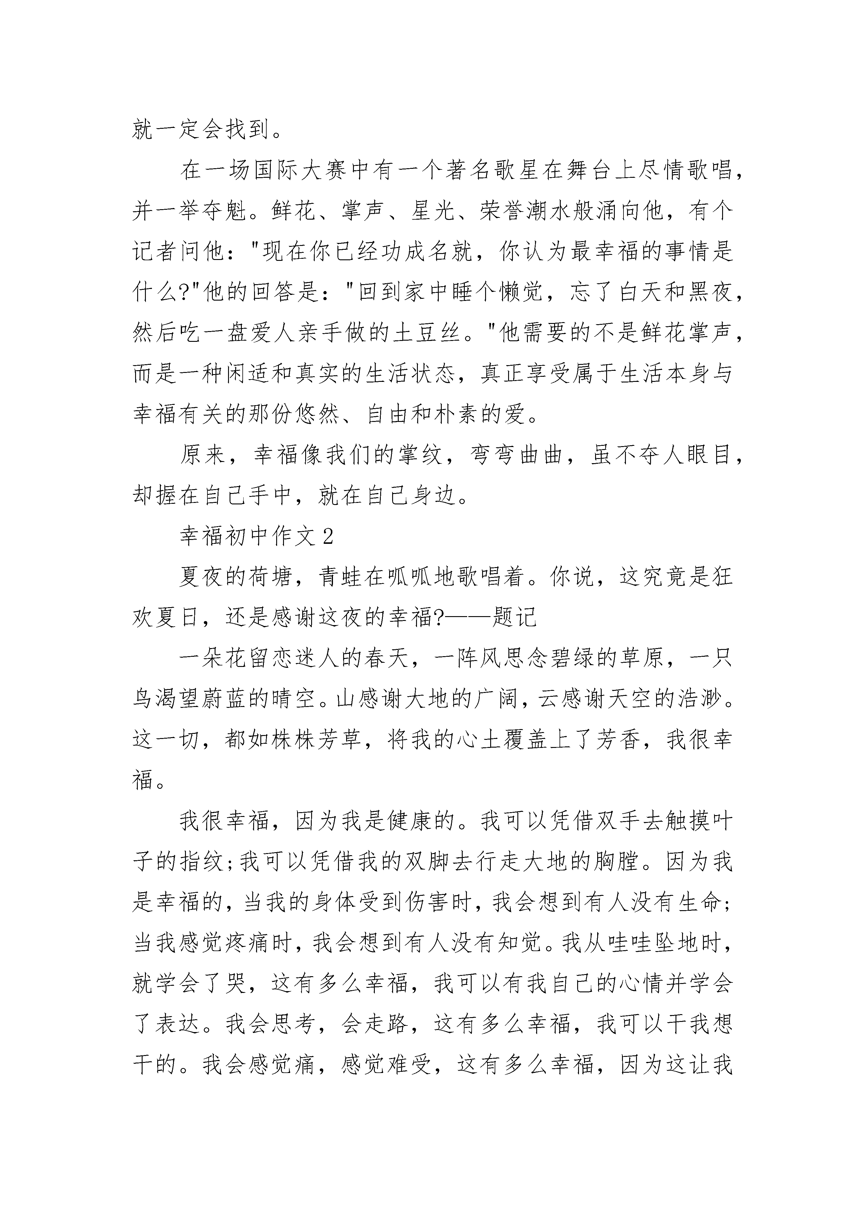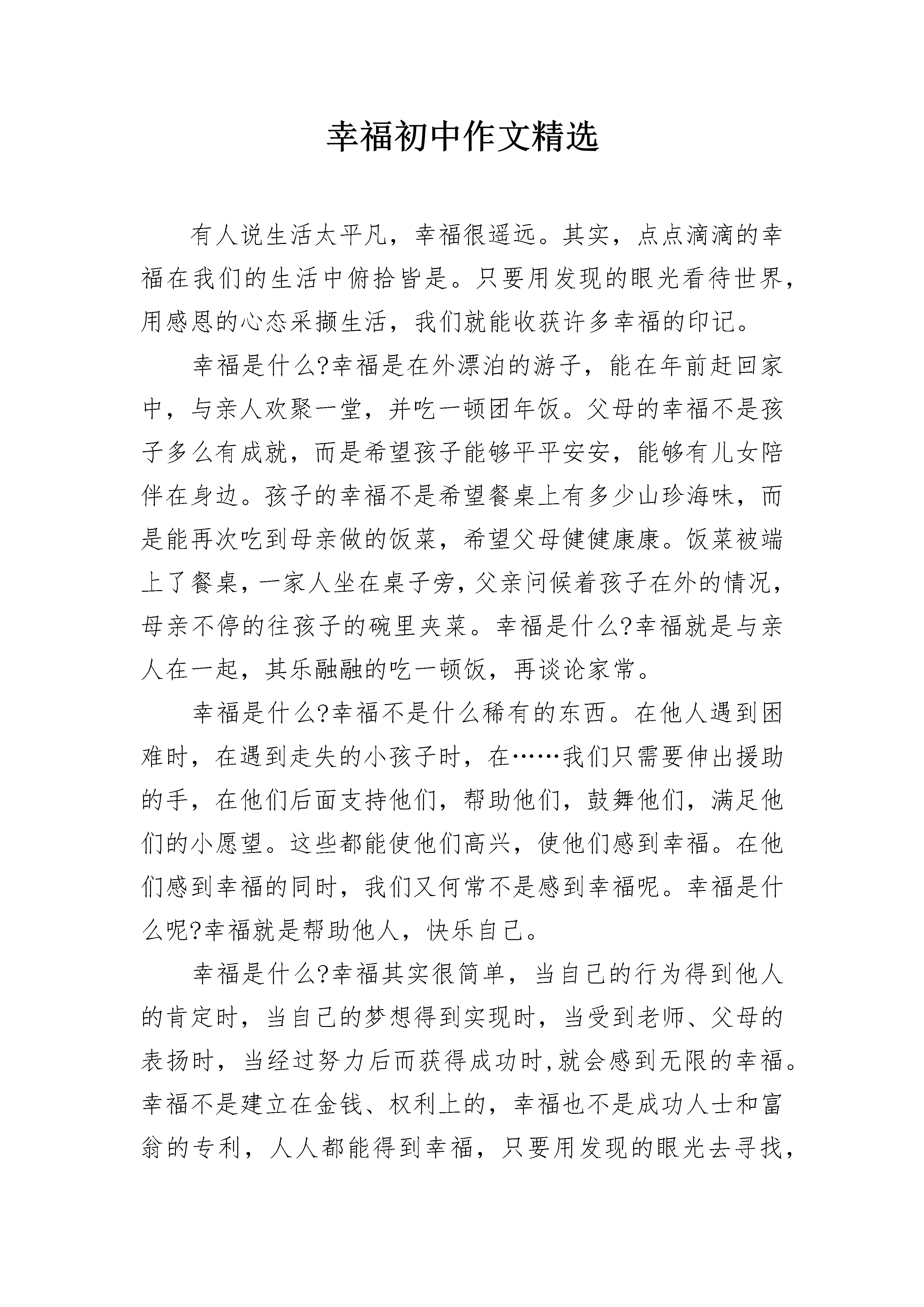 幸福初中作文精选有人说生活太平凡,幸福很遥远。其实,点点滴滴的幸福在我们的生活中俯拾皆是。只要用发现的眼光看待世界,用感恩的心态采撷生活,我们就能收获许多幸福的印记。幸福是什么?幸福是在外漂泊的游子,能在年前赶回家中,与亲人欢聚一堂,并吃一顿团年饭。父母的幸福不是孩子多么有成就,而是希望孩子能够平平安安,能够有儿女陪伴在身边。孩子的幸福不是希望餐桌上有多少山珍海味,而是能再次吃到母亲做的饭菜,希望父母健健康康。饭菜被端上了餐桌,一家人坐在桌子旁,父亲问候着孩子在外的情况,母亲不停的往孩子的碗里夹菜。幸福是什么?幸福就是与亲人在一起,其乐融融的吃一顿饭,再谈论家常。幸福是什么?幸福不是什么稀有的东西。在他人遇到困难时,在遇到走失的小孩子时,在……我们只需要伸出援助的手,在他们后面支持他们,帮助他们,鼓舞他们,满足他们的小愿望。这些都能使他们高兴,使他们感到幸福。在他们感到幸福的同时,我们又何常不是感到幸福呢。幸福是什么呢?幸福就是帮助他人,快乐自己。幸福是什么?幸福其实很简单,当自己的行为得到他人的肯定时,当自己的梦想得到实现时,当受到老师、父母的表扬时,当经过努力后而获得成功时,就会感到无限的幸福。幸福不是建立在金钱、权利上的,幸福也不是成功人士和富翁的专利,人人都能得到幸福,只要用发现的眼光去寻找,就一定会找到。在一场国际大赛中有一个著名歌星在舞台上尽情歌唱,并一举夺魁。鲜花、掌声、星光、荣誉潮水般涌向他,有个记者问他:"现在你已经功成名就,你认为最幸福的事情是什么?"他的回答是:"回到家中睡个懒觉,忘了白天和黑夜,然后吃一盘爱人亲手做的土豆丝。"他需要的不是鲜花掌声,而是一种闲适和真实的生活状态,真正享受属于生活本身与幸福有关的那份悠然、自由和朴素的爱。原来,幸福像我们的掌纹,弯弯曲曲,虽不夺人眼目,却握在自己手中,就在自己身边。幸福初中作文2夏夜的荷塘,青蛙在呱呱地歌唱着。你说,这究竟是狂欢夏日,还是感谢这夜的幸福?——题记一朵花留恋迷人的春天,一阵风思念碧绿的草原,一只鸟渴望蔚蓝的晴空。山感谢大地的广阔,云感谢天空的浩渺。这一切,都如株株芳草,将我的心土覆盖上了芳香,我很幸福。我很幸福,因为我是健康的。我可以凭借双手去触摸叶子的指纹;我可以凭借我的双脚去行走大地的胸膛。因为我是幸福的,当我的身体受到伤害时,我会想到有人没有生命;当我感觉疼痛时,我会想到有人没有知觉。我从哇哇坠地时,就学会了哭,这有多么幸福,我可以有我自己的心情并学会了表达。我会思考,会走路,这有多么幸福,我可以干我想干的。我会感觉痛,感觉难受,这有多么幸福,因为这让我明白我还活着。这些都说明我是健康的,是幸福的。我很幸福,因为我有家人。我本来就有个幸福的家。你看,勤劳的妈妈、憨厚的爸爸、慈祥的爷爷、文雅的奶奶、朴实的外婆……因为,时间是无情的,我有家人,但不可能永远拥有他们,总有一天,我会像夜里自己一个人睡觉一样自己独自成长。所以,我爱我的家人,他们也爱我。妈妈会为我买衣服,每天晚上都讲故事,看着我的眼睛慢慢闭上;爸爸会为我买小吃,让我度过了美好的童年;爷爷会带我去爬山,在我生气时谦顺我;奶奶会向我絮叨,不过她更喜欢为我烧菜;外婆会攒好吃的给我,讲很久很久以前的故事,让我度过了如花的梦……每一次对我的关怀,我都铭记,就像泥土记住了雨水的亲吻。我多幸福,他们总会离开我,但我依旧会感触到心灵的呼吸:他们爱我!因为,不论何时,我就如花忘不了养过它的根。我很幸福,因为我有朋友与老师。朋友像群向日葵,我也是他们之间的一员,我们都是向着阳光的。老师像片花丛,他们让春风将芬芳播洒在我的心坎上。他们的批评也让我会有点沉沦,但我不是雨天里的小鸟,而是只雄鹰,我不会放弃的;他们的关心,就如镌绣在天空中的白云,无法忘记,每当我仰望苍穹时,我会时时看见;他们的责难只会如手上的灰尘,用水一冲就会不见,因为那不值得。是的,我很幸福,我也会告诉别人,他们也很幸福。我们不该抱怨生活,应该感谢生活!幸福初中作文3对我来说,幸福的感觉是无所不在的,它点缀了原本枯燥无味的学习生活;为我的青春生活平添了几分色彩。在考试之前的这些日子里,我们洒下了奋斗的汗水,拭干了拼搏的血泪。为的是什么?就是为了享受一种获得成功时的幸福的感觉。为了它,我们无论前方有多少坎坷的道路,我们也要披荆斩棘,一直向它走去。等到我们捧着象征着荣誉的奖状,收获着之前播种下去的努力与希望时,就会完全忘记了过去的痛苦,沉浸在幸福的海洋里,享受着成功的喜悦,这,就是幸福的感觉。满头大汗地替爸爸妈妈做完了家务,心里却洋溢着一种快乐的感觉,这是为什么?就是为了享受与父母在一起欢声笑语的美好时光。为了它,我们不惜离开引人入胜的网络世界,去与父母享受着家的温暖,现在,我们得到了父母的夸奖,还在劳动中提高了自己的动手能力,完全忘记了之