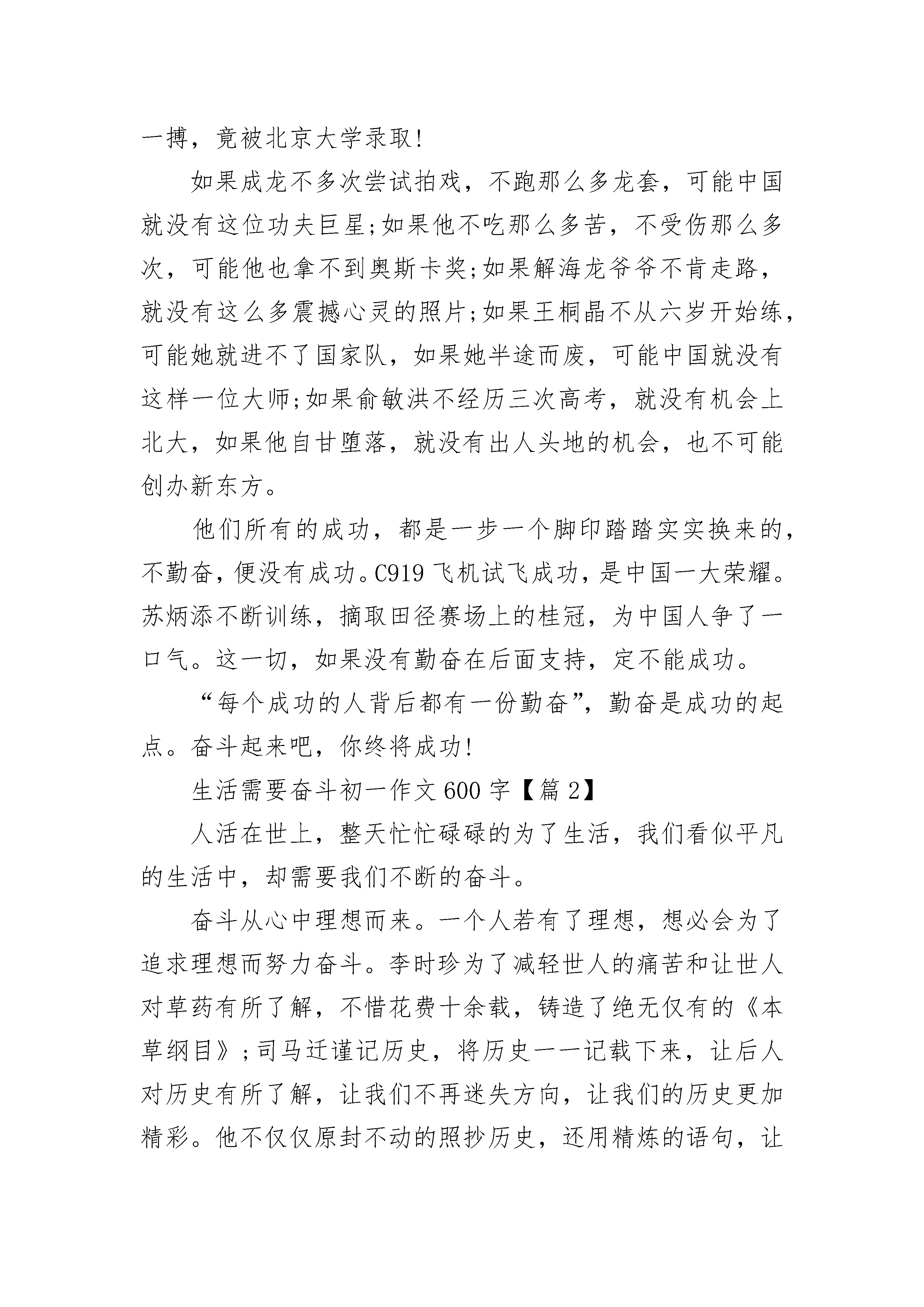 生活需要奋斗初一作文600字(精选5篇)生活需要奋斗初一作文600字【篇1】勤奋,是成功的果实中必不可缺的养料,只有勤奋我们才能向成功更进一步。昨晚我们观看了由中央1台推出的《开学第一课》,由撒贝宁和何炅主持。首先第一位嘉宾是成龙爷爷,由于工作原因,他只能视频拍摄。他在视频连线中谈到,他起初只是一个跑龙套的,后因“死尸”演得好被导演青睐,有了越来越多的演出机会,终于当上了男一号,但还是不被大家赏识,还称他为“票房毒药”。但经过不懈的努力,他才被人们称赞。摄影师解海龙爷爷,用了几十年的时间到全国各地拍摄山村儿童的照片,一张张渴望学习的脸,构成了这世上最美的风景,“大鼻涕”、“小光头”、“大眼睛”,这一张张照片,震撼了无数人的心灵。军人王桐晶,六岁学习珠心算,九岁进入国家队,一直训练到二十多岁。在几组数字中,她依靠超强的记忆力和心算力,不到三秒就胸有成竹地写出了答案,然而我连一组数字也未曾看得清。二十二岁的她夺得了全国珠心算比赛三届冠军,并且还是世上心算能力的人之一,这可以说是年轻有为了!新东方英语创始人俞敏洪,志向本是当地师范学院,结果两年高考,英语也未能突破分数线,随着他第三年高考的一搏,竟被北京大学录取!如果成龙不多次尝试拍戏,不跑那么多龙套,可能中国就没有这位功夫巨星;如果他不吃那么多苦,不受伤那么多次,可能他也拿不到奥斯卡奖;如果解海龙爷爷不肯走路,就没有这么多震撼心灵的照片;如果王桐晶不从六岁开始练,可能她就进不了国家队,如果她半途而废,可能中国就没有这样一位大师;如果俞敏洪不经历三次高考,就没有机会上北大,如果他自甘堕落,就没有出人头地的机会,也不可能创办新东方。他们所有的成功,都是一步一个脚印踏踏实实换来的,不勤奋,便没有成功。C919飞机试飞成功,是中国一大荣耀。苏炳添不断训练,摘取田径赛场上的桂冠,为中国人争了一口气。这一切,如果没有勤奋在后面支持,定不能成功。“每个成功的人背后都有一份勤奋”,勤奋是成功的起点。奋斗起来吧,你终将成功!生活需要奋斗初一作文600字【篇2】人活在世上,整天忙忙碌碌的为了生活,我们看似平凡的生活中,却需要我们不断的奋斗。奋斗从心中理想而来。一个人若有了理想,想必会为了追求理想而努力奋斗。李时珍为了减轻世人的痛苦和让世人对草药有所了解,不惜花费十余载,铸造了绝无仅有的《本草纲目》;司马迁谨记历史,将历史一一记载下来,让后人对历史有所了解,让我们不再迷失方向,让我们的历史更加精彩。他不仅仅原封不动的照抄历史,还用精炼的语句,让我们不得不把它视为“史家之绝唱”。奋斗从实现自我而来。当一个人徘徊在生命的十字路口时,不知是否放弃,庸过一生,还是应大步迈向前,去实现自我。生命的价值在于一念之差。世界著名钢琴演奏家贝多芬,是世界上最伟大的音乐家,却饱受了时间的种种悲苦——亲人抛弃,他人歧视,朋友背叛,穷困潦倒,耳朵失聋……在这样的情况下,他把种种悲苦都化作了震撼人心的音符,随着音乐地奏响,随音符逝去。身残志坚的张海迪也相似。身体的残缺,把人世间经过的一切用文笔记下,用自己的微笑和幸福度过剩下的春秋。奋斗从绝不放弃而来。“做一件好事容易,做一辈子好事难。”是呀,试问全世界的人,有几个能做一辈子好事的呀?雷锋——一个普普通通的小战士,都把他的心全心全意的为人民服务。举动虽小,感动之大。贴近我们的生活,用到的一些家用电器,如电灯,想必我们不会忘了伟大的发明家——爱迪生。现在的一个小灯泡,随处可见的极其普通的小电器,但不知是伟大的发明家重复实验了几千次,选了多少材料,才能让世界变得明亮。他们都在于绝不放弃的理念,在于实现生命价值,在于造福人类……他们成功了,我们不仅记住了他们,也记住了他们那可贵的精神。综上所述,不难看出,我们的生活需要不断奋斗。不怕一切困难,努力向前,为了心中那理想,去做能实现自己价值的事。虽然我们没有发明家、音乐家那么伟大,但我们都能和他们一样为着自己的目标去努力奋斗;虽然我们不能像司马迁,李时珍他们那样流传千古,但我们也能实现自我;虽然我们不能为社会做出巨大的贡献,但我们也能不放弃而去奋斗。奋斗,可使你的生活多一种味道。生活需要奋斗初一作文600字【篇3】生活,可以是简单的,也可以是复杂的。我们每个人的生活不同,有的游手好闲,觉得时间太多了;而又有的生活充实,时间刚刚好。我记得一句话:要想生活有多好,那就得有多努力。相应的辛勤换取相应的果实,这句话说的一点也不错,生活,是需要打拼的。一个人生下来是不懂得生活的,是在不断的跌跌撞撞中闯出来的,摸索出一条条宝贵的经验。很多人都曾幻想过自己的未来是怎样,生活过的如何,许多人都希望自己有着马云精明的大脑,开阔的眼界,高情商,但他们却不知,马云年少时,有过两次高考落榜,第三次高考才勉强被杭州师范学院专科录取,凭借自己的努力获得了文学学士学