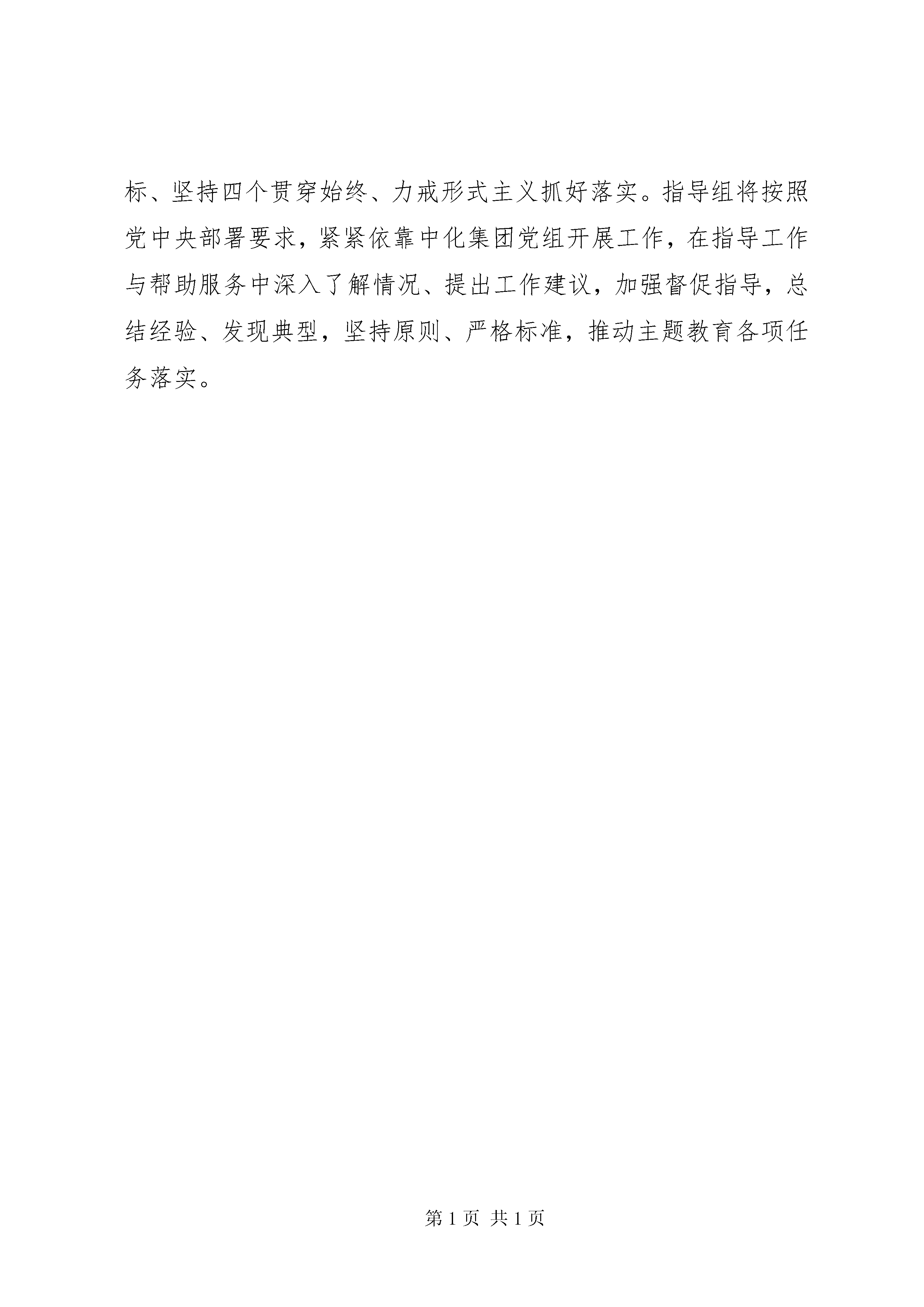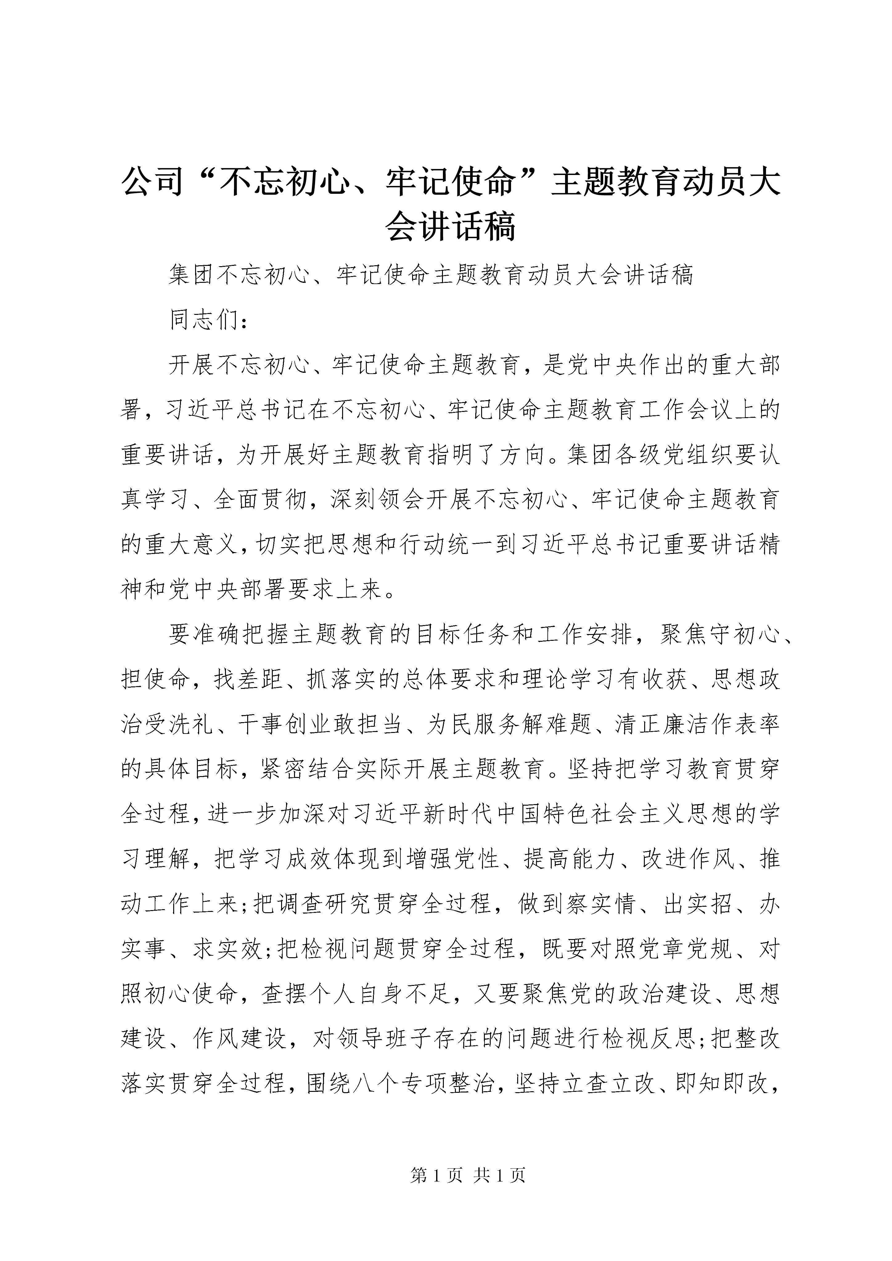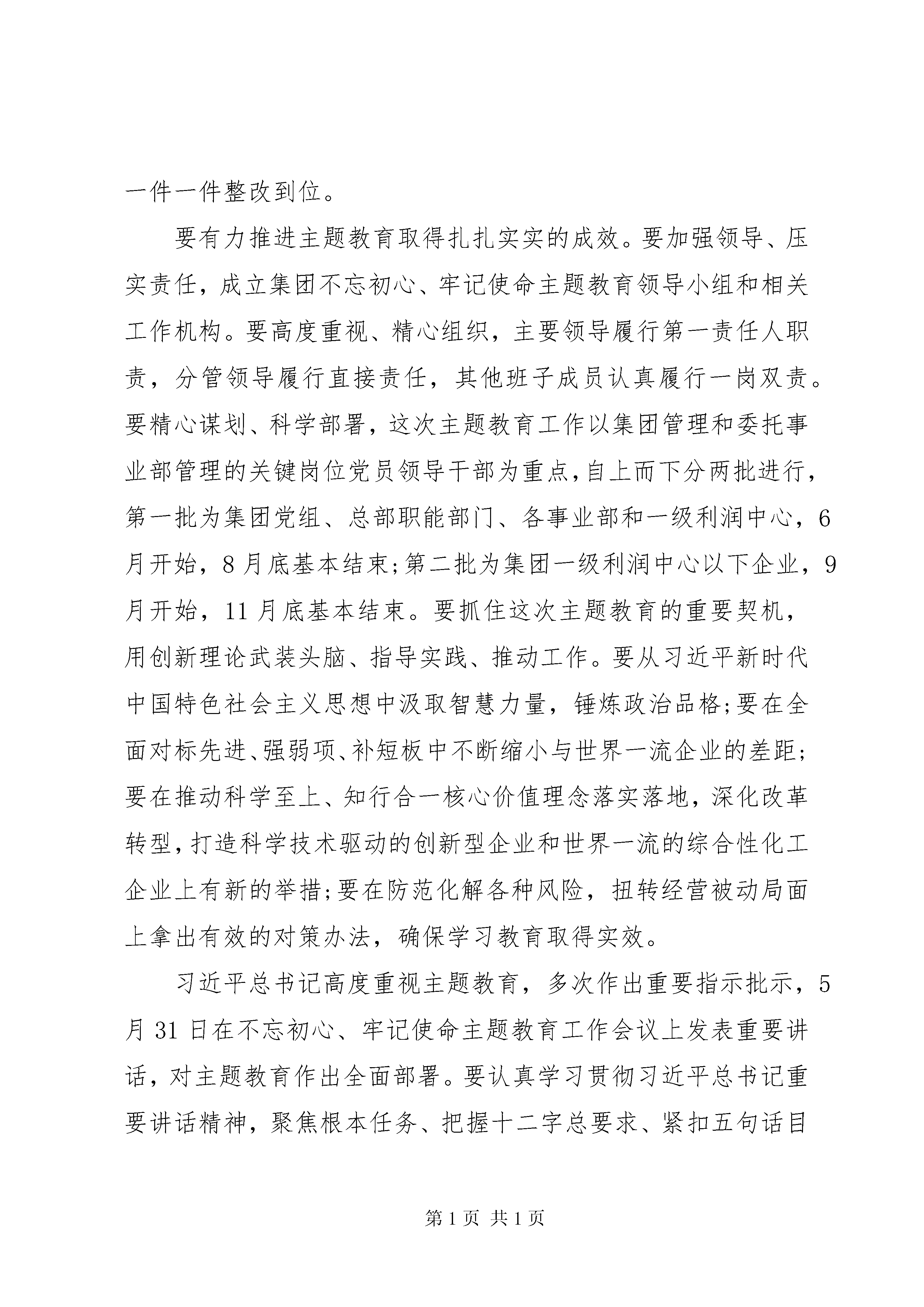 公司“不忘初心、牢记使命”主题教育动员大会讲话稿集团不忘初心、牢记使命主题教育动员大会讲话稿同志们:开展不忘初心、牢记使命主题教育,是党中央作出的重大部署,习近平总书记在不忘初心、牢记使命主题教育工作会议上的重要讲话,为开展好主题教育指明了方向。集团各级党组织要认真学习、全面贯彻,深刻领会开展不忘初心、牢记使命主题教育的重大意义,切实把思想和行动统一到习近平总书记重要讲话精神和党中央部署要求上来。要准确把握主题教育的目标任务和工作安排,聚焦守初心、担使命,找差距、抓落实的总体要求和理论学习有收获、思想政治受洗礼、干事创业敢担当、为民服务解难题、清正廉洁作表率的具体目标,紧密结合实际开展主题教育。坚持把学习教育贯穿全过程,进一步加深对习近平新时代中国特色社会主义思想的学习理解,把学习成效体现到增强党性、提高能力、改进作风、推动工作上来;把调查研究贯穿全过程,做到察实情、出实招、办实事、求实效;把检视问题贯穿全过程,既要对照党章党规、对照初心使命,查摆个人自身不足,又要聚焦党的政治建设、思想建设、作风建设,对领导班子存在的问题进行检视反思;把整改落实贯穿全过程,围绕八个专项整治,坚持立查立改、即知即改,一件一件整改到位。要有力推进主题教育取得扎扎实实的成效。要加强领导、压实责任,成立集团不忘初心、牢记使命主题教育领导小组和相关工作机构。要高度重视、精心组织,主要领导履行第一责任人职责,分管领导履行直接责任,其他班子成员认真履行一岗双责。要精心谋划、科学部署,这次主题教育工作以集团管理和委托事业部管理的关键岗位党员领导干部为重点,自上而下分两批进行,第一批为集团党组、总部职能部门、各事业部和一级利润中心,6月开始,8月底基本结束;第二批为集团一级利润中心以下企业,9月开始,11月底基本结束。要抓住这次主题教育的重要契机,用创新理论武装头脑、指导实践、推动工作。要从习近平新时代中国特色社会主义思想中汲取智慧力量,锤炼政治品格;要在全面对标先进、强弱项、补短板中不断缩小与世界一流企业的差距;要在推动科学至上、知行合一核心价值理念落实落地,深化改革转型,打造科学技术驱动的创新型企业和世界一流的综合性化工企业上有新的举措;要在防范化解各种风险,扭转经营被动局面上拿出有效的对策办法,确保学习教育取得实效。习近平总书记高度重视主题教育,多次作出重要指示批示,5月31日在不忘初心、牢记使命主题教育工作会议上发表重要讲话,对主题教育作出全面部署。要认真学习贯彻习近平总书记重要讲话精神,聚焦根本任务、把握十二字总要求、紧扣五句话目标、坚持四个贯穿始终、力戒形式主义抓好落实。指导组将按照党中央部署要求,紧紧依靠中化集团党组开展工作,在指导工作与帮助服务中深入了解情况、提出工作建议,加强督促指导,总结经验、发现典型,坚持原则、严格标准,推动主题教育各项任务落实。