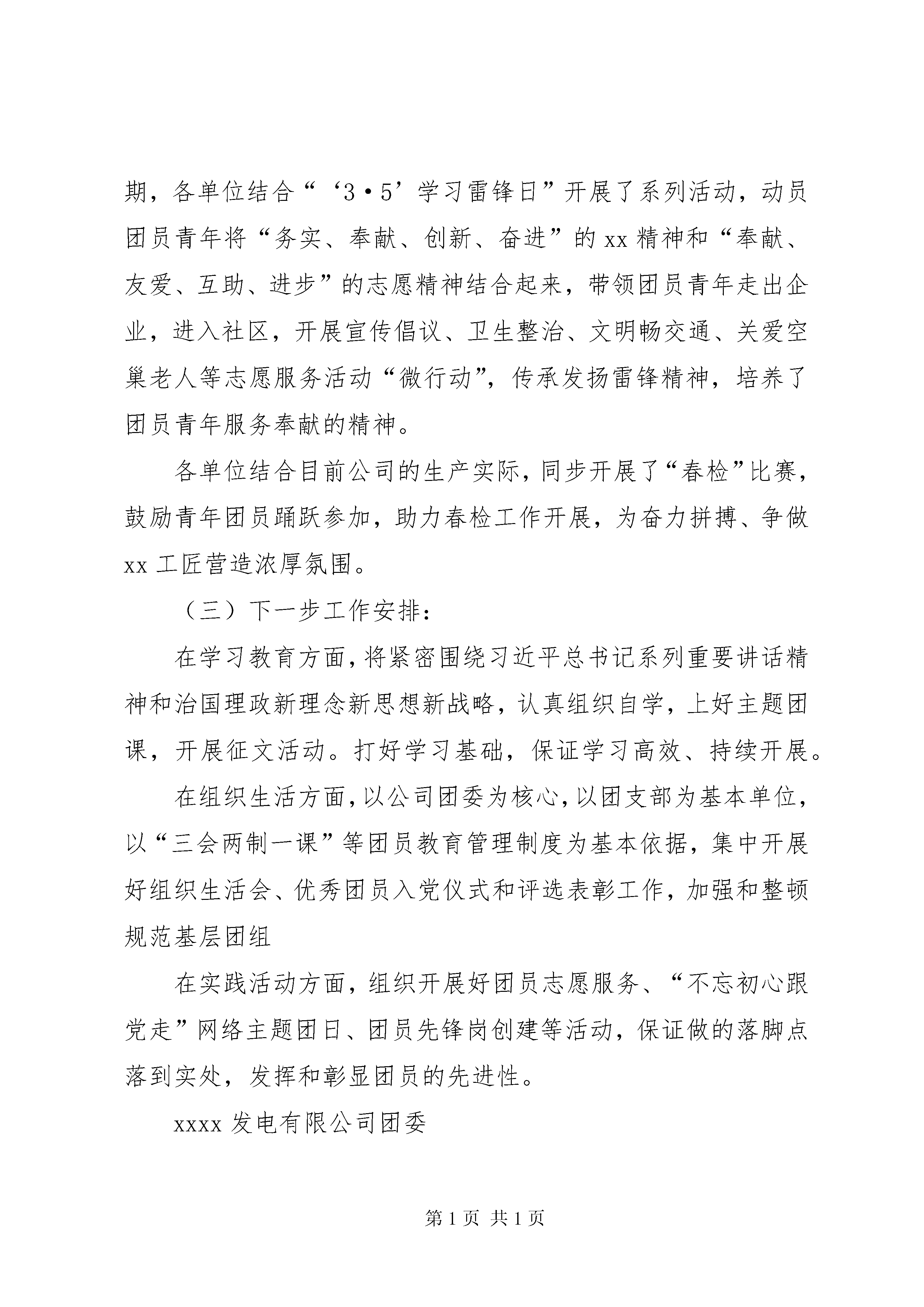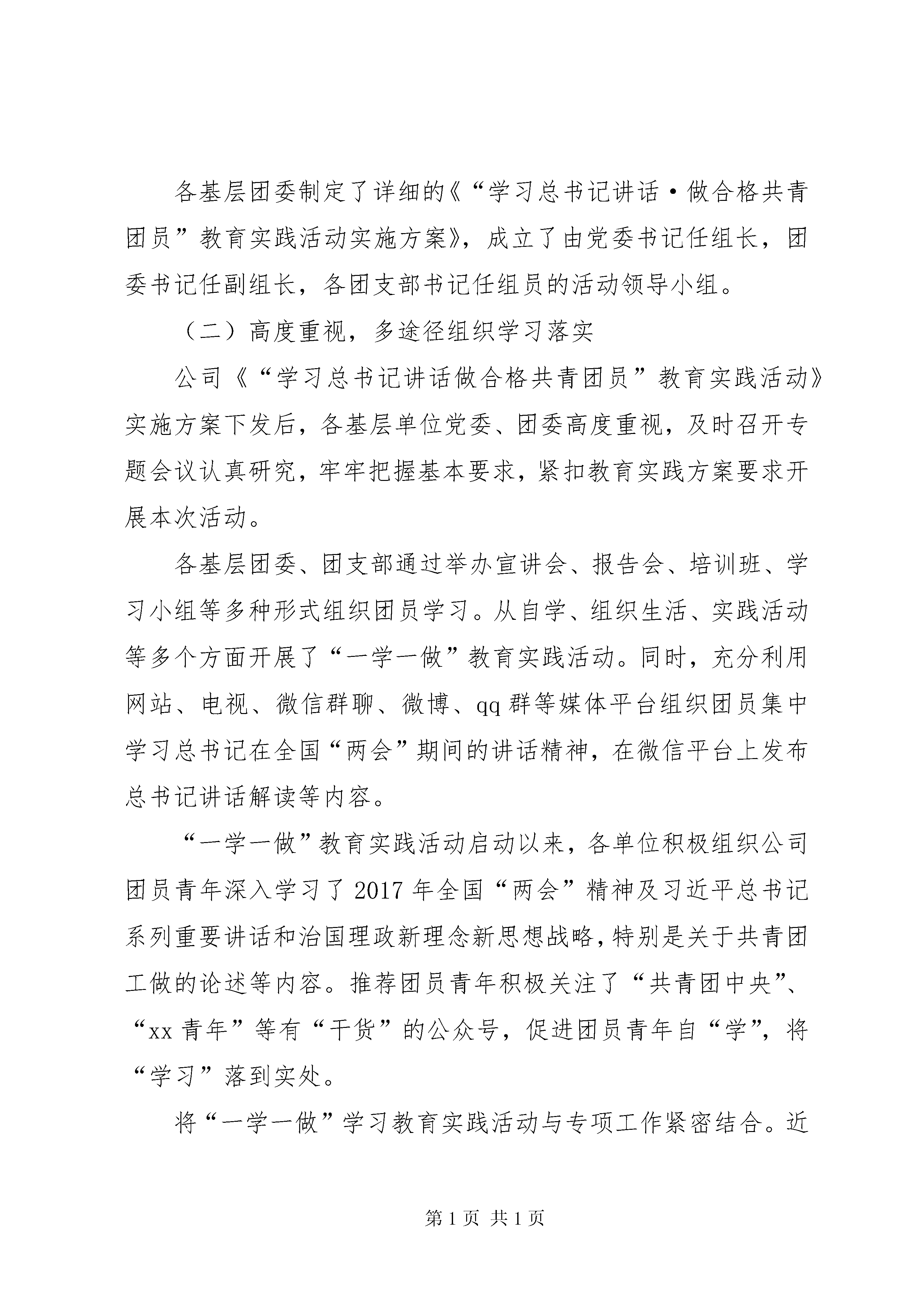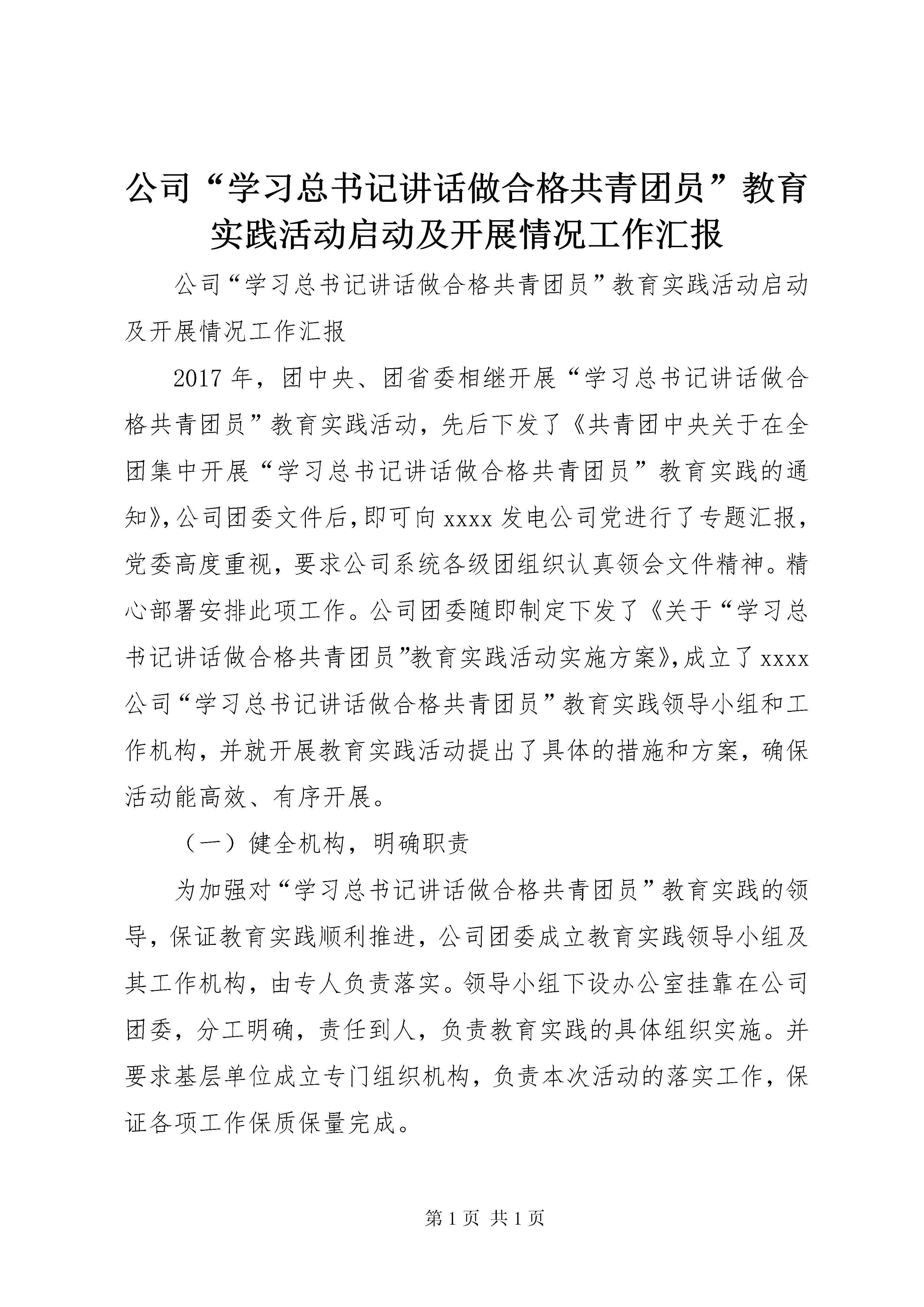 公司“学习总书记讲话做合格共青团员”教育实践活动启动及开展情况工作汇报公司“学习总书记讲话做合格共青团员”教育实践活动启动及开展情况工作汇报2017年,团中央、团省委相继开展“学习总书记讲话做合格共青团员”教育实践活动,先后下发了《共青团中央关于在全团集中开展“学习总书记讲话做合格共青团员”教育实践的通知》,公司团委文件后,即可向xxxx发电公司党进行了专题汇报,党委高度重视,要求公司系统各级团组织认真领会文件精神。精心部署安排此项工作。公司团委随即制定下发了《关于“学习总书记讲话做合格共青团员”教育实践活动实施方案》,成立了xxxx公司“学习总书记讲话做合格共青团员”教育实践领导小组和工作机构,并就开展教育实践活动提出了具体的措施和方案,确保活动能高效、有序开展。(一)健全机构,明确职责为加强对“学习总书记讲话做合格共青团员”教育实践的领导,保证教育实践顺利推进,公司团委成立教育实践领导小组及其工作机构,由专人负责落实。领导小组下设办公室挂靠在公司团委,分工明确,责任到人,负责教育实践的具体组织实施。并要求基层单位成立专门组织机构,负责本次活动的落实工作,保证各项工作保质保量完成。各基层团委制定了详细的《“学习总书记讲话·做合格共青团员”教育实践活动实施方案》,成立了由党委书记任组长,团委书记任副组长,各团支部书记任组员的活动领导小组。(二)高度重视,多途径组织学习落实公司《“学习总书记讲话做合格共青团员”教育实践活动》实施方案下发后,各基层单位党委、团委高度重视,及时召开专题会议认真研究,牢牢把握基本要求,紧扣教育实践方案要求开展本次活动。各基层团委、团支部通过举办宣讲会、报告会、培训班、学习小组等多种形式组织团员学习。从自学、组织生活、实践活动等多个方面开展了“一学一做”教育实践活动。同时,充分利用网站、电视、微信群聊、微博、qq群等媒体平台组织团员集中学习总书记在全国“两会”期间的讲话精神,在微信平台上发布总书记讲话解读等内容。“一学一做”教育实践活动启动以来,各单位积极组织公司团员青年深入学习了2017年全国“两会”精神及习近平总书记系列重要讲话和治国理政新理念新思想战略,特别是关于共青团工做的论述等内容。推荐团员青年积极关注了“共青团中央”、“xx青年”等有“干货”的公众号,促进团员青年自“学”,将“学习”落到实处。将“一学一做”学习教育实践活动与专项工作紧密结合。近期,各单位结合“‘3·5’学习雷锋日”开展了系列活动,动员团员青年将“务实、奉献、创新、奋进”的xx精神和“奉献、友爱、互助、进步”的志愿精神结合起来,带领团员青年走出企业,进入社区,开展宣传倡议、卫生整治、文明畅交通、关爱空巢老人等志愿服务活动“微行动”,传承发扬雷锋精神,培养了团员青年服务奉献的精神。各单位结合目前公司的生产实际,同步开展了“春检”比赛,鼓励青年团员踊跃参加,助力春检工作开展,为奋力拼搏、争做xx工匠营造浓厚氛围。(三)下一步工作安排:在学习教育方面,将紧密围绕习近平总书记系列重要讲话精神和治国理政新理念新思想新战略,认真组织自学,上好主题团课,开展征文活动。打好学习基础,保证学习高效、持续开展。在组织生活方面,以公司团委为核心,以团支部为基本单位,以“三会两制一课”等团员教育管理制度为基本依据,集中开展好组织生活会、优秀团员入党仪式和评选表彰工作,加强和整顿规范基层团组在实践活动方面,组织开展好团员志愿服务、“不忘初心跟党走”网络主题团日、团员先锋岗创建等活动,保证做的落脚点落到实处,发挥和彰显团员的先进性。xxxx发电有限公司团委2017.3.31