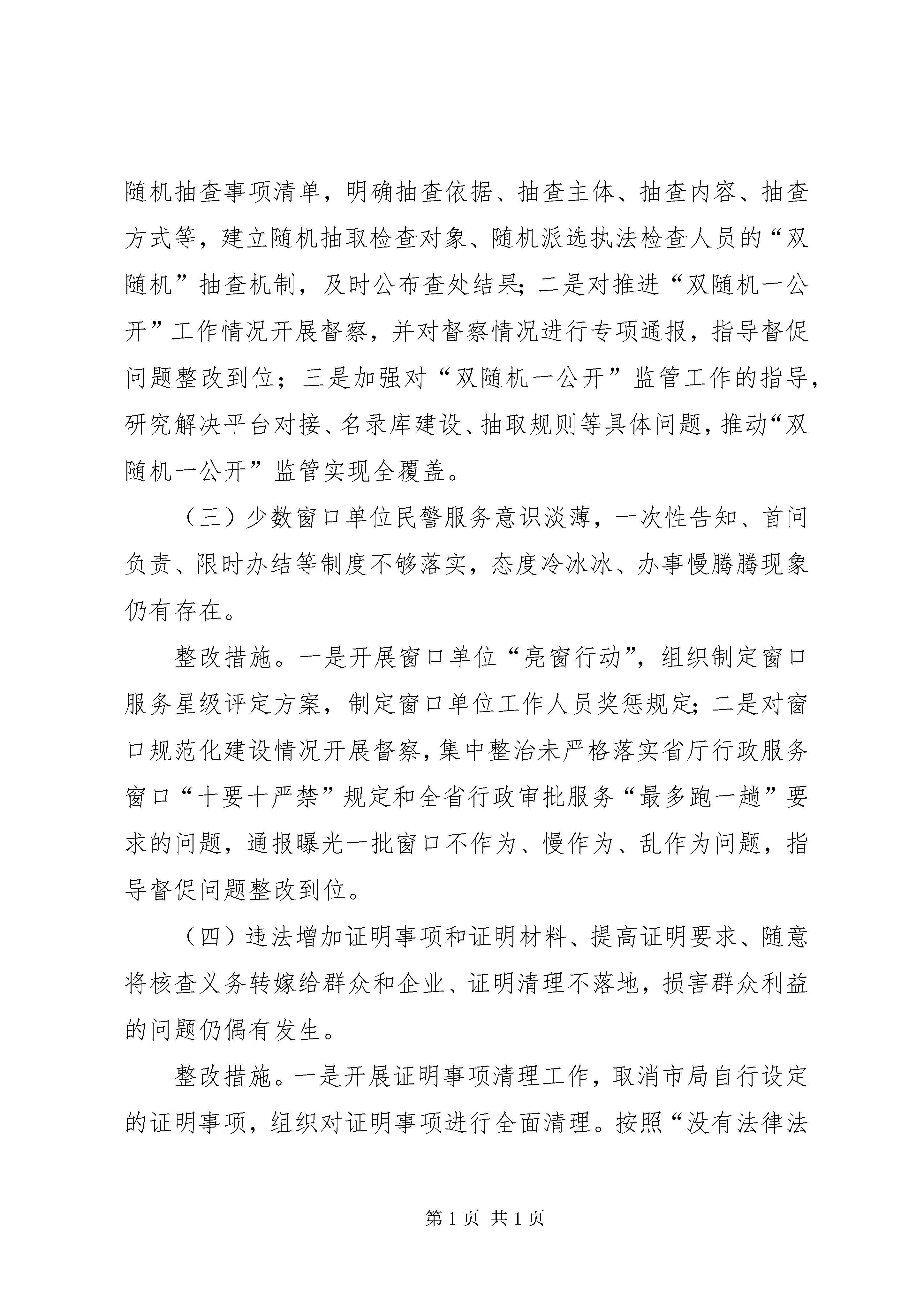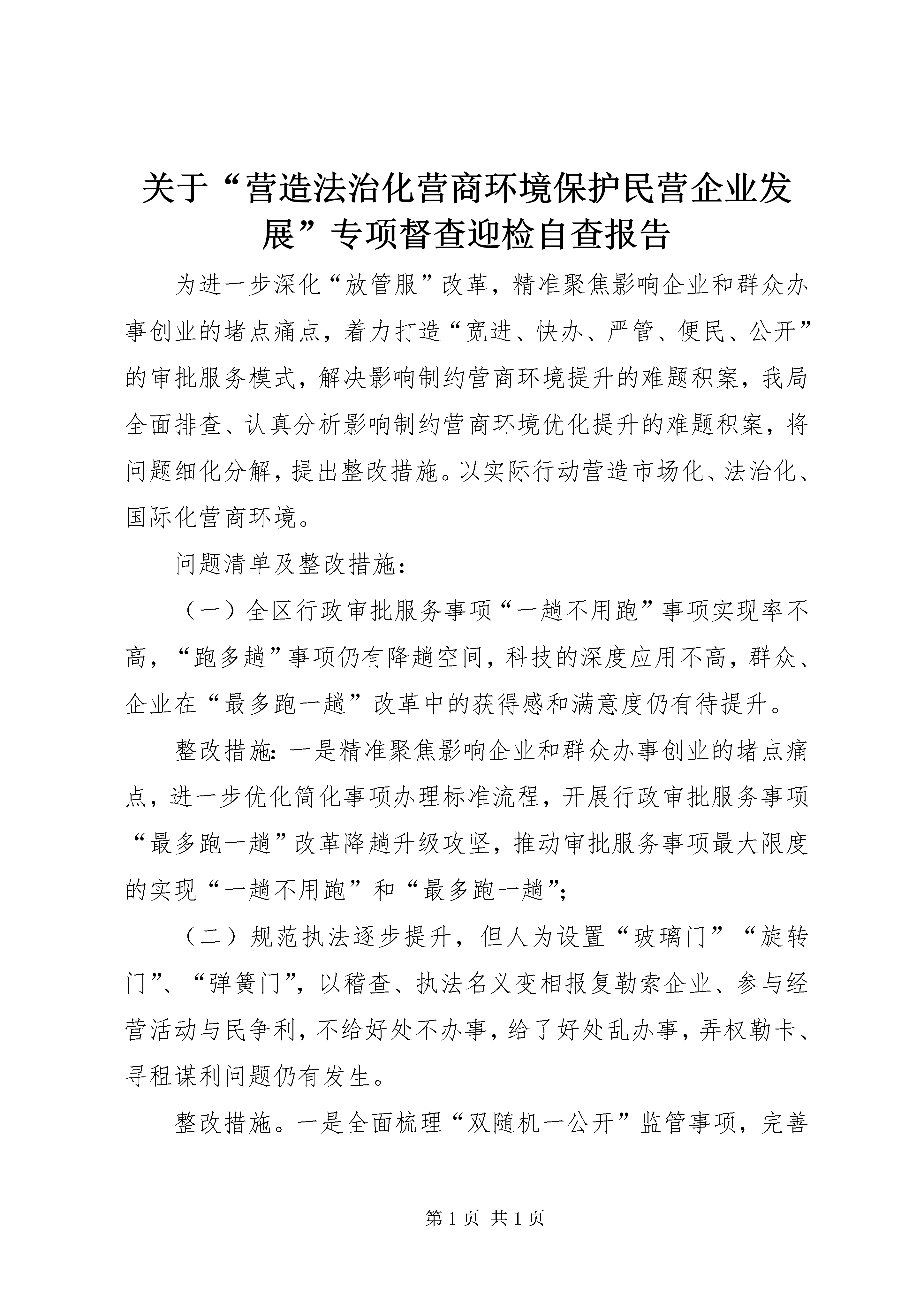 关于“营造法治化营商环境保护民营企业发展”专项督查迎检自查报告为进一步深化“放管服”改革,精准聚焦影响企业和群众办事创业的堵点痛点,着力打造“宽进、快办、严管、便民、公开”的审批服务模式,解决影响制约营商环境提升的难题积案,我局全面排查、认真分析影响制约营商环境优化提升的难题积案,将问题细化分解,提出整改措施。以实际行动营造市场化、法治化、国际化营商环境。问题清单及整改措施:(一)全区行政审批服务事项“一趟不用跑”事项实现率不高,“跑多趟”事项仍有降趟空间,科技的深度应用不高,群众、企业在“最多跑一趟”改革中的获得感和满意度仍有待提升。整改措施:一是精准聚焦影响企业和群众办事创业的堵点痛点,进一步优化简化事项办理标准流程,开展行政审批服务事项“最多跑一趟”改革降趟升级攻坚,推动审批服务事项最大限度的实现“一趟不用跑”和“最多跑一趟”;(二)规范执法逐步提升,但人为设置“玻璃门”“旋转门”、“弹簧门”,以稽查、执法名义变相报复勒索企业、参与经营活动与民争利,不给好处不办事,给了好处乱办事,弄权勒卡、寻租谋利问题仍有发生。整改措施。一是全面梳理“双随机一公开”监管事项,完善随机抽查事项清单,明确抽查依据、抽查主体、抽查内容、抽查方式等,建立随机抽取检查对象、随机派选执法检查人员的“双随机”抽查机制,及时公布查处结果;二是对推进“双随机一公开”工作情况开展督察,并对督察情况进行专项通报,指导督促问题整改到位;三是加强对“双随机一公开”监管工作的指导,研究解决平台对接、名录库建设、抽取规则等具体问题,推动“双随机一公开”监管实现全覆盖。(三)少数窗口单位民警服务意识淡薄,一次性告知、首问负责、限时办结等制度不够落实,态度冷冰冰、办事慢腾腾现象仍有存在。整改措施。一是开展窗口单位“亮窗行动”,组织制定窗口服务星级评定方案,制定窗口单位工作人员奖惩规定;二是对窗口规范化建设情况开展督察,集中整治未严格落实省厅行政服务窗口“十要十严禁”规定和全省行政审批服务“最多跑一趟”要求的问题,通报曝光一批窗口不作为、慢作为、乱作为问题,指导督促问题整改到位。(四)违法增加证明事项和证明材料、提高证明要求、随意将核查义务转嫁给群众和企业、证明清理不落地,损害群众利益的问题仍偶有发生。整改措施。一是开展证明事项清理工作,取消市局自行设定的证明事项,组织对证明事项进行全面清理。按照“没有法律法规规定的证明事项,一律取消”和“我省政府规章及规范性文件自行设定的证明事项,直接取消”的原则,减少不必要的证明材料;二是落实《关于***取消证明事项通知》精神,认真做好取消证明事项的各项衔接工作;三是对证明事项清理结果运用工作情况进行督察,通报曝光一批证明清理不落地,损害群众利益的问题,指导督促问题整改到位。