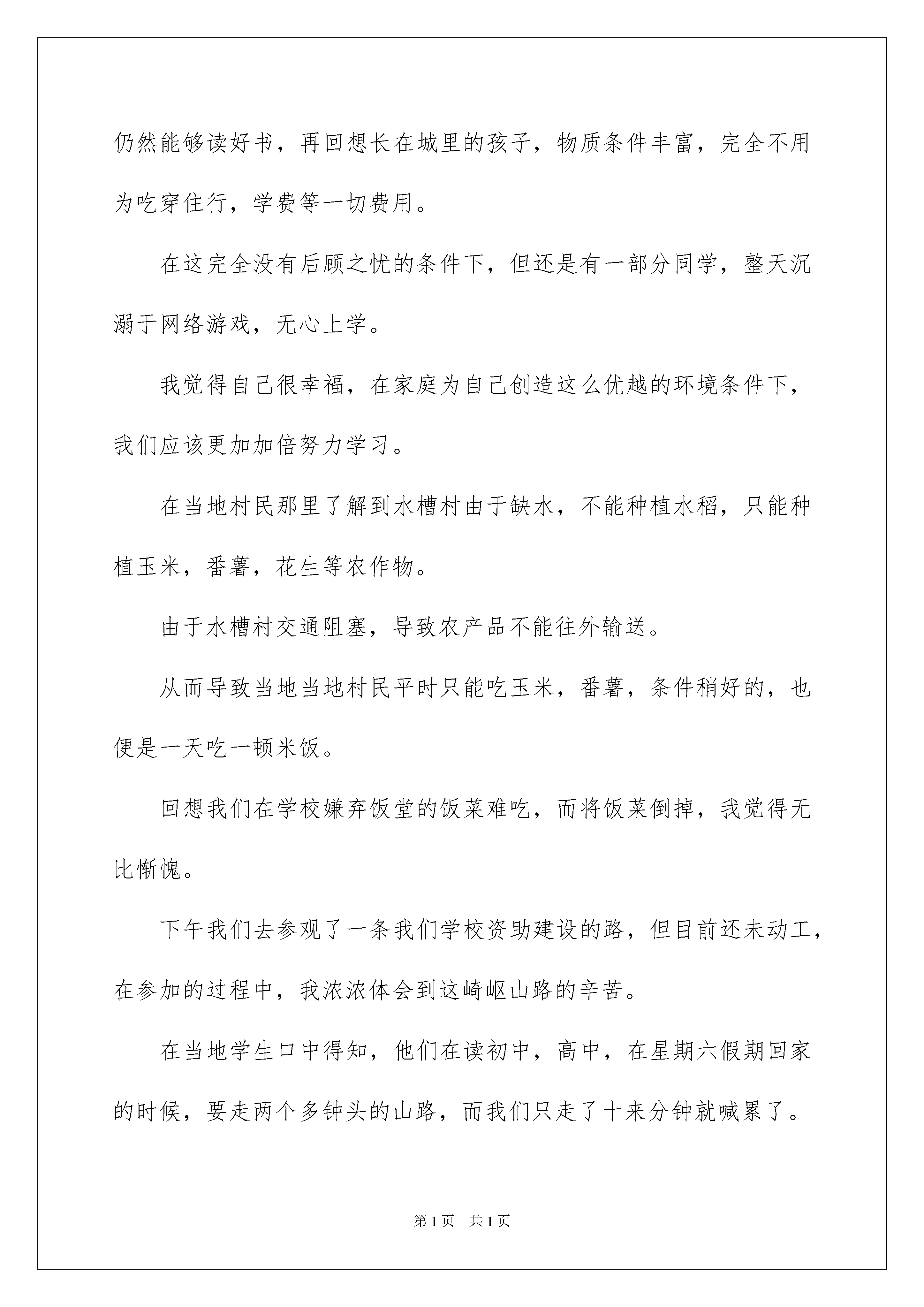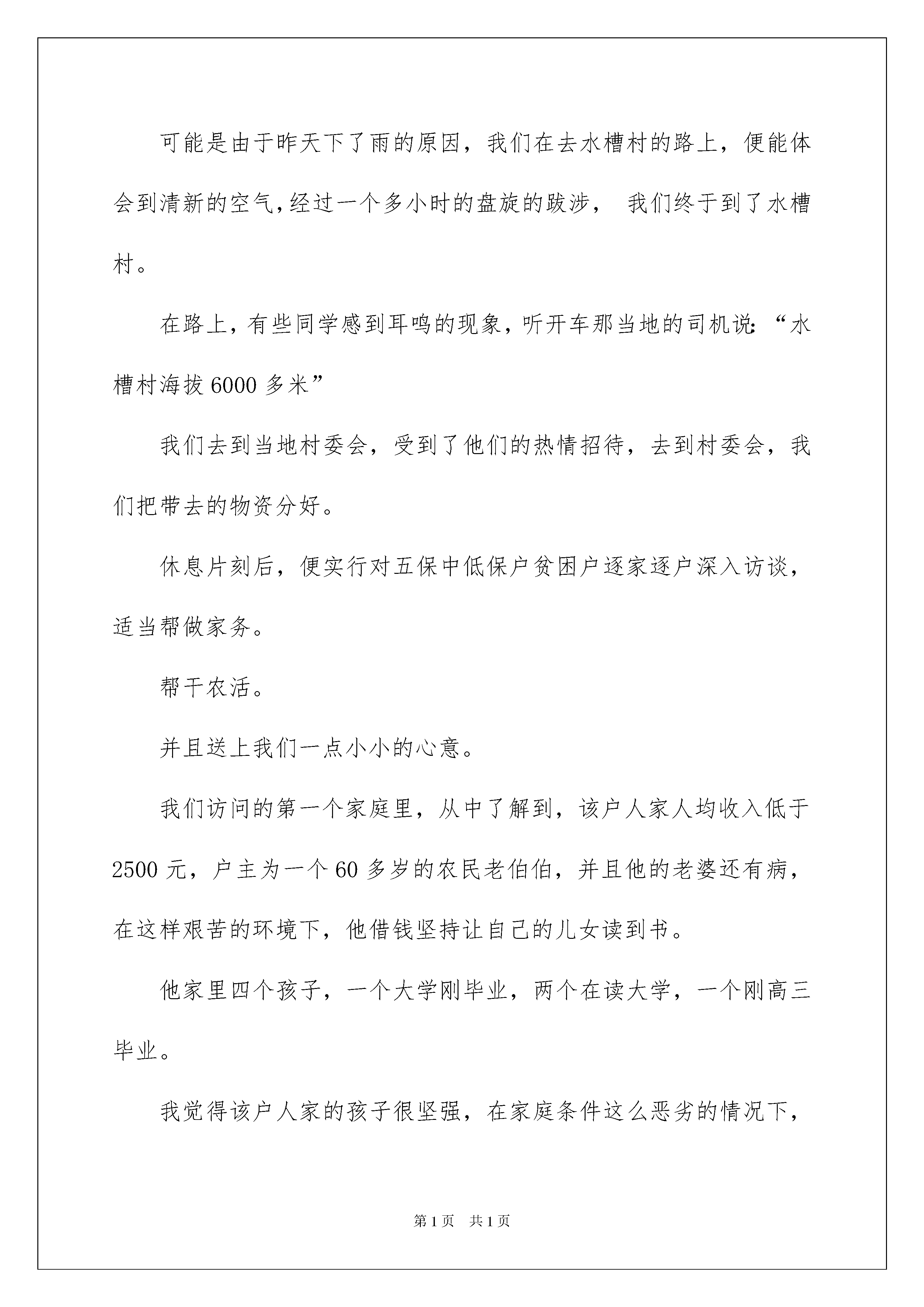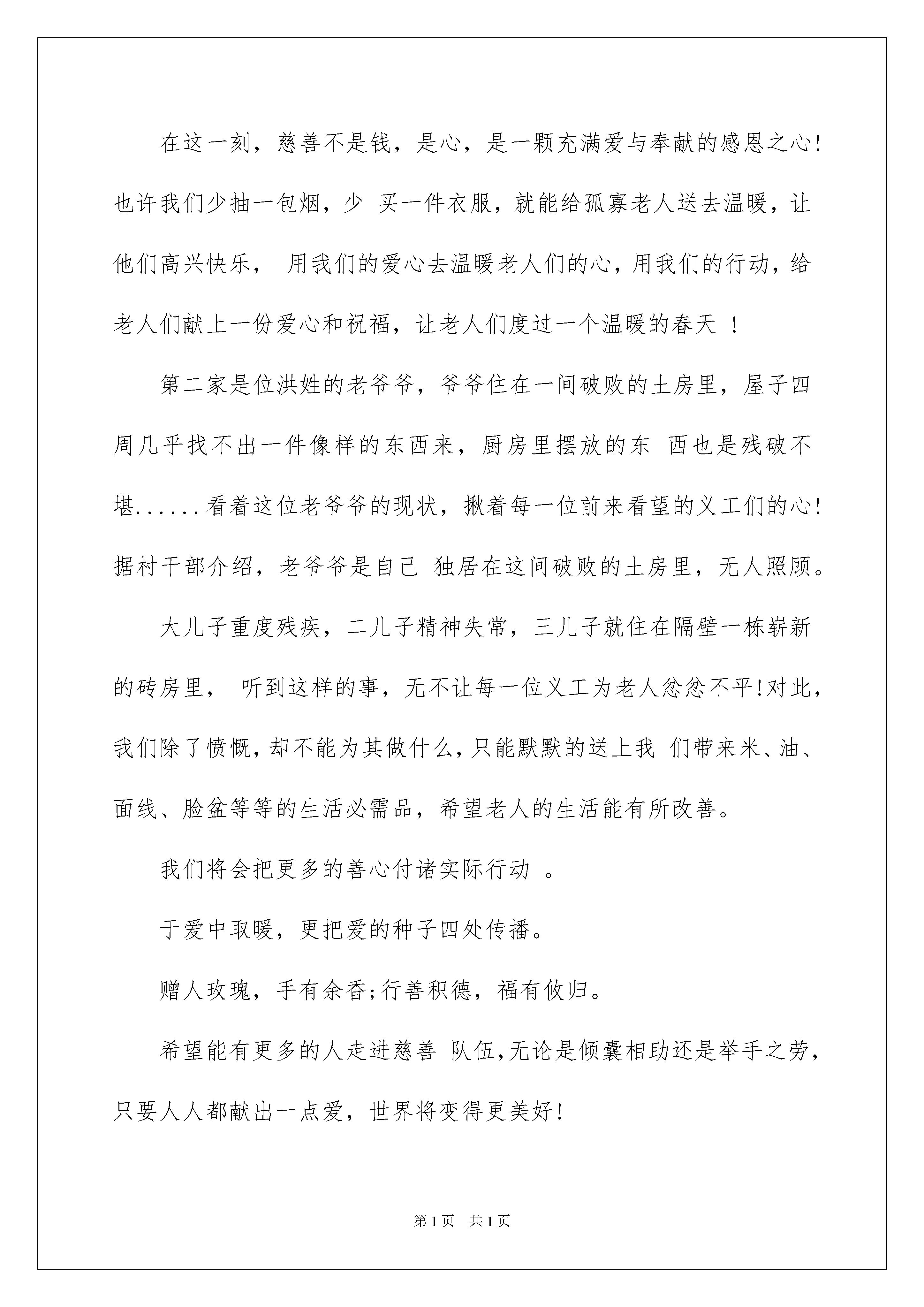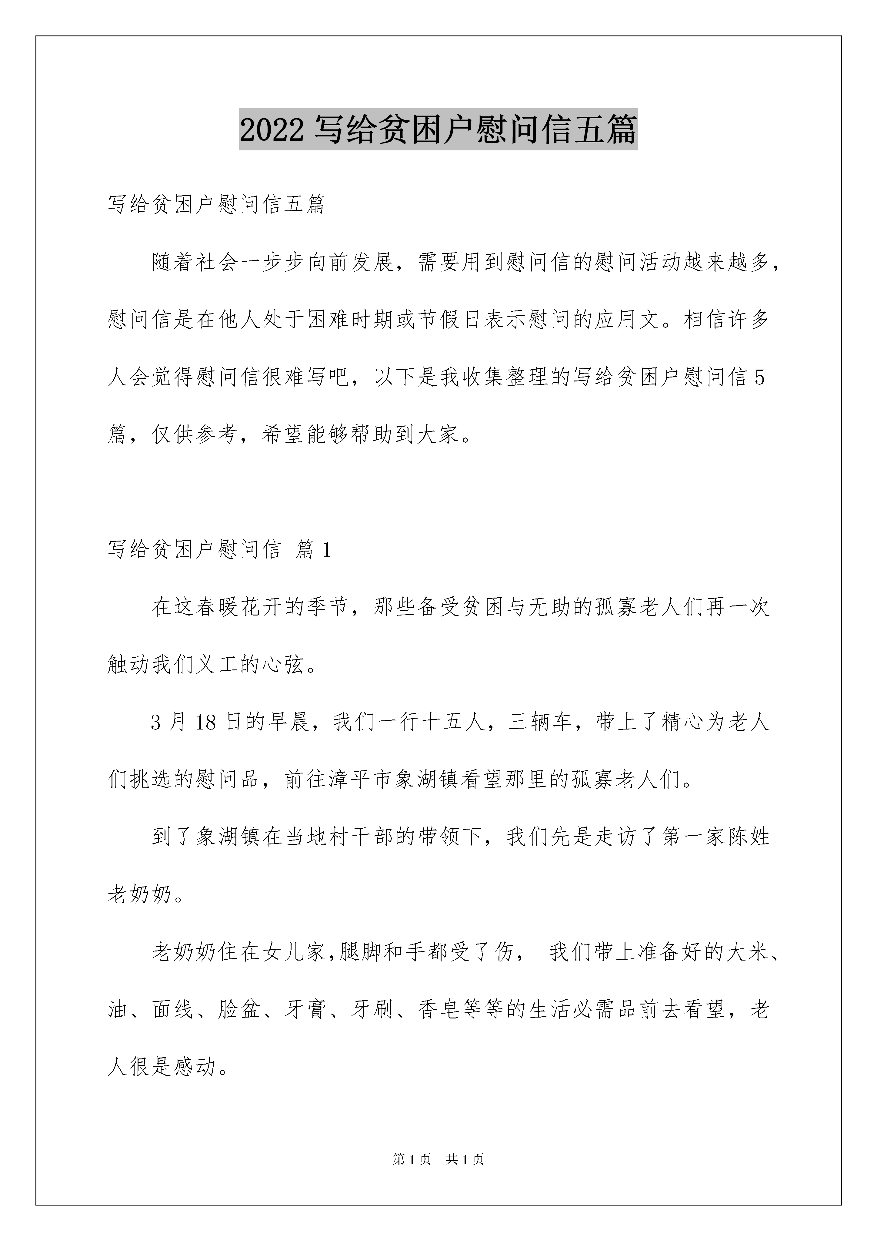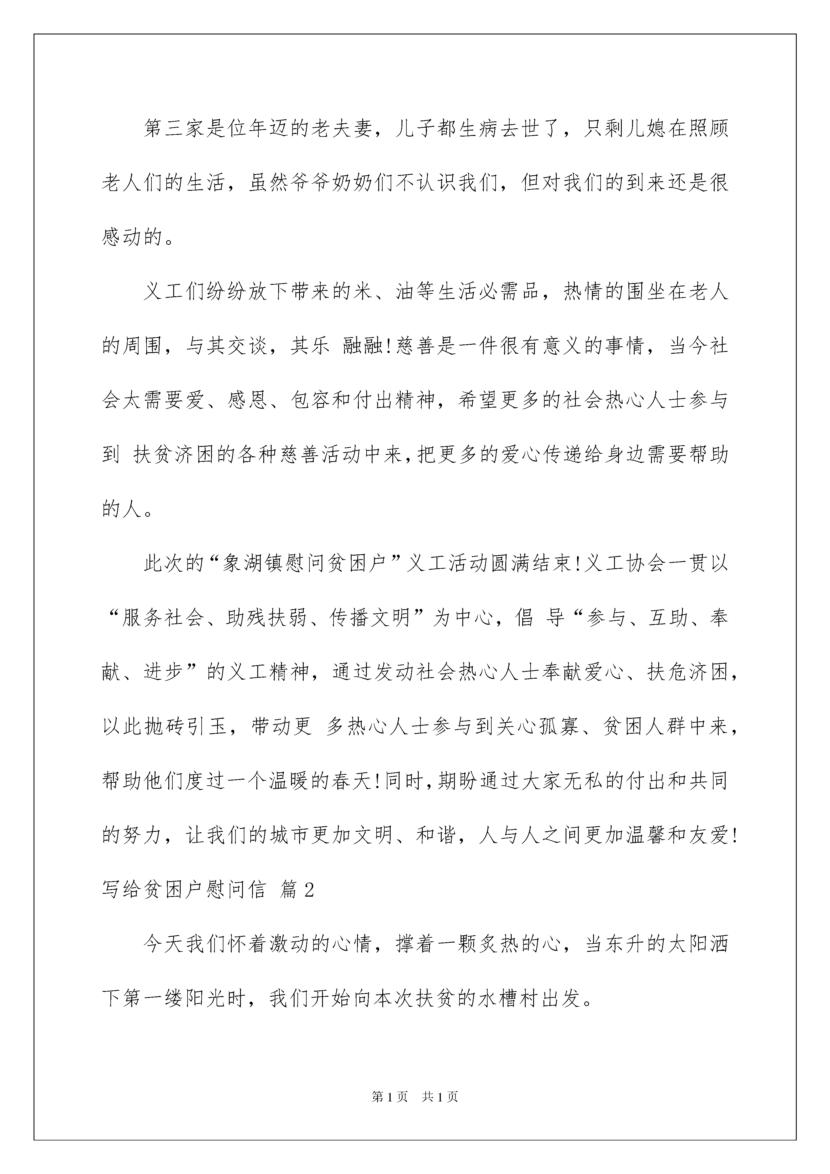 2022写给贫困户慰问信五篇写给贫困户慰问信五篇随着社会一步步向前发展,需要用到慰问信的慰问活动越来越多,慰问信是在他人处于困难时期或节假日表示慰问的应用文。相信许多人会觉得慰问信很难写吧,以下是我收集整理的写给贫困户慰问信5篇,仅供参考,希望能够帮助到大家。写给贫困户慰问信篇1在这春暖花开的季节,那些备受贫困与无助的孤寡老人们再一次触动我们义工的心弦。3月18日的早晨,我们一行十五人,三辆车,带上了精心为老人们挑选的慰问品,前往漳平市象湖镇看望那里的孤寡老人们。到了象湖镇在当地村干部的带领下,我们先是走访了第一家陈姓老奶奶。老奶奶住在女儿家,腿脚和手都受了伤,我们带上准备好的大米、油、面线、脸盆、牙膏、牙刷、香皂等等的生活必需品前去看望,老人很是感动。在这一刻,慈善不是钱,是心,是一颗充满爱与奉献的感恩之心!也许我们少抽一包烟,少买一件衣服,就能给孤寡老人送去温暖,让他们高兴快乐,用我们的爱心去温暖老人们的心,用我们的行动,给老人们献上一份爱心和祝福,让老人们度过一个温暖的春天!第二家是位洪姓的老爷爷,爷爷住在一间破败的土房里,屋子四周几乎找不出一件像样的东西来,厨房里摆放的东西也是残破不堪......看着这位老爷爷的现状,揪着每一位前来看望的义工们的心!据村干部介绍,老爷爷是自己独居在这间破败的土房里,无人照顾。大儿子重度残疾,二儿子精神失常,三儿子就住在隔壁一栋崭新的砖房里,听到这样的事,无不让每一位义工为老人忿忿不平!对此,我们除了愤慨,却不能为其做什么,只能默默的送上我们带来米、油、面线、脸盆等等的生活必需品,希望老人的生活能有所改善。我们将会把更多的善心付诸实际行动。于爱中取暖,更把爱的种子四处传播。赠人玫瑰,手有余香;行善积德,福有攸归。希望能有更多的人走进慈善队伍,无论是倾囊相助还是举手之劳,只要人人都献出一点爱,世界将变得更美好!第三家是位年迈的老夫妻,儿子都生病去世了,只剩儿媳在照顾老人们的生活,虽然爷爷奶奶们不认识我们,但对我们的到来还是很感动的。义工们纷纷放下带来的米、油等生活必需品,热情的围坐在老人的周围,与其交谈,其乐融融!慈善是一件很有意义的事情,当今社会太需要爱、感恩、包容和付出精神,希望更多的社会热心人士参与到扶贫济困的各种慈善活动中来,把更多的爱心传递给身边需要帮助的人。此次的“象湖镇慰问贫困户”义工活动圆满结束!义工协会一贯以“服务社会、助残扶弱、传播文明”为中心,倡导“参与、互助、奉献、进步”的义工精神,通过发动社会热心人士奉献爱心、扶危济困,以此抛砖引玉,带动更多热心人士参与到关心孤寡、贫困人群中来,帮助他们度过一个温暖的春天!同时,期盼通过大家无私的付出和共同的努力,让我们的城市更加文明、和谐,人与人之间更加温馨和友爱!写给贫困户慰问信篇2今天我们怀着激动的心情,撑着一颗炙热的心,当东升的太阳洒下第一缕阳光时,我们开始向本次扶贫的水槽村出发。可能是由于昨天下了雨的原因,我们在去水槽村的路上,便能体会到清新的空气,经过一个多小时的盘旋的跋涉,我们终于到了水槽村。在路上,有些同学感到耳鸣的现象,听开车那当地的司机说:“水槽村海拔6000多米”我们去到当地村委会,受到了他们的热情招待,去到村委会,我们把带去的物资分好。休息片刻后,便实行对五保中低保户贫困户逐家逐户深入访谈,适当帮做家务。帮干农活。并且送上我们一点小小的心意。我们访问的第一个家庭里,从中了解到,该户人家人均收入低于2500元,户主为一个60多岁的农民老伯伯,并且他的老婆还有病,在这样艰苦的环境下,他借钱坚持让自己的儿女读到书。他家里四个孩子,一个大学刚毕业,两个在读大学,一个刚高三毕业。我觉得该户人家的孩子很坚强,在家庭条件这么恶劣的情况下,仍然能够读好书,再回想长在城里的孩子,物质条件丰富,完全不用为吃穿住行,学费等一切费用。在这完全没有后顾之忧的条件下,但还是有一部分同学,整天沉溺于网络游戏,无心上学。我觉得自己很幸福,在家庭为自己创造这么优越的环境条件下,我们应该更加加倍努力学习。在当地村民那里了解到水槽村由于缺水,不能种植水稻,只能种植玉米,番薯,花生等农作物。由于水槽村交通阻塞,导致农产品不能往外输送。从而导致当地当地村民平时只能吃玉米,番薯,条件稍好的,也便是一天吃一顿米饭。回想我们在学校嫌弃饭堂的饭菜难吃,而将饭菜倒掉,我觉得无比惭愧。下午我们去参观了一条我们学校资助建设的路,但目前还未动工,在参加的过程中,我浓浓体会到这崎岖山路的辛苦。在当地学生口中得知,他们在读初中,高中,在星期六假期回家的时候,要走两个多钟头的山路,而我们只走了十来分钟就喊累了。他们