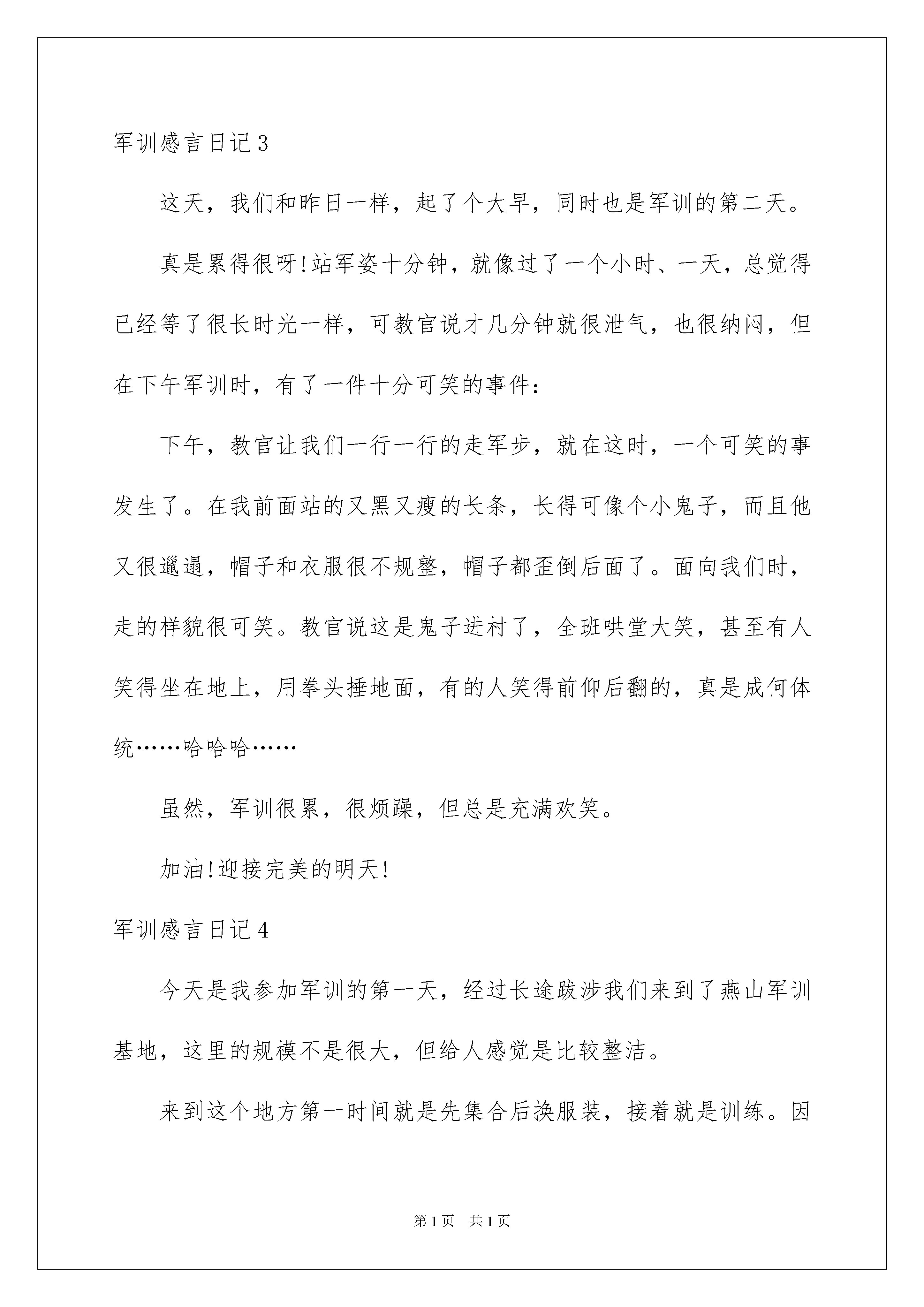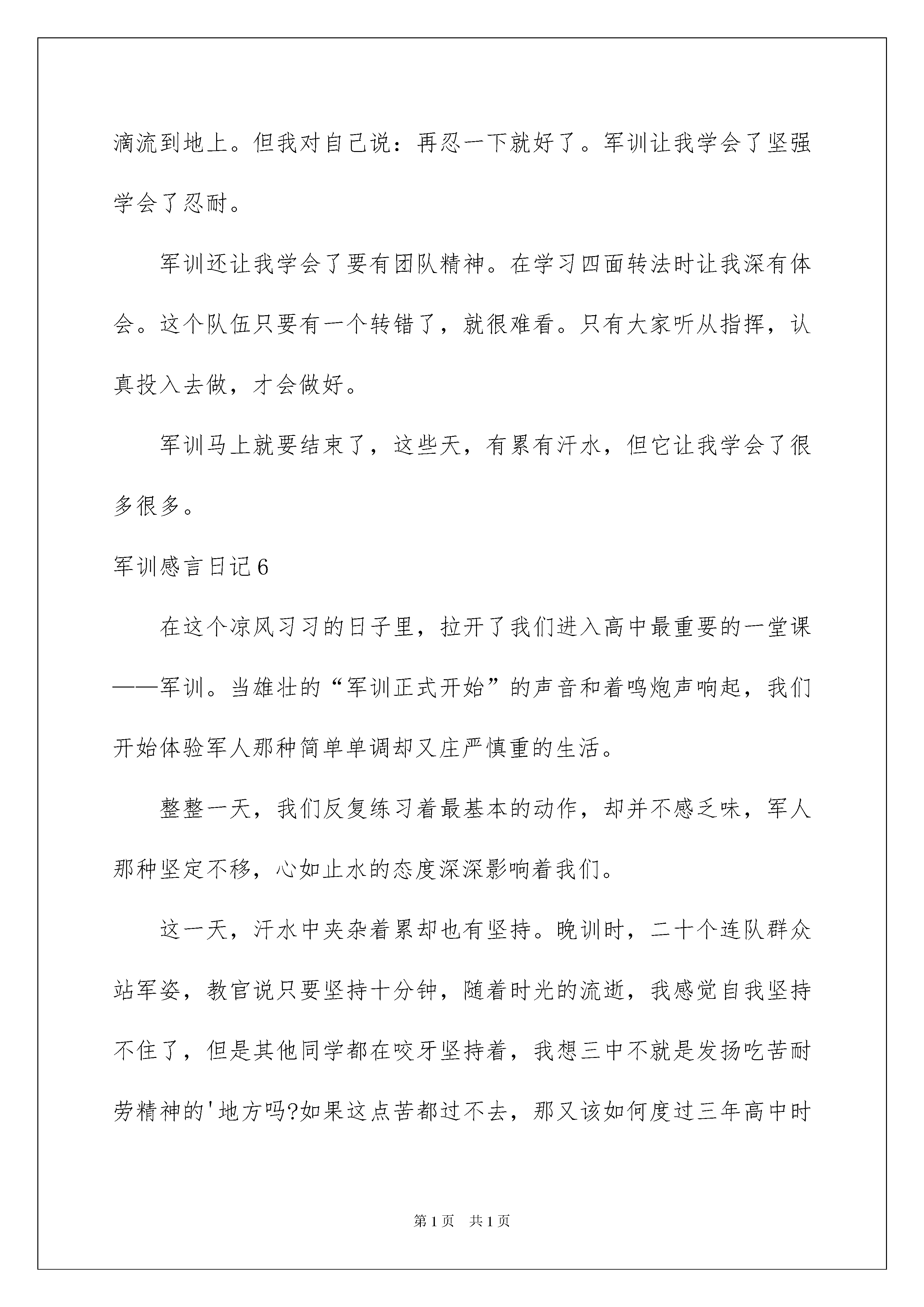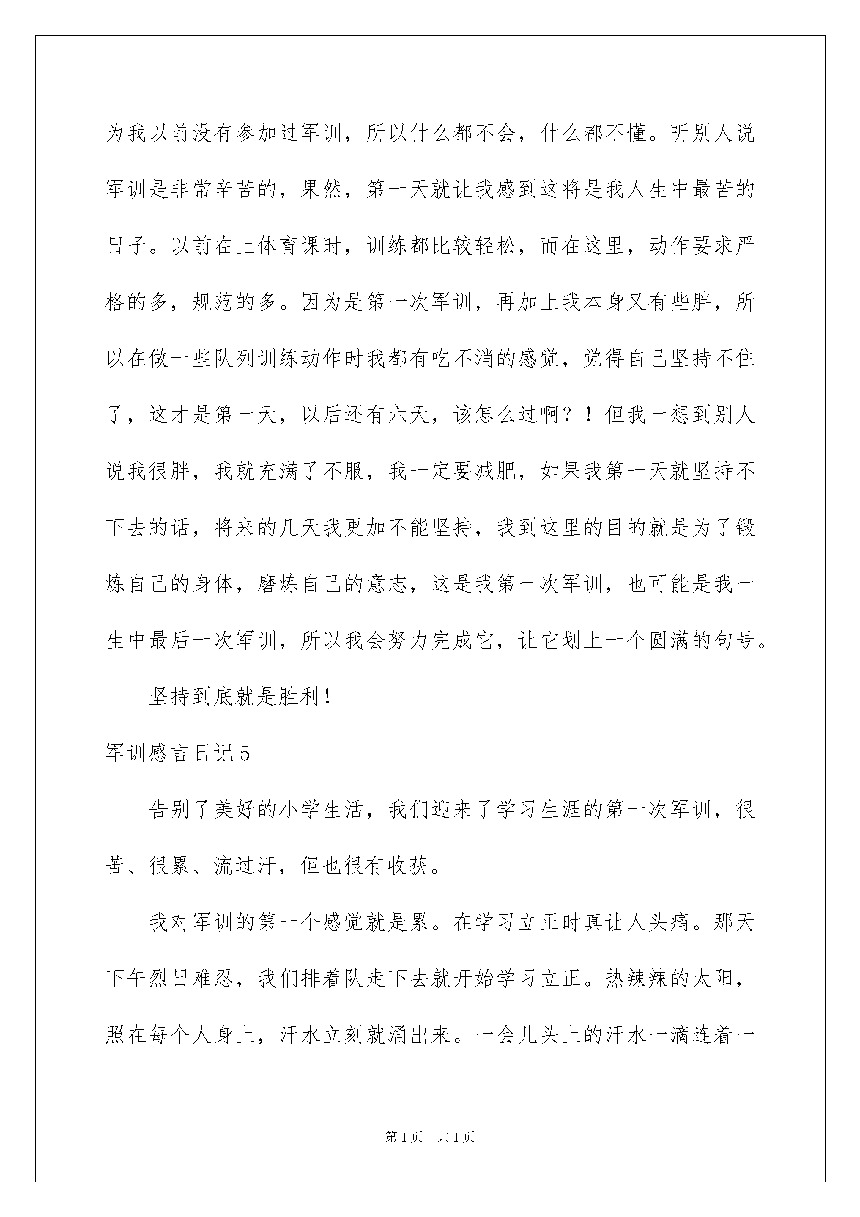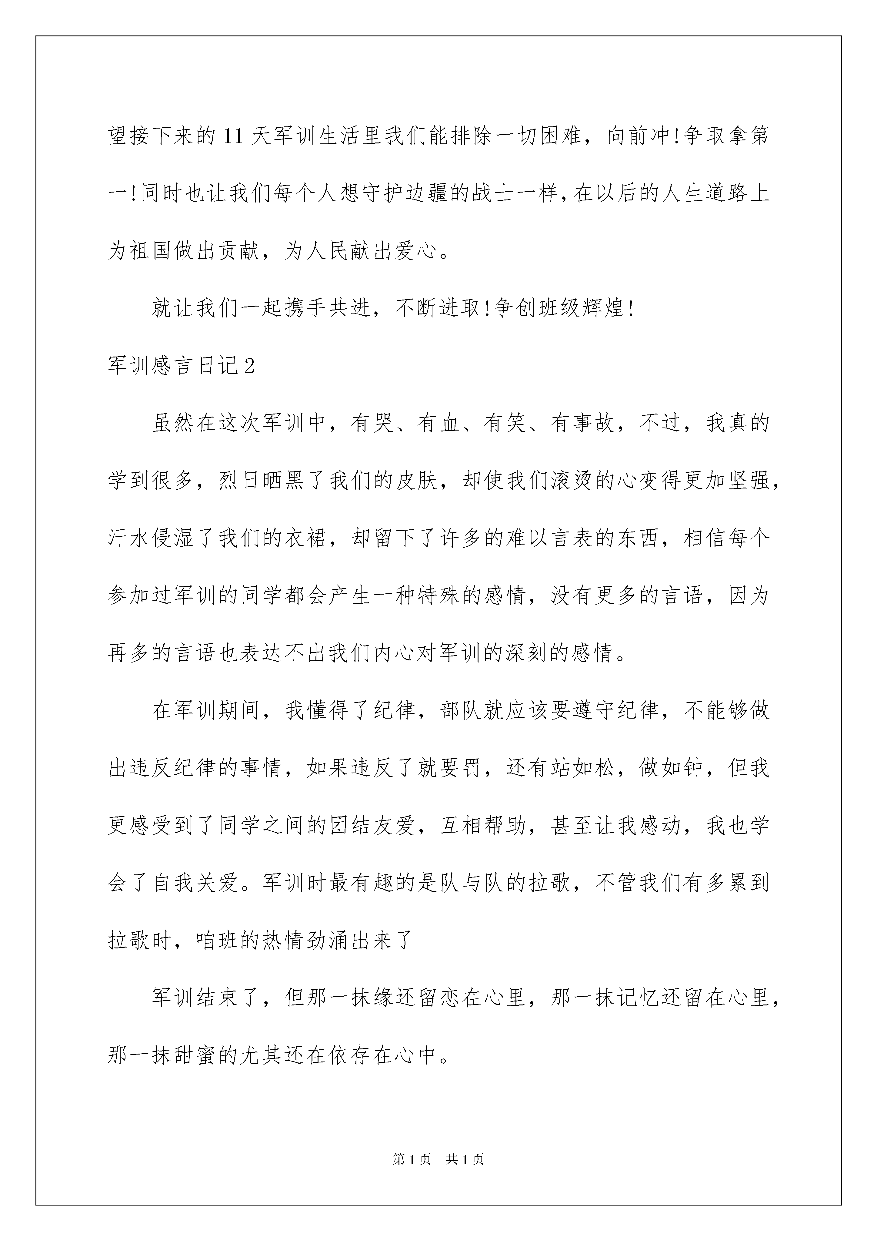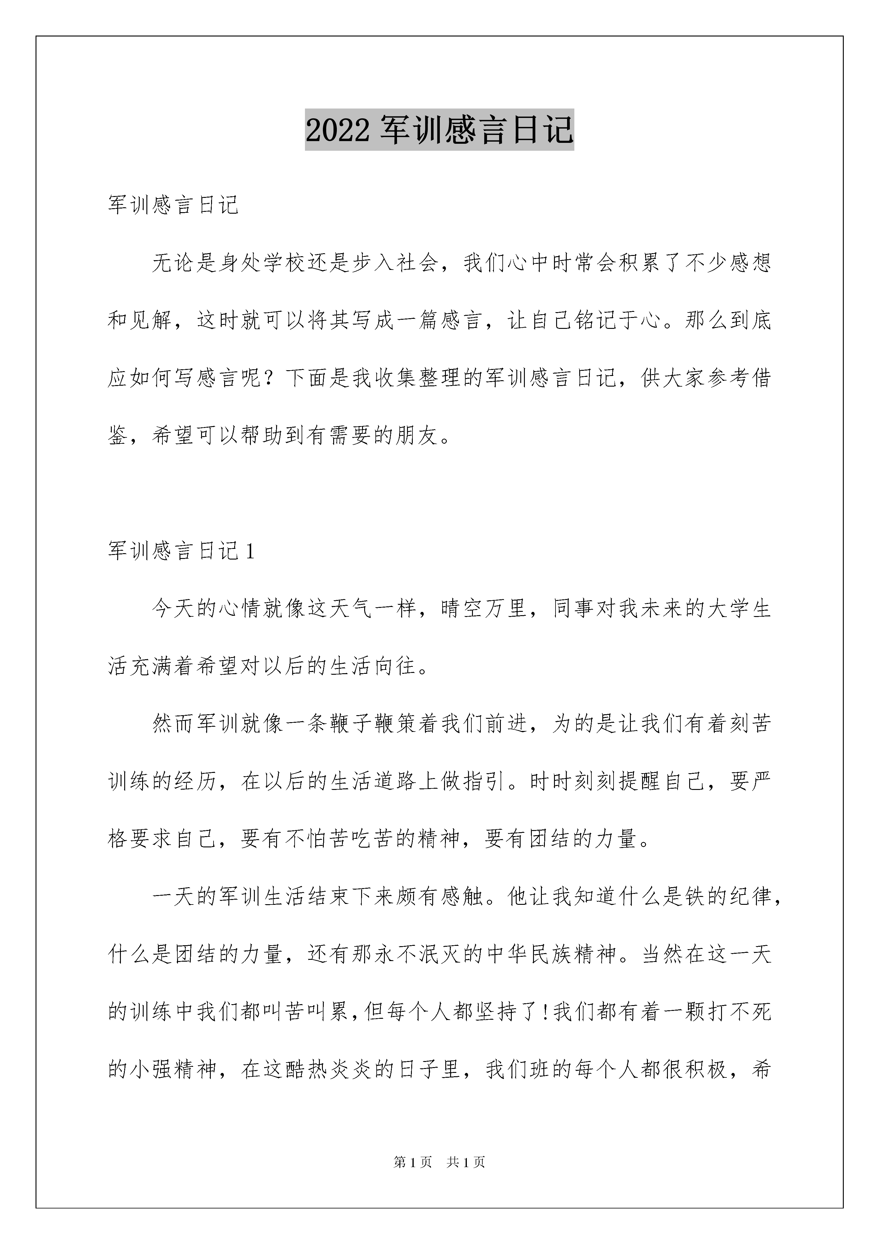 2022军训感言日记军训感言日记无论是身处学校还是步入社会,我们心中时常会积累了不少感想和见解,这时就可以将其写成一篇感言,让自己铭记于心。那么到底应如何写感言呢?下面是我收集整理的军训感言日记,供大家参考借鉴,希望可以帮助到有需要的朋友。军训感言日记1今天的心情就像这天气一样,晴空万里,同事对我未来的大学生活充满着希望对以后的生活向往。然而军训就像一条鞭子鞭策着我们前进,为的是让我们有着刻苦训练的经历,在以后的生活道路上做指引。时时刻刻提醒自己,要严格要求自己,要有不怕苦吃苦的精神,要有团结的力量。一天的军训生活结束下来颇有感触。他让我知道什么是铁的纪律,什么是团结的力量,还有那永不泯灭的中华民族精神。当然在这一天的训练中我们都叫苦叫累,但每个人都坚持了!我们都有着一颗打不死的小强精神,在这酷热炎炎的日子里,我们班的每个人都很积极,希望接下来的11天军训生活里我们能排除一切困难,向前冲!争取拿第一!同时也让我们每个人想守护边疆的战士一样,在以后的人生道路上为祖国做出贡献,为人民献出爱心。就让我们一起携手共进,不断进取!争创班级辉煌!军训感言日记2虽然在这次军训中,有哭、有血、有笑、有事故,不过,我真的学到很多,烈日晒黑了我们的皮肤,却使我们滚烫的心变得更加坚强,汗水侵湿了我们的衣裙,却留下了许多的难以言表的东西,相信每个参加过军训的同学都会产生一种特殊的感情,没有更多的言语,因为再多的言语也表达不出我们内心对军训的深刻的感情。在军训期间,我懂得了纪律,部队就应该要遵守纪律,不能够做出违反纪律的事情,如果违反了就要罚,还有站如松,做如钟,但我更感受到了同学之间的团结友爱,互相帮助,甚至让我感动,我也学会了自我关爱。军训时最有趣的是队与队的拉歌,不管我们有多累到拉歌时,咱班的热情劲涌出来了军训结束了,但那一抹缘还留恋在心里,那一抹记忆还留在心里,那一抹甜蜜的尤其还在依存在心中。军训感言日记3这天,我们和昨日一样,起了个大早,同时也是军训的第二天。真是累得很呀!站军姿十分钟,就像过了一个小时、一天,总觉得已经等了很长时光一样,可教官说才几分钟就很泄气,也很纳闷,但在下午军训时,有了一件十分可笑的事件:下午,教官让我们一行一行的走军步,就在这时,一个可笑的事发生了。在我前面站的又黑又瘦的长条,长得可像个小鬼子,而且他又很邋遢,帽子和衣服很不规整,帽子都歪倒后面了。面向我们时,走的样貌很可笑。教官说这是鬼子进村了,全班哄堂大笑,甚至有人笑得坐在地上,用拳头捶地面,有的人笑得前仰后翻的,真是成何体统……哈哈哈……虽然,军训很累,很烦躁,但总是充满欢笑。加油!迎接完美的明天!军训感言日记4今天是我参加军训的第一天,经过长途跋涉我们来到了燕山军训基地,这里的规模不是很大,但给人感觉是比较整洁。来到这个地方第一时间就是先集合后换服装,接着就是训练。因为我以前没有参加过军训,所以什么都不会,什么都不懂。听别人说军训是非常辛苦的,果然,第一天就让我感到这将是我人生中最苦的日子。以前在上体育课时,训练都比较轻松,而在这里,动作要求严格的多,规范的多。因为是第一次军训,再加上我本身又有些胖,所以在做一些队列训练动作时我都有吃不消的感觉,觉得自己坚持不住了,这才是第一天,以后还有六天,该怎么过啊?!但我一想到别人说我很胖,我就充满了不服,我一定要减肥,如果我第一天就坚持不下去的话,将来的几天我更加不能坚持,我到这里的目的就是为了锻炼自己的身体,磨炼自己的意志,这是我第一次军训,也可能是我一生中最后一次军训,所以我会努力完成它,让它划上一个圆满的句号。坚持到底就是胜利!军训感言日记5告别了美好的小学生活,我们迎来了学习生涯的第一次军训,很苦、很累、流过汗,但也很有收获。我对军训的第一个感觉就是累。在学习立正时真让人头痛。那天下午烈日难忍,我们排着队走下去就开始学习立正。热辣辣的太阳,照在每个人身上,汗水立刻就涌出来。一会儿头上的汗水一滴连着一滴流到地上。但我对自己说:再忍一下就好了。军训让我学会了坚强学会了忍耐。军训还让我学会了要有团队精神。在学习四面转法时让我深有体会。这个队伍只要有一个转错了,就很难看。只有大家听从指挥,认真投入去做,才会做好。军训马上就要结束了,这些天,有累有汗水,但它让我学会了很多很多。军训感言日记6在这个凉风习习的日子里,拉开了我们进入高中最重要的一堂课——军训。当雄壮的“军训正式开始”的声音和着鸣炮声响起,我们开始体验军人那种简单单调却又庄严慎重的生活。整整一天,我们反复练习着最基本的动作,却并不感乏味,军人那种坚定不移,心如止水的态度深深影响着我们。这一天,汗水中夹杂着