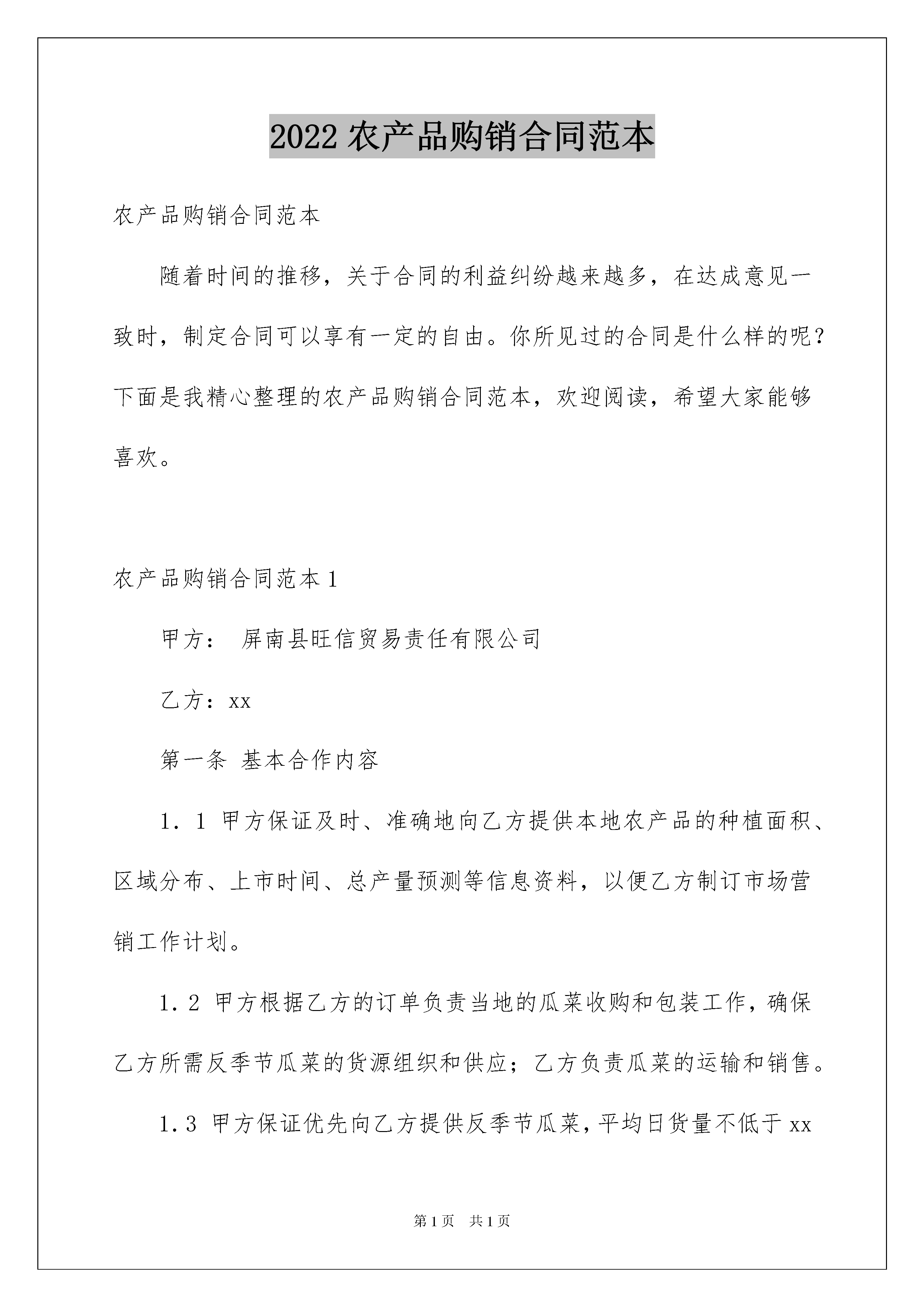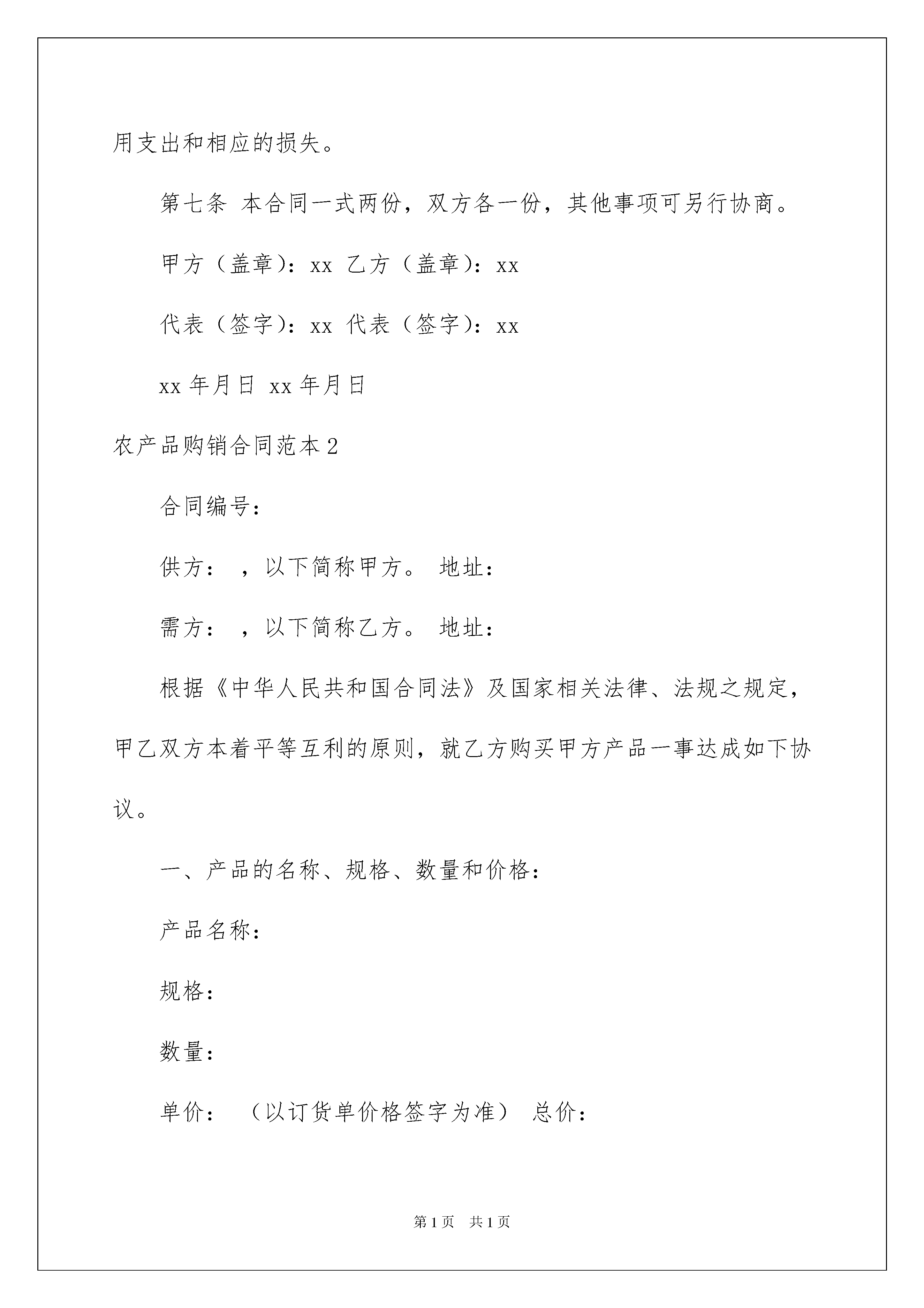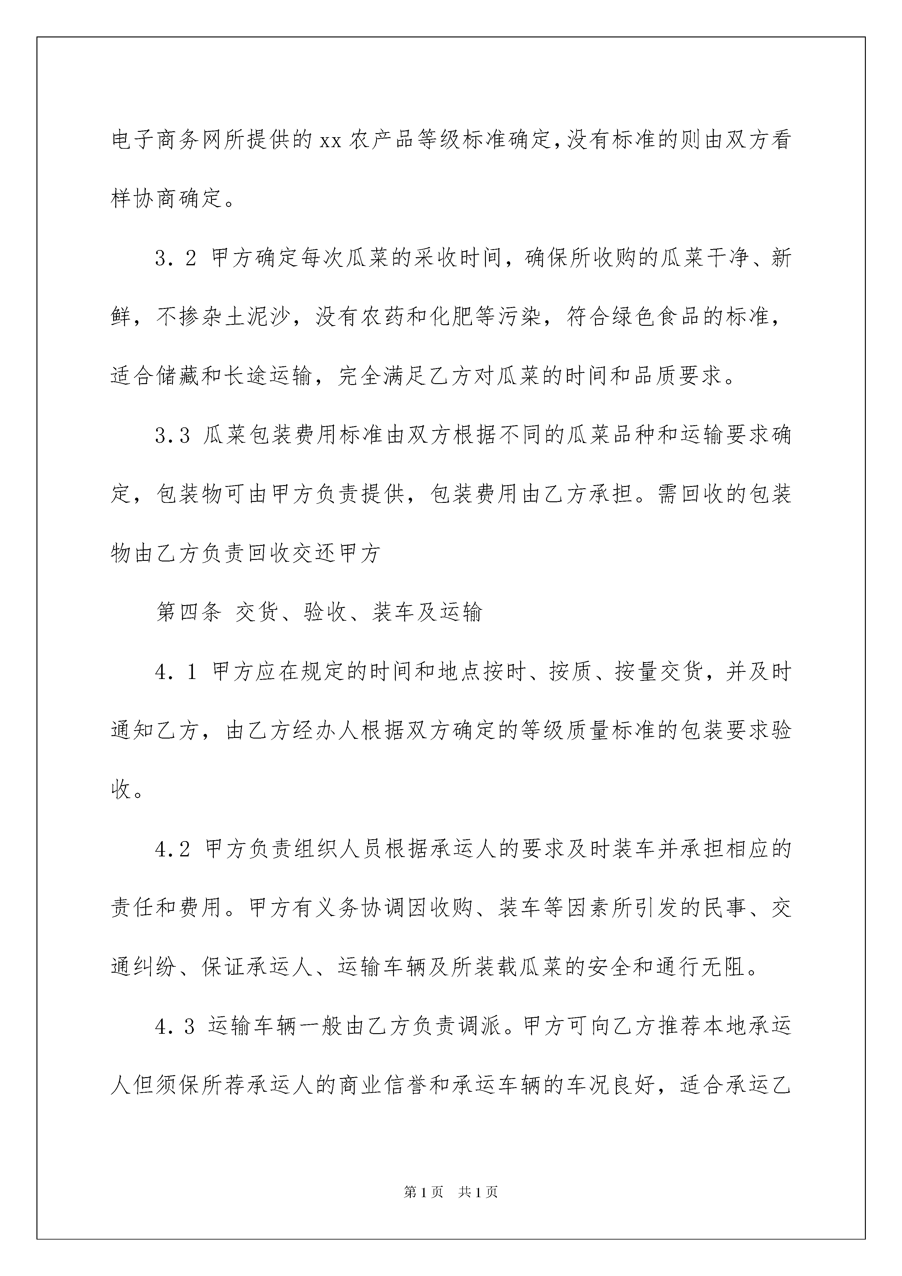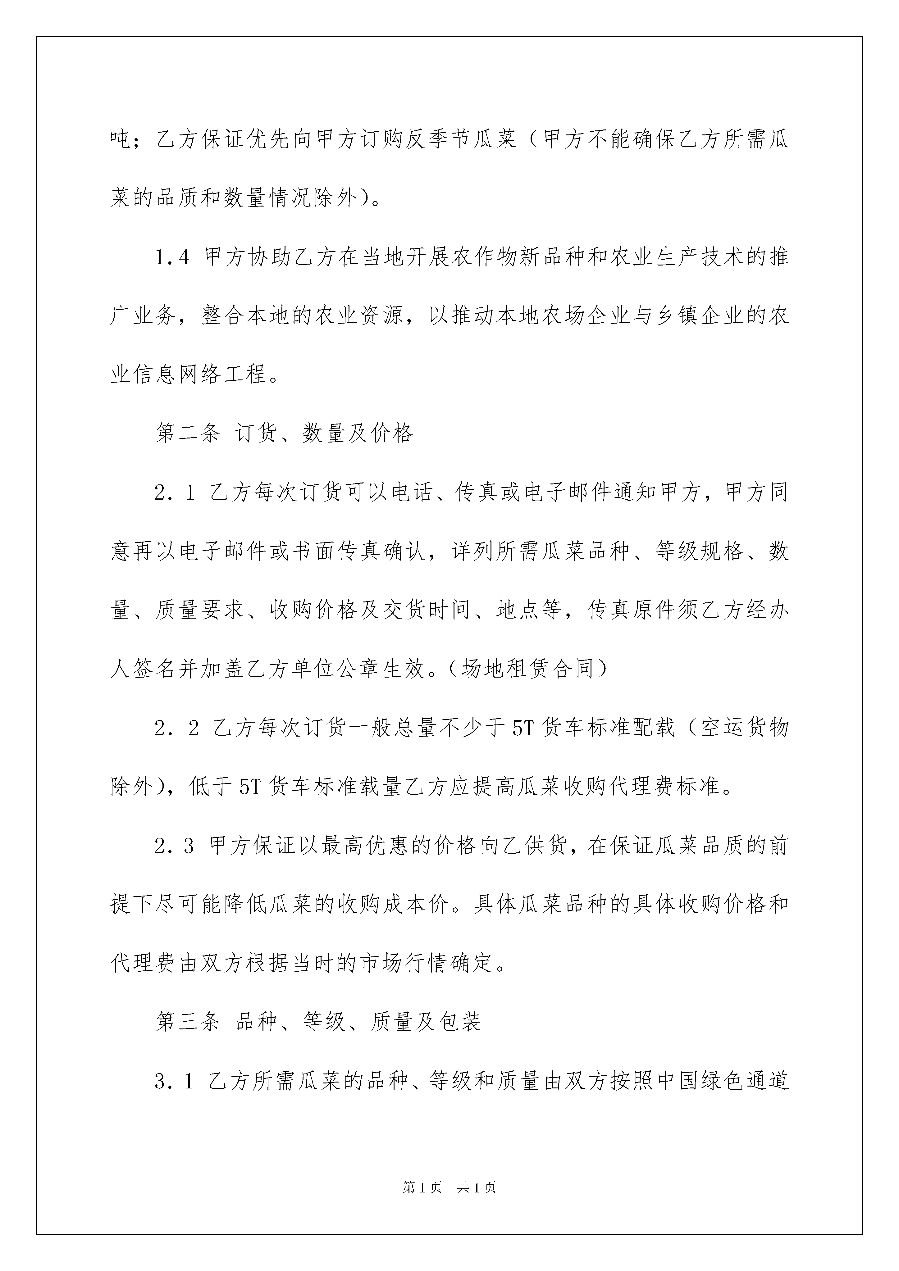 2022农产品购销合同范本农产品购销合同范本随着时间的推移,关于合同的利益纠纷越来越多,在达成意见一致时,制定合同可以享有一定的自由。你所见过的合同是什么样的呢?下面是我精心整理的农产品购销合同范本,欢迎阅读,希望大家能够喜欢。农产品购销合同范本1甲方:屏南县旺信贸易责任有限公司乙方:xx第一条基本合作内容1.1甲方保证及时、准确地向乙方提供本地农产品的种植面积、区域分布、上市时间、总产量预测等信息资料,以便乙方制订市场营销工作计划。1.2甲方根据乙方的订单负责当地的瓜菜收购和包装工作,确保乙方所需反季节瓜菜的货源组织和供应;乙方负责瓜菜的运输和销售。1.3甲方保证优先向乙方提供反季节瓜菜,平均日货量不低于xx吨;乙方保证优先向甲方订购反季节瓜菜(甲方不能确保乙方所需瓜菜的品质和数量情况除外)。1.4甲方协助乙方在当地开展农作物新品种和农业生产技术的推广业务,整合本地的农业资源,以推动本地农场企业与乡镇企业的农业信息网络工程。第二条订货、数量及价格2.1乙方每次订货可以电话、传真或电子邮件通知甲方,甲方同意再以电子邮件或书面传真确认,详列所需瓜菜品种、等级规格、数量、质量要求、收购价格及交货时间、地点等,传真原件须乙方经办人签名并加盖乙方单位公章生效。(场地租赁合同)2.2乙方每次订货一般总量不少于5T货车标准配载(空运货物除外),低于5T货车标准载量乙方应提高瓜菜收购代理费标准。2.3甲方保证以最高优惠的价格向乙供货,在保证瓜菜品质的前提下尽可能降低瓜菜的收购成本价。具体瓜菜品种的具体收购价格和代理费由双方根据当时的市场行情确定。第三条品种、等级、质量及包装3.1乙方所需瓜菜的品种、等级和质量由双方按照中国绿色通道电子商务网所提供的xx农产品等级标准确定,没有标准的则由双方看样协商确定。3.2甲方确定每次瓜菜的采收时间,确保所收购的瓜菜干净、新鲜,不掺杂土泥沙,没有农药和化肥等污染,符合绿色食品的标准,适合储藏和长途运输,完全满足乙方对瓜菜的时间和品质要求。3.3瓜菜包装费用标准由双方根据不同的瓜菜品种和运输要求确定,包装物可由甲方负责提供,包装费用由乙方承担。需回收的包装物由乙方负责回收交还甲方第四条交货、验收、装车及运输4.1甲方应在规定的时间和地点按时、按质、按量交货,并及时通知乙方,由乙方经办人根据双方确定的等级质量标准的包装要求验收。4.2甲方负责组织人员根据承运人的要求及时装车并承担相应的责任和费用。甲方有义务协调因收购、装车等因素所引发的民事、交通纠纷、保证承运人、运输车辆及所装载瓜菜的安全和通行无阻。4.3运输车辆一般由乙方负责调派。甲方可向乙方推荐本地承运人但须保所荐承运人的商业信誉和承运车辆的车况良好,适合承运乙方本次所订购的瓜菜第五条费用支付及结算方式5.1乙方应在每次下单的当天,根据双方核定的费用总计以电汇、转账或现金方式支付给甲方(特殊情况下可放宽至乙方收货后的十天之内)5.2甲方委托乙方代销瓜菜时,乙方只需担保货款的及时回收,而无须承担任何费用支出。瓜菜销售完毕后,乙方应在十天内向甲方支付其所得的全部款项。第六条甲方的违约责任6.1甲方所交货物的品种、数量、品质、质量或包装明显不符合双方确认的标准,甲方应向乙方支付货款总值xx%的违约金并赔偿乙方相应的损失。6.2甲方末能在规定的时间和规定的地点按质、按量交货而造成逾期交货,乙方有权提出折价处理或拒收全部瓜菜,并要求甲方承担乙方因此多支付费用和全部损失。6.3因装车人员组织不力而延误时间造成损失或因收购、装车引发当地民事、交通纠纷而造成损失,甲方应承担因此而造成的所有费用支出和相应的损失。第七条本合同一式两份,双方各一份,其他事项可另行协商。甲方(盖章):xx乙方(盖章):xx代表(签字):xx代表(签字):xxxx年月日xx年月日农产品购销合同范本2合同编号:供方:,以下简称甲方。地址:需方:,以下简称乙方。地址:根据《中华人民共和国合同法》及国家相关法律、法规之规定,甲乙双方本着平等互利的原则,就乙方购买甲方产品一事达成如下协议。一、产品的名称、规格、数量和价格:产品名称:规格:数量:单价:(以订货单价格签字为准)总价:合计人民币金额(大写):二、产品质量要求及技术标准:产品质量要求标准按照标准执行。三、产品的交货单位、交货方法、运输方式、到货地点、交(提)货期限:1.产品的交货单位:2.交货方法,按下列第()项执行:(1)甲方送货(国家主管部门规定有送货办法的,按规定的办法执行;没有规定送货办法的,按甲乙协议执行);(2)甲方代运(乙方代办运输,应充分考虑甲方的要求,商定合理的运输路线和