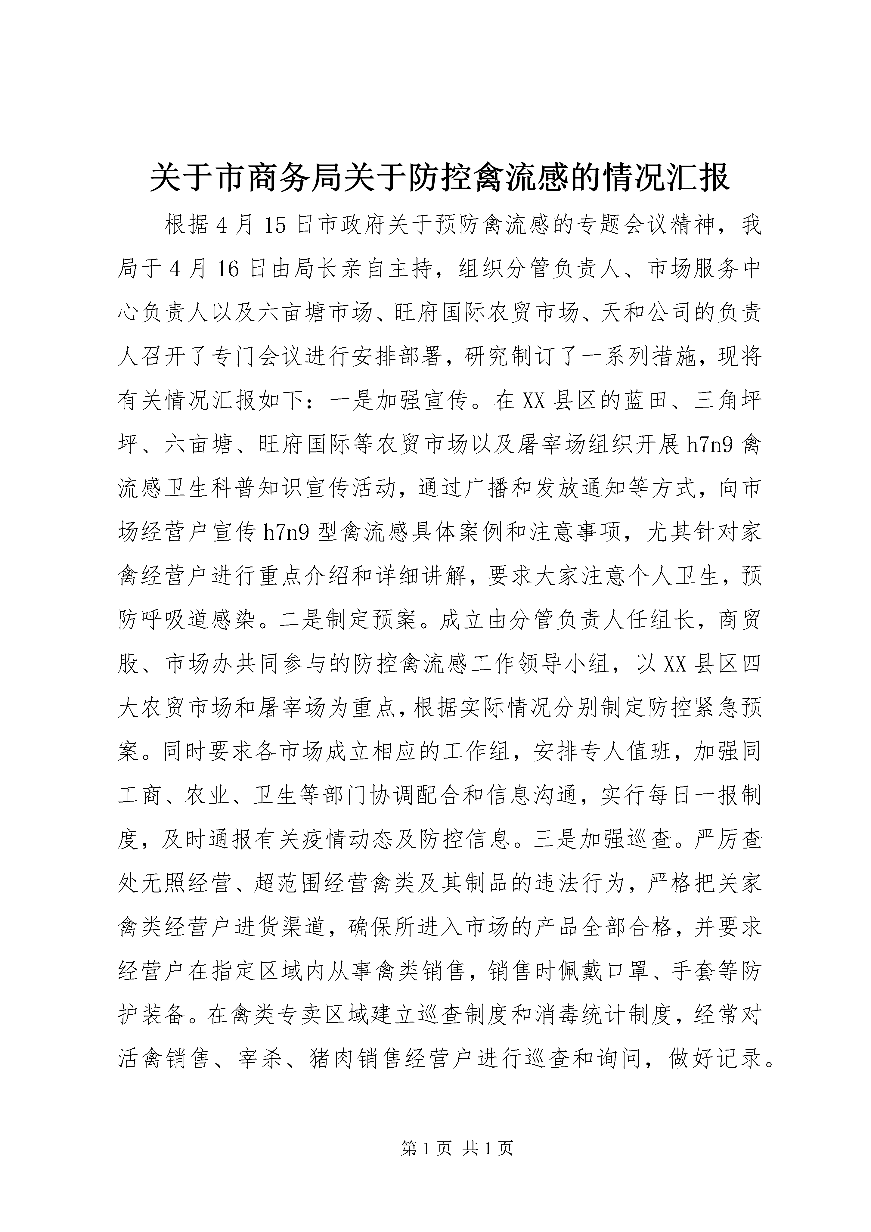 关于市商务局关于防控禽流感的情况汇报根据4月15日市政府关于预防禽流感的专题会议精神,我局于4月16日由局长亲自主持,组织分管负责人、市场服务中心负责人以及六亩塘市场、旺府国际农贸市场、天和公司的负责人召开了专门会议进行安排部署,研究制订了一系列措施,现将有关情况汇报如下:一是加强宣传。在XX县区的蓝田、三角坪坪、六亩塘、旺府国际等农贸市场以及屠宰场组织开展h7n9禽流感卫生科普知识宣传活动,通过广播和发放通知等方式,向市场经营户宣传h7n9型禽流感具体案例和注意事项,尤其针对家禽经营户进行重点介绍和详细讲解,要求大家注意个人卫生,预防呼吸道感染。二是制定预案。成立由分管负责人任组长,商贸股、市场办共同参与的防控禽流感工作领导小组,以XX县区四大农贸市场和屠宰场为重点,根据实际情况分别制定防控紧急预案。同时要求各市场成立相应的工作组,安排专人值班,加强同工商、农业、卫生等部门协调配合和信息沟通,实行每日一报制度,及时通报有关疫情动态及防控信息。三是加强巡查。严厉查处无照经营、超范围经营禽类及其制品的违法行为,严格把关家禽类经营户进货渠道,确保所进入市场的产品全部合格,并要求经营户在指定区域内从事禽类销售,销售时佩戴口罩、手套等防护装备。在禽类专卖区域建立巡查制度和消毒统计制度,经常对活禽销售、宰杀、猪肉销售经营户进行巡查和询问,做好记录。四是全面消毒。配置必要的药物喷洒器材和消毒专用药水,坚持每天在开市前和罢市后对整个市场进行全面消毒处理,对重点区域特别是禽鸟类销售场所进行强化消毒,同时增加保洁人员和费用,对禽鸟污染物进行消毒处理并及时清运。