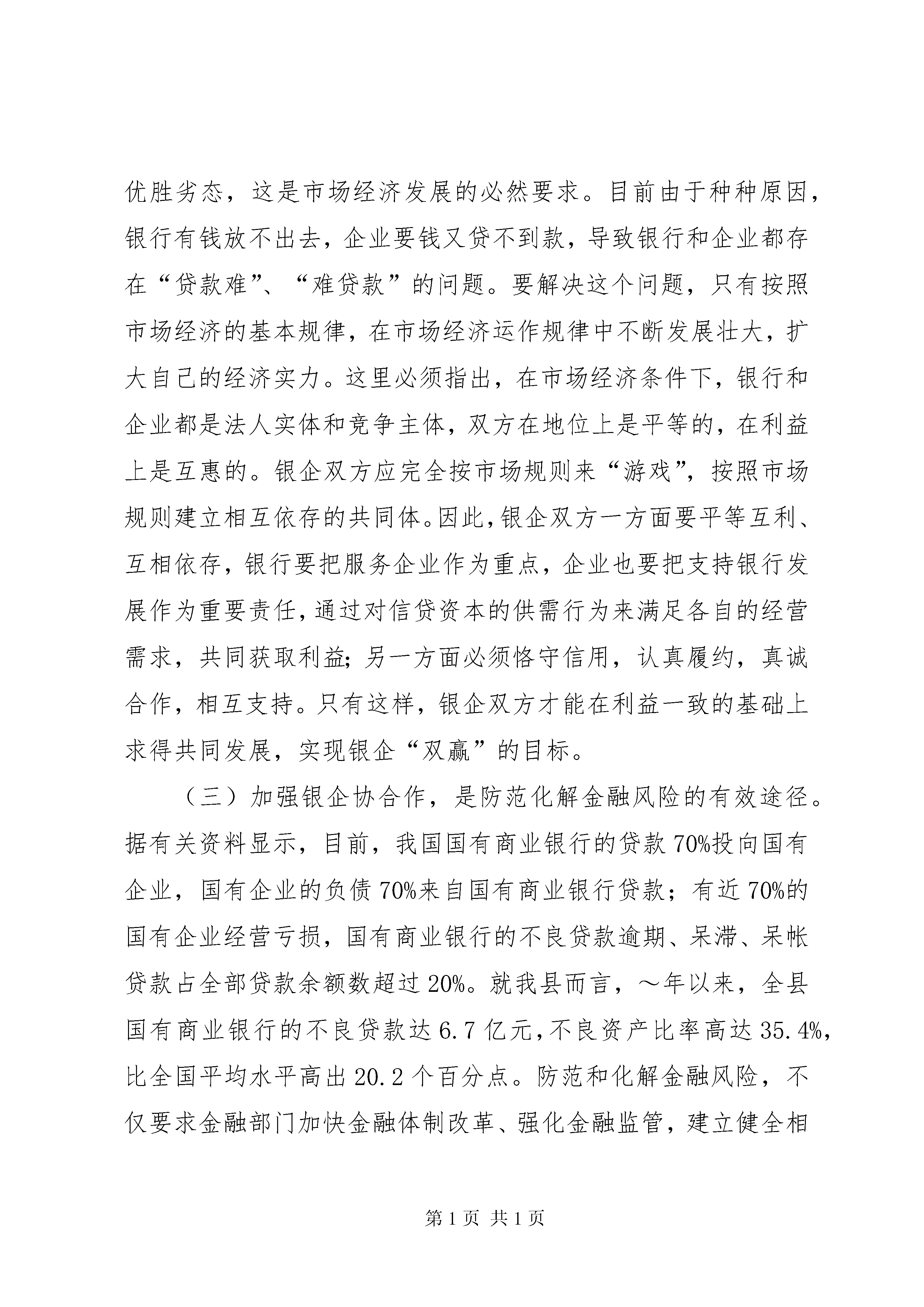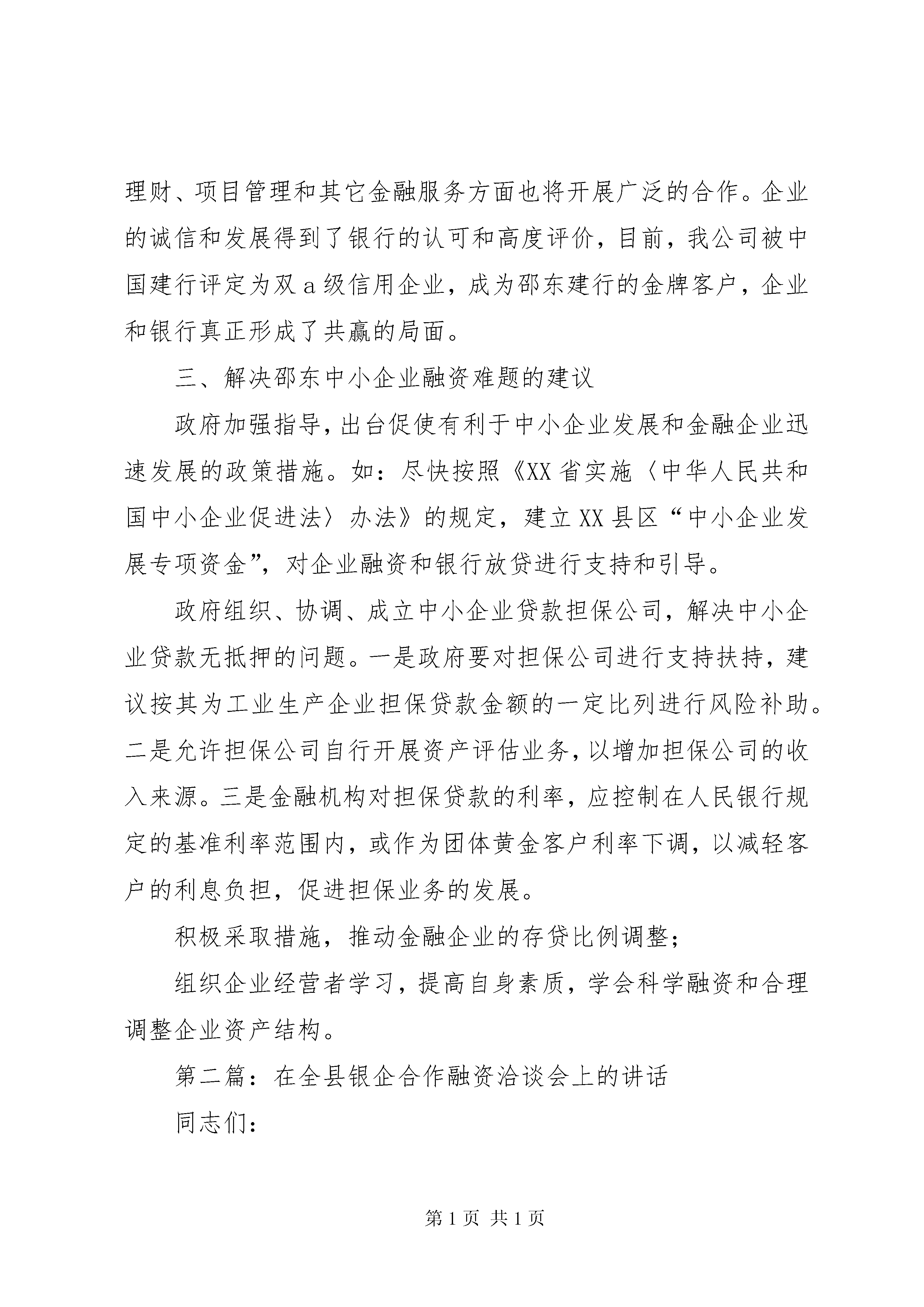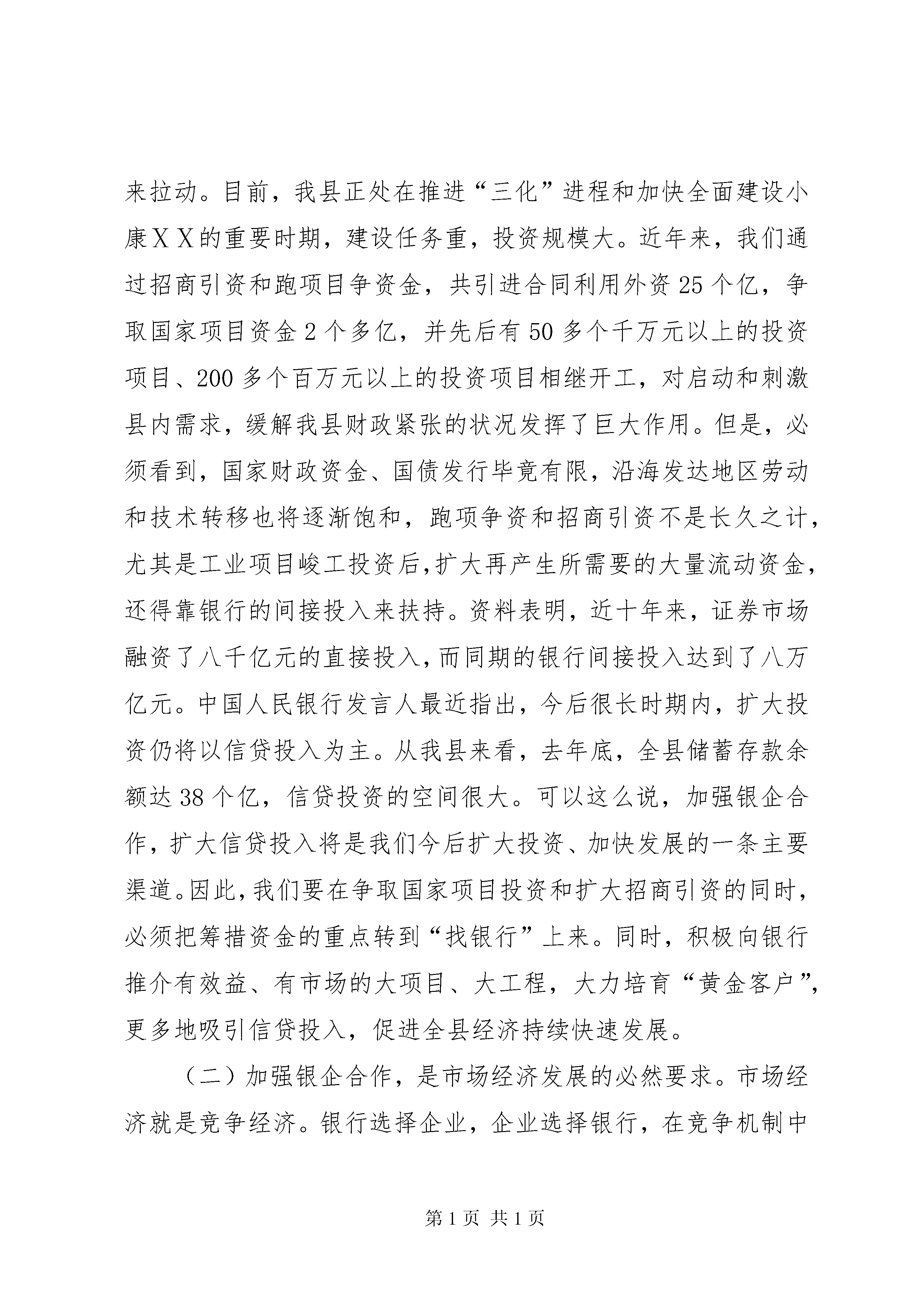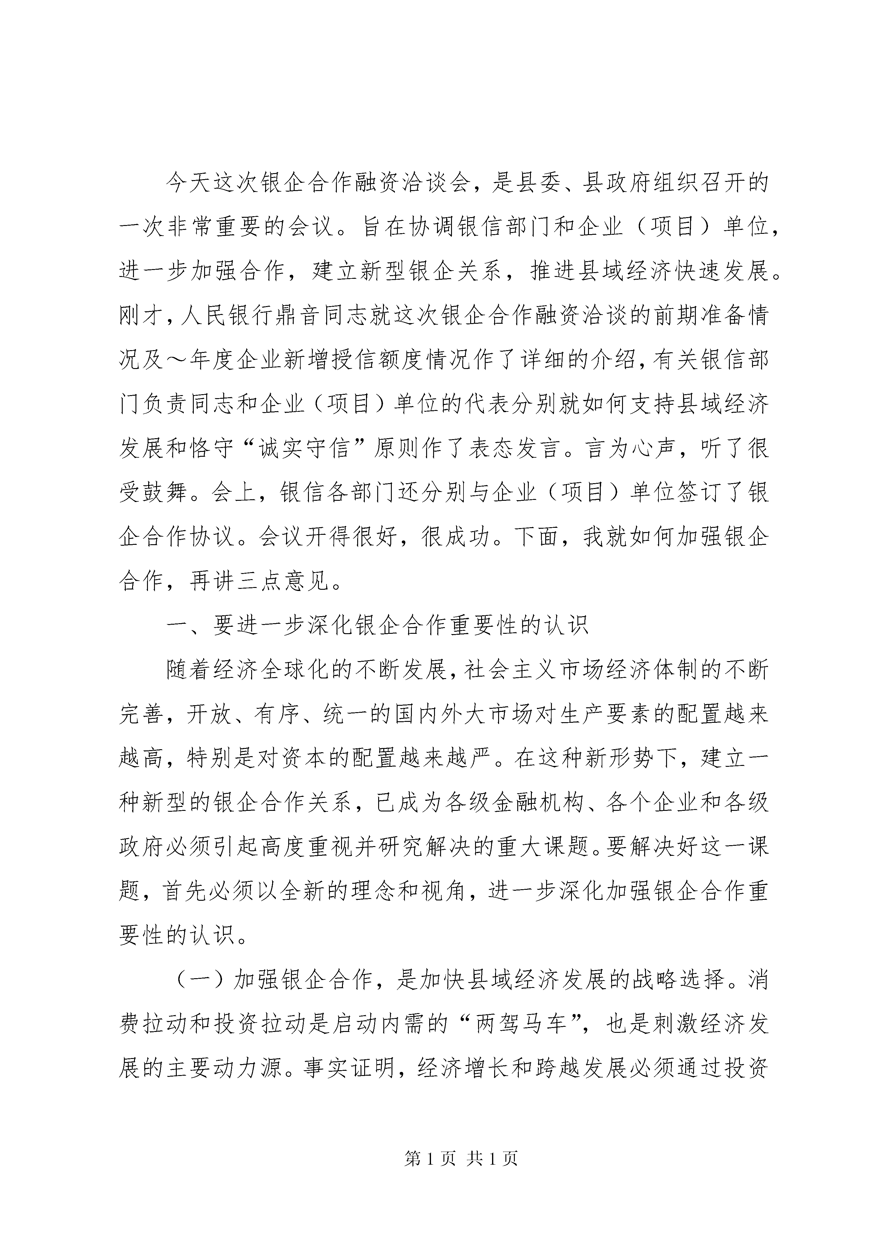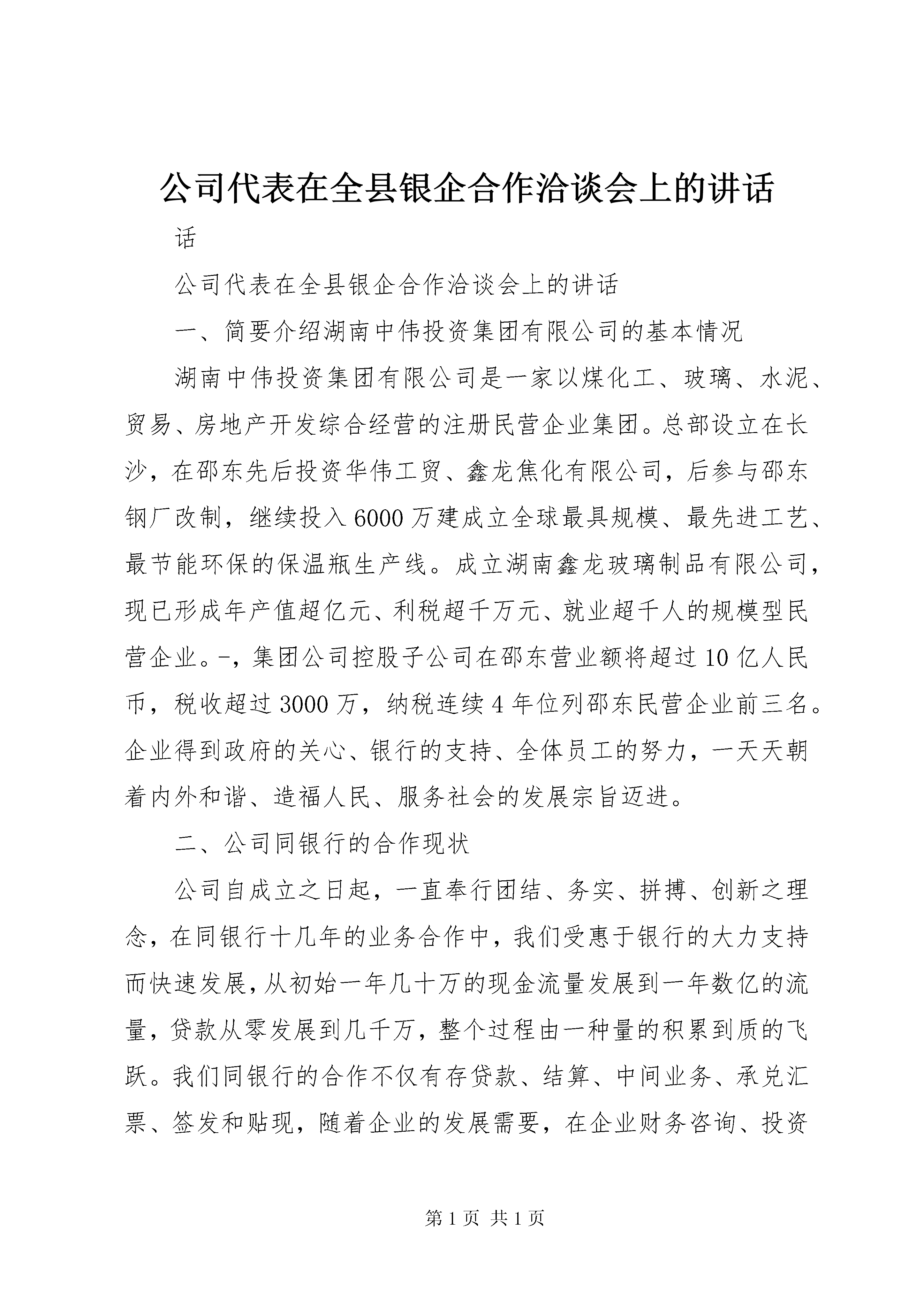公司代表在全县银企合作洽谈会上的讲话话公司代表在全县银企合作洽谈会上的讲话一、简要介绍湖南中伟投资集团有限公司的基本情况湖南中伟投资集团有限公司是一家以煤化工、玻璃、水泥、贸易、房地产开发综合经营的注册民营企业集团。总部设立在长沙,在邵东先后投资华伟工贸、鑫龙焦化有限公司,后参与邵东钢厂改制,继续投入6000万建成立全球最具规模、最先进工艺、最节能环保的保温瓶生产线。成立湖南鑫龙玻璃制品有限公司,现已形成年产值超亿元、利税超千万元、就业超千人的规模型民营企业。-,集团公司控股子公司在邵东营业额将超过10亿人民币,税收超过3000万,纳税连续4年位列邵东民营企业前三名。企业得到政府的关心、银行的支持、全体员工的努力,一天天朝着内外和谐、造福人民、服务社会的发展宗旨迈进。二、公司同银行的合作现状公司自成立之日起,一直奉行团结、务实、拼搏、创新之理念,在同银行十几年的业务合作中,我们受惠于银行的大力支持而快速发展,从初始一年几十万的现金流量发展到一年数亿的流量,贷款从零发展到几千万,整个过程由一种量的积累到质的飞跃。我们同银行的合作不仅有存贷款、结算、中间业务、承兑汇票、签发和贴现,随着企业的发展需要,在企业财务咨询、投资理财、项目管理和其它金融服务方面也将开展广泛的合作。企业的诚信和发展得到了银行的认可和高度评价,目前,我公司被中国建行评定为双a级信用企业,成为邵东建行的金牌客户,企业和银行真正形成了共赢的局面。三、解决邵东中小企业融资难题的建议政府加强指导,出台促使有利于中小企业发展和金融企业迅速发展的政策措施。如:尽快按照《XX省实施〈中华人民共和国中小企业促进法〉办法》的规定,建立XX县区“中小企业发展专项资金”,对企业融资和银行放贷进行支持和引导。政府组织、协调、成立中小企业贷款担保公司,解决中小企业贷款无抵押的问题。一是政府要对担保公司进行支持扶持,建议按其为工业生产企业担保贷款金额的一定比列进行风险补助。二是允许担保公司自行开展资产评估业务,以增加担保公司的收入来源。三是金融机构对担保贷款的利率,应控制在人民银行规定的基准利率范围内,或作为团体黄金客户利率下调,以减轻客户的利息负担,促进担保业务的发展。积极采取措施,推动金融企业的存贷比例调整;组织企业经营者学习,提高自身素质,学会科学融资和合理调整企业资产结构。第二篇:在全县银企合作融资洽谈会上的讲话同志们:今天这次银企合作融资洽谈会,是县委、县政府组织召开的一次非常重要的会议。旨在协调银信部门和企业(项目)单位,进一步加强合作,建立新型银企关系,推进县域经济快速发展。刚才,人民银行鼎音同志就这次银企合作融资洽谈的前期准备情况及~年度企业新增授信额度情况作了详细的介绍,有关银信部门负责同志和企业(项目)单位的代表分别就如何支持县域经济发展和恪守“诚实守信”原则作了表态发言。言为心声,听了很受鼓舞。会上,银信各部门还分别与企业(项目)单位签订了银企合作协议。会议开得很好,很成功。下面,我就如何加强银企合作,再讲三点意见。一、要进一步深化银企合作重要性的认识随着经济全球化的不断发展,社会主义市场经济体制的不断完善,开放、有序、统一的国内外大市场对生产要素的配置越来越高,特别是对资本的配置越来越严。在这种新形势下,建立一种新型的银企合作关系,已成为各级金融机构、各个企业和各级政府必须引起高度重视并研究解决的重大课题。要解决好这一课题,首先必须以全新的理念和视角,进一步深化加强银企合作重要性的认识。(一)加强银企合作,是加快县域经济发展的战略选择。消费拉动和投资拉动是启动内需的“两驾马车”,也是刺激经济发展的主要动力源。事实证明,经济增长和跨越发展必须通过投资来拉动。目前,我县正处在推进“三化”进程和加快全面建设小康ⅩⅩ的重要时期,建设任务重,投资规模大。近年来,我们通过招商引资和跑项目争资金,共引进合同利用外资25个亿,争取国家项目资金2个多亿,并先后有50多个千万元以上的投资项目、200多个百万元以上的投资项目相继开工,对启动和刺激县内需求,缓解我县财政紧张的状况发挥了巨大作用。但是,必须看到,国家财政资金、国债发行毕竟有限,沿海发达地区劳动和技术转移也将逐渐饱和,跑项争资和招商引资不是长久之计,尤其是工业项目峻工投资后,扩大再产生所需要的大量流动资金,还得靠银行的间接投入来扶持。资料表明,近十年来,证券市场融资了八千亿元的直接投入,而同期的银行间接投入达到了八万亿元。中国人民银行发言人最近指出,今后很长时期内,扩大投资仍将以信贷投入为主。从我县来看,去年底,全县储蓄存款余额达38个亿,信贷投资的空间很大。可以这么说,加强银企合作,扩大信贷投入将是我们今后扩大投资、加快发展的一条主要渠道。因此,我们要在争取国家项目投资和扩大招商引资的同时,必须把