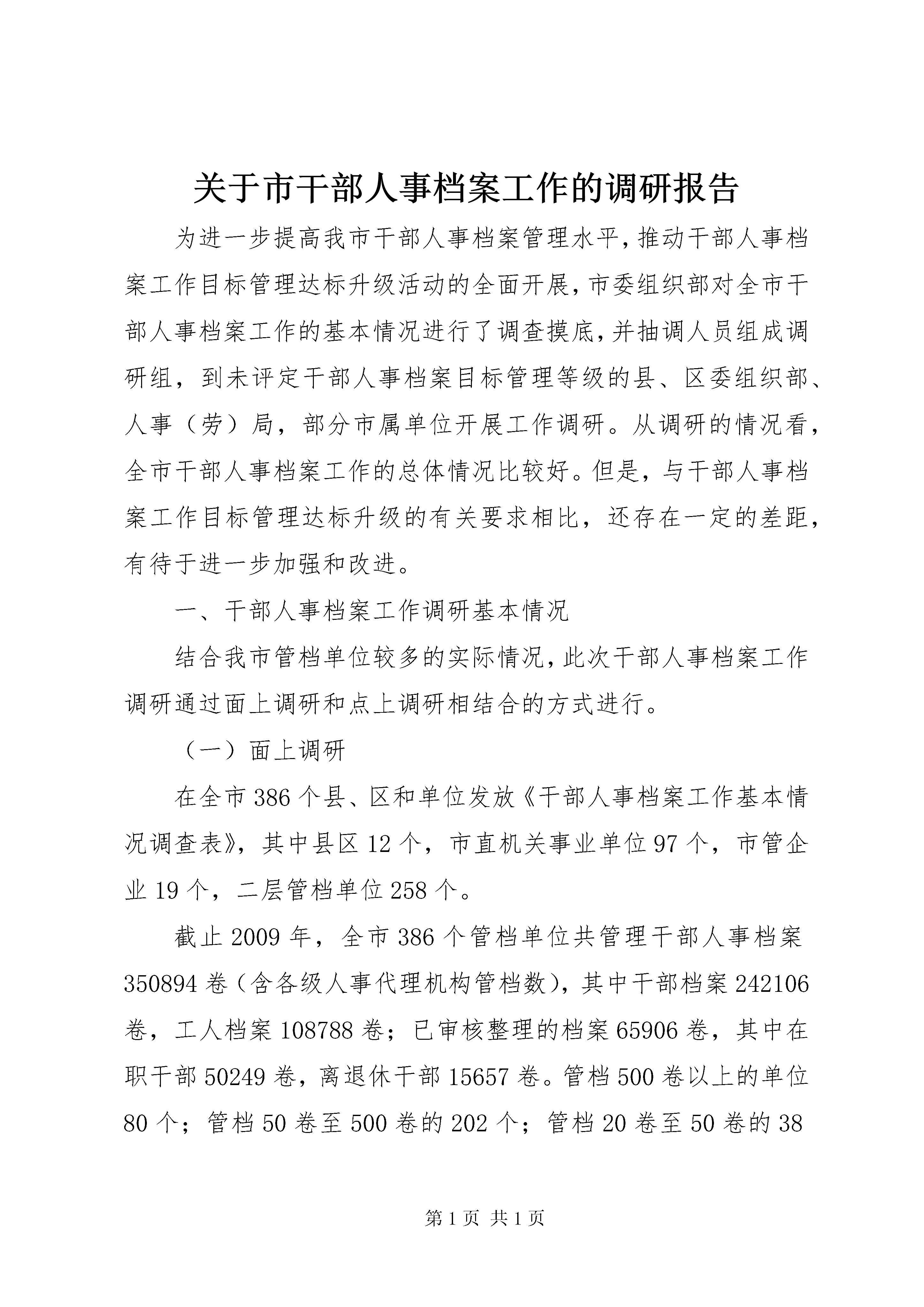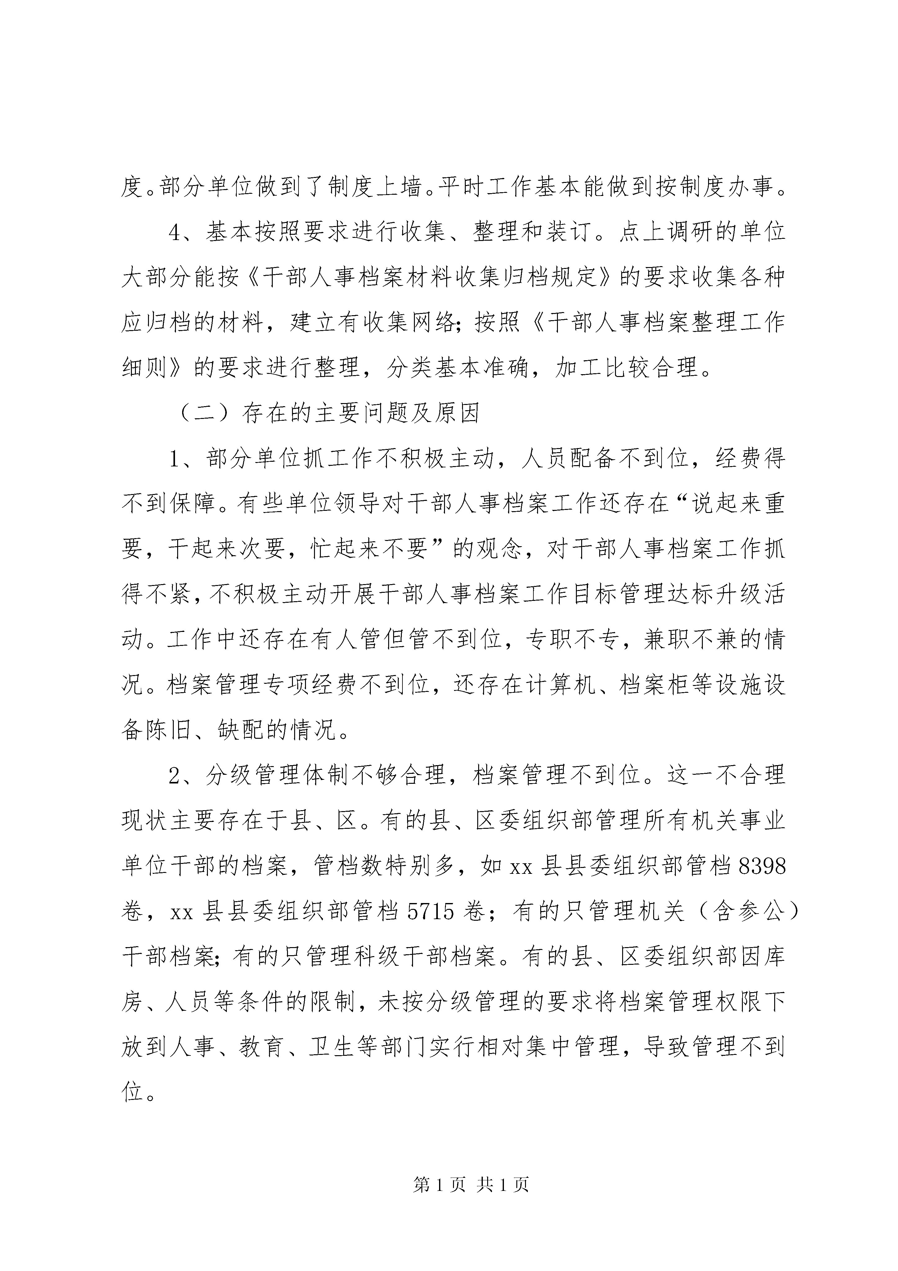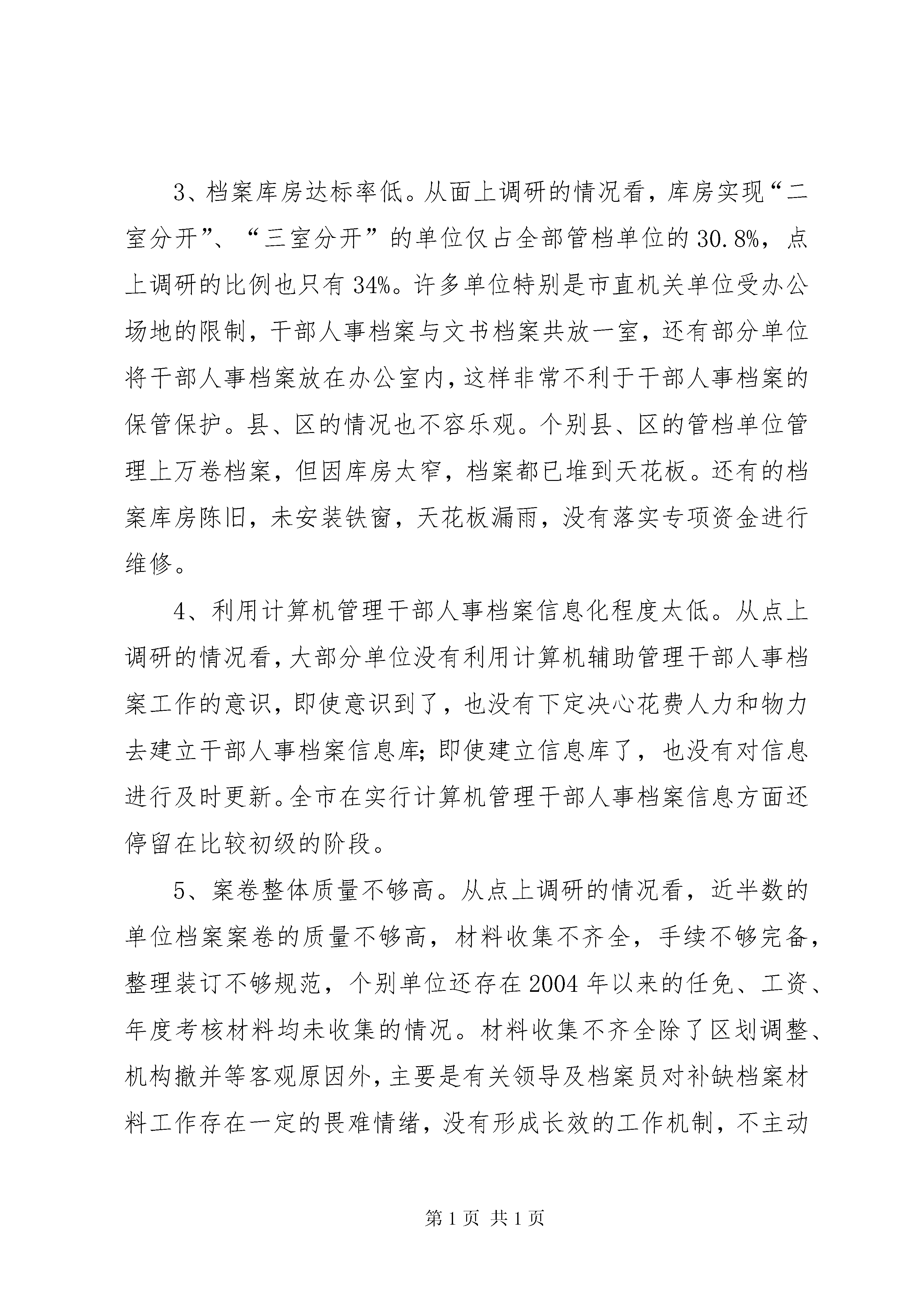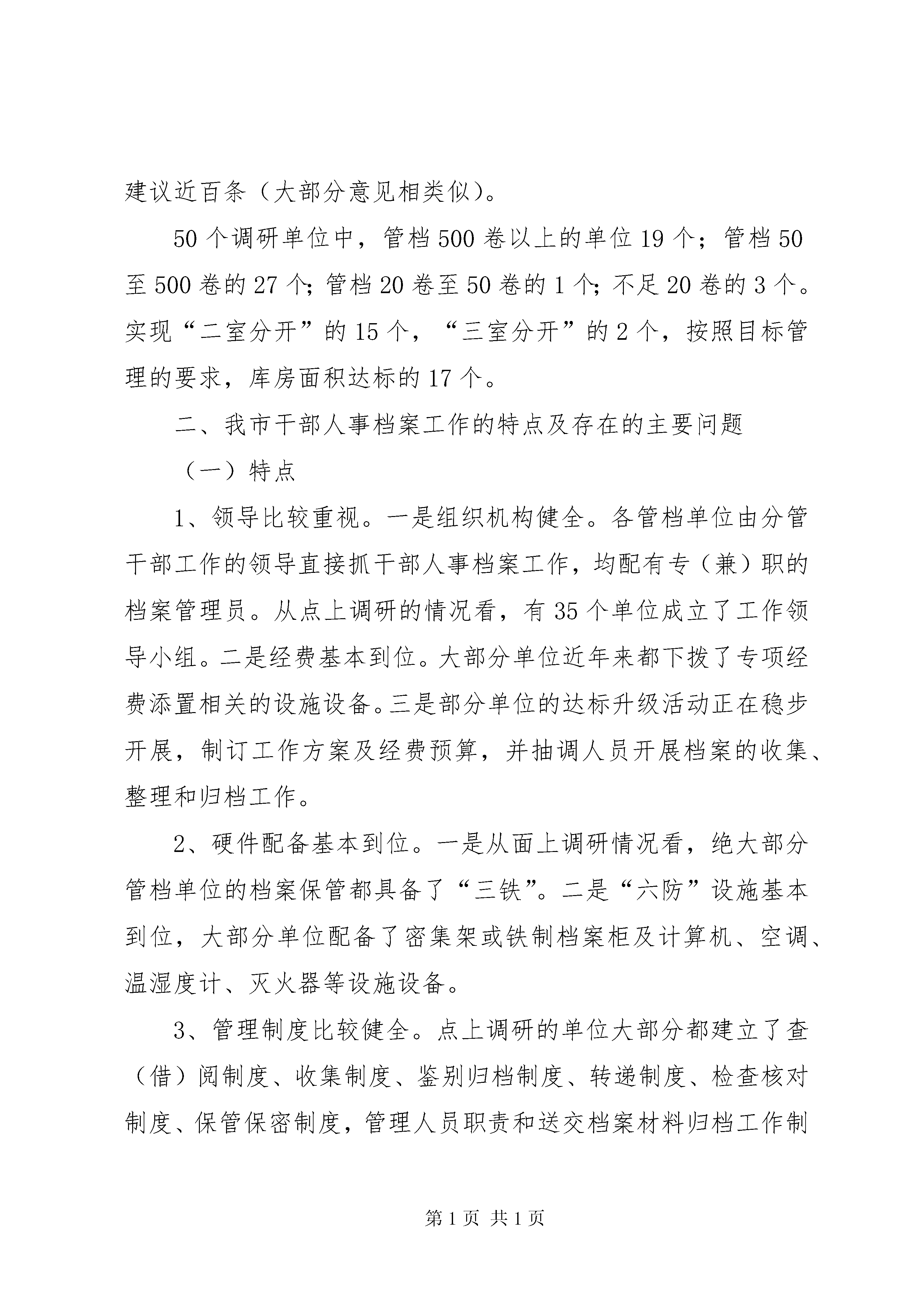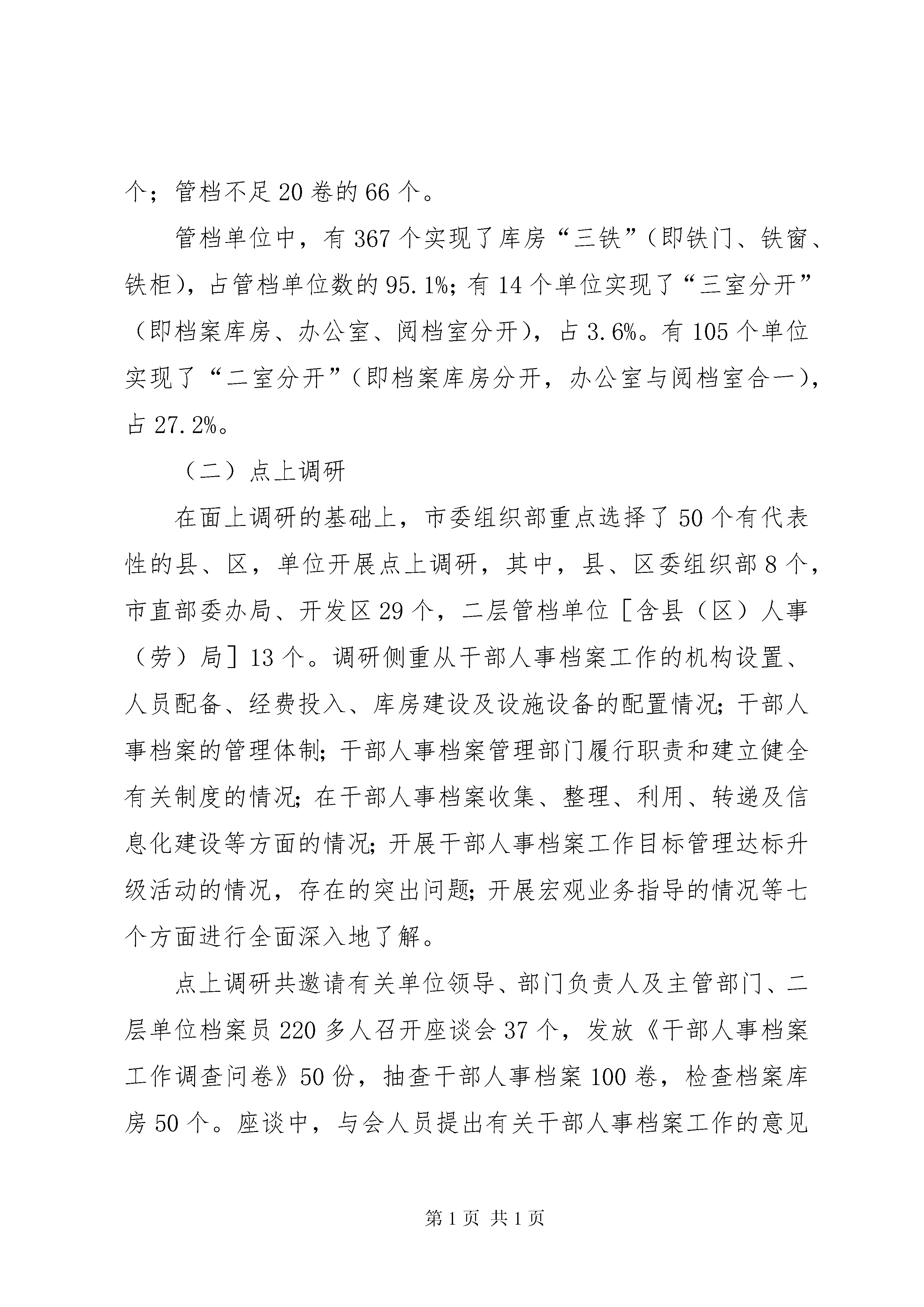 关于市干部人事档案工作的调研报告为进一步提高我市干部人事档案管理水平,推动干部人事档案工作目标管理达标升级活动的全面开展,市委组织部对全市干部人事档案工作的基本情况进行了调查摸底,并抽调人员组成调研组,到未评定干部人事档案目标管理等级的县、区委组织部、人事(劳)局,部分市属单位开展工作调研。从调研的情况看,全市干部人事档案工作的总体情况比较好。但是,与干部人事档案工作目标管理达标升级的有关要求相比,还存在一定的差距,有待于进一步加强和改进。一、干部人事档案工作调研基本情况结合我市管档单位较多的实际情况,此次干部人事档案工作调研通过面上调研和点上调研相结合的方式进行。(一)面上调研在全市386个县、区和单位发放《干部人事档案工作基本情况调查表》,其中县区12个,市直机关事业单位97个,市管企业19个,二层管档单位258个。截止2009年,全市386个管档单位共管理干部人事档案350894卷(含各级人事代理机构管档数),其中干部档案242106卷,工人档案108788卷;已审核整理的档案65906卷,其中在职干部50249卷,离退休干部15657卷。管档500卷以上的单位80个;管档50卷至500卷的202个;管档20卷至50卷的38个;管档不足20卷的66个。管档单位中,有367个实现了库房“三铁”(即铁门、铁窗、铁柜),占管档单位数的95.1%;有14个单位实现了“三室分开”(即档案库房、办公室、阅档室分开),占3.6%。有105个单位实现了“二室分开”(即档案库房分开,办公室与阅档室合一),占27.2%。(二)点上调研在面上调研的基础上,市委组织部重点选择了50个有代表性的县、区,单位开展点上调研,其中,县、区委组织部8个,市直部委办局、开发区29个,二层管档单位[含县(区)人事(劳)局]13个。调研侧重从干部人事档案工作的机构设置、人员配备、经费投入、库房建设及设施设备的配置情况;干部人事档案的管理体制;干部人事档案管理部门履行职责和建立健全有关制度的情况;在干部人事档案收集、整理、利用、转递及信息化建设等方面的情况;开展干部人事档案工作目标管理达标升级活动的情况,存在的突出问题;开展宏观业务指导的情况等七个方面进行全面深入地了解。点上调研共邀请有关单位领导、部门负责人及主管部门、二层单位档案员220多人召开座谈会37个,发放《干部人事档案工作调查问卷》50份,抽查干部人事档案100卷,检查档案库房50个。座谈中,与会人员提出有关干部人事档案工作的意见建议近百条(大部分意见相类似)。50个调研单位中,管档500卷以上的单位19个;管档50至500卷的27个;管档20卷至50卷的1个;不足20卷的3个。实现“二室分开”的15个,“三室分开”的2个,按照目标管理的要求,库房面积达标的17个。二、我市干部人事档案工作的特点及存在的主要问题(一)特点1、领导比较重视。一是组织机构健全。各管档单位由分管干部工作的领导直接抓干部人事档案工作,均配有专(兼)职的档案管理员。从点上调研的情况看,有35个单位成立了工作领导小组。二是经费基本到位。大部分单位近年来都下拨了专项经费添置相关的设施设备。三是部分单位的达标升级活动正在稳步开展,制订工作方案及经费预算,并抽调人员开展档案的收集、整理和归档工作。2、硬件配备基本到位。一是从面上调研情况看,绝大部分管档单位的档案保管都具备了“三铁”。二是“六防”设施基本到位,大部分单位配备了密集架或铁制档案柜及计算机、空调、温湿度计、灭火器等设施设备。3、管理制度比较健全。点上调研的单位大部分都建立了查(借)阅制度、收集制度、鉴别归档制度、转递制度、检查核对制度、保管保密制度,管理人员职责和送交档案材料归档工作制度。部分单位做到了制度上墙。平时工作基本能做到按制度办事。4、基本按照要求进行收集、整理和装订。点上调研的单位大部分能按《干部人事档案材料收集归档规定》的要求收集各种应归档的材料,建立有收集网络;按照《干部人事档案整理工作细则》的要求进行整理,分类基本准确,加工比较合理。(二)存在的主要问题及原因1、部分单位抓工作不积极主动,人员配备不到位,经费得不到保障。有些单位领导对干部人事档案工作还存在“说起来重要,干起来次要,忙起来不要”的观念,对干部人事档案工作抓得不紧,不积极主动开展干部人事档案工作目标管理达标升级活动。工作中还存在有人管但管不到位,专职不专,兼职不兼的情况。档案管理专项经费不到位,还存在计算机、档案柜等设施设备陈旧、缺配的情况。2、分级管理体制不够合理,档案管理不到位。这一不合理现状主要存在于县、区。有的县、区委组织部管理所有机关事业单位干部的档案,管档数特别多,如xx县县委组织部管档8398卷,xx县县委组织部管档5715卷;有的只管理机关(含参公)干部