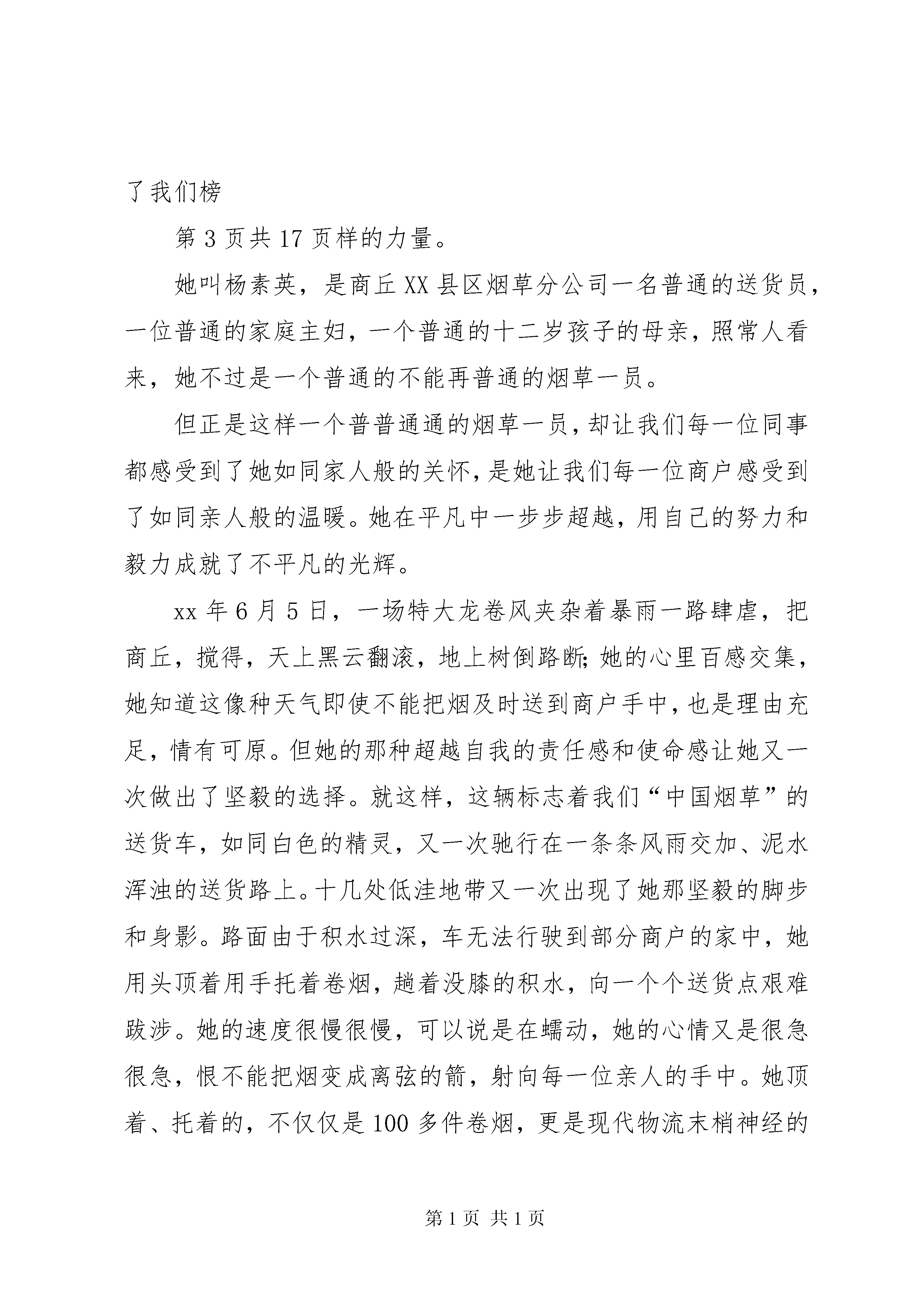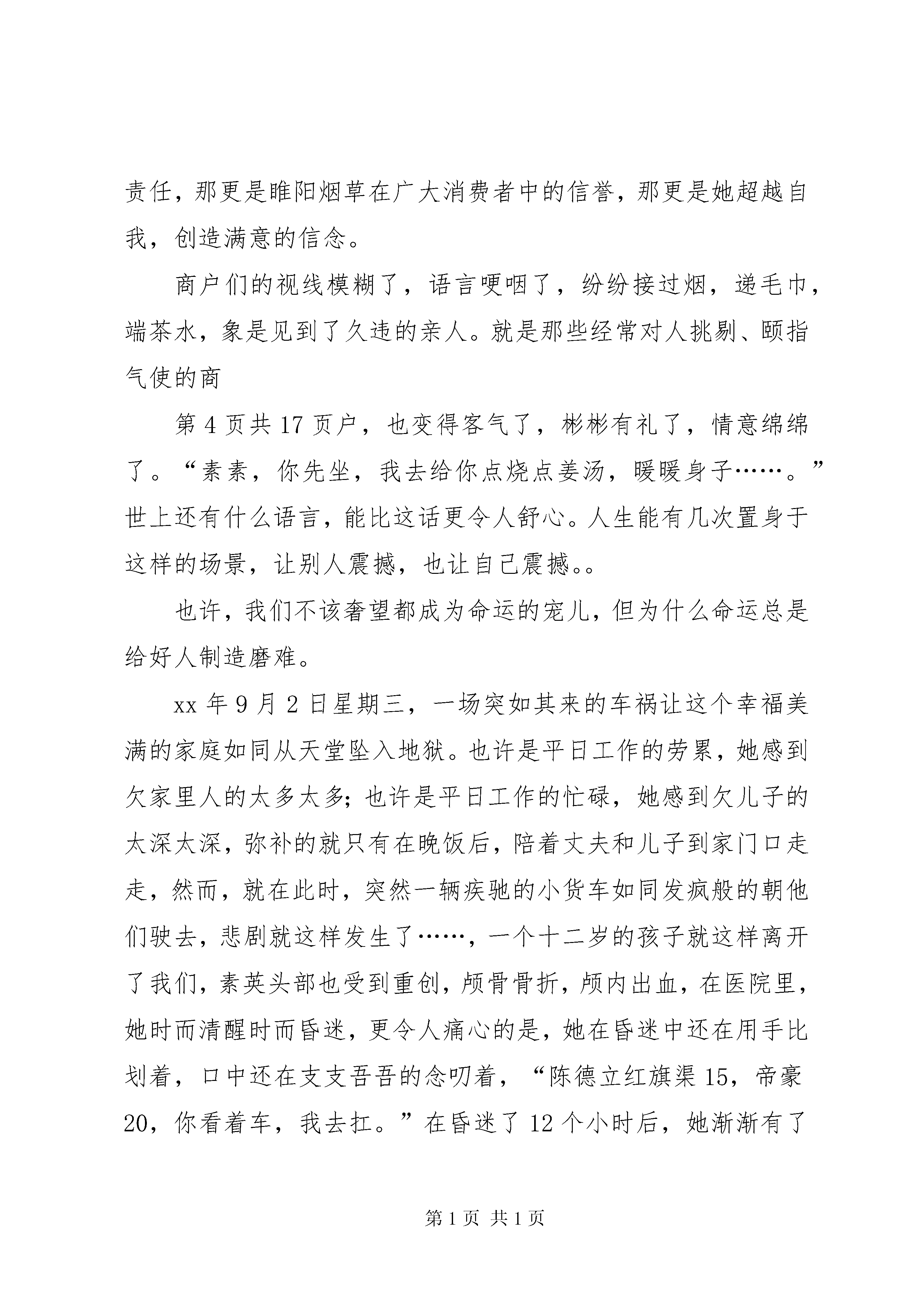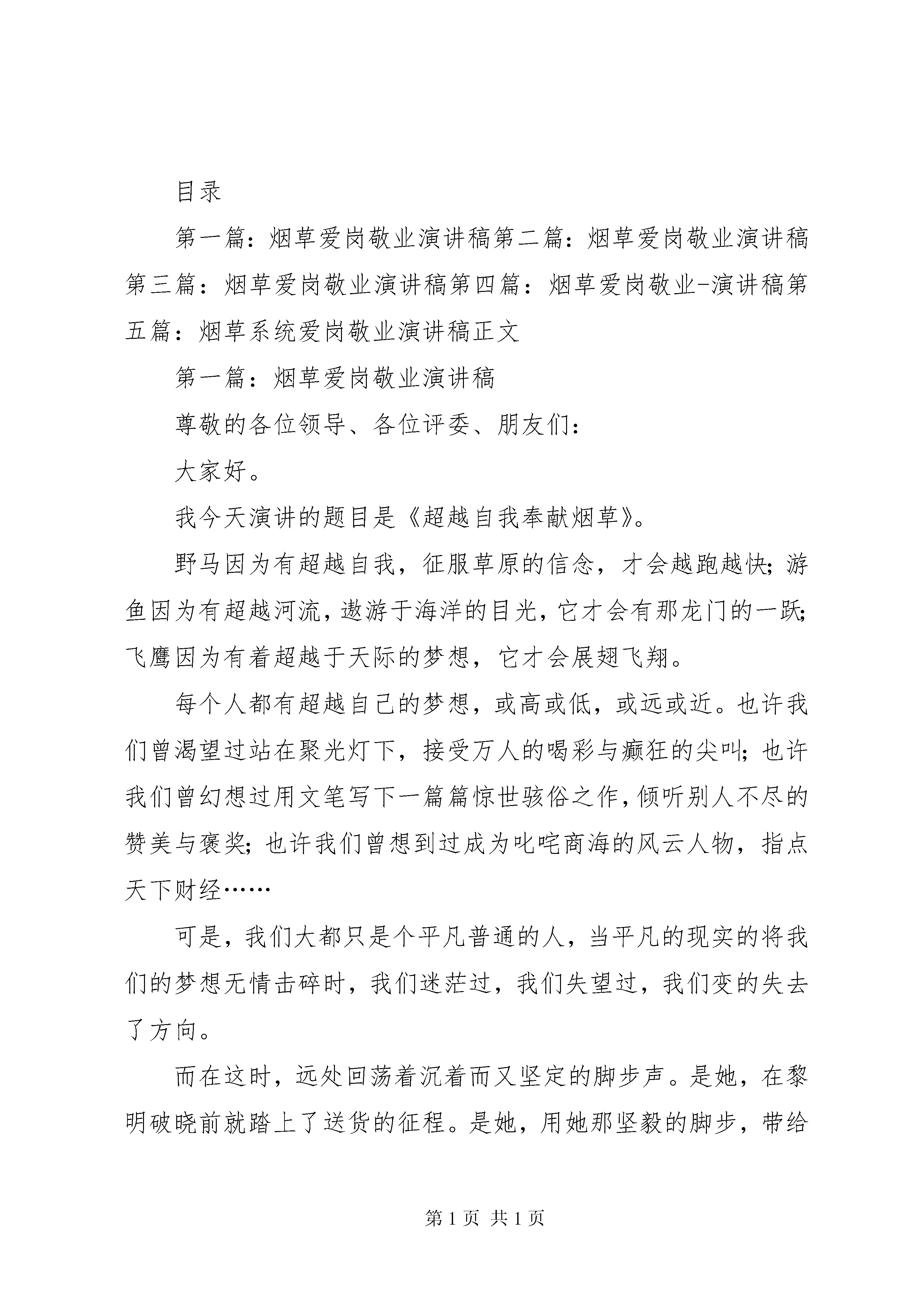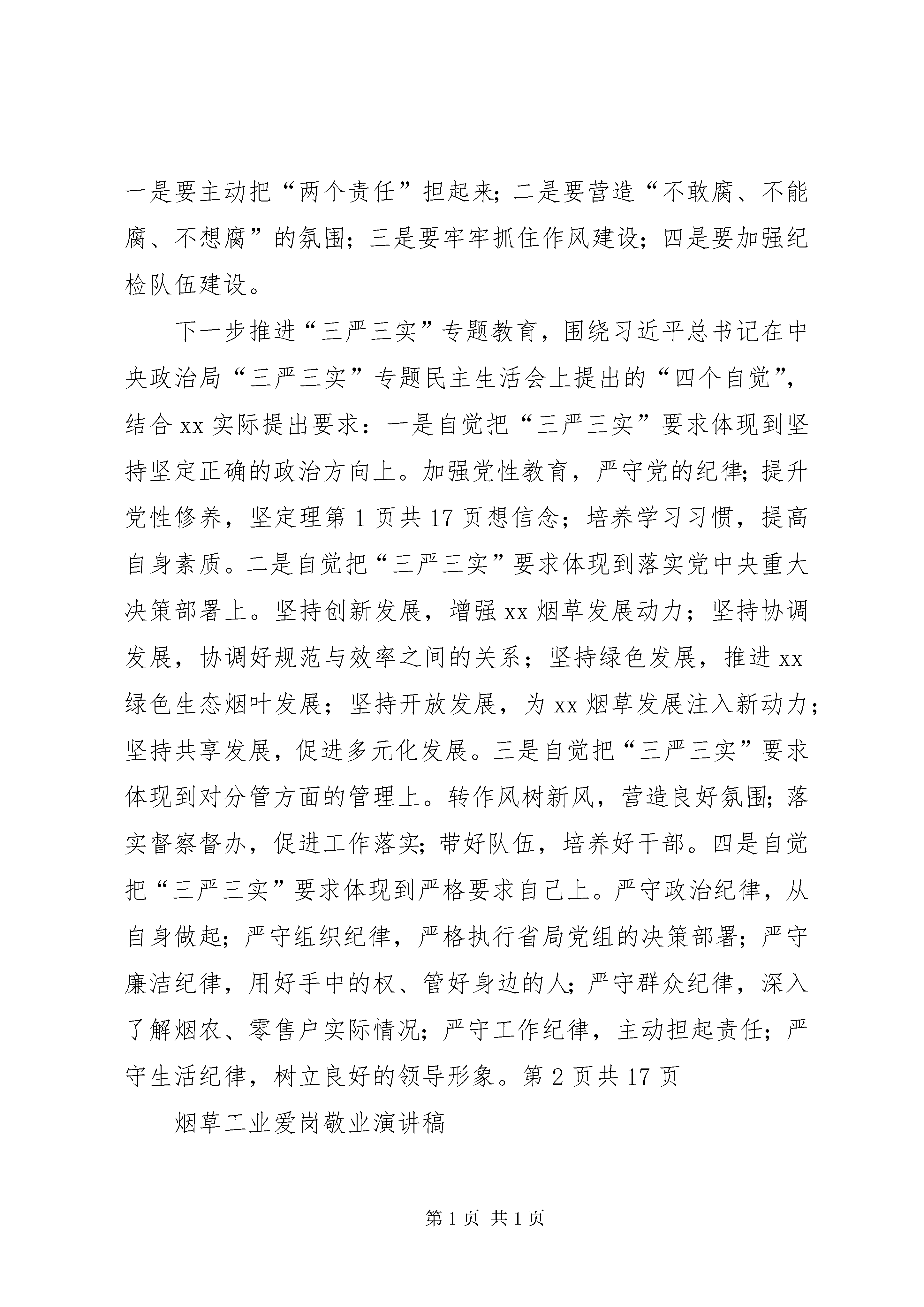 公司党委书记“三严三实”专题民主生活会讲话稿烟草局党委三严三实专题民主生活会讲话稿市局党委书记代表市局党委领导班子进行对照检查,认真查摆问题,分析问题产生的根源,明确今后努力方向和具体整改措施。在批评与自我批评过程中,市局党委书记率先垂范,带头查摆自身存在的问题,既做到实事求是,又敢于揭短亮丑;市局党委委员逐一进行对照检查,深刻剖析自身存在的问题,认真严肃地开展批评与自我批评。大家坦诚相待,直截了当,把自己摆进去,往实处查、往真处讲,从领导班子对照检查材料中逐一认领存在问题,深刻剖析产生问题的原因,既查找了工作中的问题,又折射了修身做人的问题,同时透视了政治纪律方面的问题,并通过互评明确了改进措施。xx市局党委这次“三严三实”专题民主生活会开得非常成功,批评与自我批评很坦诚,对照“三严三实”标准,反思自己的思想,分析查找问题,确定整改措施,充分发扬了中国共产党批评与自我批评的优良作风。下面我从“两烟”生产经营、全面从严治党两个方面提出要求。抓“两烟”生产经营:一是要把“三严三实”转化为行动,扎扎实实抓落实;二是要落实五大发展理念,加快发展步伐;三是要合理确定目标,科学制定“十三五”发展规划。抓从严治党:一是要主动把“两个责任”担起来;二是要营造“不敢腐、不能腐、不想腐”的氛围;三是要牢牢抓住作风建设;四是要加强纪检队伍建设。下一步推进“三严三实”专题教育,围绕习近平总书记在中央政治局“三严三实”专题民主生活会上提出的“四个自觉”,结合xx实际提出要求:一是自觉把“三严三实”要求体现到坚持坚定正确的政治方向上。加强党性教育,严守党的纪律;提升党性修养,坚定理想信念;培养学习习惯,提高自身素质。二是自觉把“三严三实”要求体现到落实党中央重大决策部署上。坚持创新发展,增强xx烟草发展动力;坚持协调发展,协调好规范与效率之间的关系;坚持绿色发展,推进xx绿色生态烟叶发展;坚持开放发展,为xx烟草发展注入新动力;坚持共享发展,促进多元化发展。三是自觉把“三严三实”要求体现到对分管方面的管理上。转作风树新风,营造良好氛围;落实督察督办,促进工作落实;带好队伍,培养好干部。四是自觉把“三严三实”要求体现到严格要求自己上。严守政治纪律,从自身做起;严守组织纪律,严格执行省局党组的决策部署;严守廉洁纪律,用好手中的权、管好身边的人;严守群众纪律,深入了解烟农、零售户实际情况;严守工作纪律,主动担起责任;严守生活纪律,树立良好的领导形象。烟草工业爱岗敬业演讲稿目录第一篇:烟草爱岗敬业演讲稿第二篇:烟草爱岗敬业演讲稿第三篇:烟草爱岗敬业演讲稿第四篇:烟草爱岗敬业-演讲稿第五篇:烟草系统爱岗敬业演讲稿正文第一篇:烟草爱岗敬业演讲稿尊敬的各位领导、各位评委、朋友们:大家好。我今天演讲的题目是《超越自我奉献烟草》。野马因为有超越自我,征服草原的信念,才会越跑越快;游鱼因为有超越河流,遨游于海洋的目光,它才会有那龙门的一跃;飞鹰因为有着超越于天际的梦想,它才会展翅飞翔。每个人都有超越自己的梦想,或高或低,或远或近。也许我们曾渴望过站在聚光灯下,接受万人的喝彩与癫狂的尖叫;也许我们曾幻想过用文笔写下一篇篇惊世骇俗之作,倾听别人不尽的赞美与褒奖;也许我们曾想到过成为叱咤商海的风云人物,指点天下财经……可是,我们大都只是个平凡普通的人,当平凡的现实的将我们的梦想无情击碎时,我们迷茫过,我们失望过,我们变的失去了方向。而在这时,远处回荡着沉着而又坚定的脚步声。是她,在黎明破晓前就踏上了送货的征程。是她,用她那坚毅的脚步,带给了我们榜样的力量。她叫杨素英,是商丘XX县区烟草分公司一名普通的送货员,一位普通的家庭主妇,一个普通的十二岁孩子的母亲,照常人看来,她不过是一个普通的不能再普通的烟草一员。但正是这样一个普普通通的烟草一员,却让我们每一位同事都感受到了她如同家人般的关怀,是她让我们每一位商户感受到了如同亲人般的温暖。她在平凡中一步步超越,用自己的努力和毅力成就了不平凡的光辉。xx年6月5日,一场特大龙卷风夹杂着暴雨一路肆虐,把商丘,搅得,天上黑云翻滚,地上树倒路断;她的心里百感交集,她知道这像种天气即使不能把烟及时送到商户手中,也是理由充足,情有可原。但她的那种超越自我的责任感和使命感让她又一次做出了坚毅的选择。就这样,这辆标志着我们“中国烟草”的送货车,如同白色的精灵,又一次驰行在一条条风雨交加、泥水浑浊的送货路上。十几处低洼地带又一次出现了她那坚毅的脚步和身影。路面由于积水过深,车无法行驶到部分商户的家中,她用头顶着用手托着卷烟,趟着没膝的积水,向一个个送货点艰难跋涉。她的速度很慢很慢,可以说是在蠕动,她的心情又是很急很急,恨不能把烟变成离弦的箭,射向每一位亲人的手中。她顶着、托着的,不仅仅
