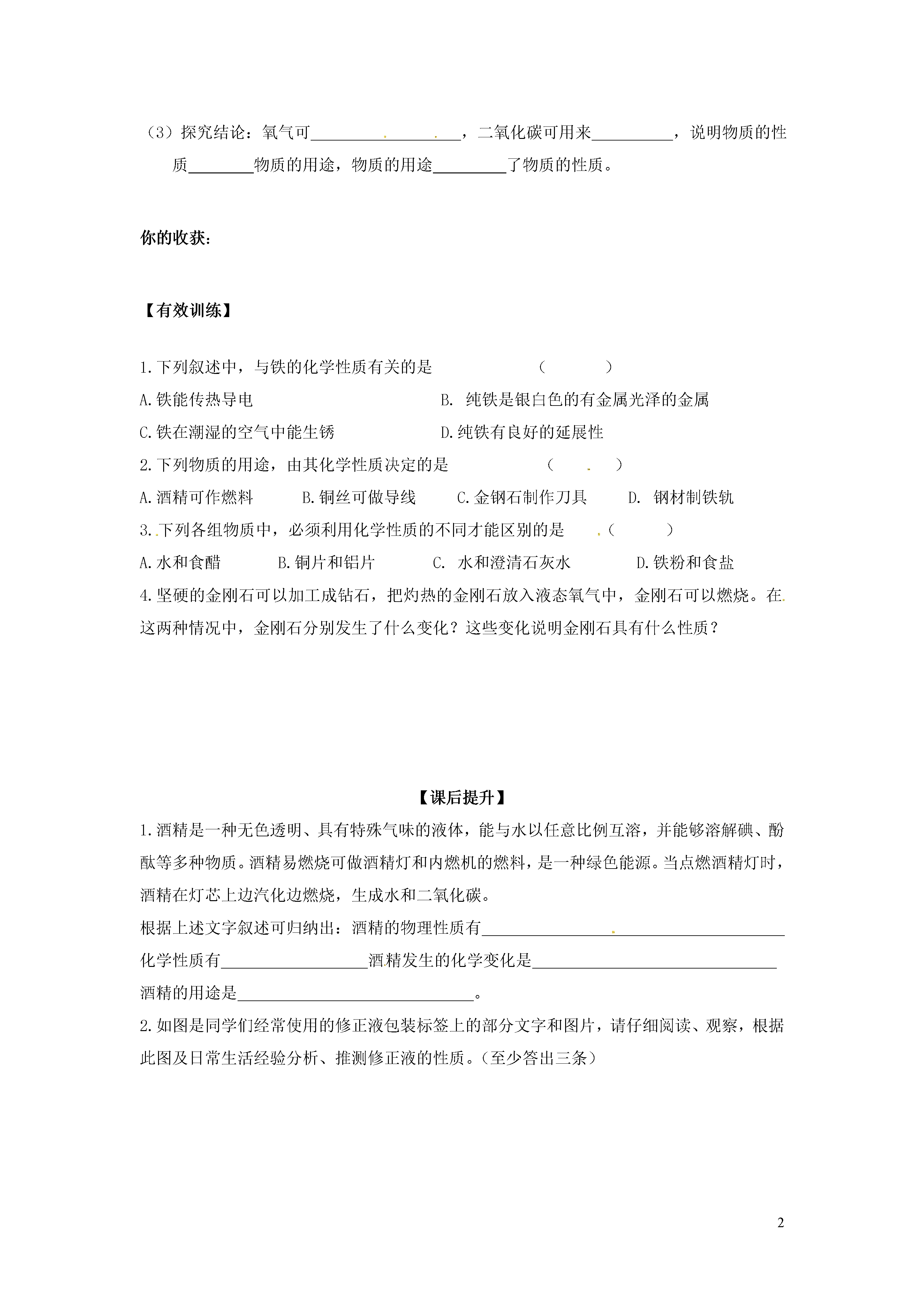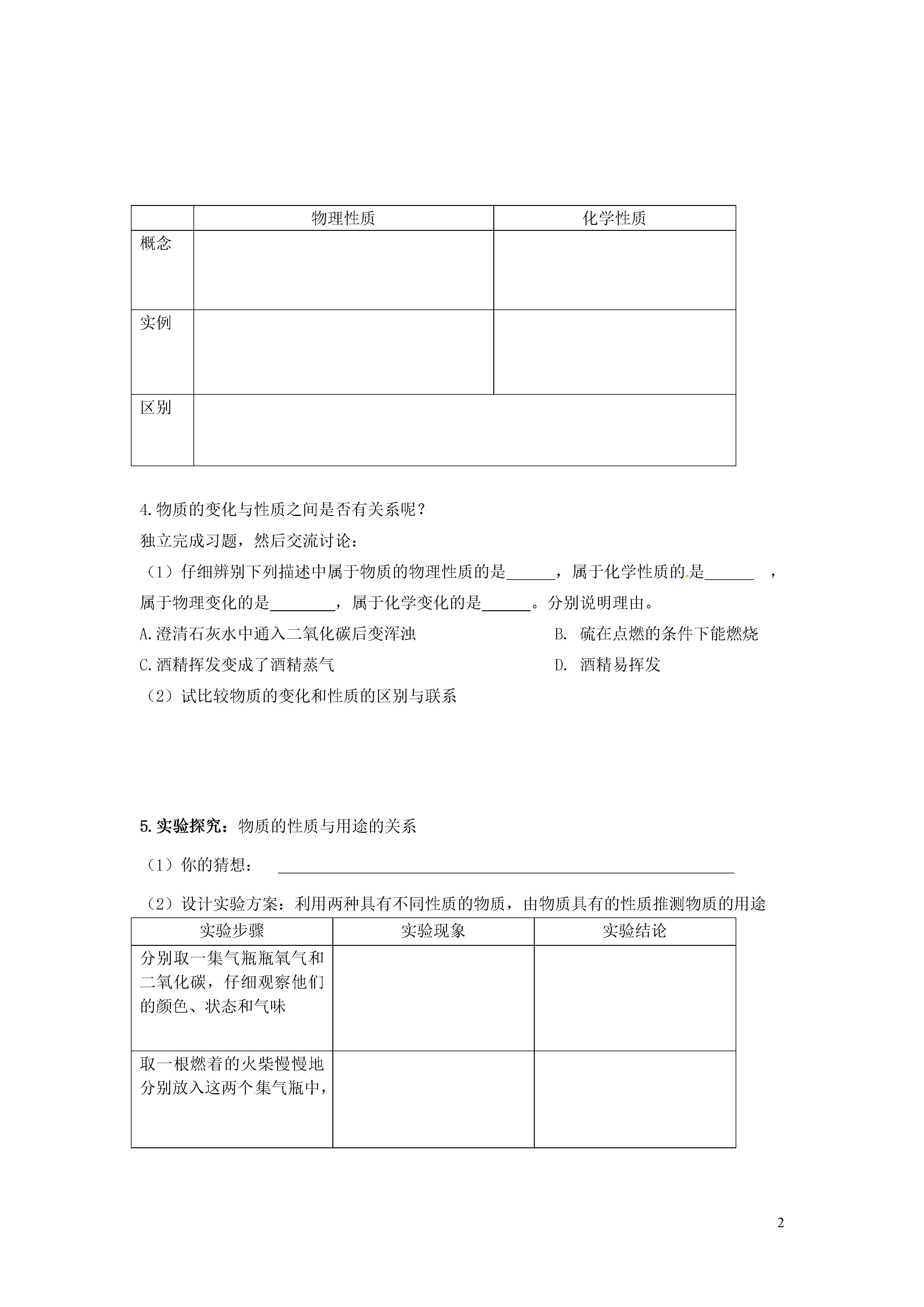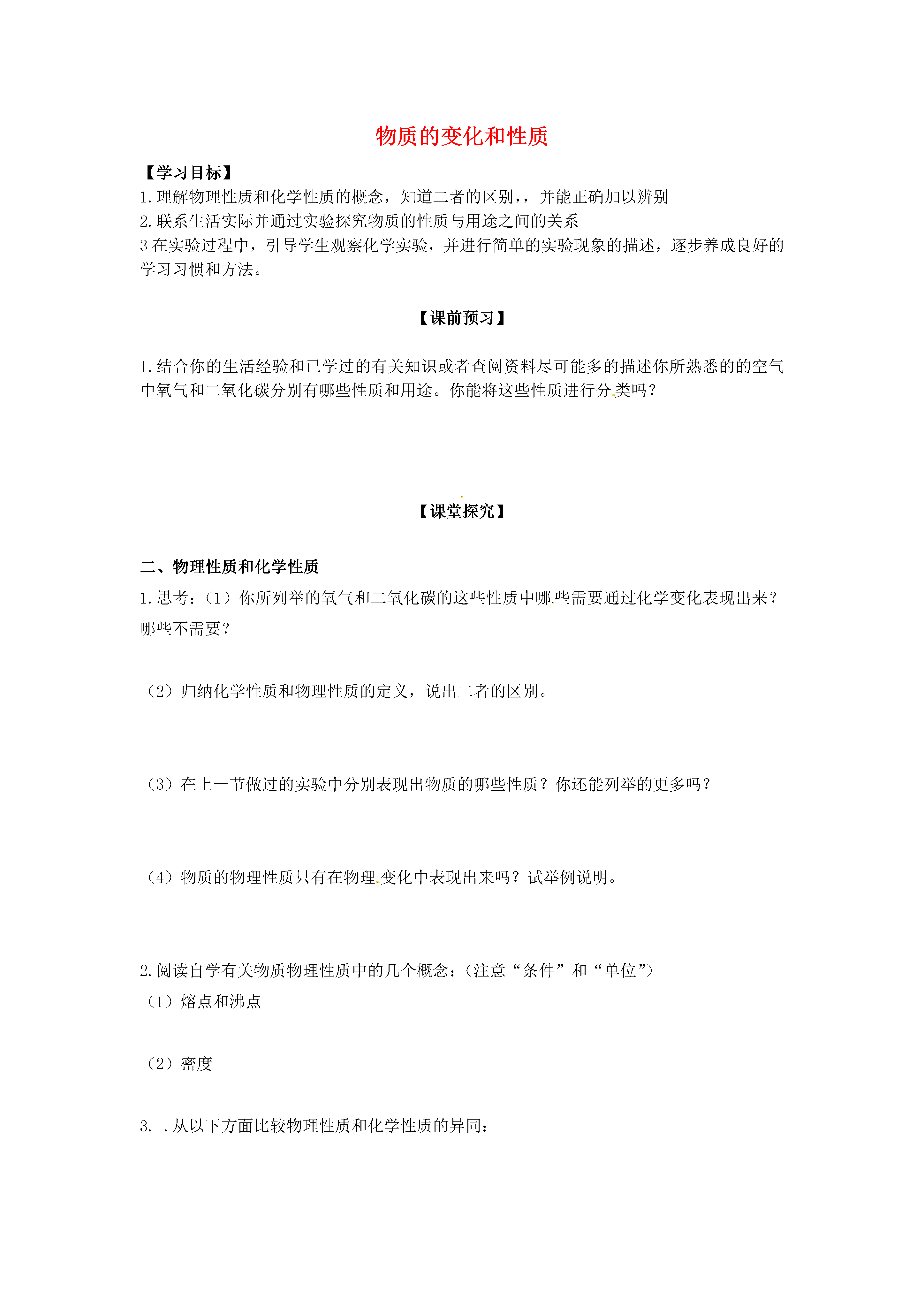 2物质的变化和性质【学习目标】1.理解物理性质和化学性质的概念,知道二者的区别,,并能正确加以辨别2.联系生活实际并通过实验探究物质的性质与用途之间的关系3在实验过程中,引导学生观察化学实验,并进行简单的实验现象的描述,逐步养成良好的学习习惯和方法。【课前预习】1.结合你的生活经验和已学过的有关知识或者查阅资料尽可能多的描述你所熟悉的的空气中氧气和二氧化碳分别有哪些性质和用途。你能将这些性质进行分类吗?【课堂探究】二、物理性质和化学性质1.思考:(1)你所列举的氧气和二氧化碳的这些性质中哪些需要通过化学变化表现出来?哪些不需要?(2)归纳化学性质和物理性质的定义,说出二者的区别。(3)在上一节做过的实验中分别表现出物质的哪些性质?你还能列举的更多吗?(4)物质的物理性质只有在物理变化中表现出来吗?试举例说明。2.阅读自学有关物质物理性质中的几个概念:(注意“条件”和“单位”)(1)熔点和沸点(2)密度3..从以下方面比较物理性质和化学性质的异同:物理性质化学性质概念实例区别4.物质的变化与性质之间是否有关系呢?独立完成习题,然后交流讨论:(1)仔细辨别下列描述中属于物质的物理性质的是,属于化学性质的是,属于物理变化的是,属于化学变化的是。分别说明理由。A.澄清石灰水中通入二氧化碳后变浑浊B.硫在点燃的条件下能燃烧C.酒精挥发变成了酒精蒸气D.酒精易挥发(2)试比较物质的变化和性质的区别与联系5.实验探究:物质的性质与用途的关系(1)你的猜想:(2)设计实验方案:利用两种具有不同性质的物质,由物质具有的性质推测物质的用途实验步骤实验现象实验结论分别取一集气瓶瓶氧气和二氧化碳,仔细观察他们的颜色、状态和气味取一根燃着的火柴慢慢地分别放入这两个集气瓶中,(3)探究结论:氧气可,二氧化碳可用来,说明物质的性质物质的用途,物质的用途了物质的性质。你的收获:【有效训练】1.下列叙述中,与铁的化学性质有关的是()A.铁能传热导电B.纯铁是银白色的有金属光泽的金属C.铁在潮湿的空气中能生锈D.纯铁有良好的延展性2.下列物质的用途,由其化学性质决定的是()A.酒精可作燃料B.铜丝可做导线C.金钢石制作刀具D.钢材制铁轨3.下列各组物质中,必须利用化学性质的不同才能区别的是()A.水和食醋B.铜片和铝片C.水和澄清石灰水D.铁粉和食盐4.坚硬的金刚石可以加工成钻石,把灼热的金刚石放入液态氧气中,金刚石可以燃烧。在这两种情况中,金刚石分别发生了什么变化?这些变化说明金刚石具有什么性质?【课后提升】1.酒精是一种无色透明、具有特殊气味的液体,能与水以任意比例互溶,并能够溶解碘、酚酞等多种物质。酒精易燃烧可做酒精灯和内燃机的燃料,是一种绿色能源。当点燃酒精灯时,酒精在灯芯上边汽化边燃烧,生成水和二氧化碳。根据上述文字叙述可归纳出:酒精的物理性质有化学性质有酒精发生的化学变化是酒精的用途是。2.如图是同学们经常使用的修正液包装标签上的部分文字和图片,请仔细阅读、观察,根据此图及日常生活经验分析、推测修正液的性质。(至少答出三条)修正液使用方法:使用前须摇匀修正,液,涂于修正处少许,待完全干后书写。注意事项:用完后请及时盖上帽,严禁食用。(1)。(2)。(3)。
